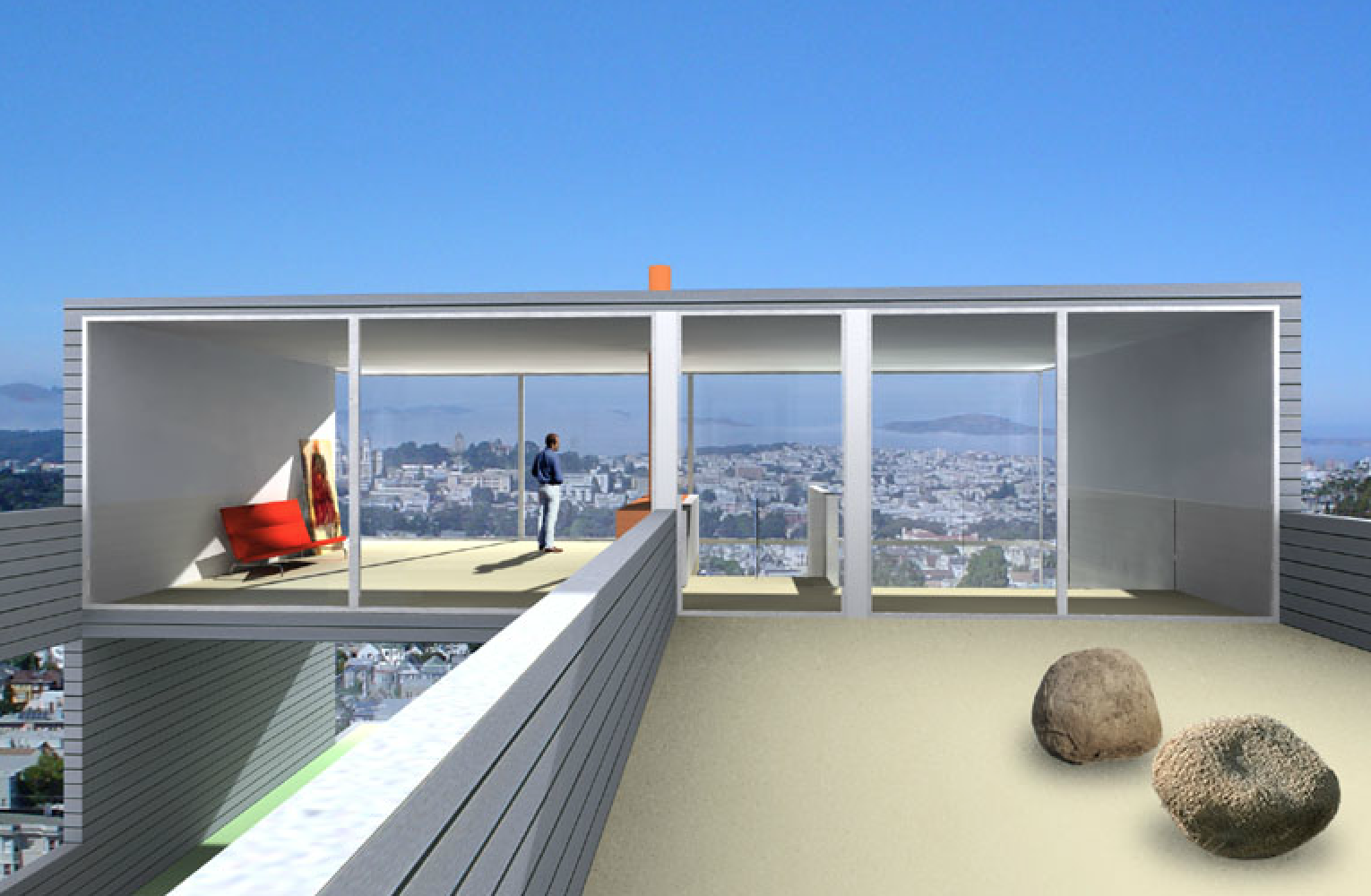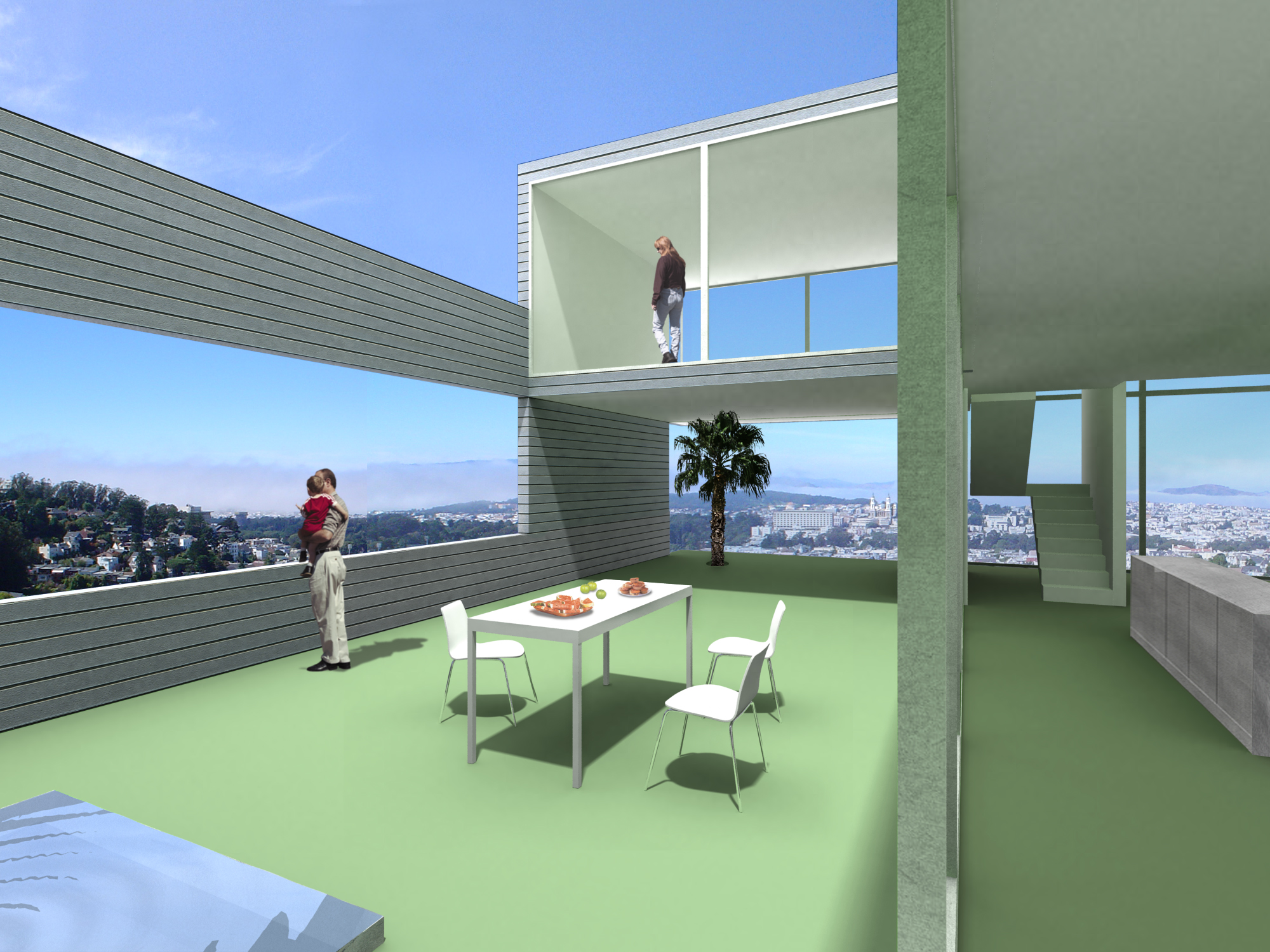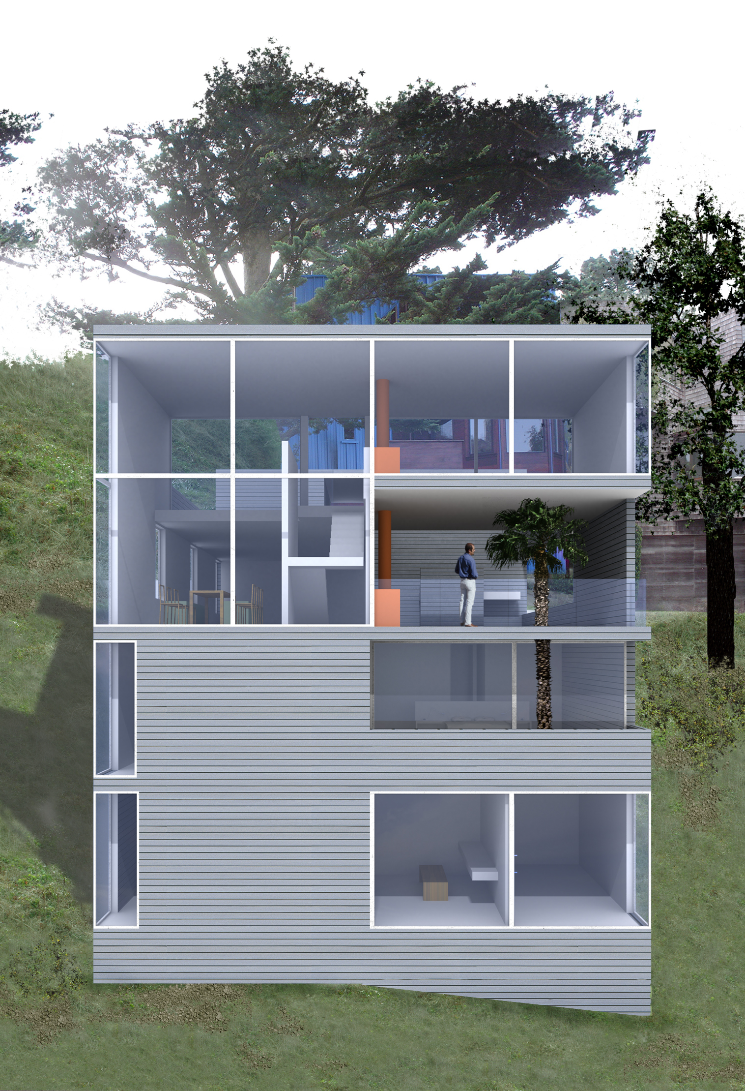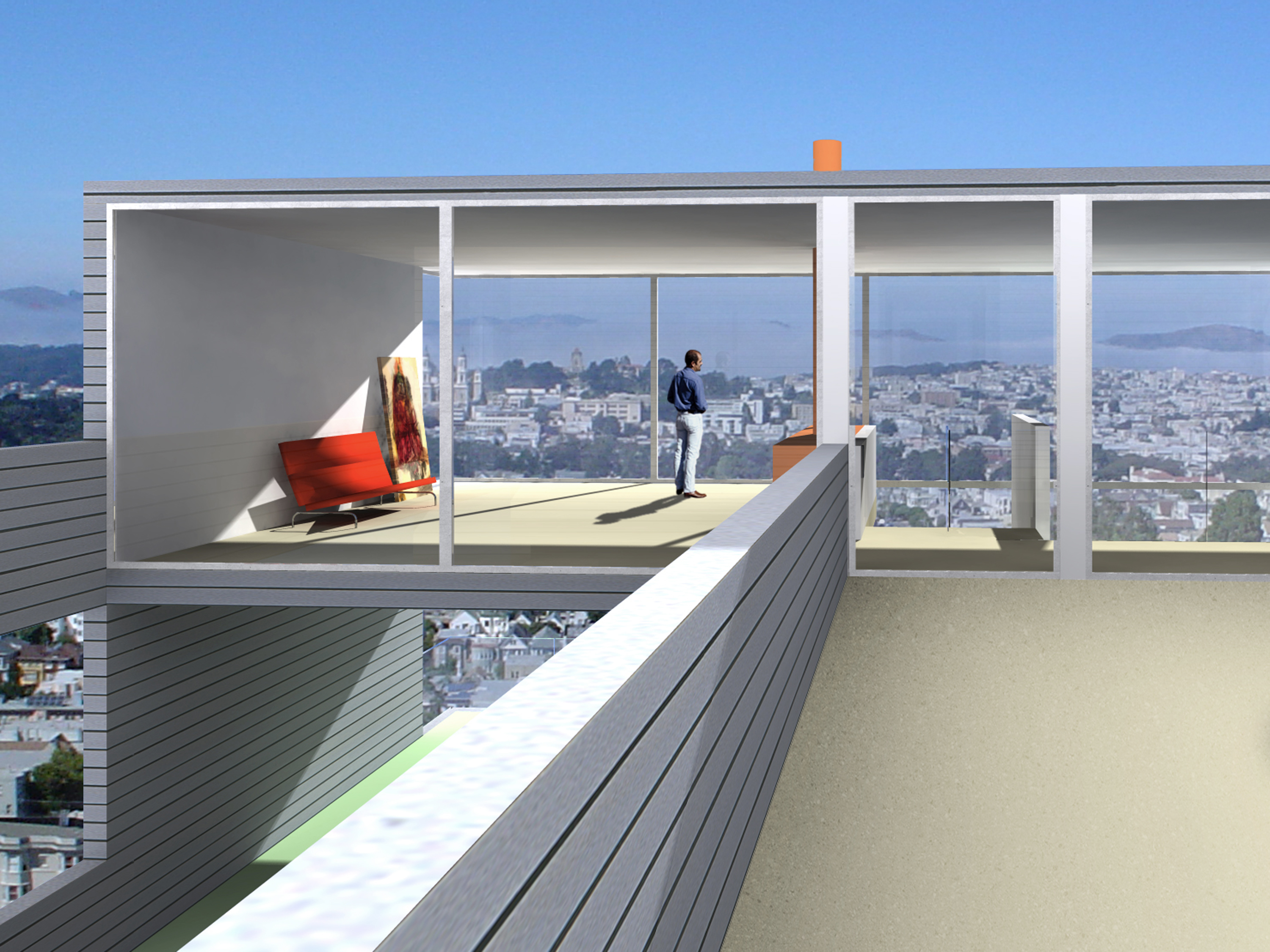 The site of the Chenette house is at one such end of the grid, the last fifty-by-one-hundred-foot fragment abutting Tank Hill. From this perch, the view pans from the Golden Gate Bridge to the downtown area. The San Francisco Bay shining in the sun, the turmoil of fog rolling in, the boats and the lights are all on stage. The house is a proscenium to this show. Nature invades the house, carving the box into a series of voids that continue the slope of the land, opening interiors and courts to views in the north, bringing in sunlight from the south. The entry sequence passes from the street through a gate, up a stair, and through the upper gravel court to a transparent living room on the top level, which frames the panorama. The lower gravel court, threaded under the living room, is a topography connecting dining room, kitchen, and family area to view and sun. Underneath are the bedrooms: the children’s rooms are open to a deck facing Tank Hill on the east; the parents’ looks to a deck on the north that is connected with a tree to the court above. Below are the studies and hobby room, which open to the rear yard. The exterior is sheathed with cement-board slats and glass, bounding the interior matrix of interlocking frames and exterior voids