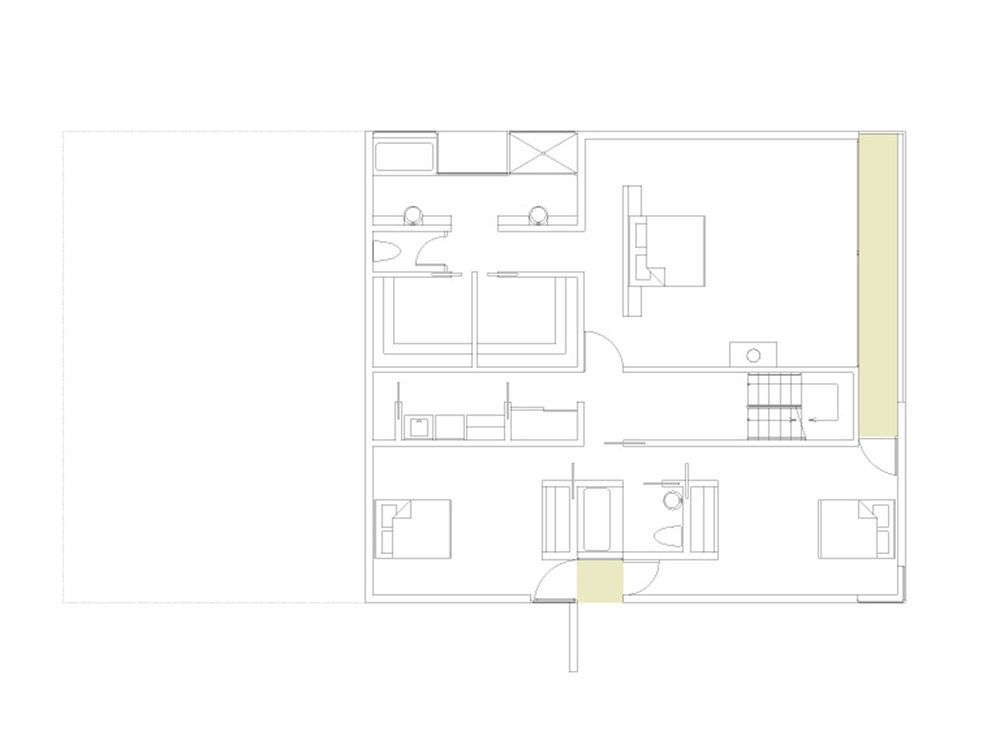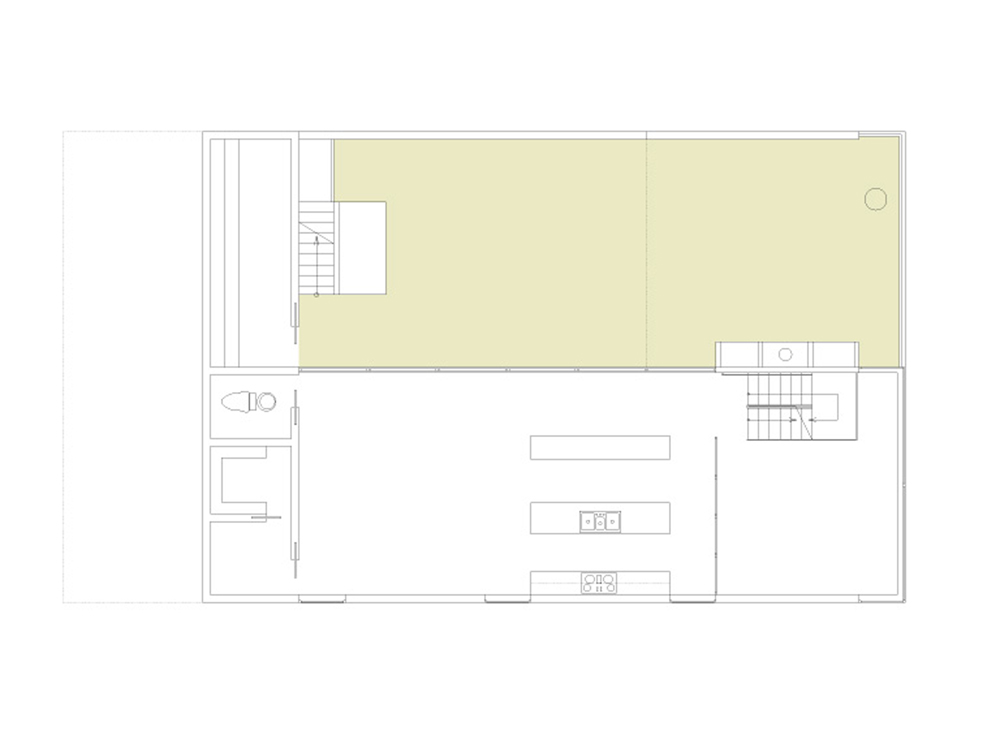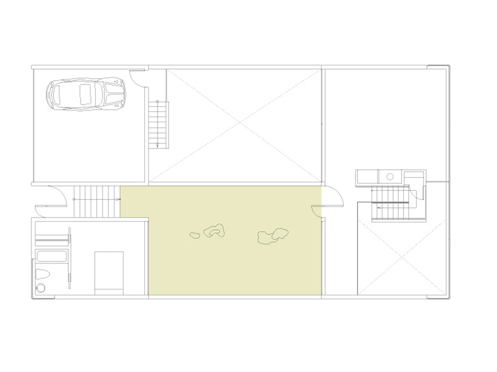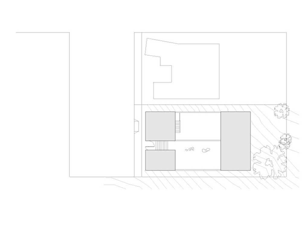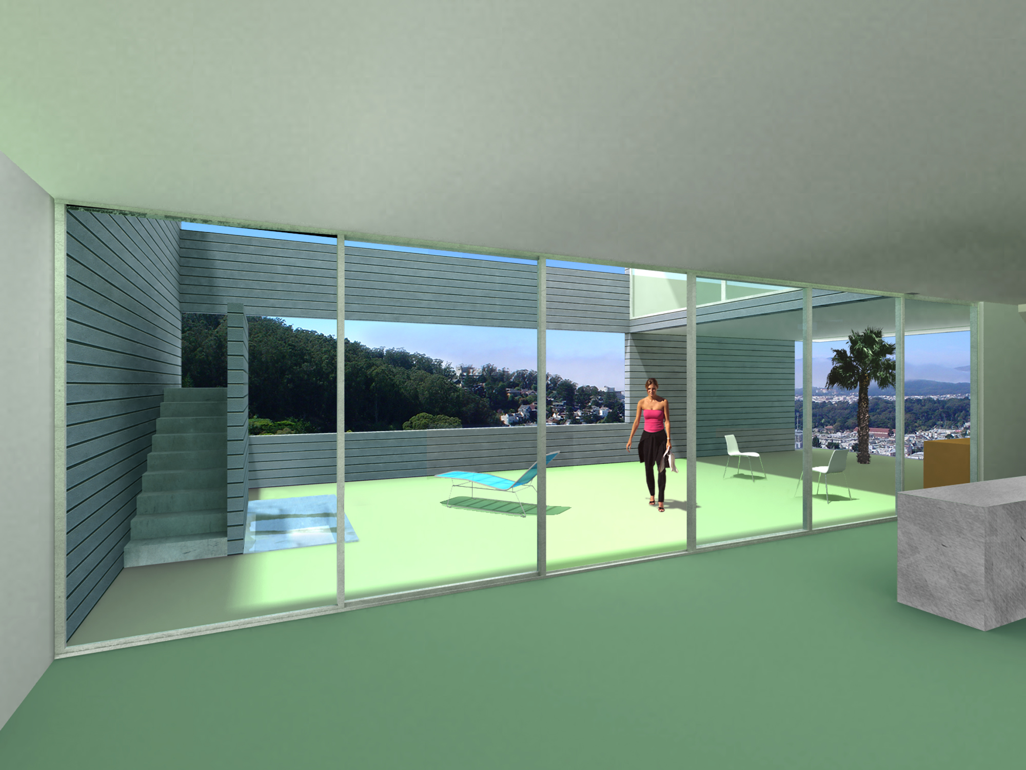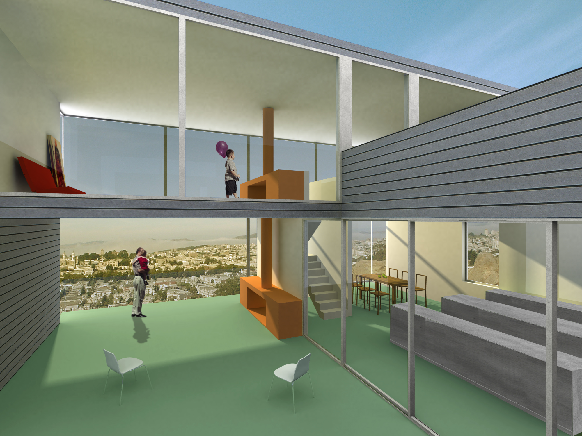 The site of the Chenette house is at one such end of the grid, the last fifty-by-one-hundred-foot fragment abutting Tank Hill. From this perch, the view pans from the Golden Gate Bridge to the downtown area. The San Francisco Bay shining in the sun, the turmoil of fog rolling in, the boats and the lights are all on stage. The house is a proscenium to this show. Nature invades the house, carving the box into a series of voids that continue the slope of the land, opening interiors and courts to views in the north, bringing in sunlight from the south. The entry sequence passes from the street through a gate, up a stair, and through the upper gravel court to a transparent living room on the top level, which frames the panorama. The lower gravel court, threaded under the living room, is a topography connecting dining room, kitchen, and family area to view and sun. Underneath are the bedrooms: the children’s rooms are open to a deck facing Tank Hill on the east; the parents’ looks to a deck on the north that is connected with a tree to the court above. Below are the studies and hobby room, which open to the rear yard. The exterior is sheathed with cement-board slats and glass, bounding the interior matrix of interlocking frames and exterior voids