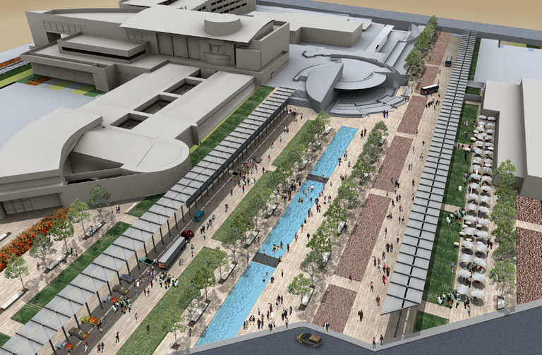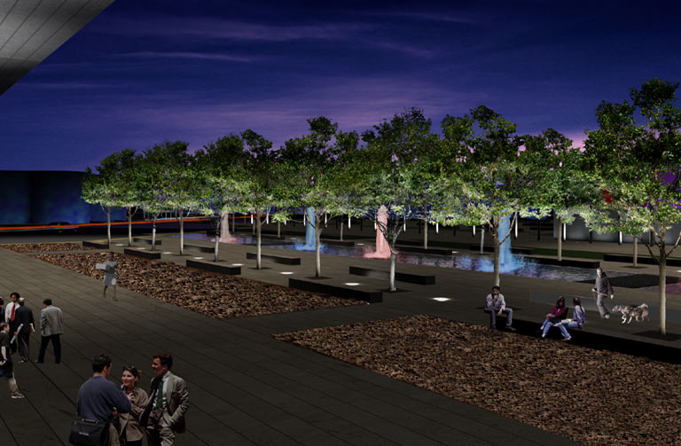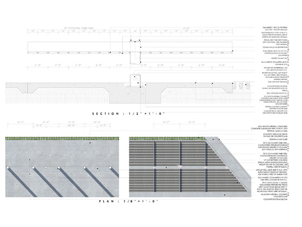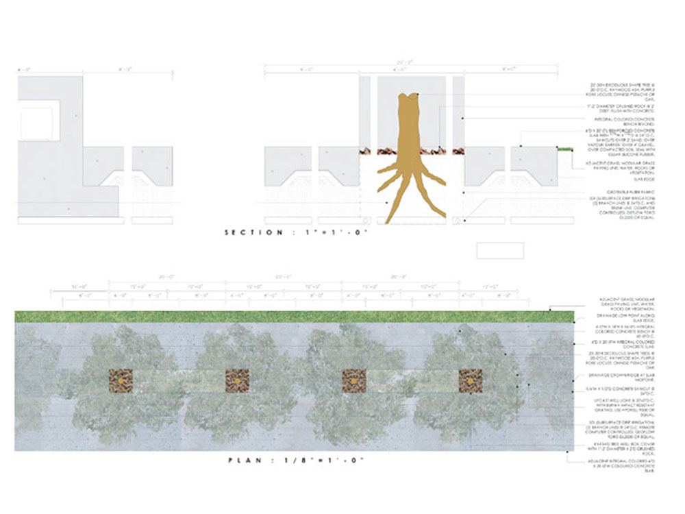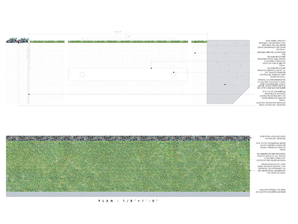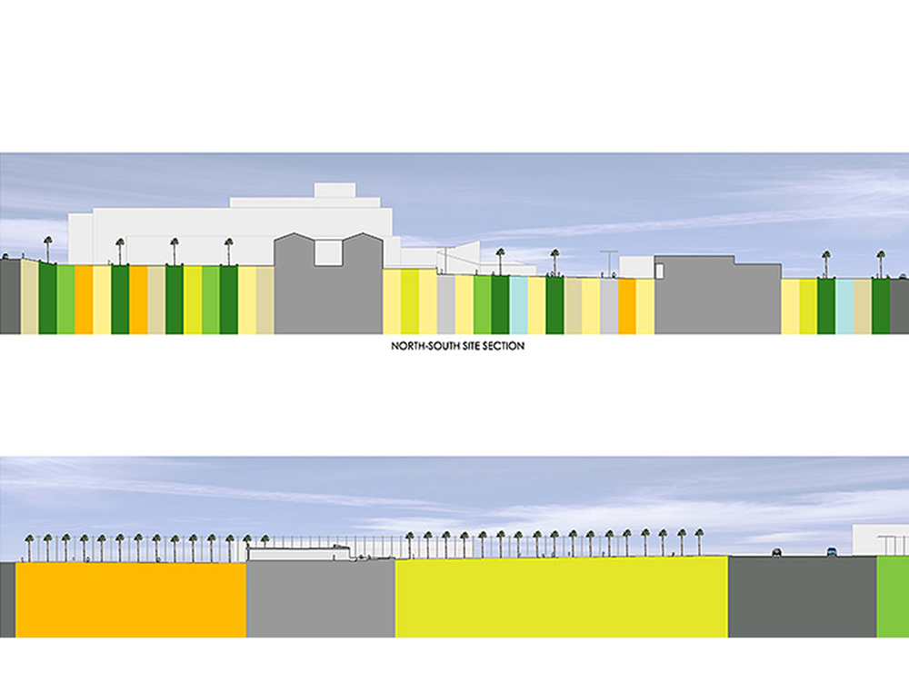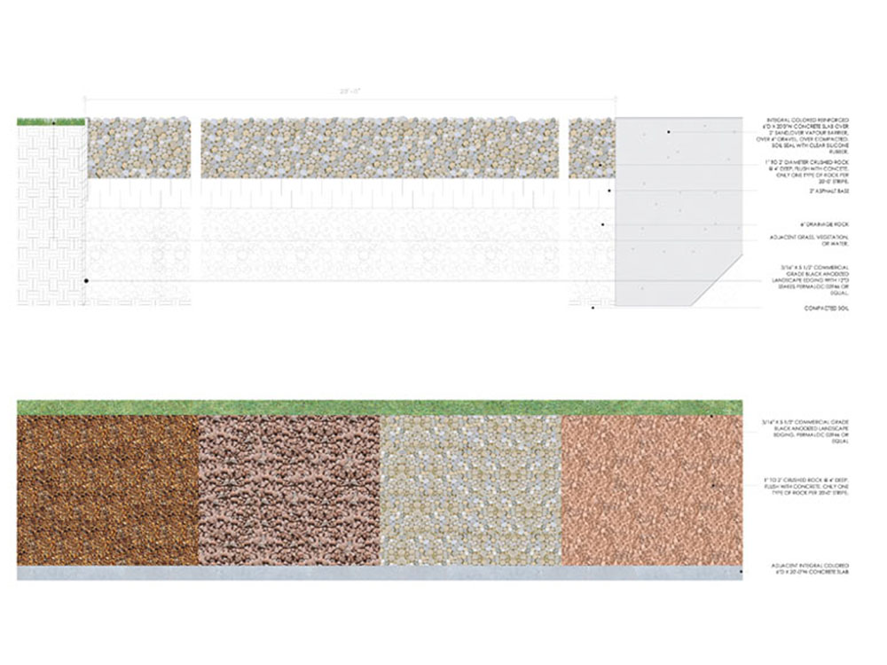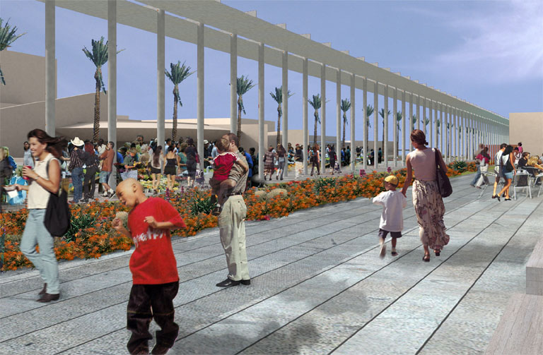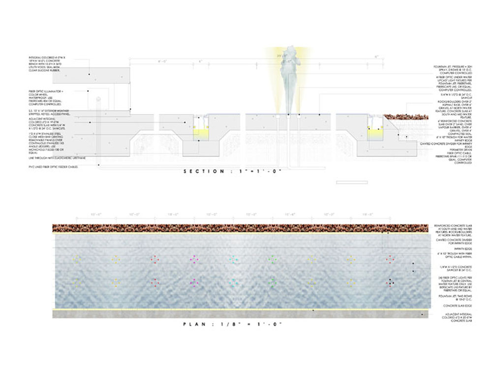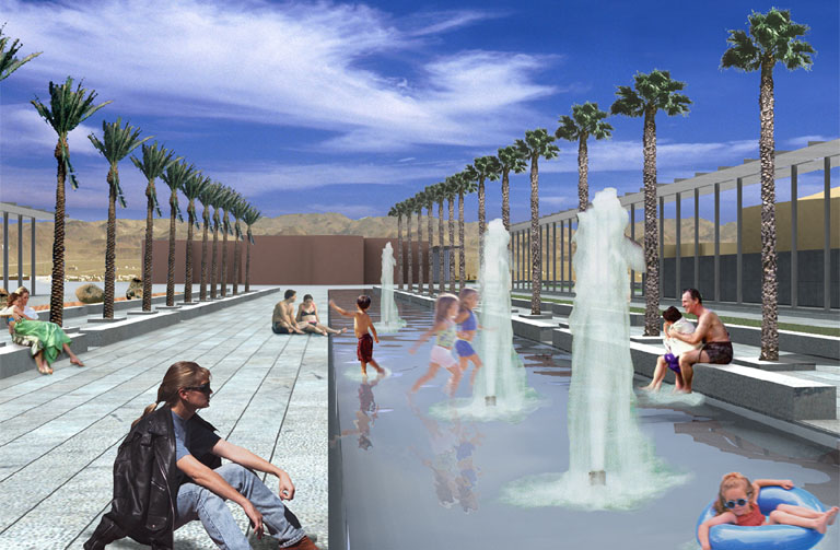 The piazzas of Italy, the courts of Spain, the campus lawns of American universities—all are models of public civic space. These charged voids are empty clearings, fields of possibility, frames of opportunity, that allow a large range of activities and gatherings as well as comfortable habitation for an individual. The desert valley around the city of Henderson is a fragmented landscape of grids and lines, of subdivisions and developments, of roads and buildings. This field of habitation is ringed by desert hills, walling the human-made with a constant panorama of the natural. The project constructs an idealized ground plane for the collection of city buildings on the site, unifying the various structures in the same way that the hills contain the city, representing nature’s order. This constructed mat serves as an urban carpet, a rug woven from the materials and elements of landscape and city. Twenty-foot-wide stripes thread the buildings, creating patterns of materials and encouraging a diversity of programs: a water feature doubles as a water park; colonnades as market halls; boulders as climbing rocks; and landscapes as models of desert botany. Electronic instruments make the civic space an interactive digital playground. Certain stripes are extruded into the air to form colonnaded canopies; other stripes support lines of trees that shade benches on the ground. The stripes are at once similar and unique, thematic and varying, rich surface and neutral plane: they are a framework of unity and a panorama of difference, establishing a place for civic gathering in the entropic dispersion of suburbia.