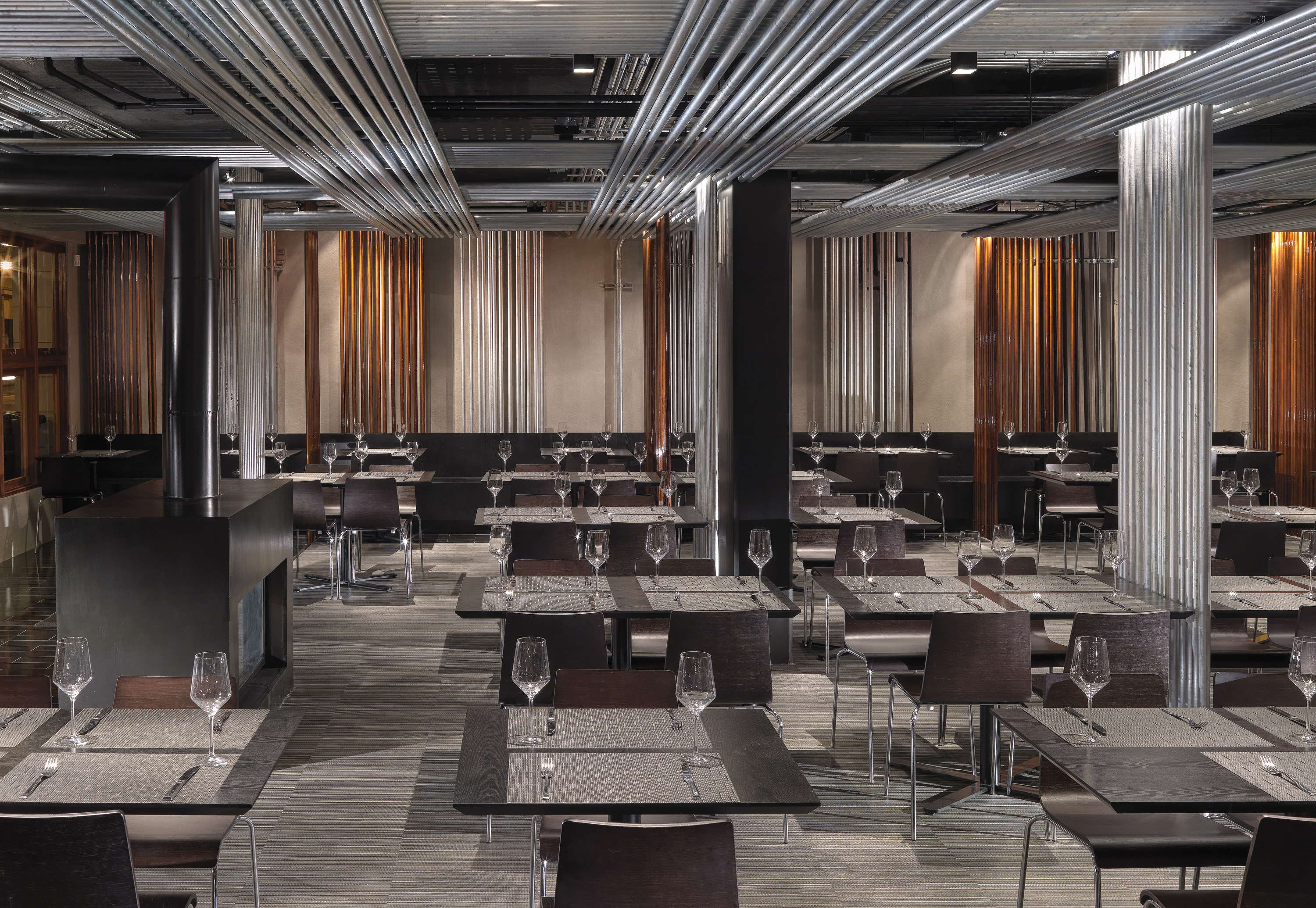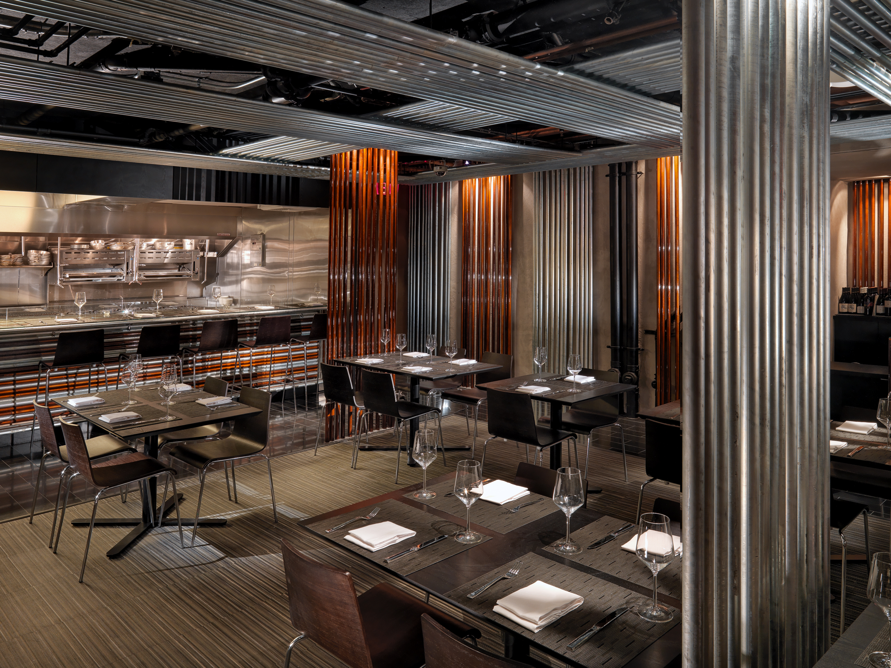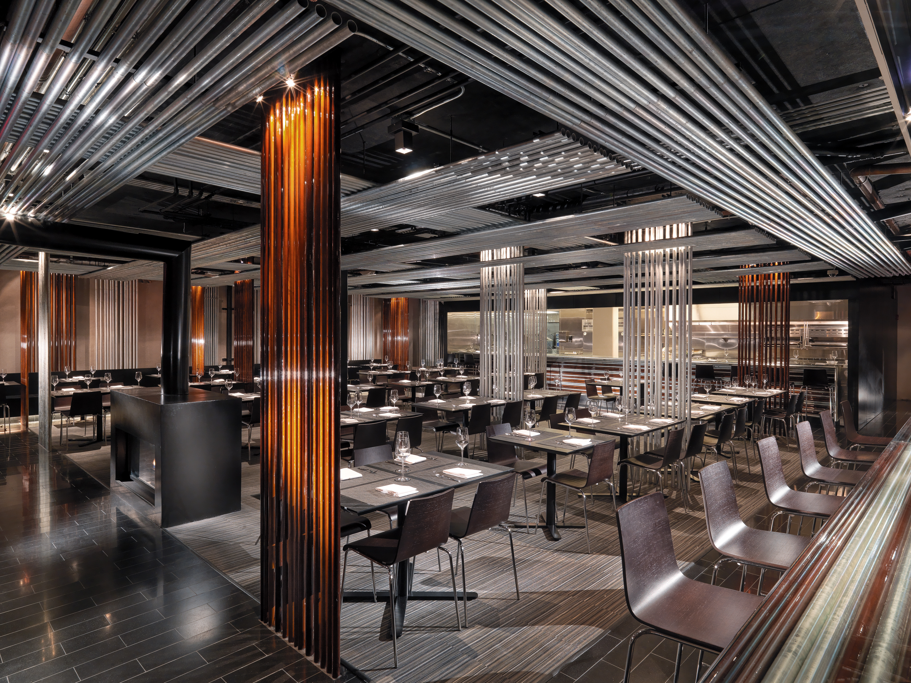 At the entry is a long fireplace that warms the entry. Behind, table seating fills the room. A series of conduit screens in galvanized or copper color divide the tables. Layers of conduit line the ceiling becoming a woven fabric of pipes. On the right is an open bar made of stacked bars of conduit. Glass shelves support the bottles. The other end is banquet seating on a bench, hovering in light, divided into a series of conduit alcoves. At the end of the room another bar frames the open kitchen, a well-lit stage for the cooks. Seating at this bar allows patrons to watch the performance close up. The floor has black granite paths with a large mat that locates the black wood laminate tables.