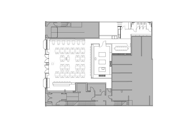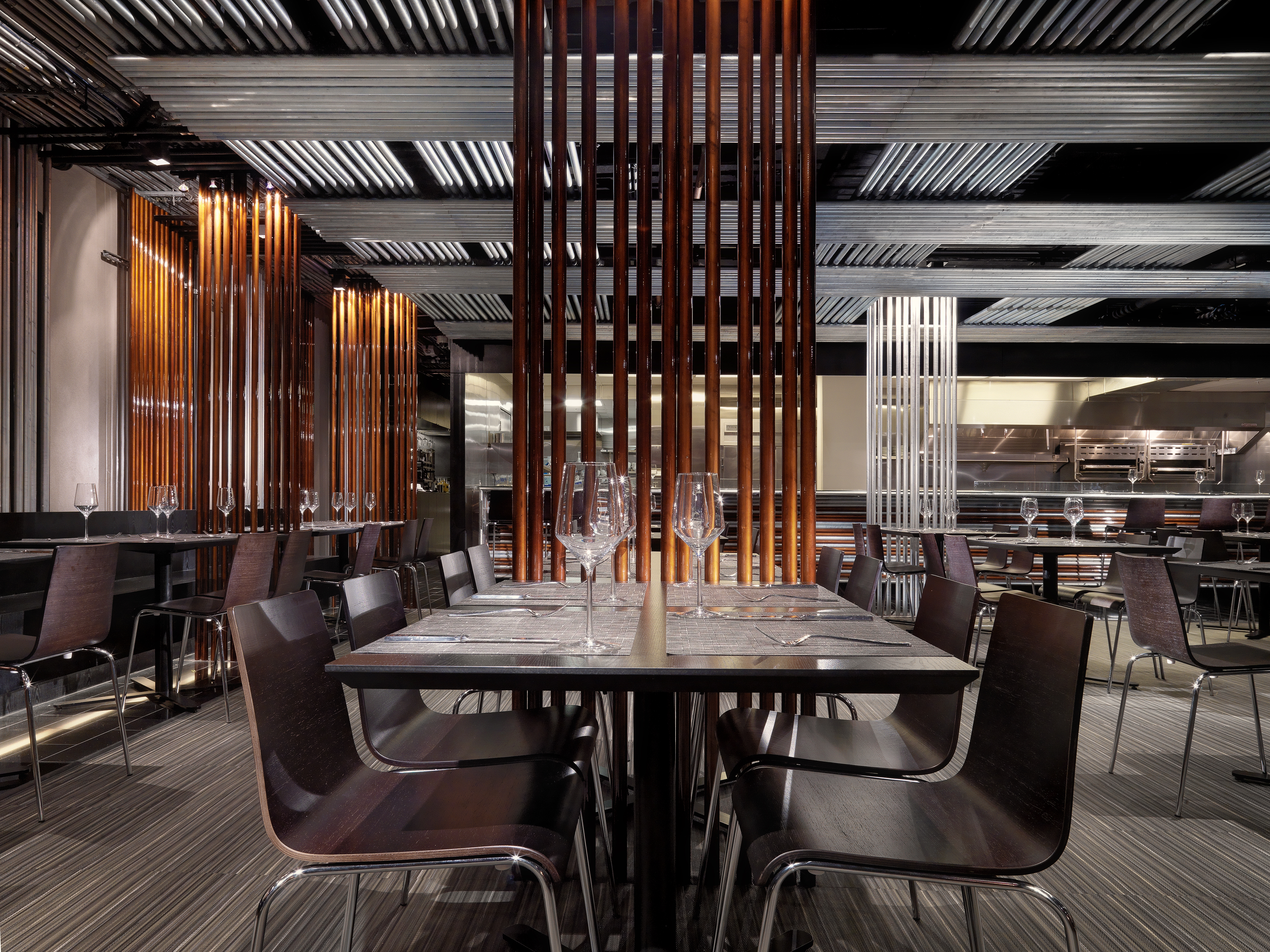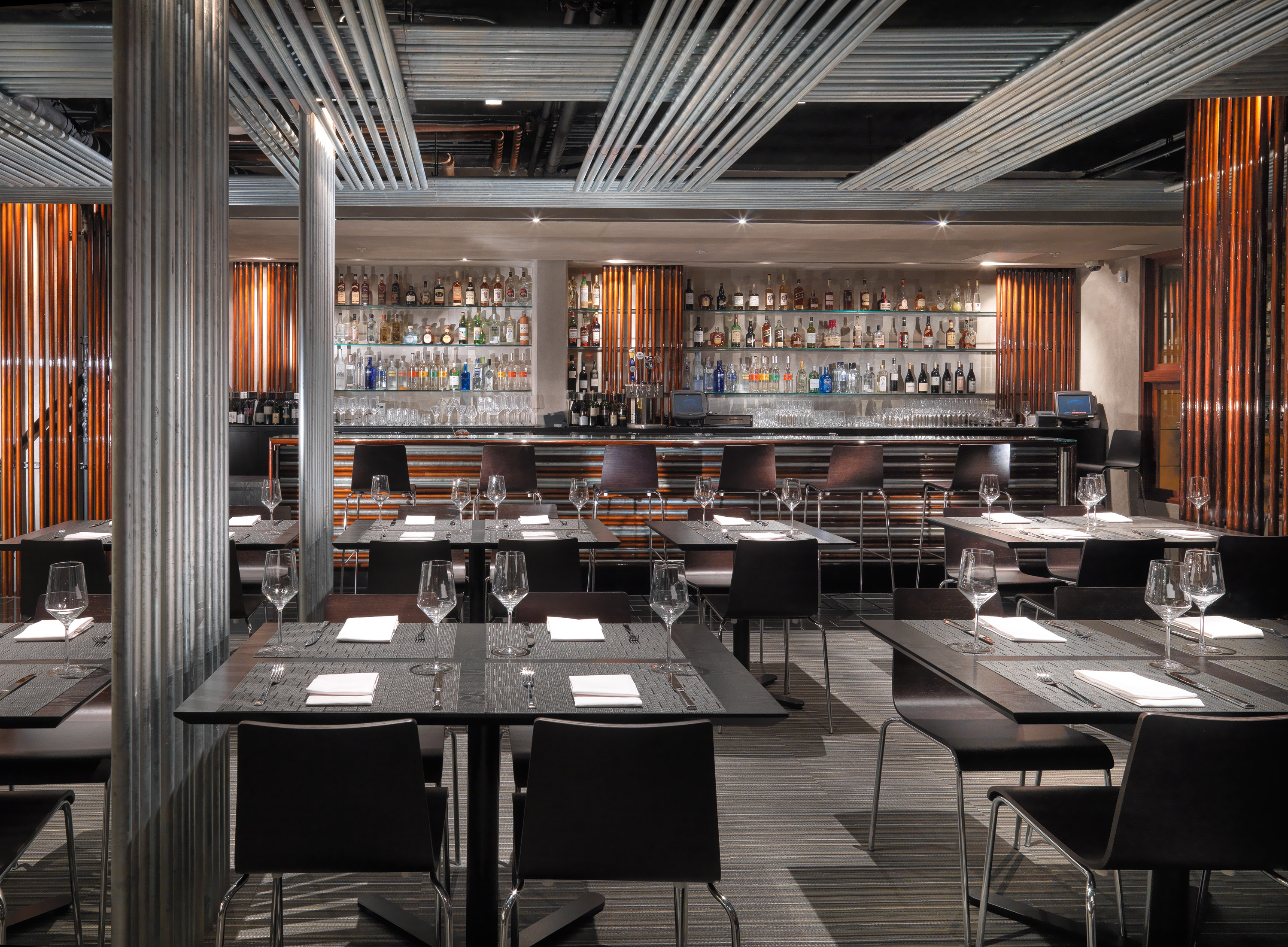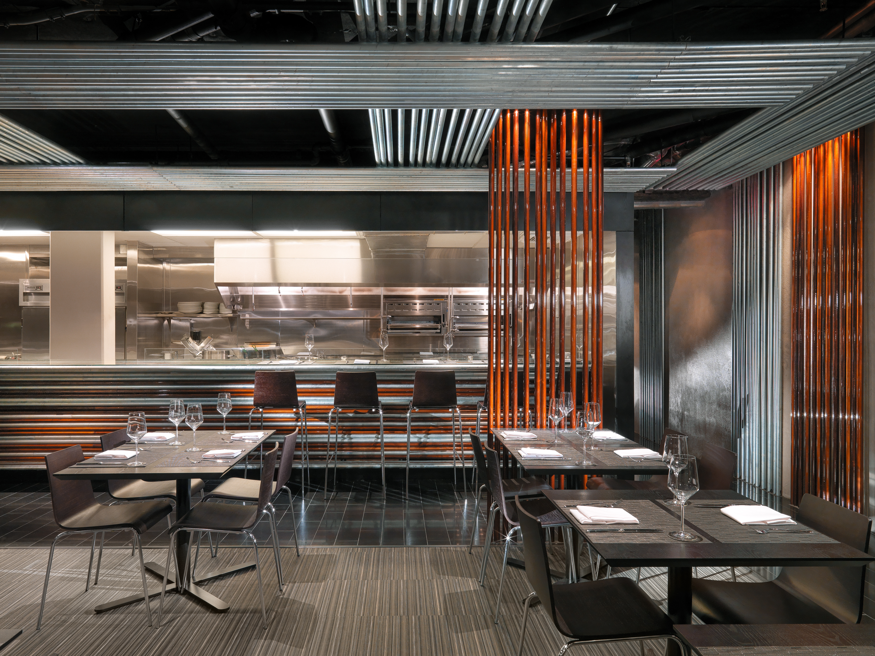 At the entry is a long fireplace that warms the entry. Behind, table seating fills the room. A series of conduit screens in galvanized or copper color divide the tables. Layers of conduit line the ceiling becoming a woven fabric of pipes. On the right is an open bar made of stacked bars of conduit. Glass shelves support the bottles. The other end is banquet seating on a bench, hovering in light, divided into a series of conduit alcoves. At the end of the room another bar frames the open kitchen, a well-lit stage for the cooks. Seating at this bar allows patrons to watch the performance close up. The floor has black granite paths with a large mat that locates the black wood laminate tables.