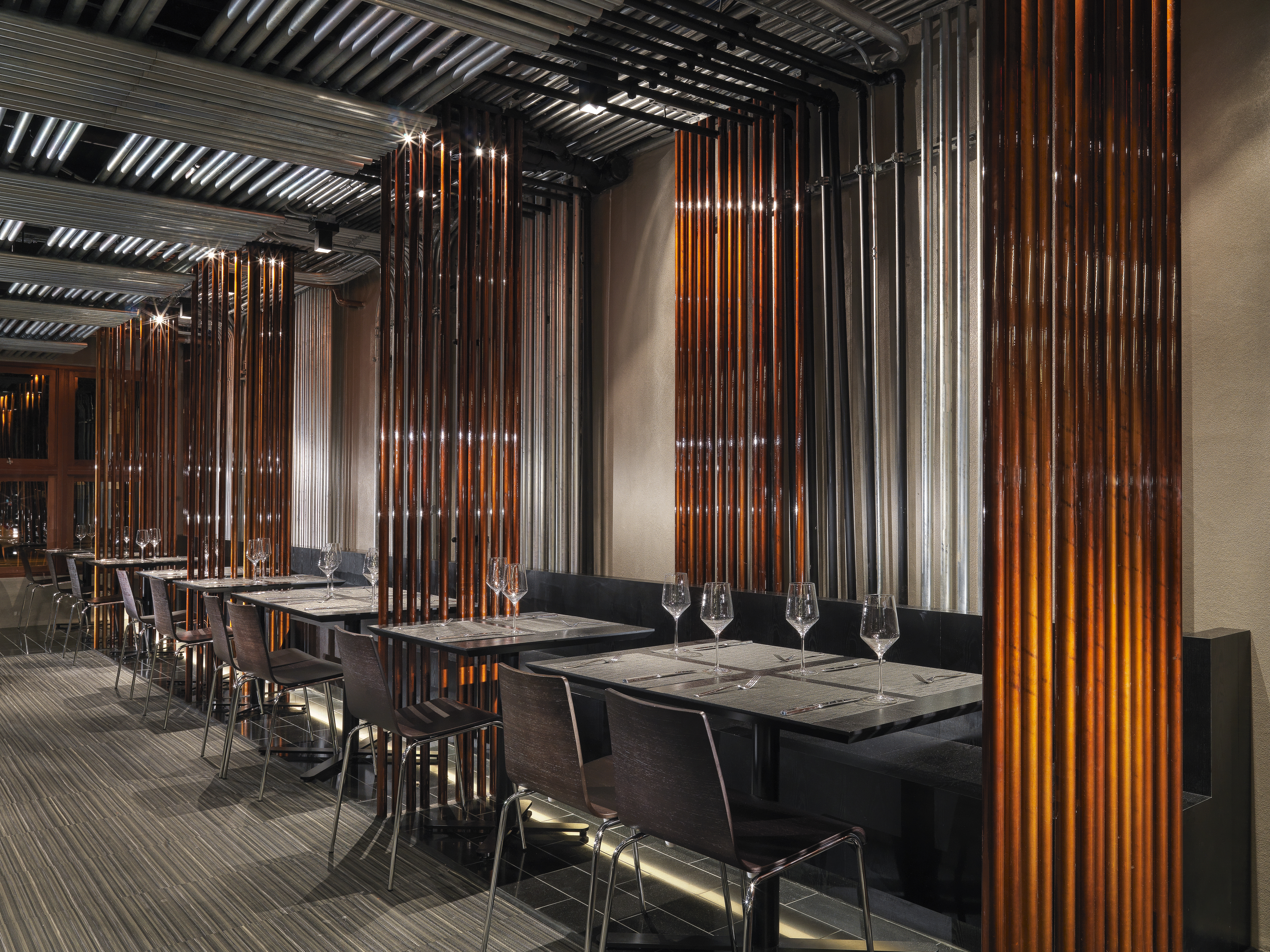 The atmosphere is sleek and hip, as well as rich and warm. The woven layers of copper and galvanized pipe transform the room into a rich and dimensional fabric to inhabit. Conduit disproves the old adage by making a silk purse from a sow’s ear.