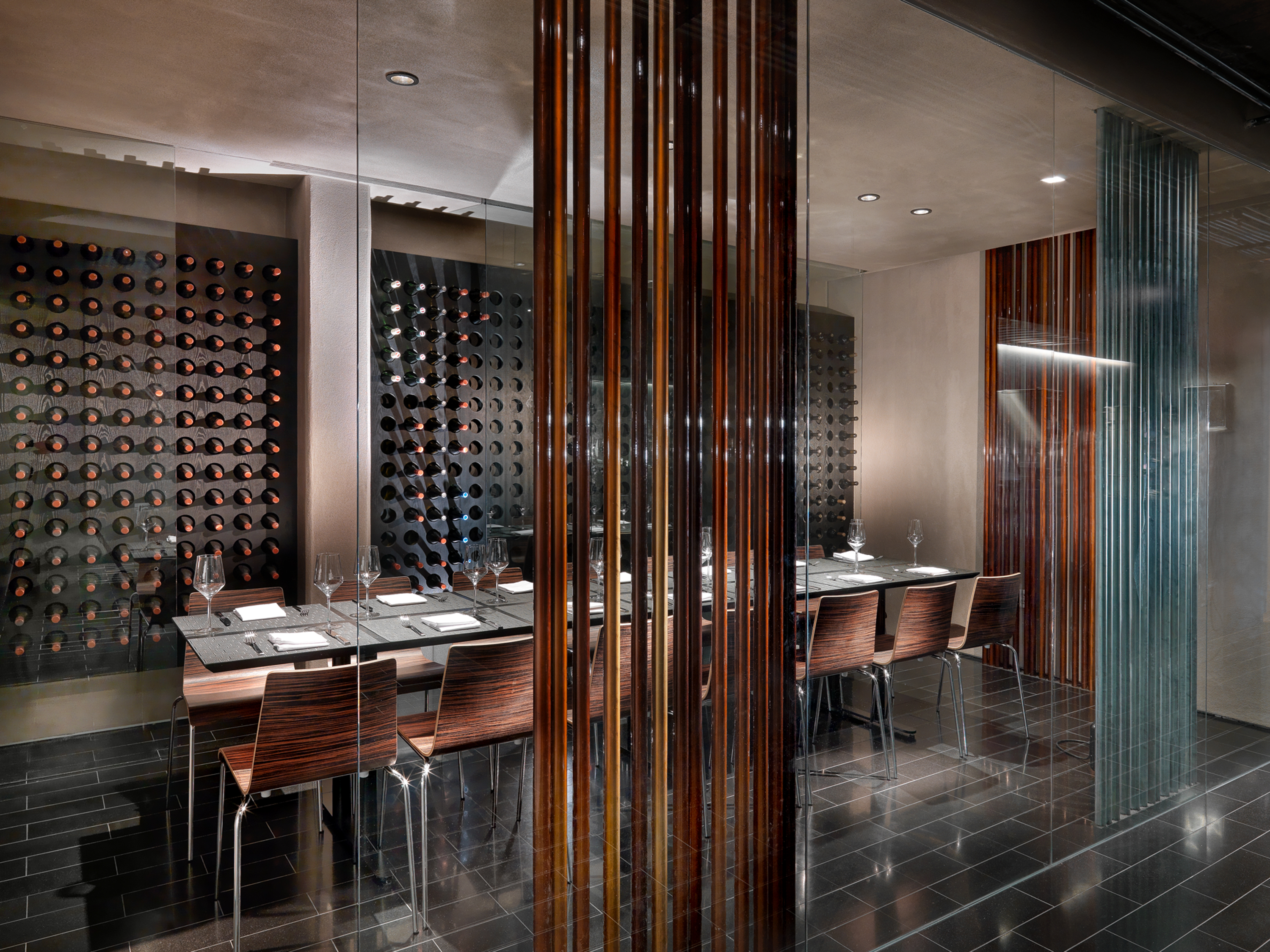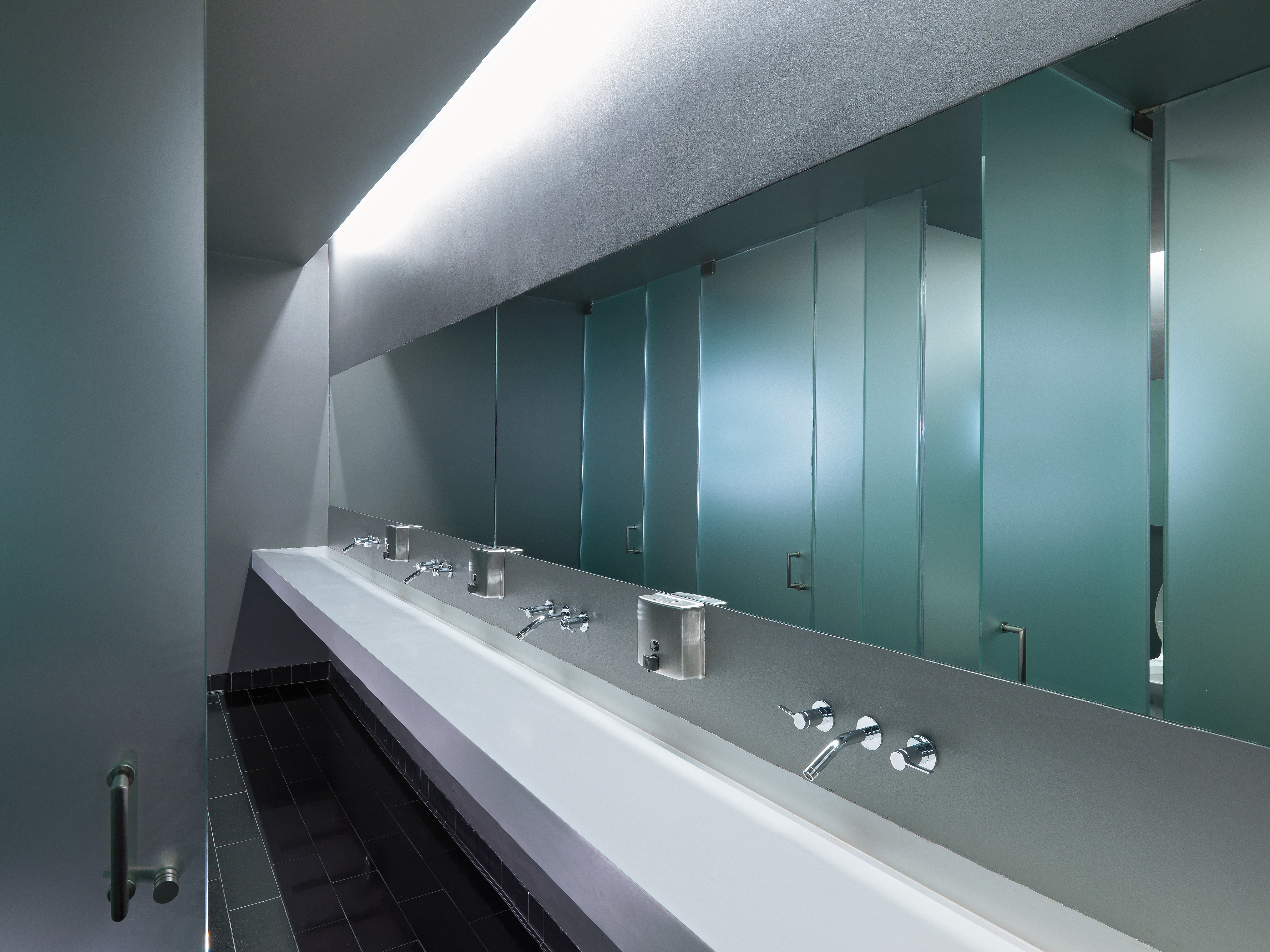 Behind the kitchen is a glass and conduit-enclosed cellar and private dining room. Wine is stored in a perforated black wood wall. Beyond are the bathroom enclosures of entirely etched glass, with a continuous trough sink and long mirror above.