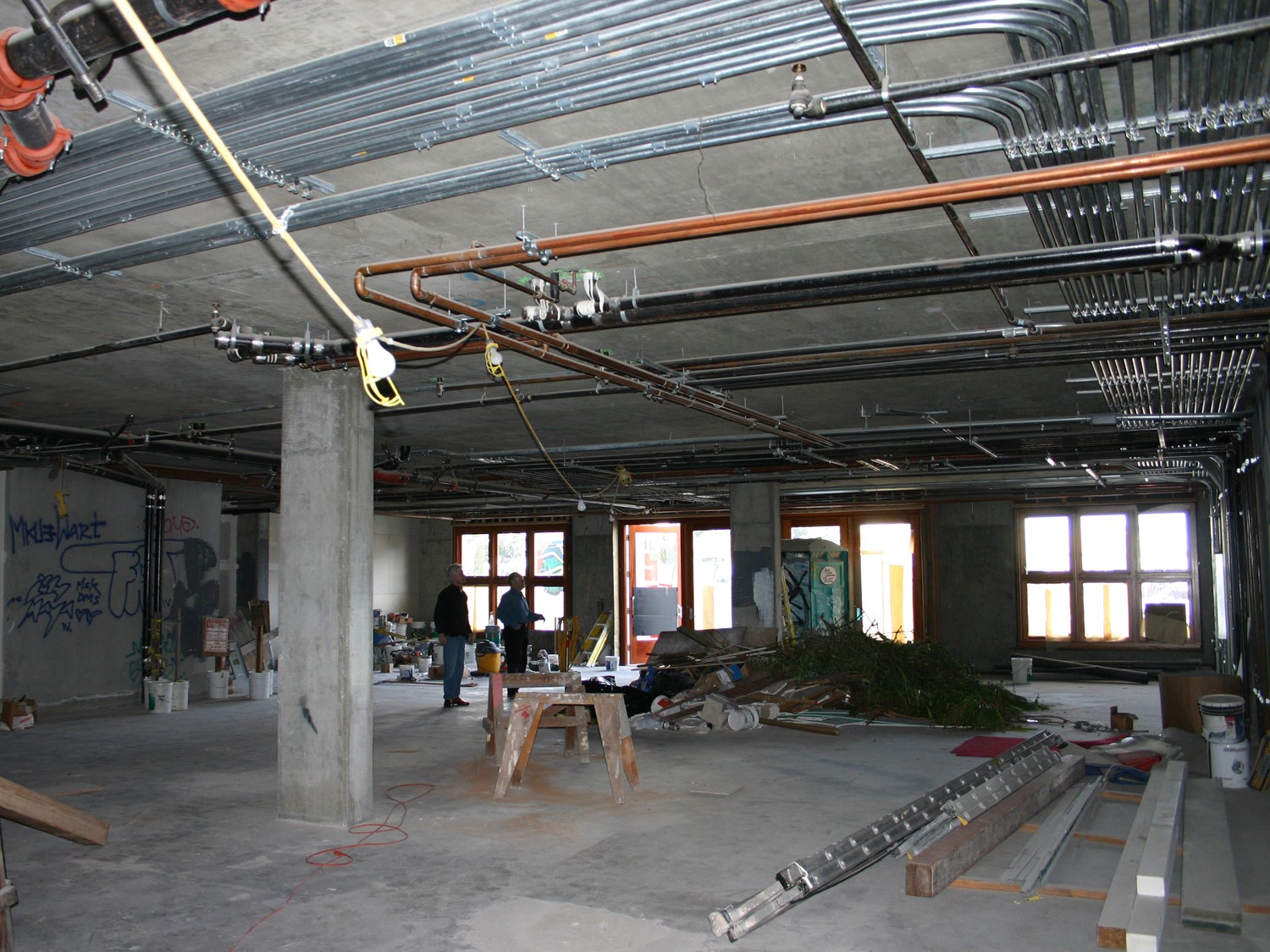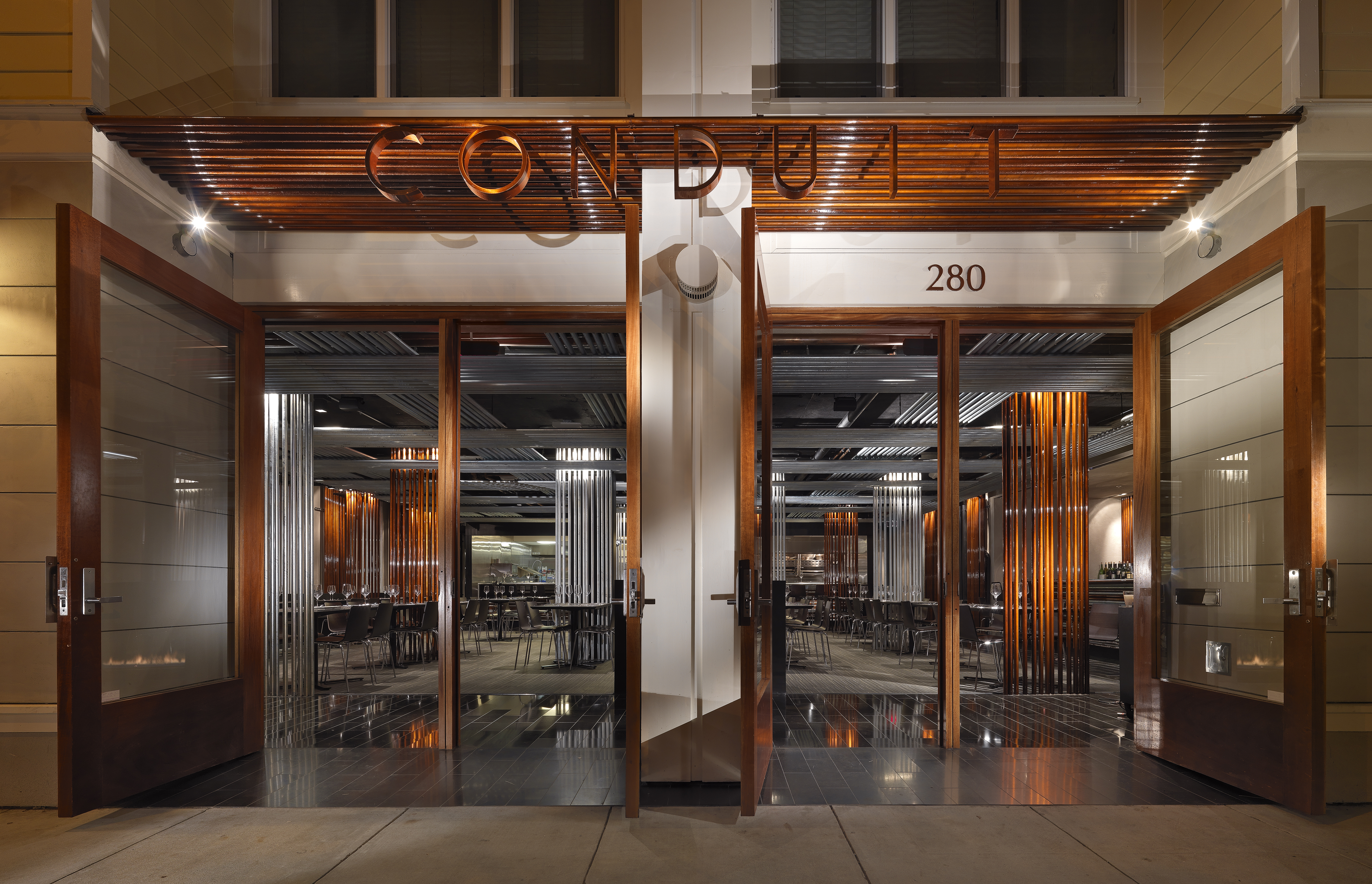 Conduit Restaurant emerged from the found circumstances. The ground floor commercial space in a new residential building had a low ceiling and a tangled maze of plumbing, sprinkler and electrical conduits serving the residences above. To cover these pipes would have further reduced the space. Instead, even more conduits were layered over the existing to counteract and remediate the situation.