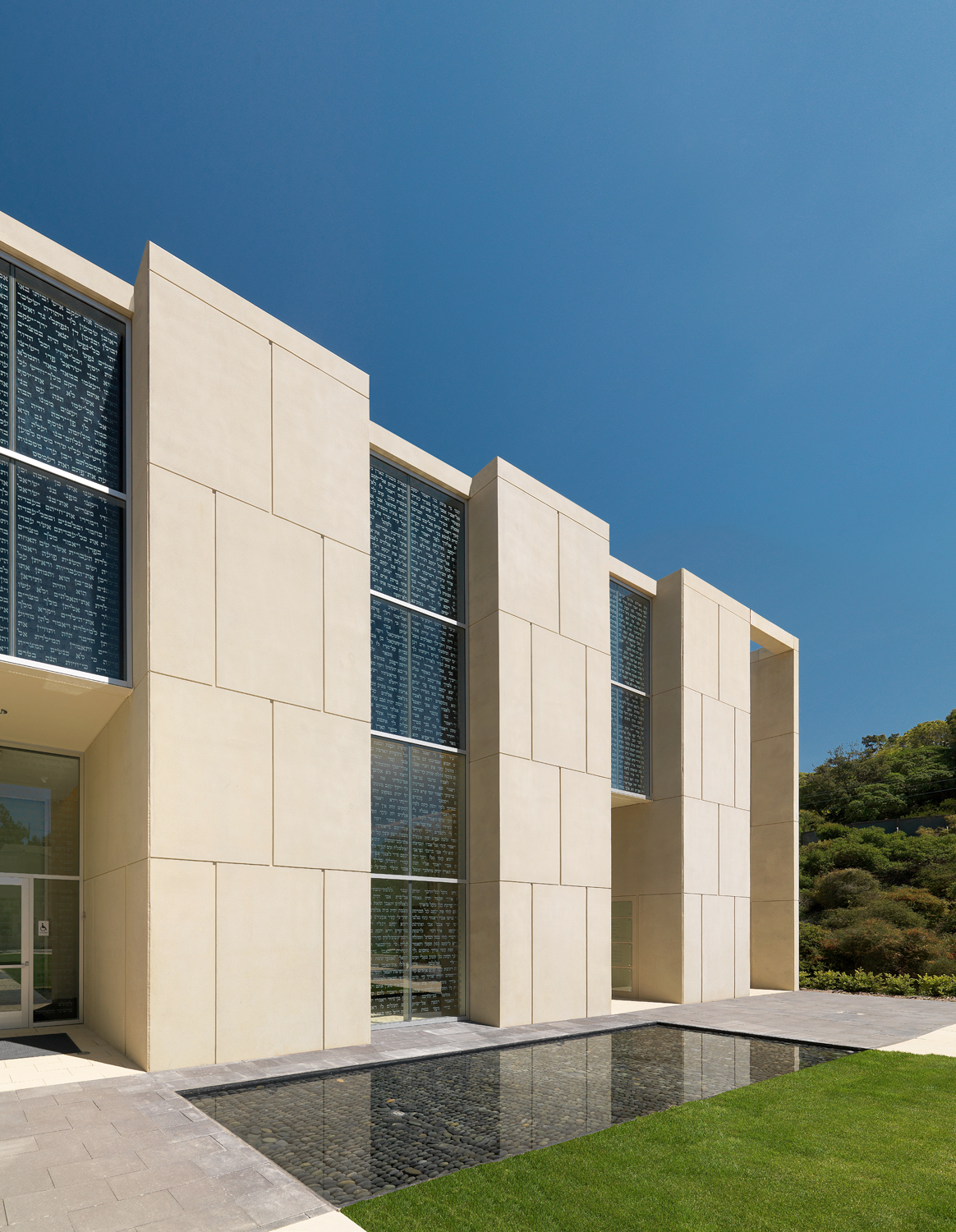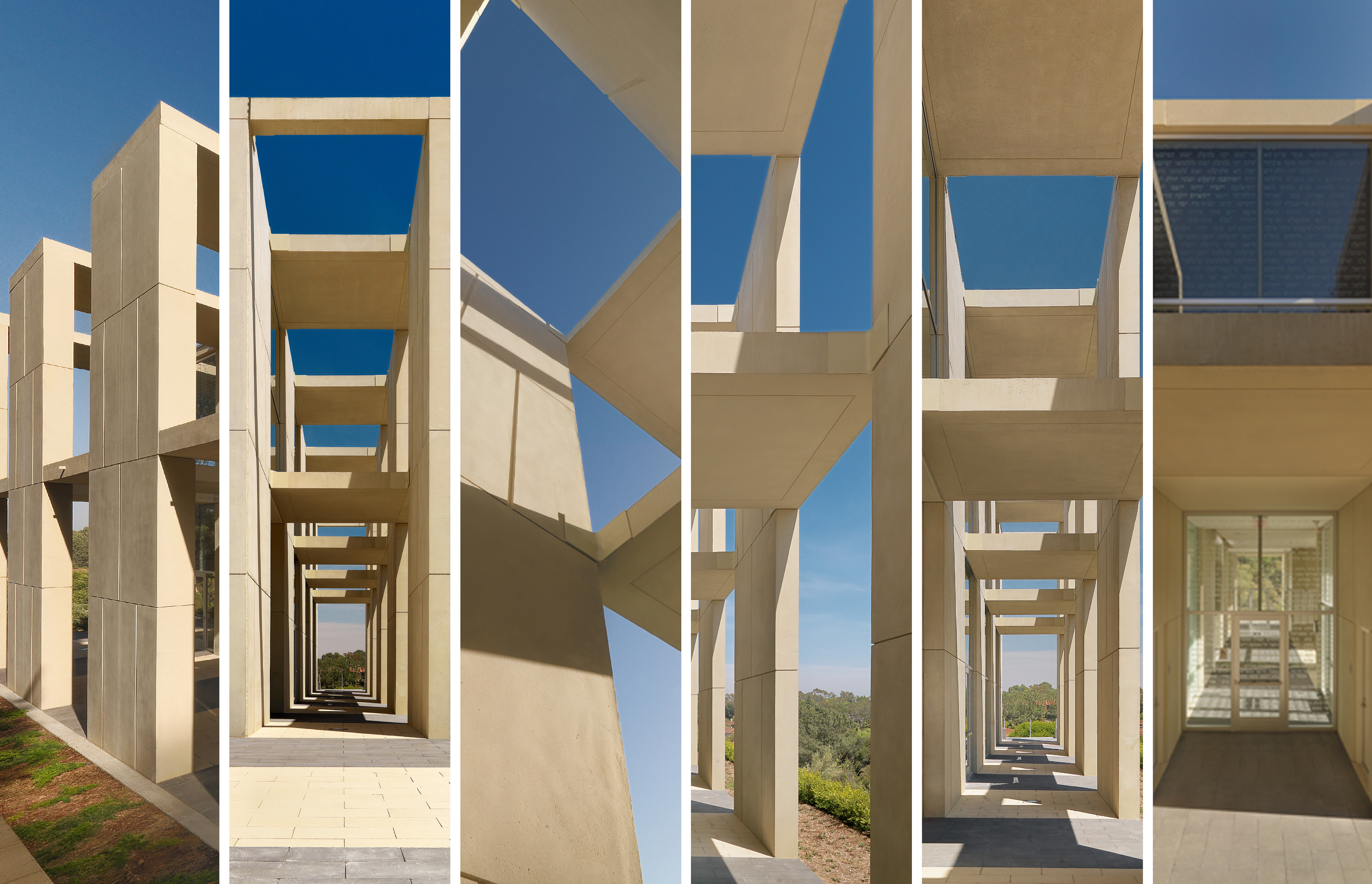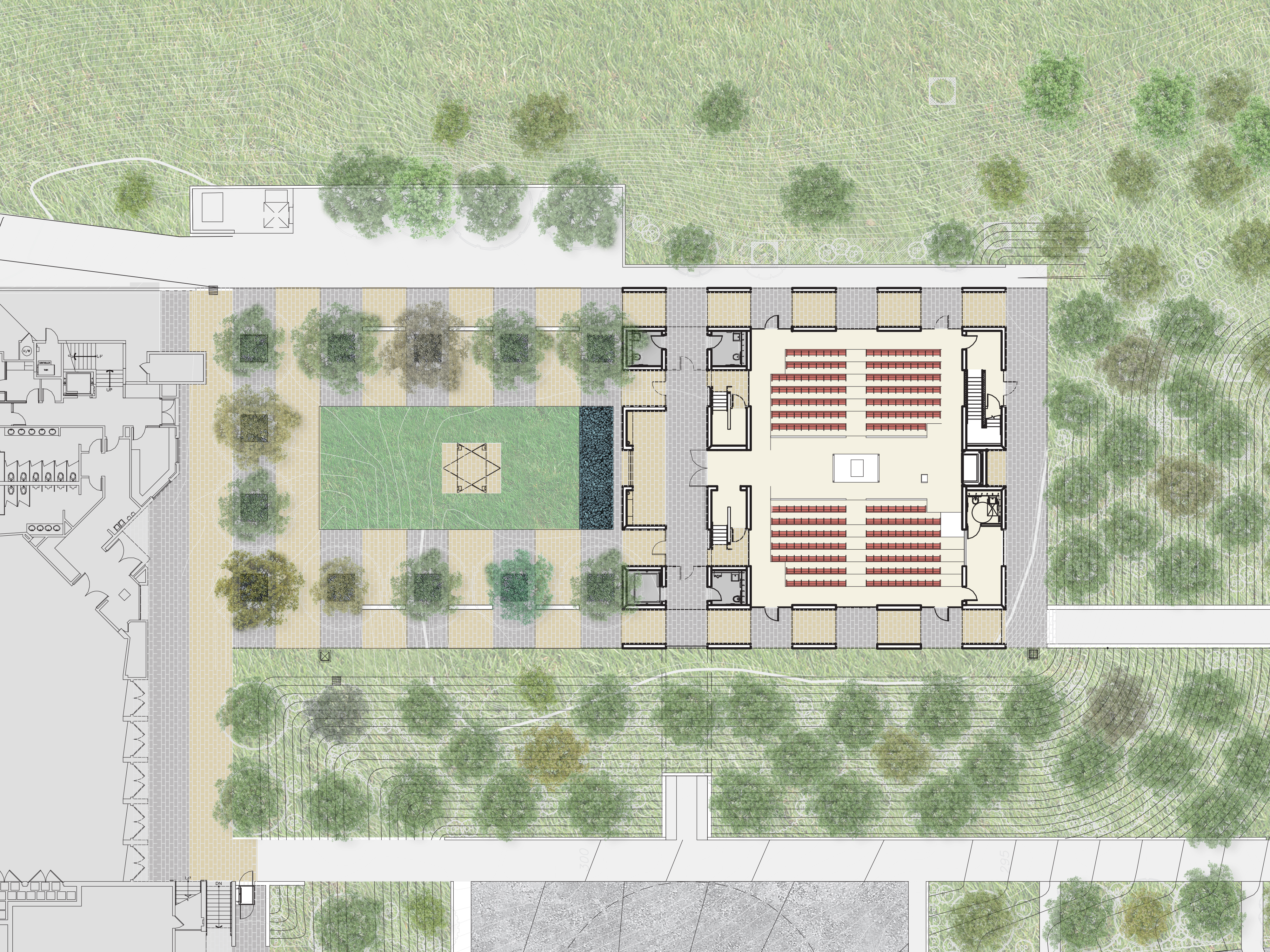 In the plaza, edged with landscape, a Huppah of four poles holds a Star of David in the sky. This is the center for wedding ceremonies and outdoor services.