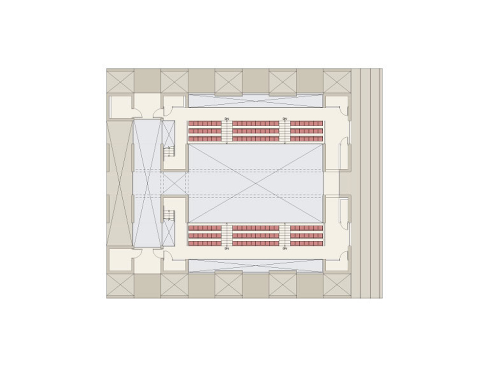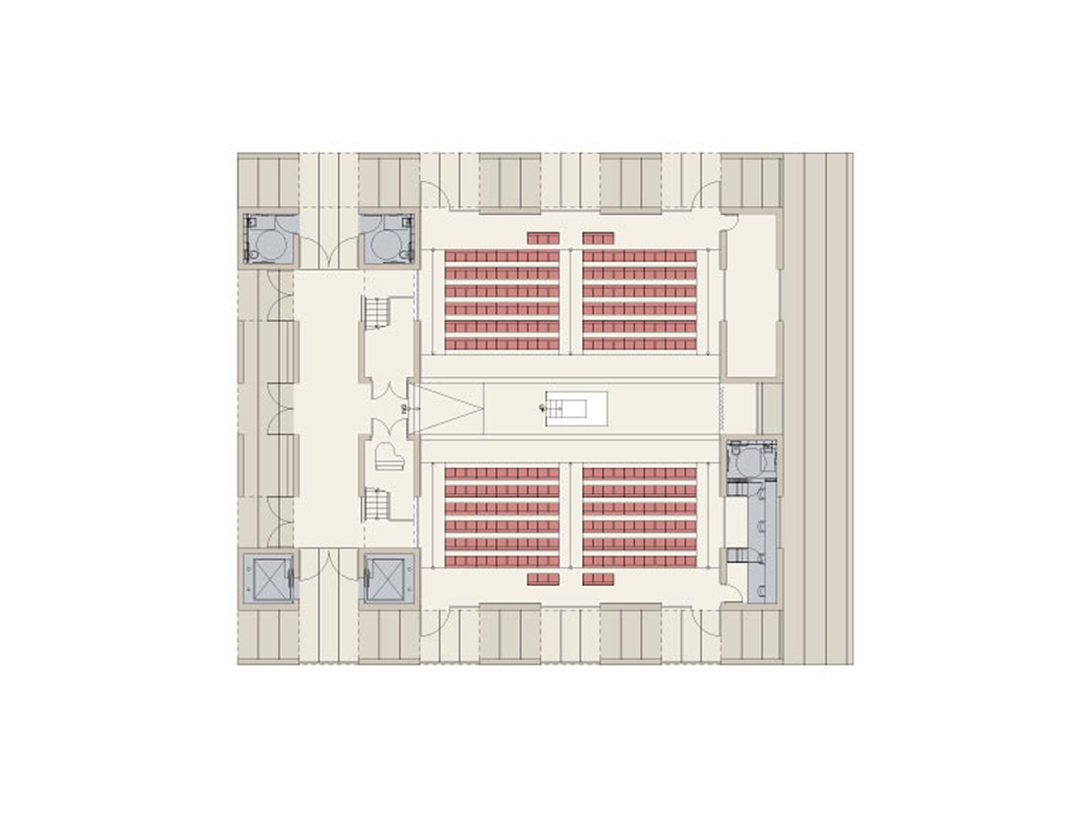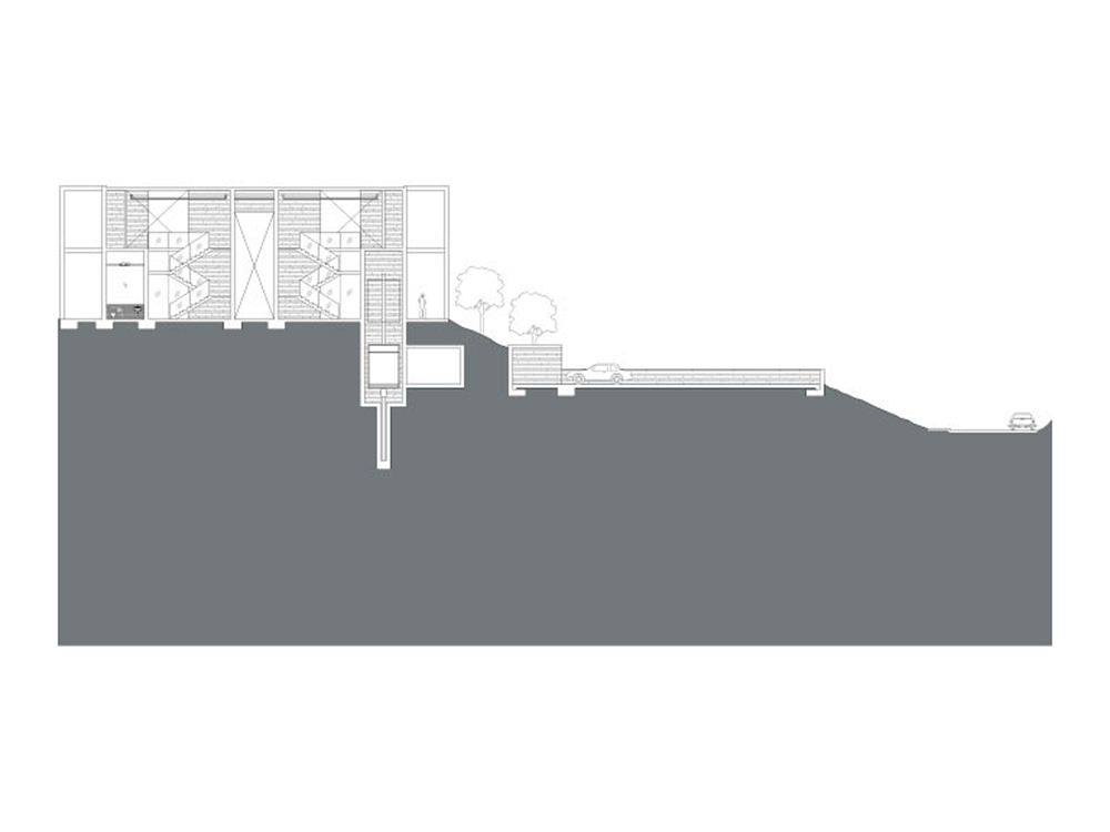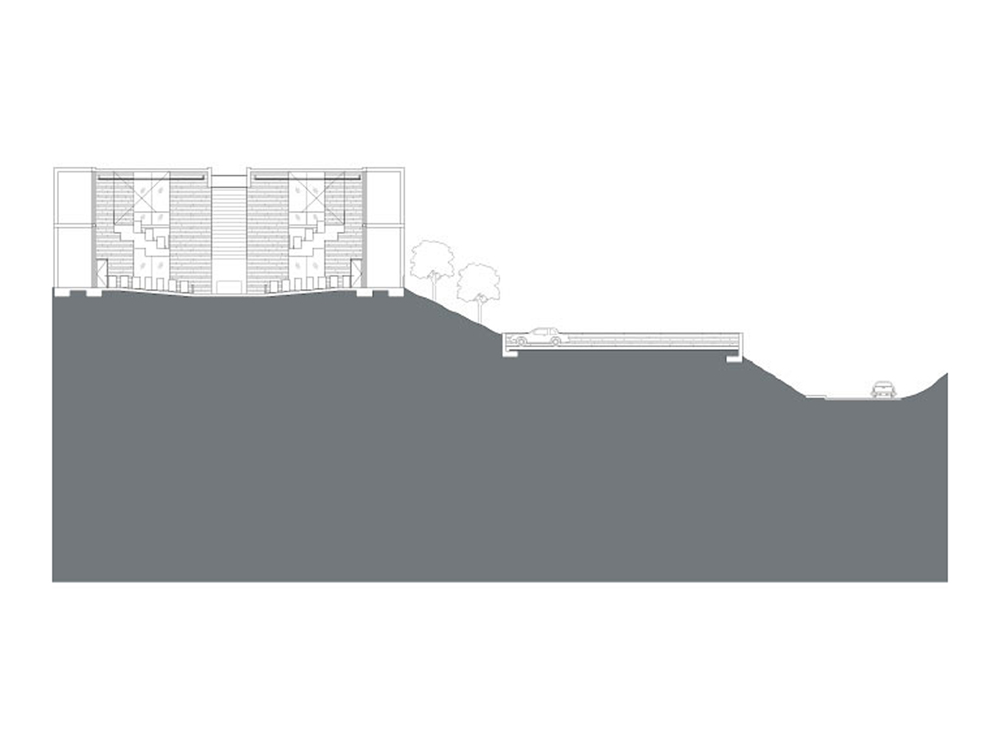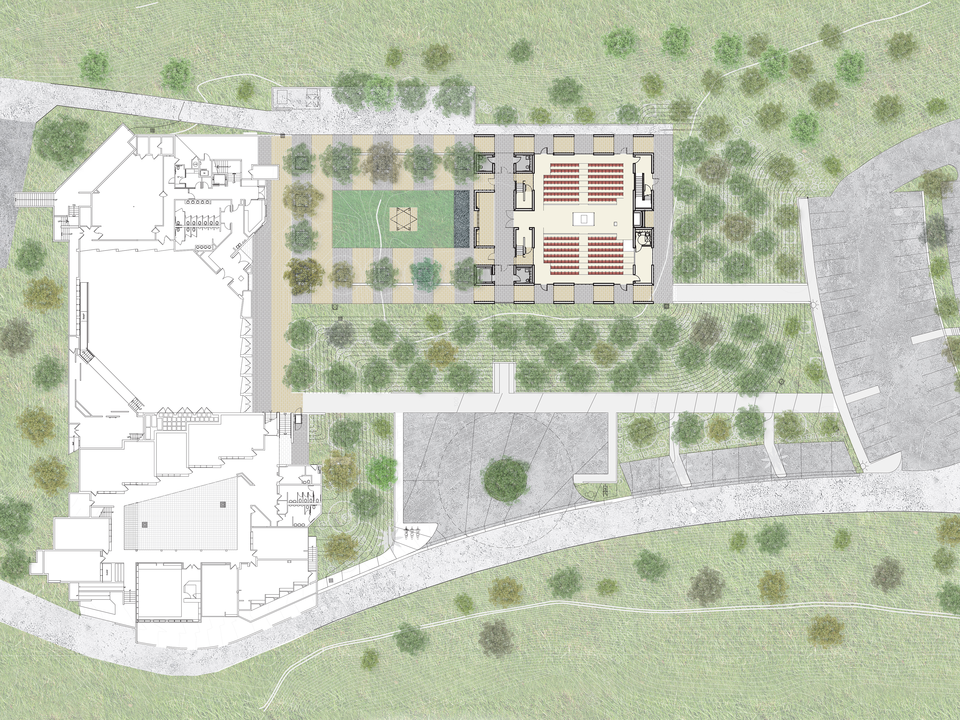The plan optimizes the difficult existing topography, filling the valley with an entry turnaround and parking platform . An elevator rises from this level, arriving at the plaza, and connecting to the sanctuary gallery. This new court, formed between the existing structures and the new sanctuary, is the focus of the congregation.
