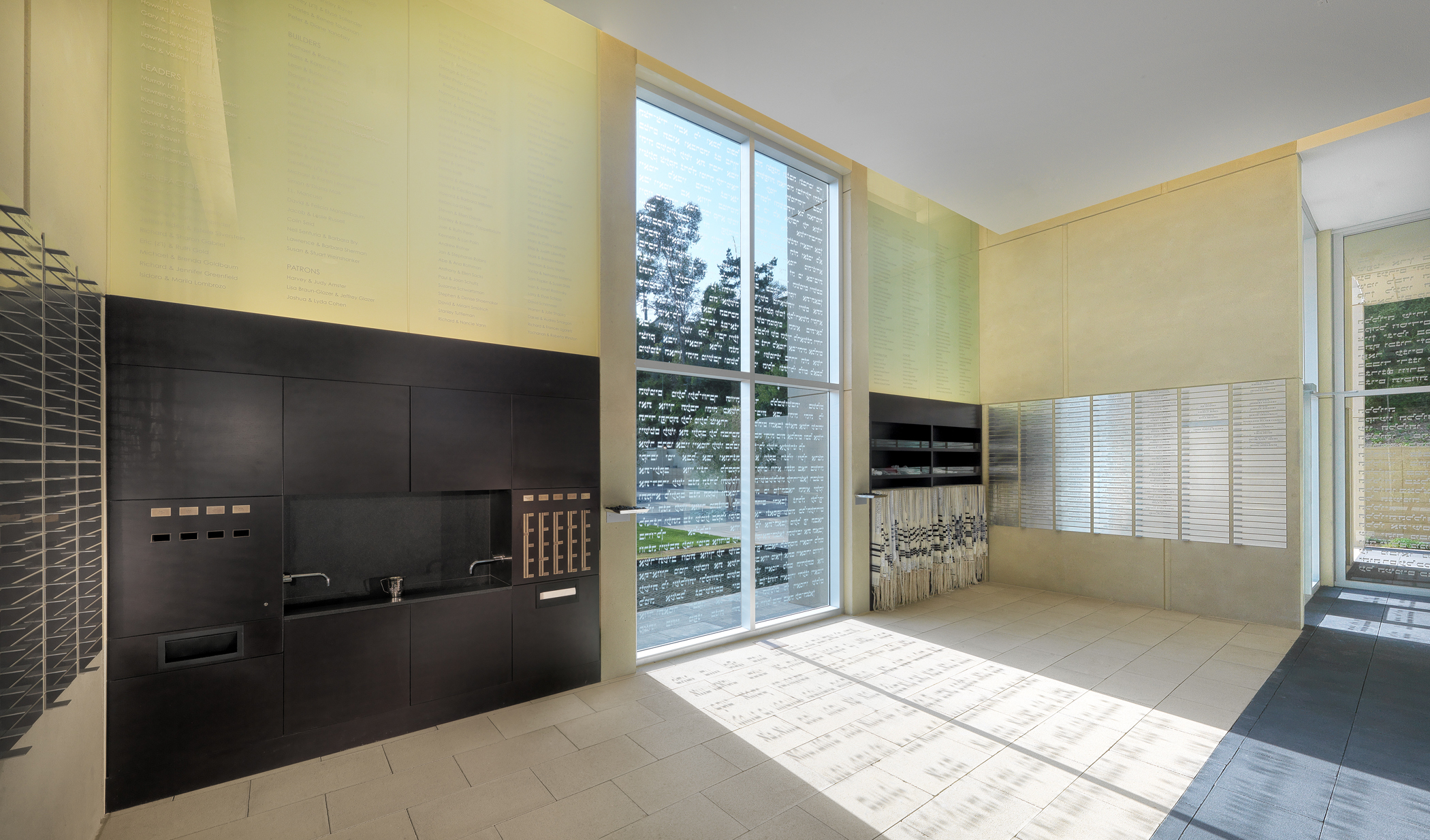 The lobby of the main sanctuary, on the east side of the court, has a two story roof above. In it are traditional elements interpreted in the language of the design: a Tzedakah box, four slots embedded in a column, clocks to announce service times, kippah and talit receptacles, hand washing, and bookshelves.