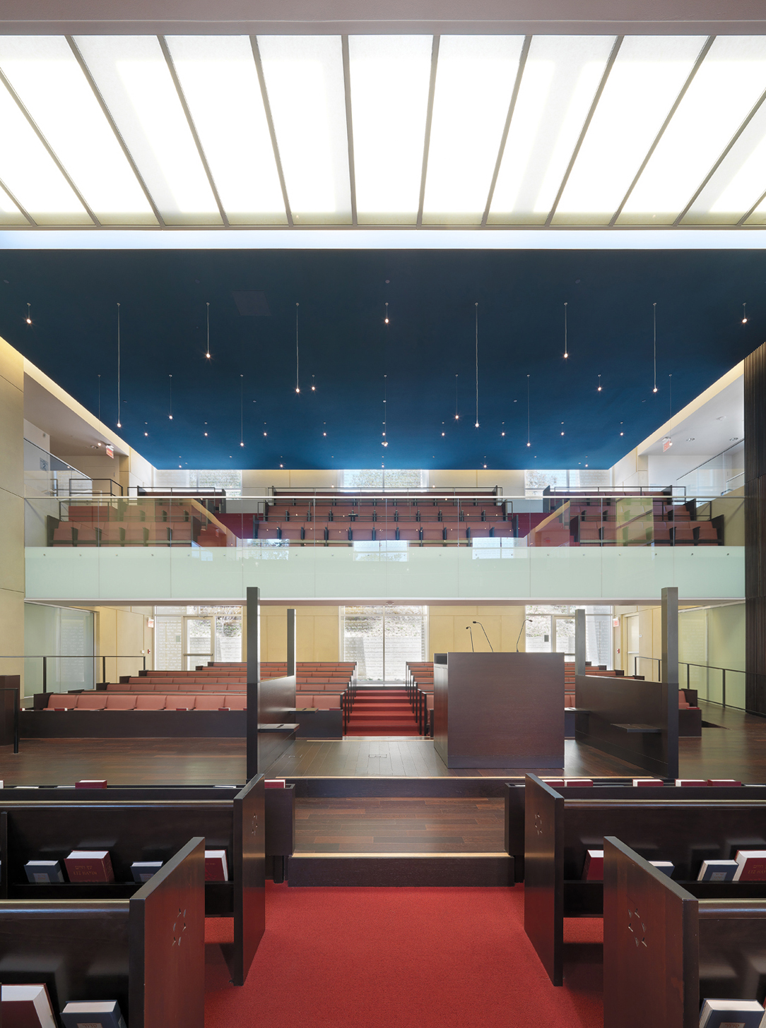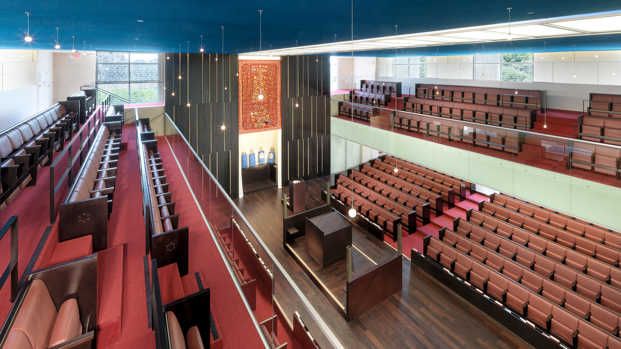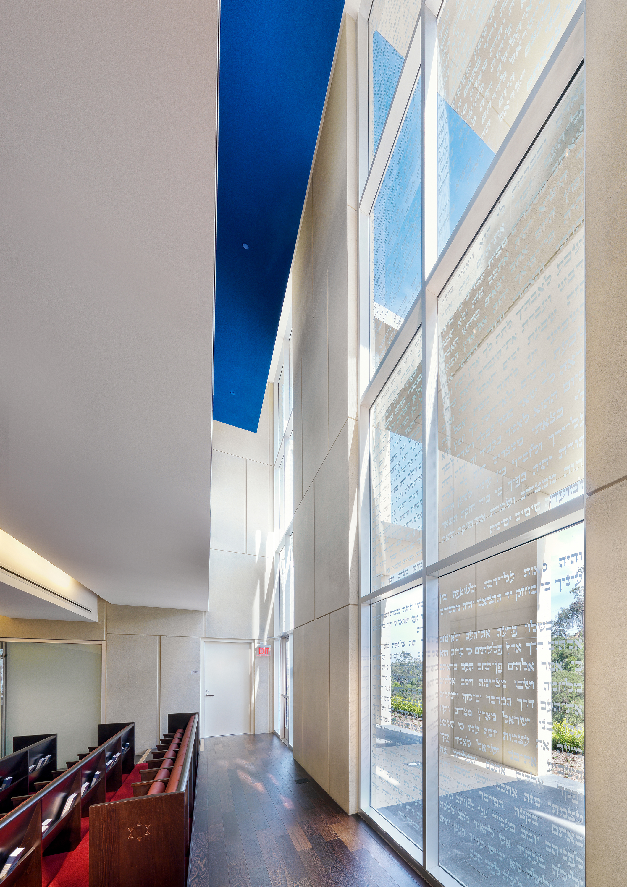 The sanctuary is a box of light protected by pared thick concrete columns alternating with voids and glass, creating the image of minorah. On the glass columns, the Five Books of Tehillim (Psalms) are inscribed, providing a rich calligraphy tapestry of meaning. The interior evokes the atmosphere of warmth and security using colors that are traditional; gold, purple, maroon and blue. The furniture is dark walnut. Stars of light emanate from menorahs. Two galleries float in the space, providing additional seating on an upper level.