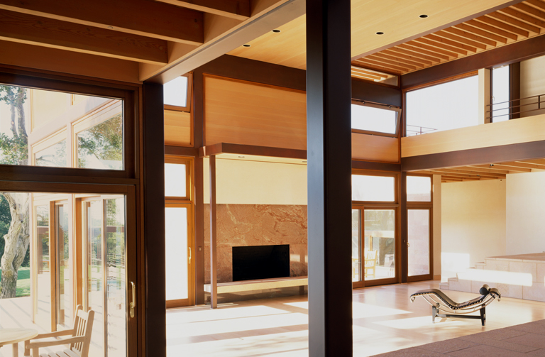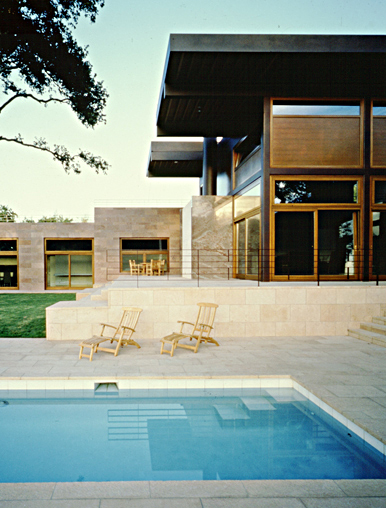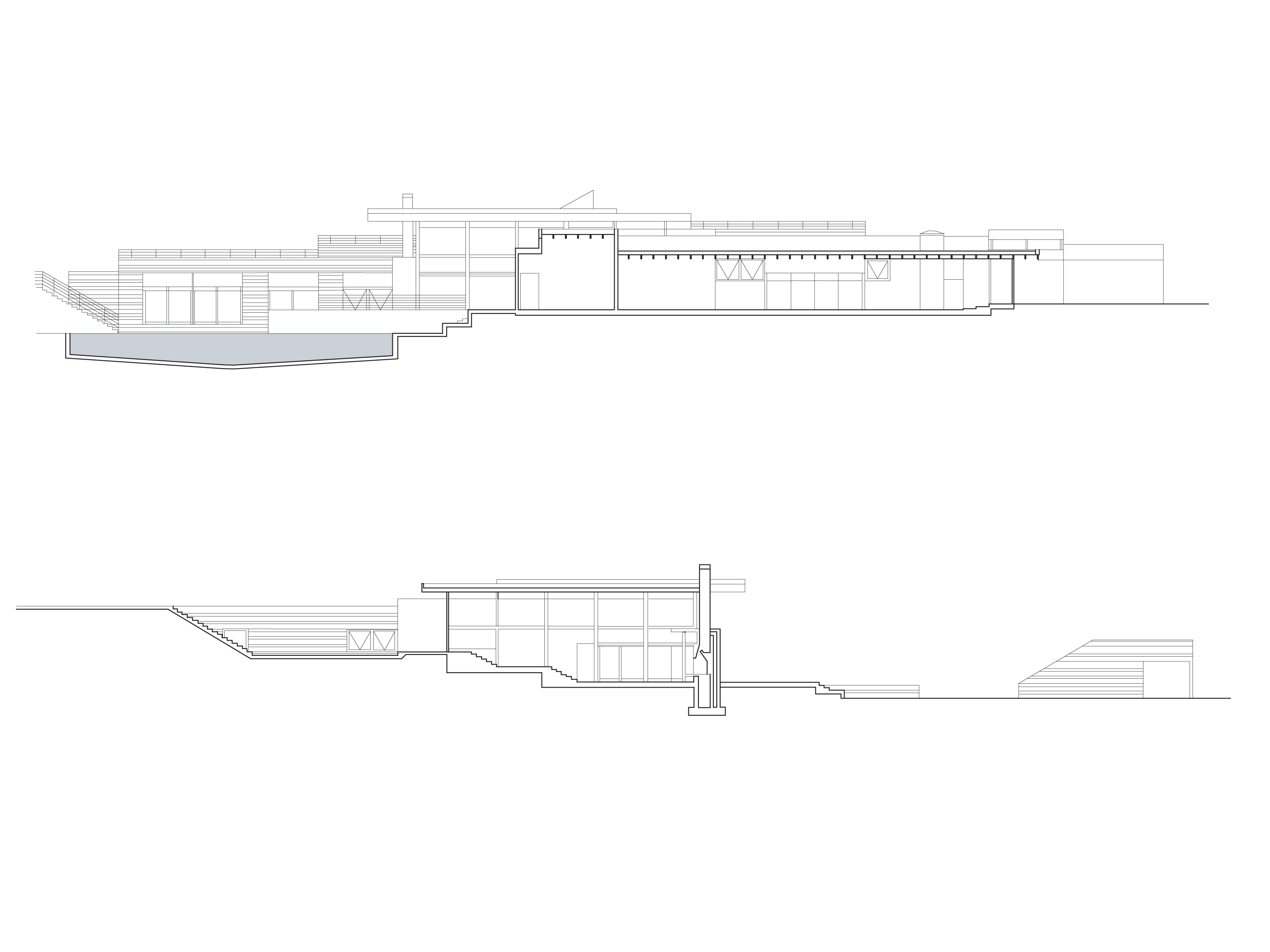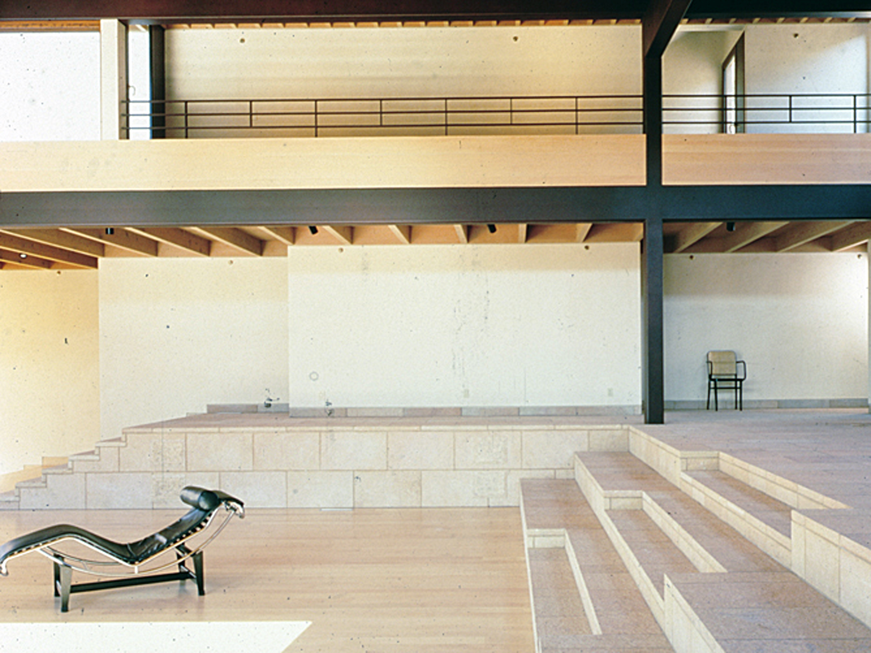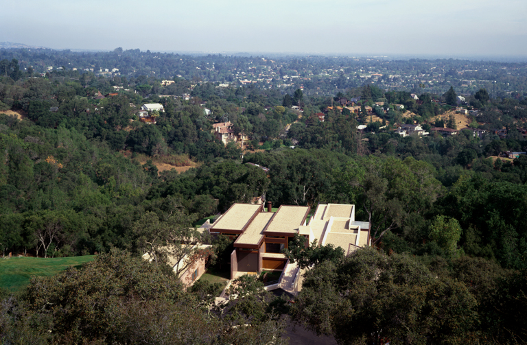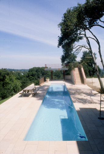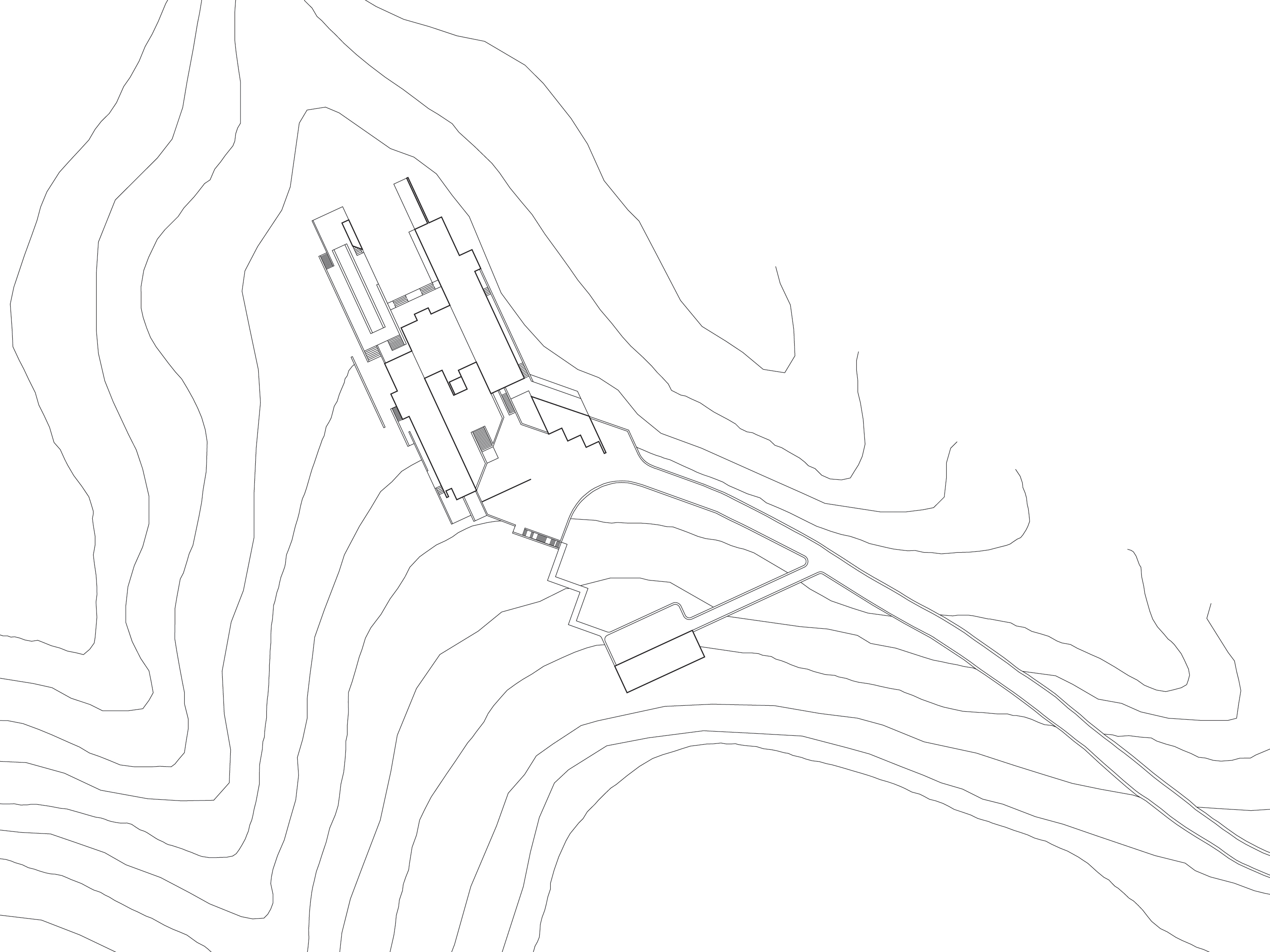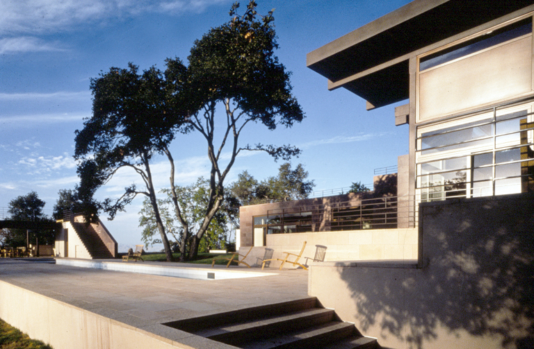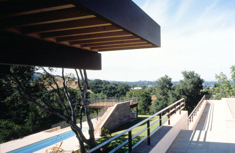 In the hills above Los Gatos is a promontory that points to San José in the distant north. On the east is a ravine; on the west, a canyon dividing the promontory from a cleft mountain; and to the south, the continuation of the hill. Several old oaks remain on the flat clearing that provides the site for the Di Napoli house. Two bars, or walls, of inhabited space secure the open area of the promontory. A pavilion joins these walls, dividing the site into two courts, an entry court and a garden court. The pavilion is hollow, a space folded out of itself. The thickened walls track the contours of the terrain, remaking the ground on the roof. This roof, approached from above, forms the elevation of the building. It is also a promenade surveying the garden court, pool, canyon, and mountain. From the edge is a view of San José. The walls conceal and reveal views of the surroundings, providing varying experiences of the site from the rooms and different views along promenades and passages. The east wall has a guest wing and eating area. The west wall is the master suite with library and gym. The connecting pavilion is the formal living space. Below a garage is a caretaker’s suite. Above the house, in the hill, is a barn for a car collection, with a studio apartment and a deck overlooking the house riding the promontory below. The house is a symphonic tracking of the landscape through intersecting vertical and horizontal planes.