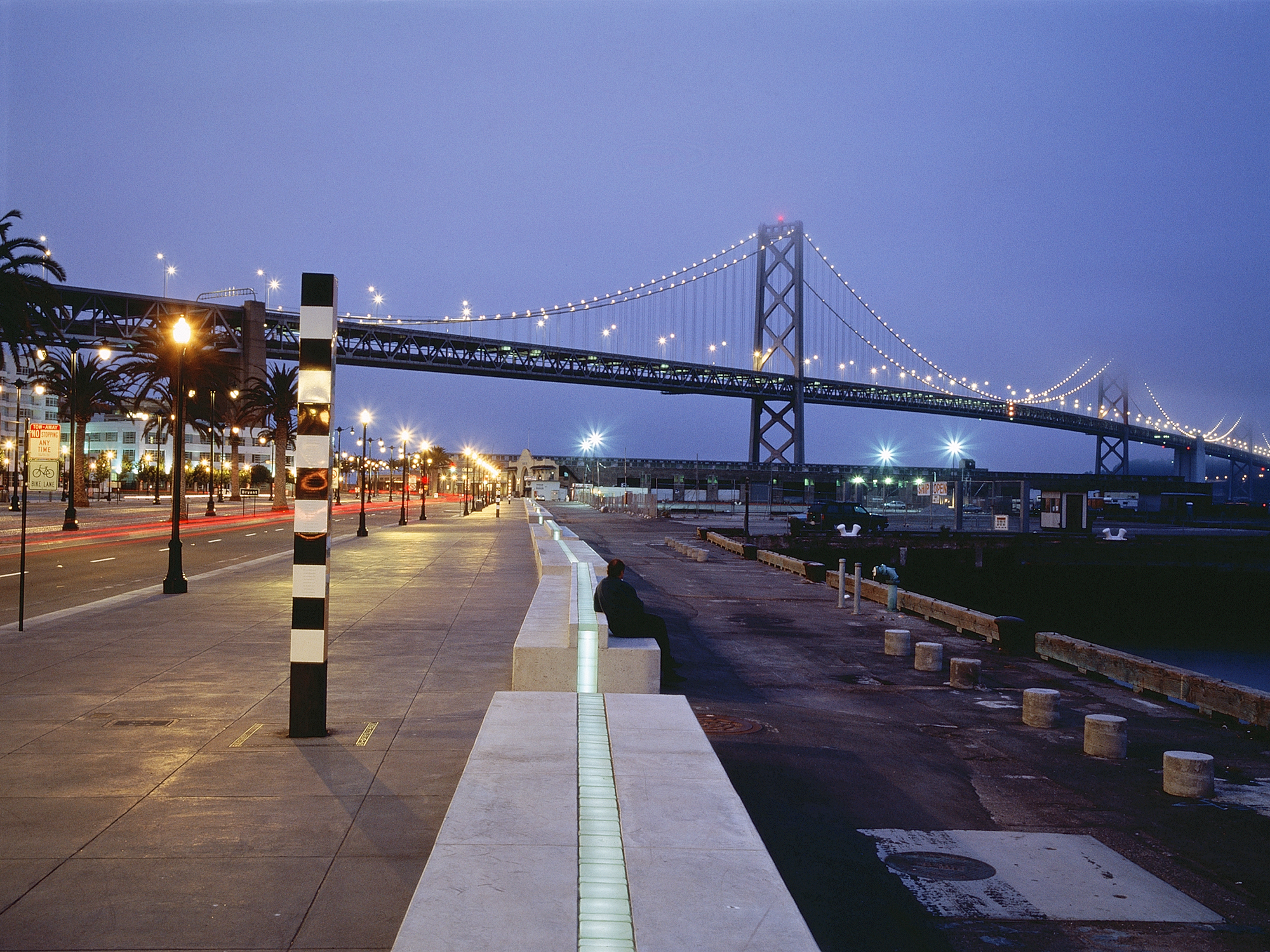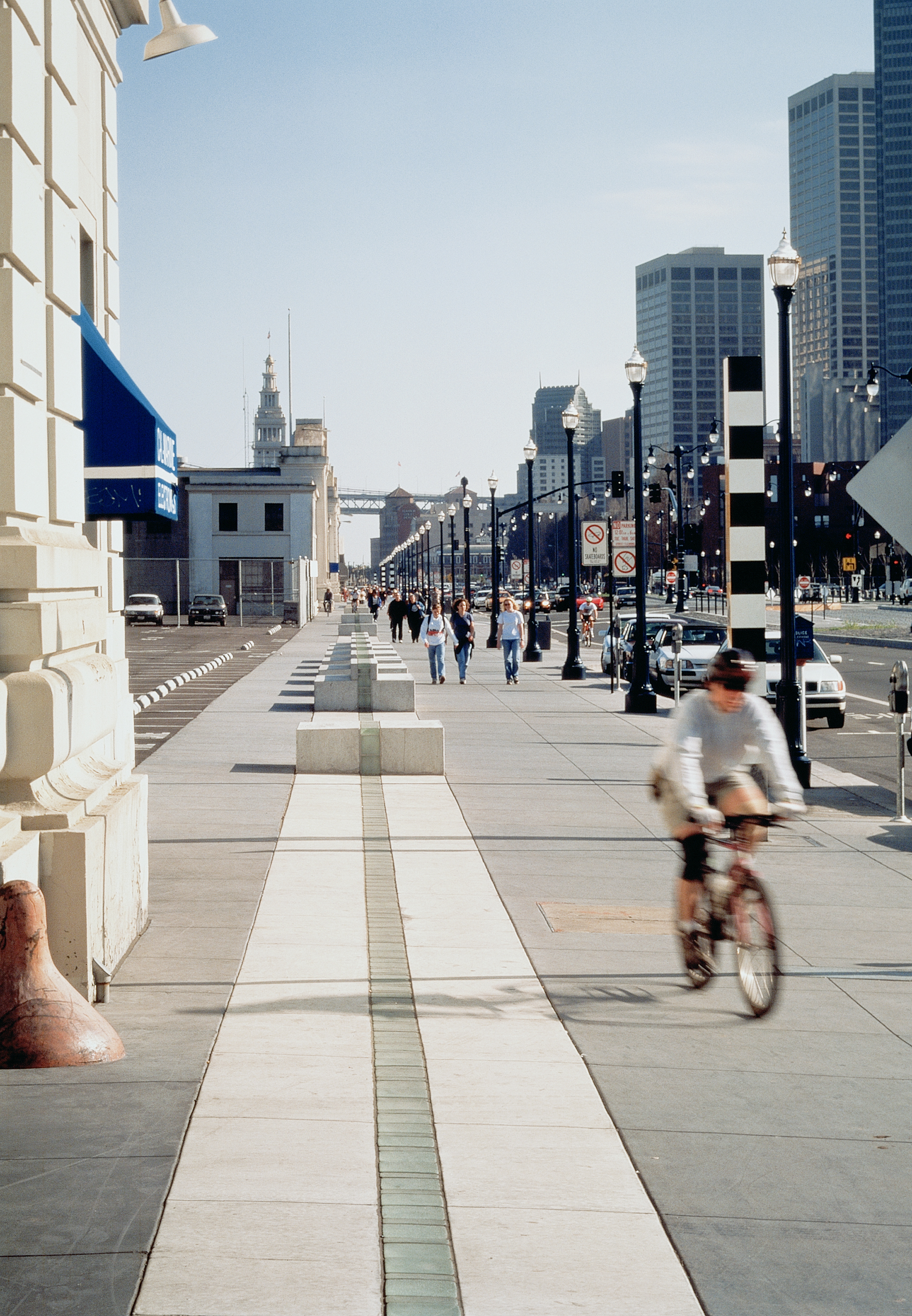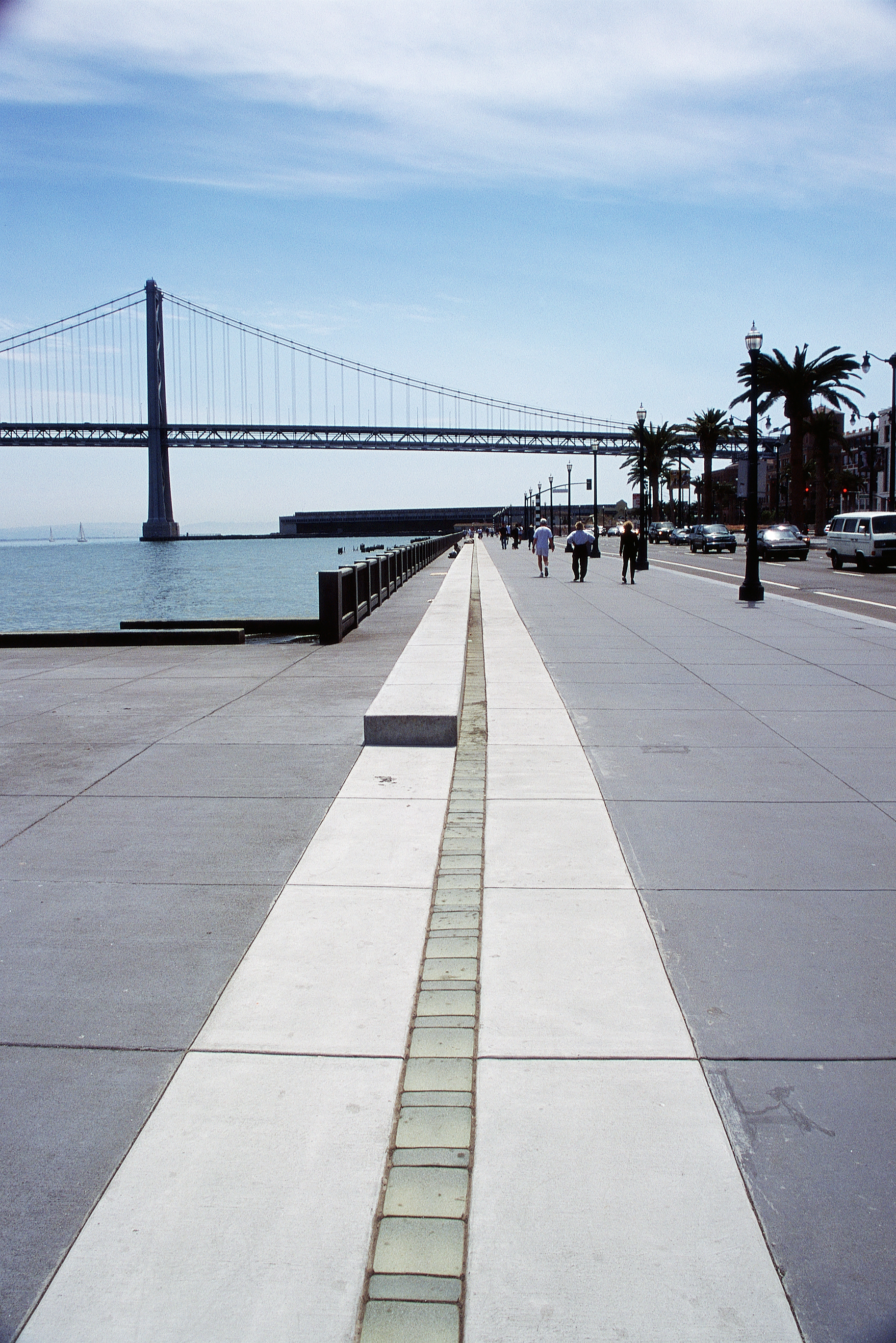 The Embarcadero ribbon is a line at the edge of the city, a line that borders the city, a line to walk at the edge of the city. It is a strip of white concrete, five feet in width—the same size as the grid of the promenade—and two and a half miles long, marked in the center with an eight-inch glass strip. This strip is the pedestrian equivalent of the white traffic stripe that instructs automobile traffic on roadways; here it provides directives and opportunities for people walking the promenade.