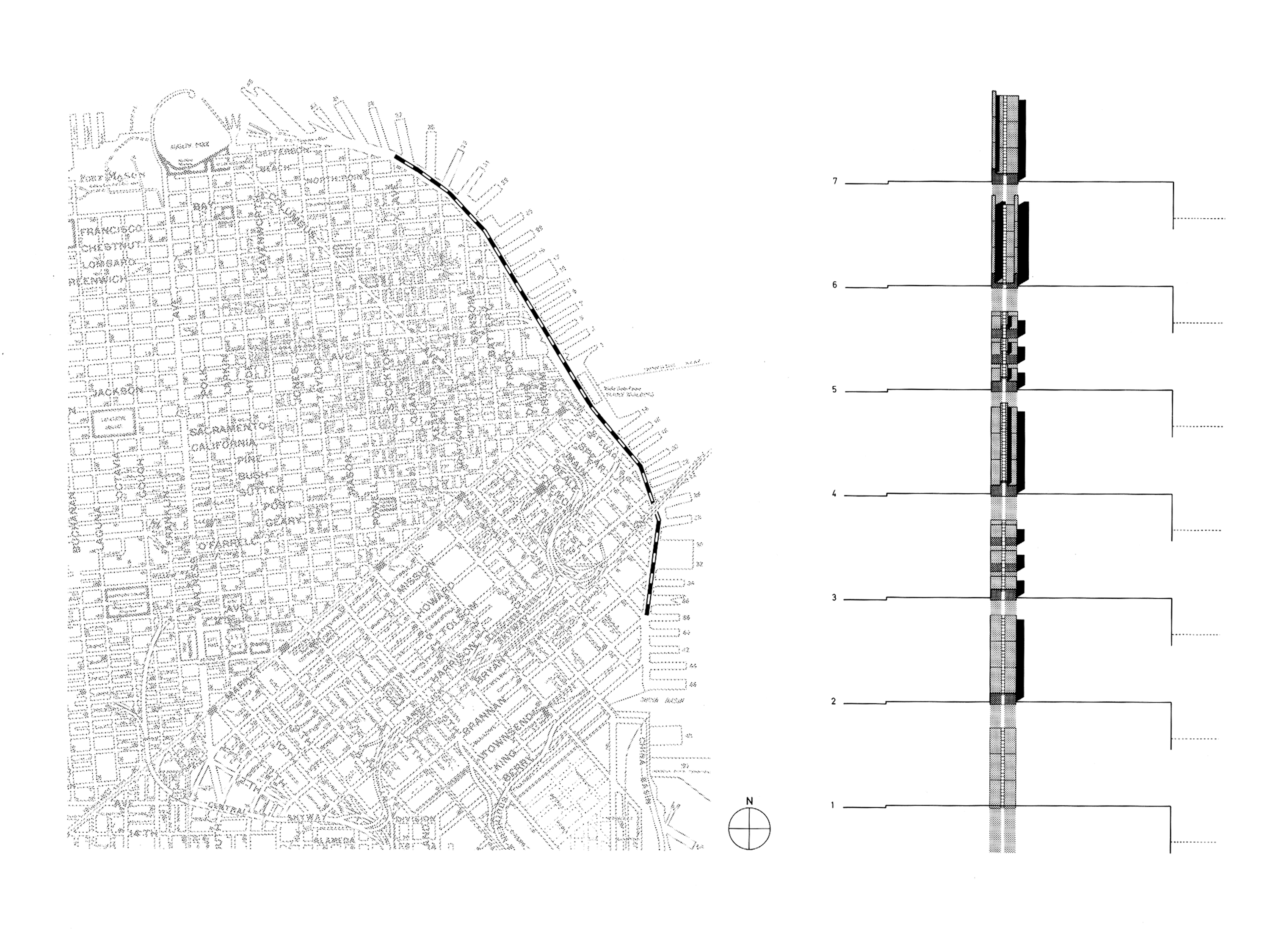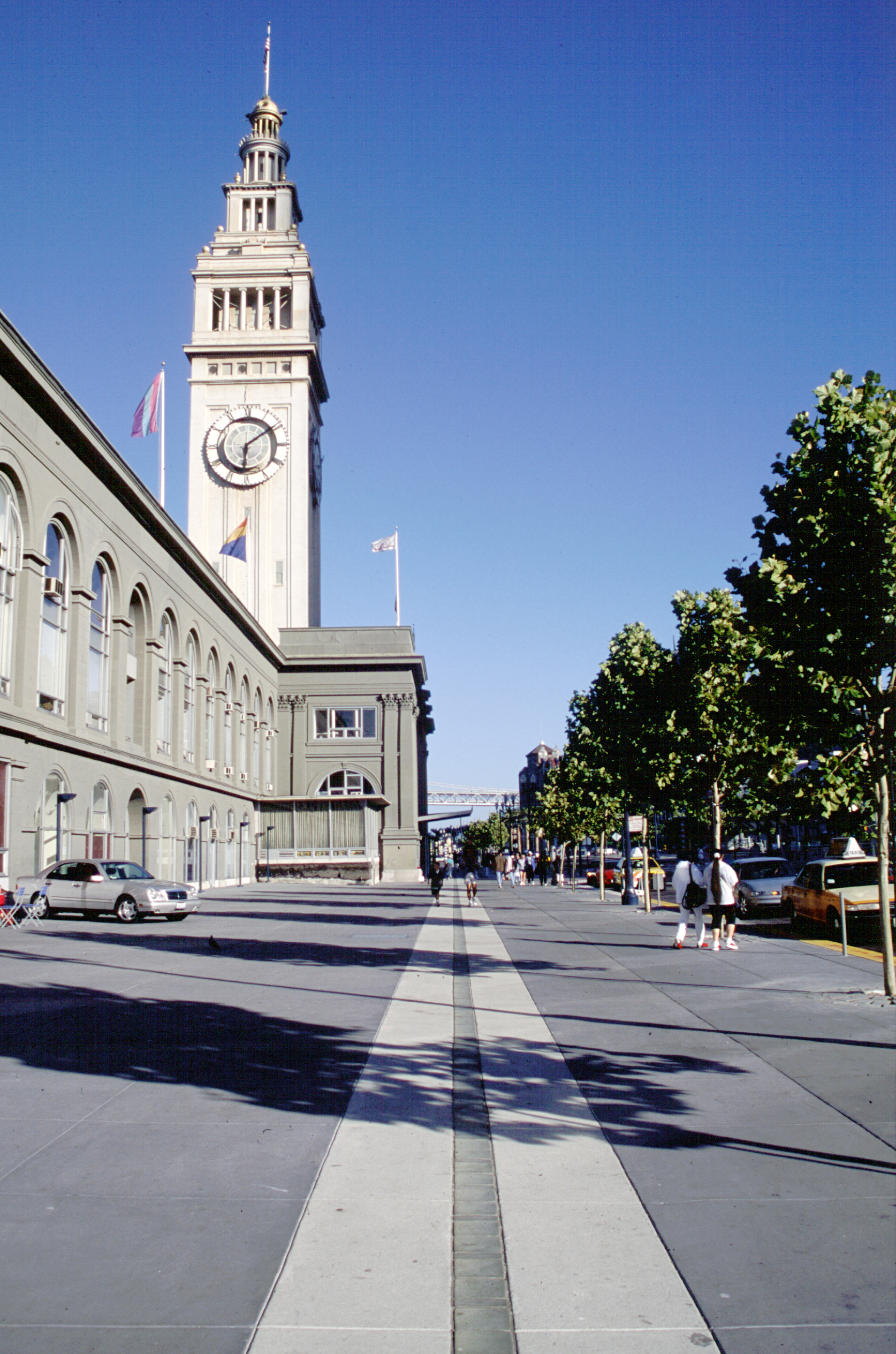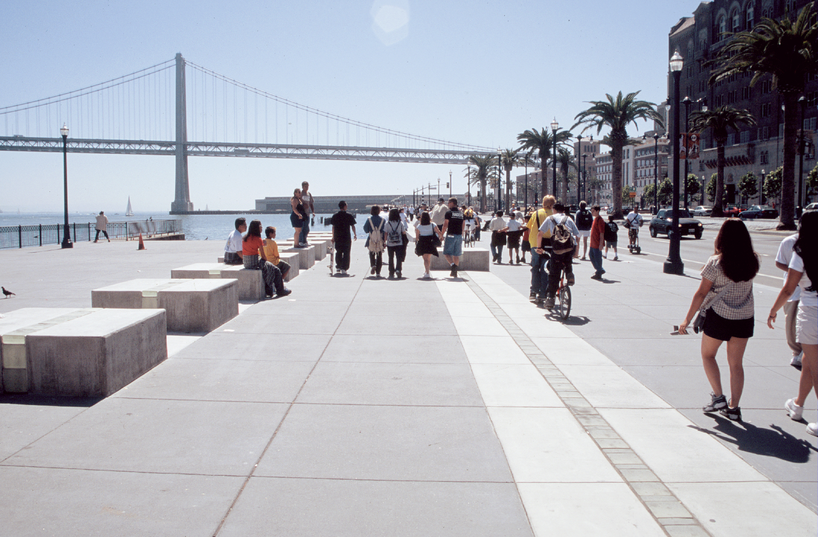 The Embarcadero ribbon is a line at the edge of the city, a line that borders the city, a line to walk at the edge of the city. It is a strip of white concrete, five feet in width—the same size as the grid of the promenade—and two and a half miles long, marked in the center with an eight-inch glass strip. This strip is the pedestrian equivalent of the white traffic stripe that instructs automobile traffic on roadways; here it provides directives and opportunities for people walking the promenade.