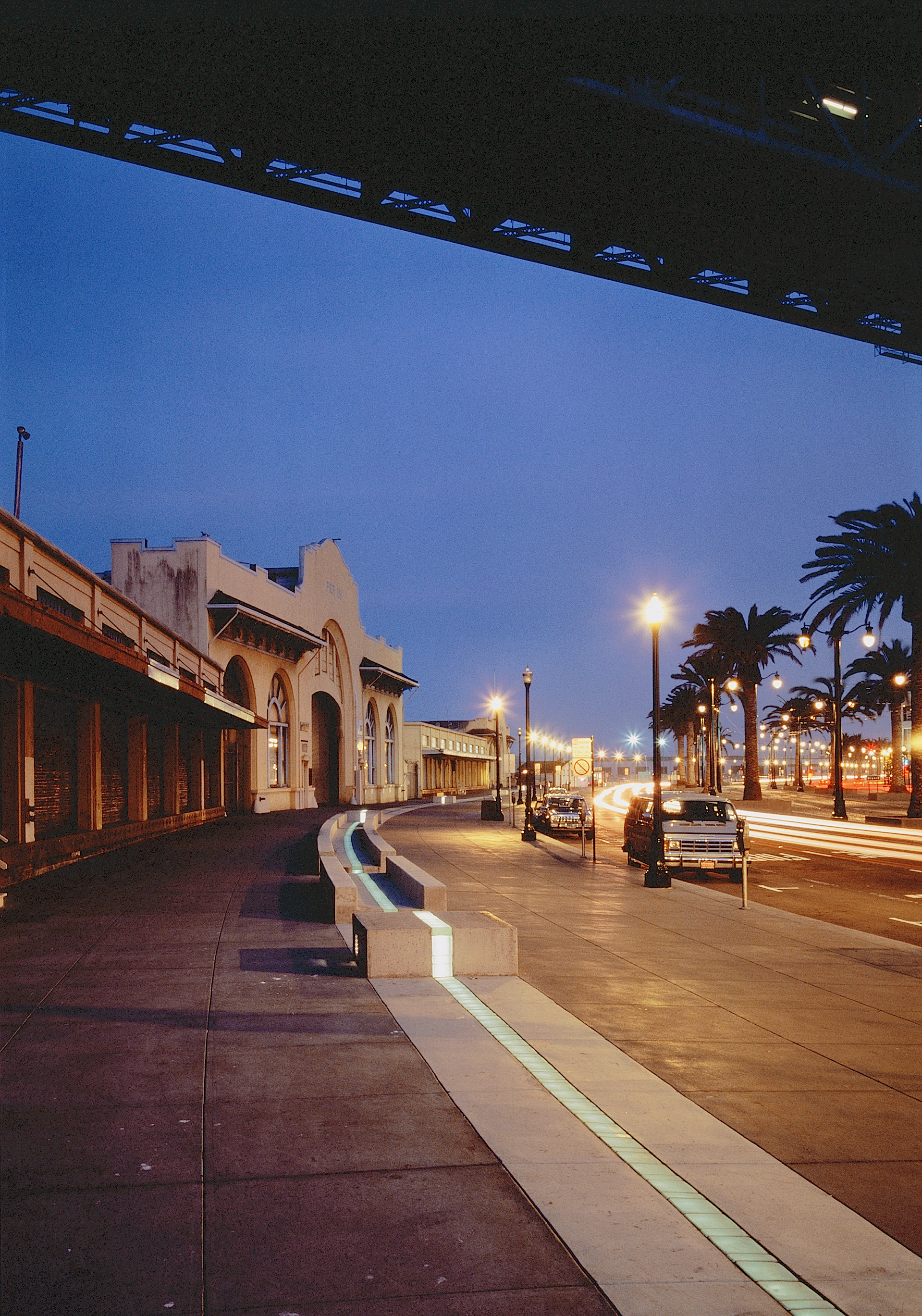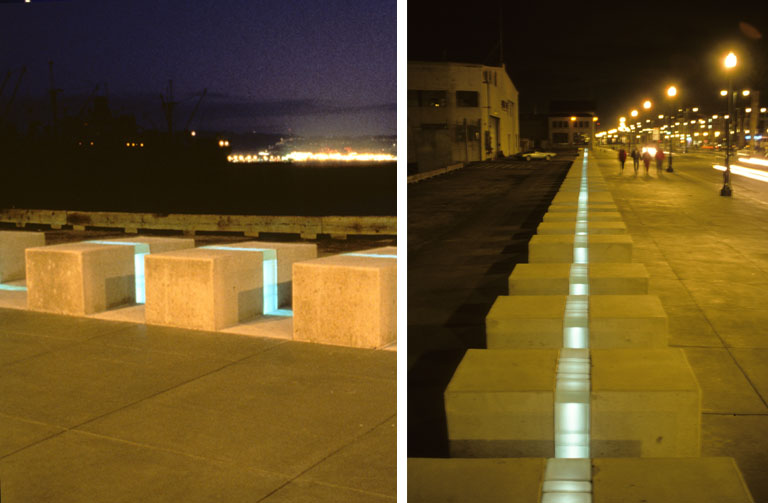 At night, the glass strip at the center of the ribbon is lit with fiber-optic cable, becoming a stream of Ribbon Variations light reflecting the San Francisco Bay, cuing the journey along the city edge. The third phase of the ribbon is the section in front of the Ferry Building;