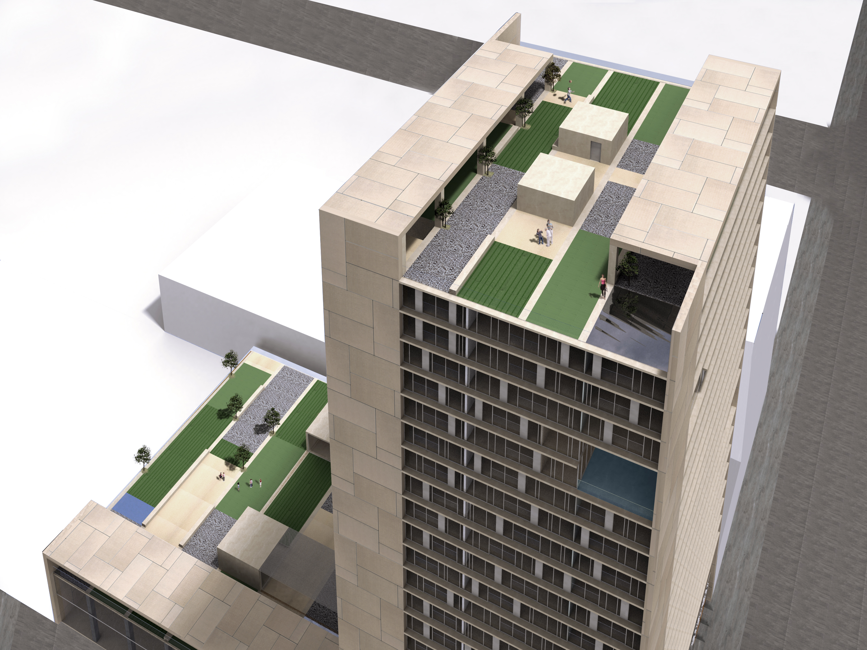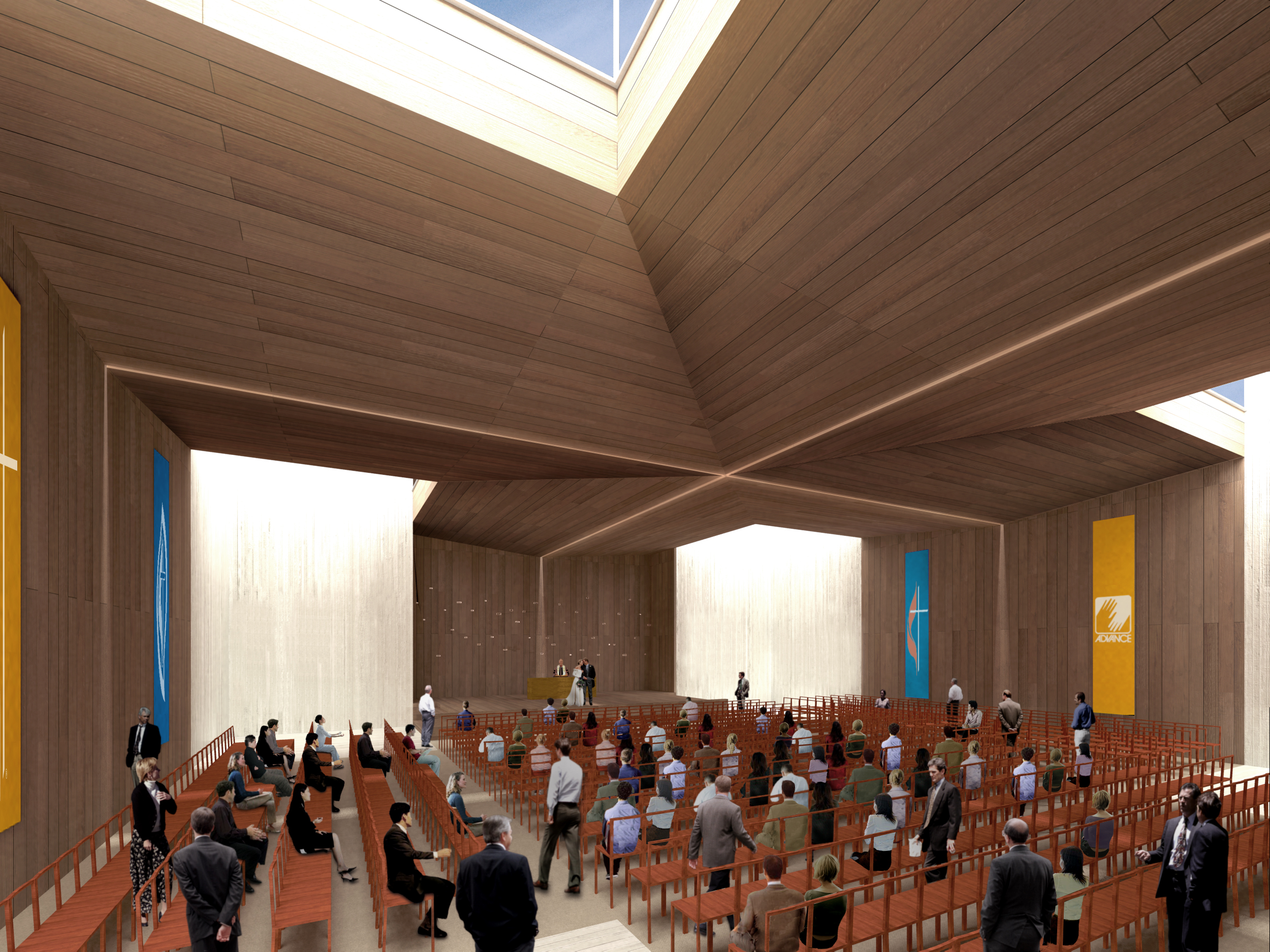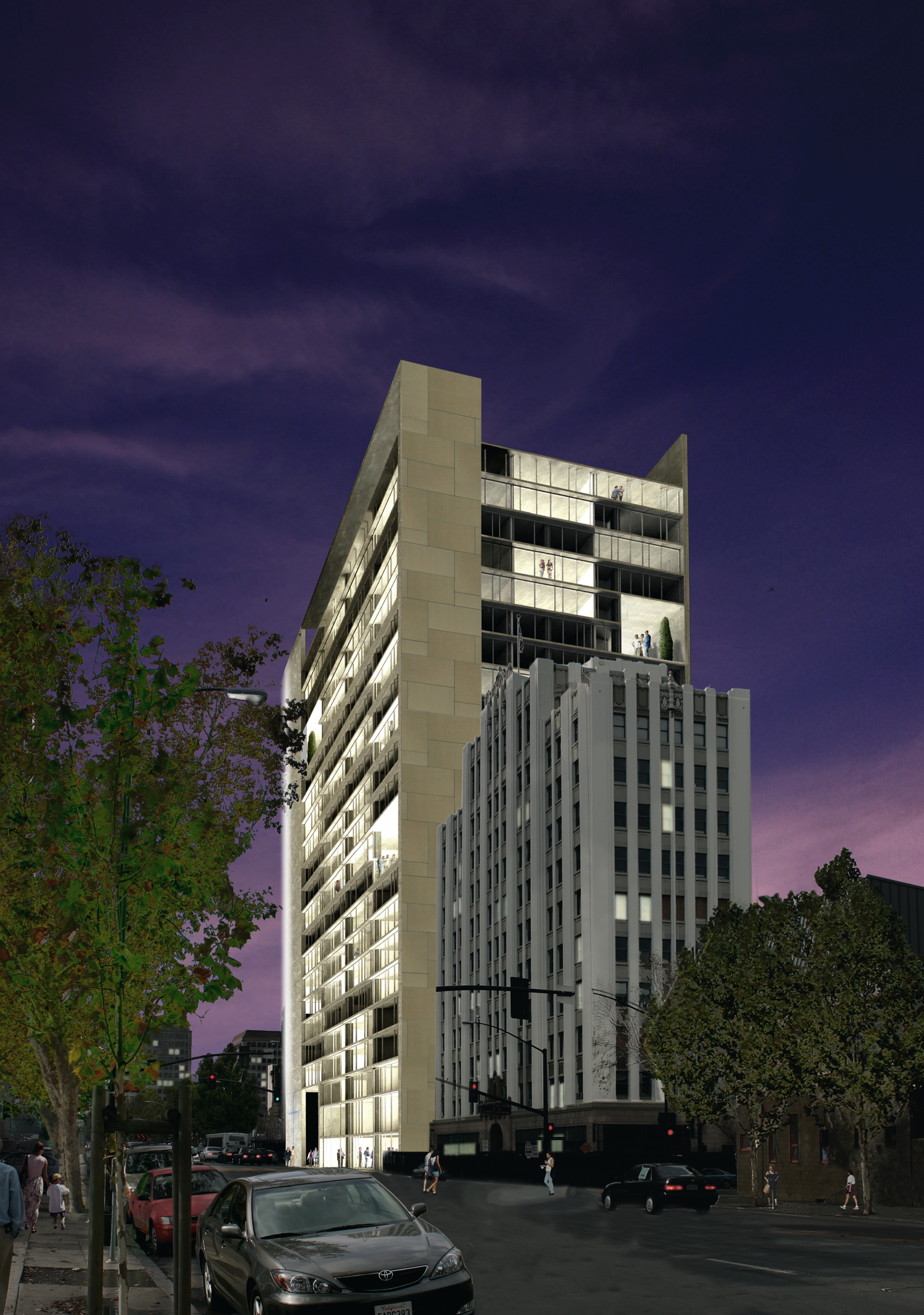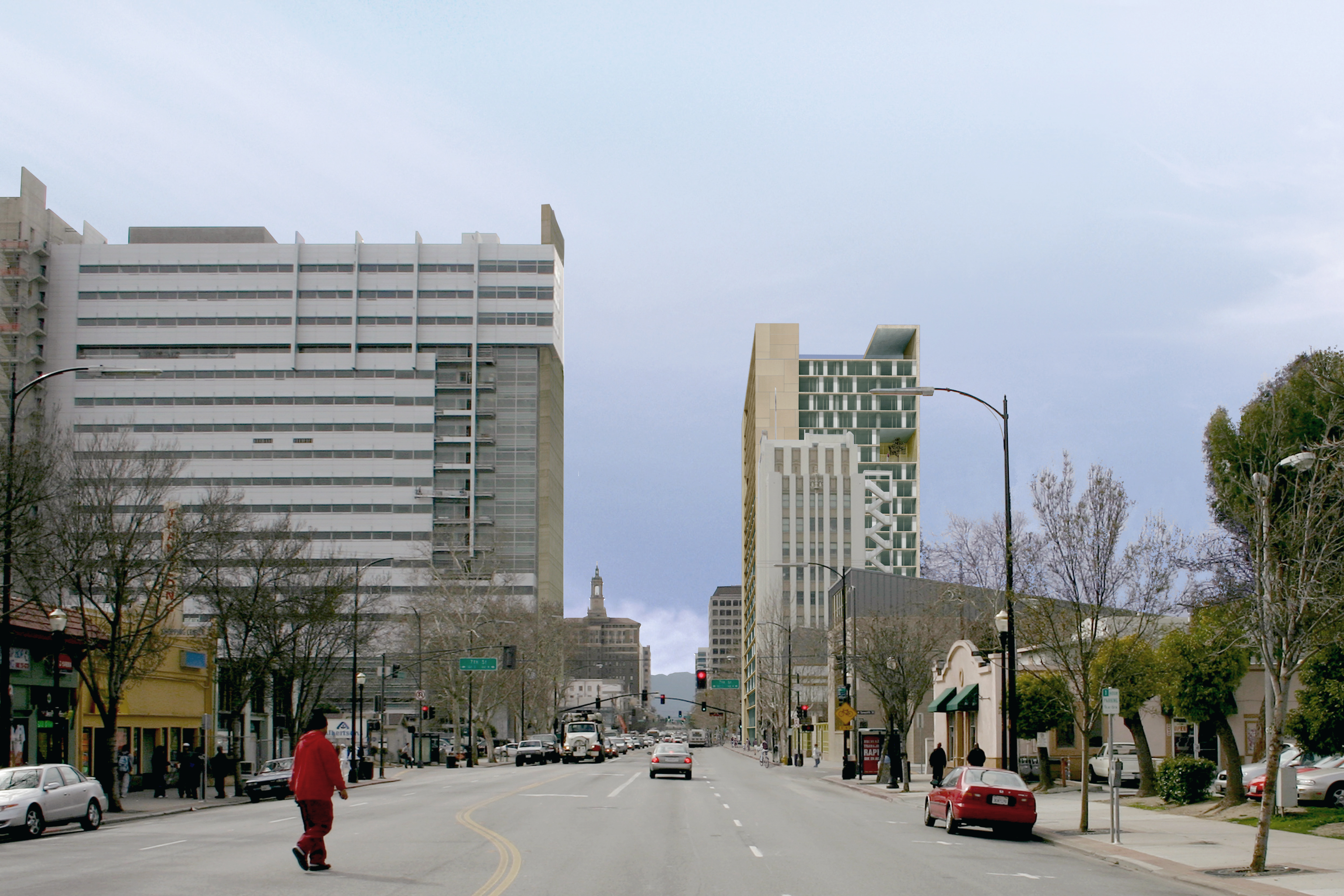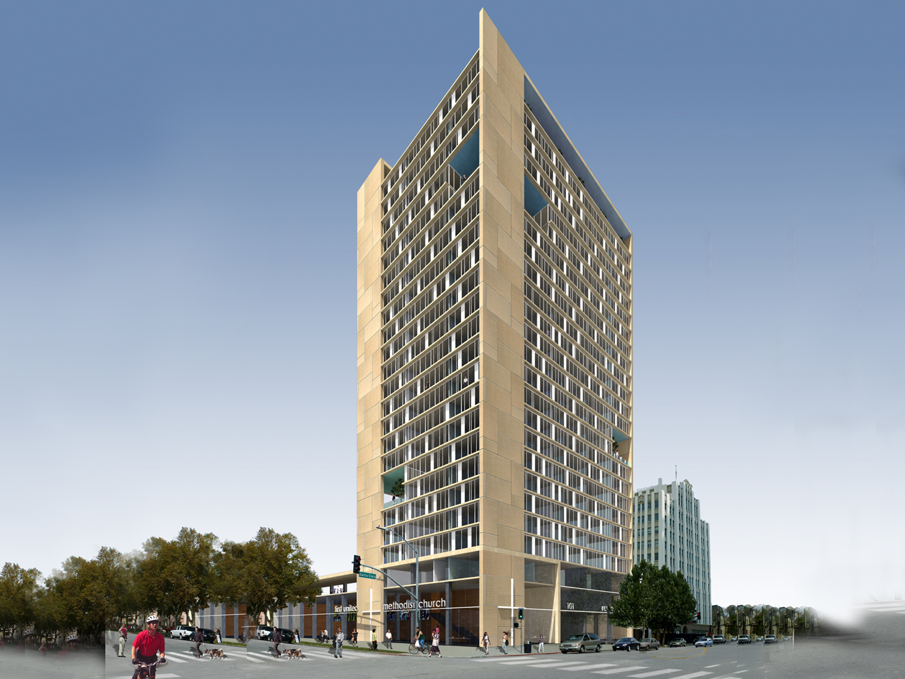 The First United Methodist Church and Tower, on a site across the street from the new San José City Hall designed by Richard Meier, is a mixed-use project with a new church at the base of a twenty-one-story housing tower. The entrance to the church is at the corner of Santa Clara and Fifth Streets. The main sanctuary, social hall, and chapel are organized along a broad double-height gallery that parallels the new Fifth Street paseo; church and city are both separated and connected by a glass wall. On the second level are classrooms and offices, and on the third, the parsonage and a daycare center that opens onto a rooftop play area. The housing tower above the church has a central distribution core surrounded by a service ring, and then open program space, enclosed by the perimeter skin.