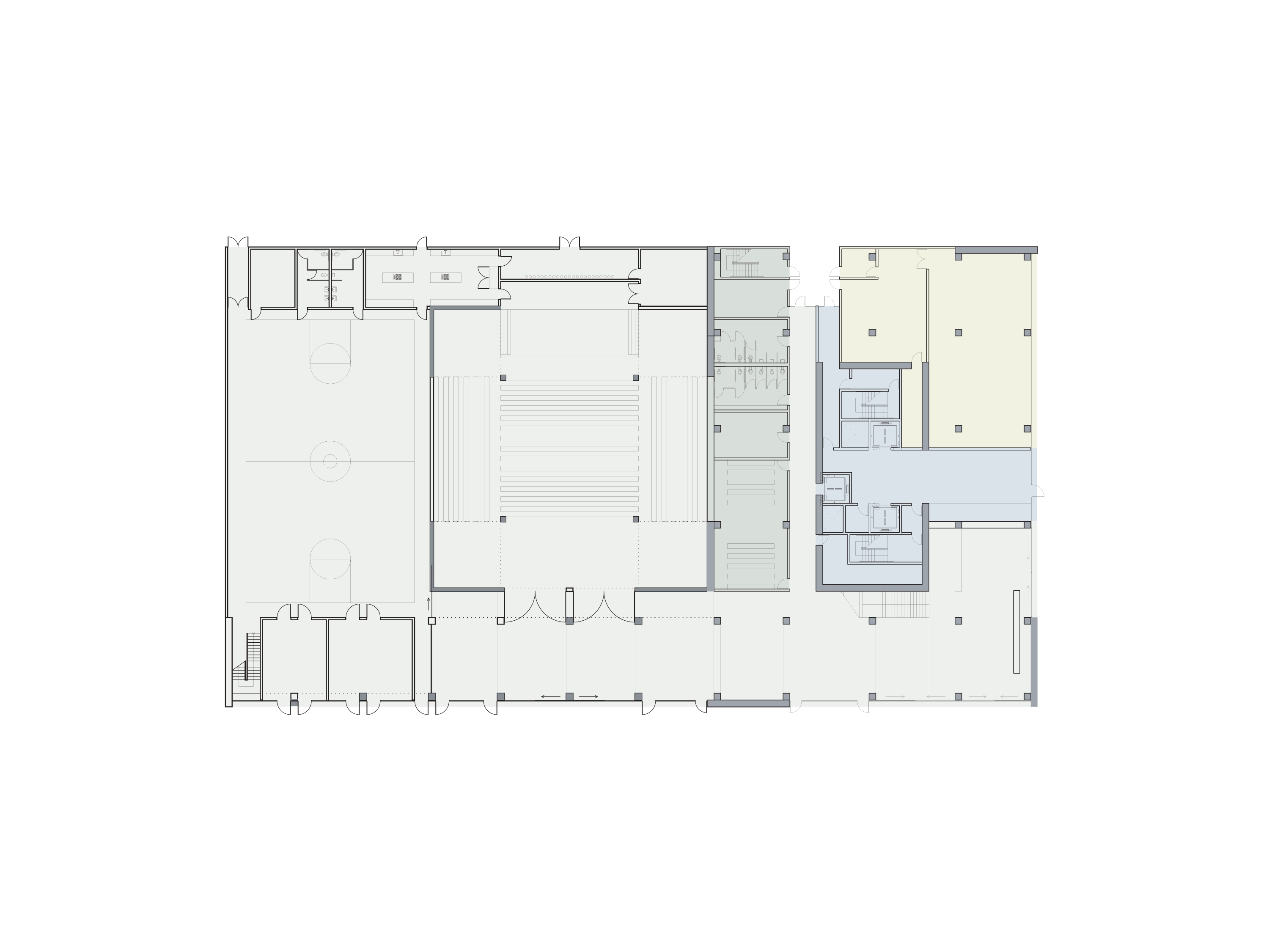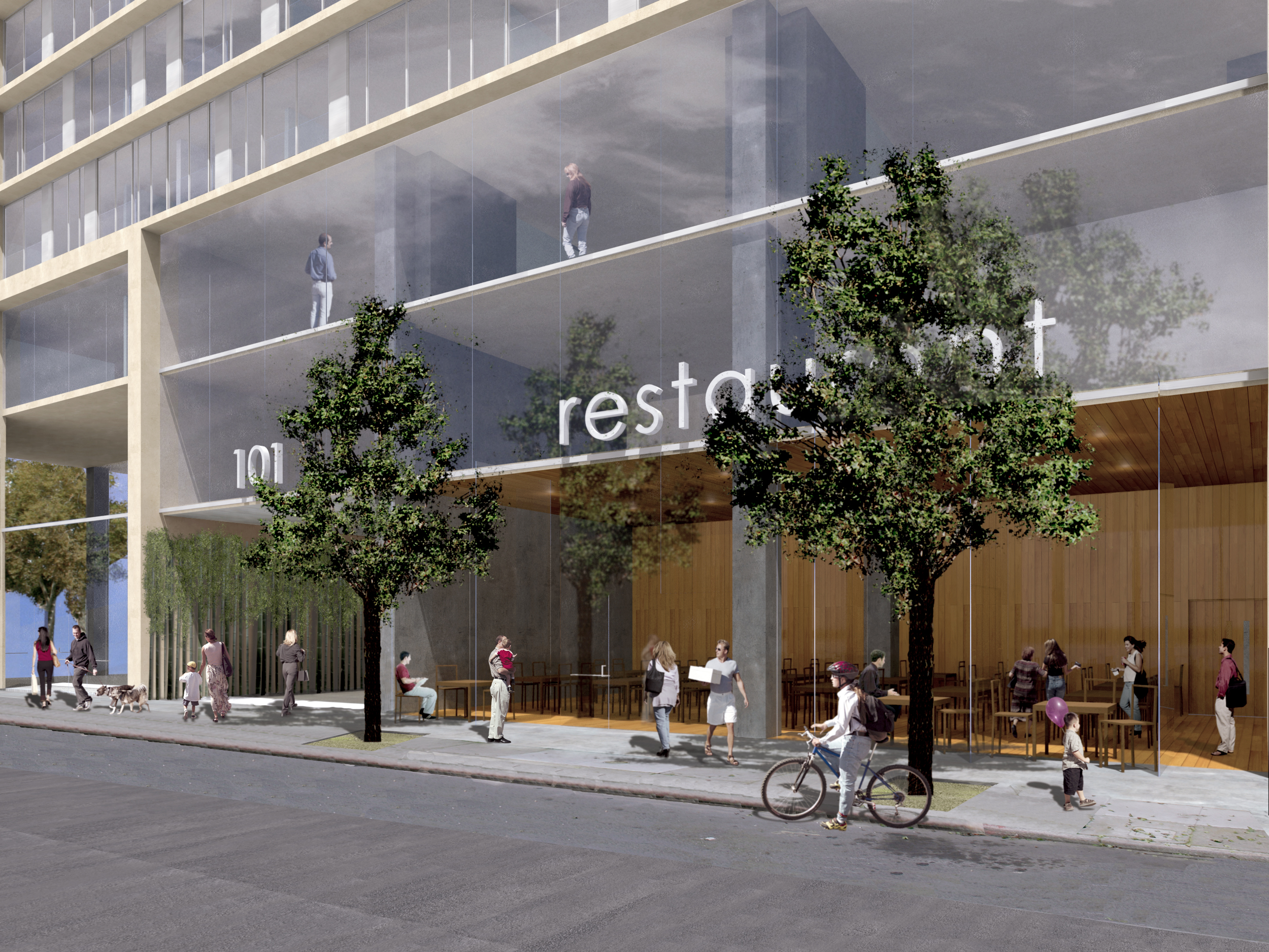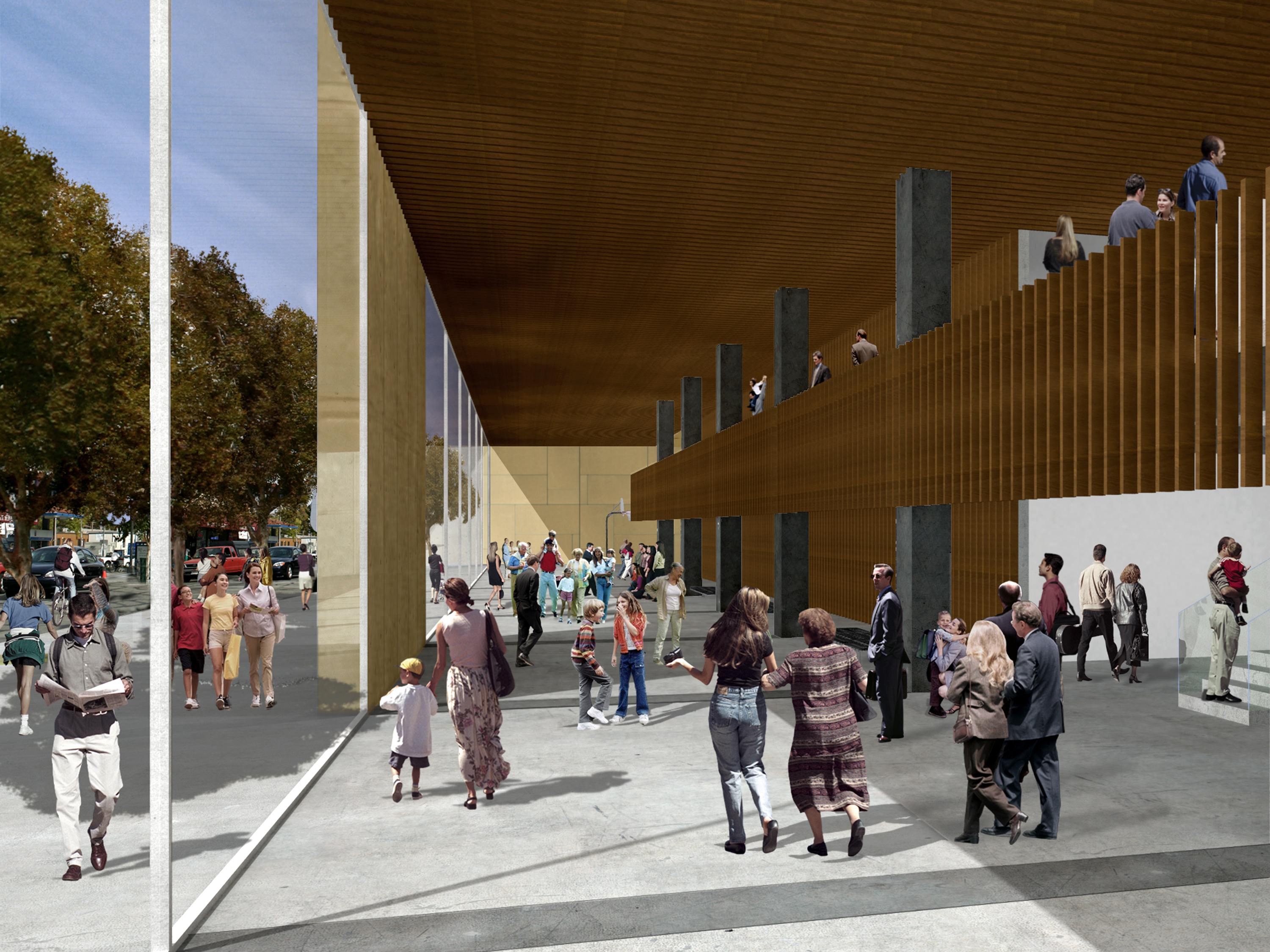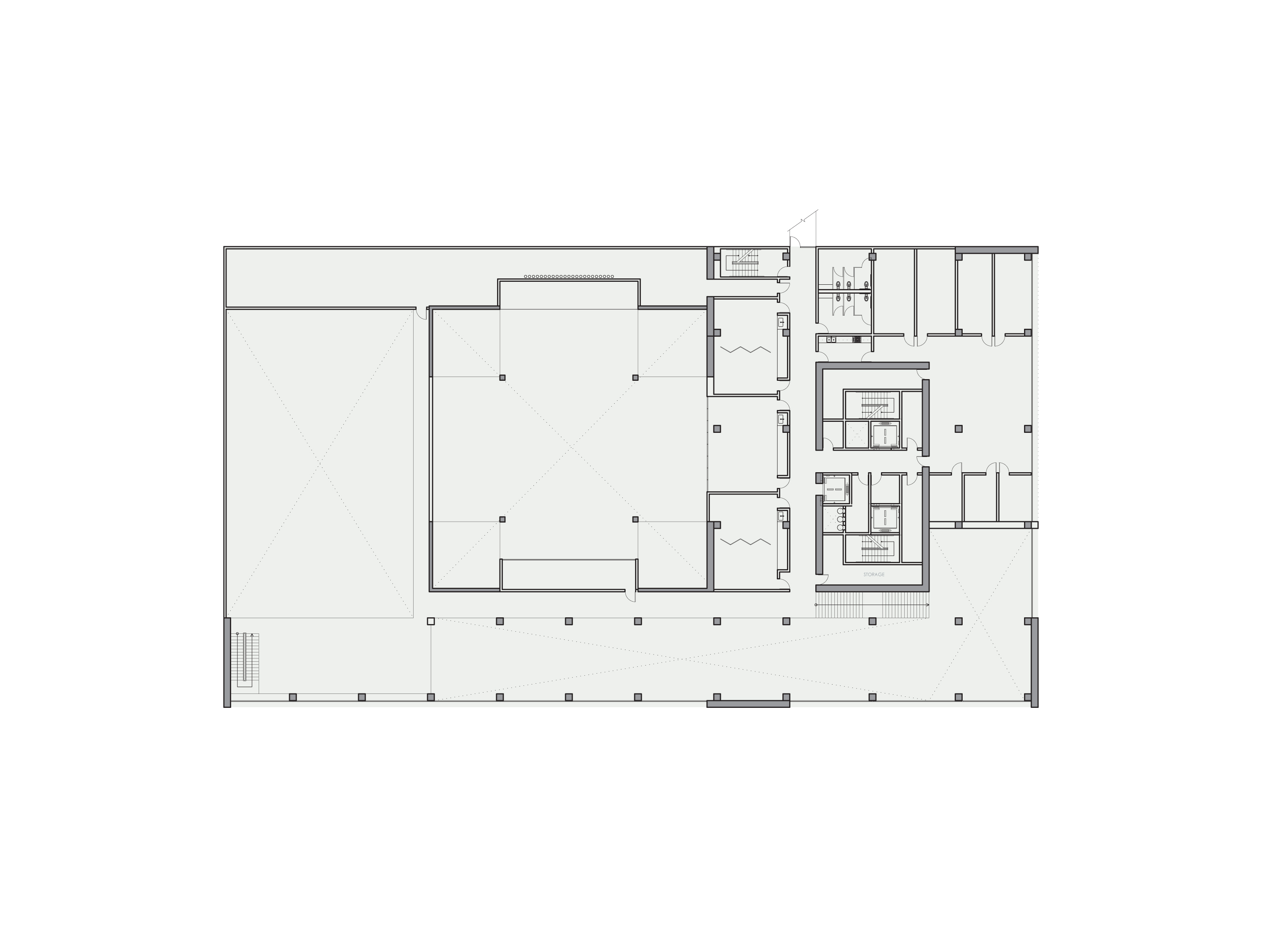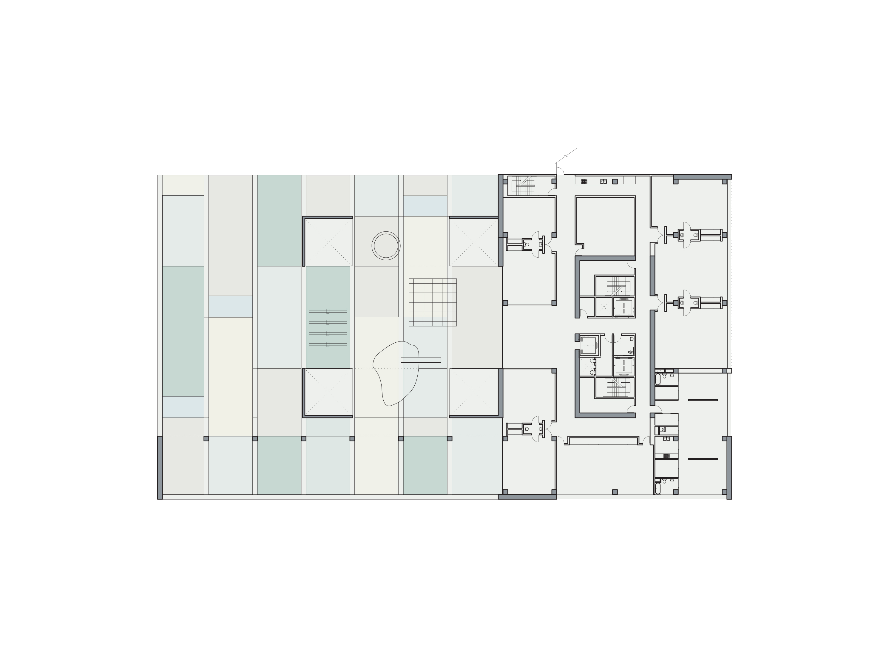 The First United Methodist Church and Tower, on a site across the street from the new San José City Hall designed by Richard Meier, is a mixed-use project with a new church at the base of a twenty-one-story housing tower. The entrance to the church is at the corner of Santa Clara and Fifth Streets. The main sanctuary, social hall, and chapel are organized along a broad double-height gallery that parallels the new Fifth Street paseo; church and city are both separated and connected by a glass wall. On the second level are classrooms and offices, and on the third, the parsonage and a daycare center that opens onto a rooftop play area. The housing tower above the church has a central distribution core surrounded by a service ring, and then open program space, enclosed by the perimeter skin.