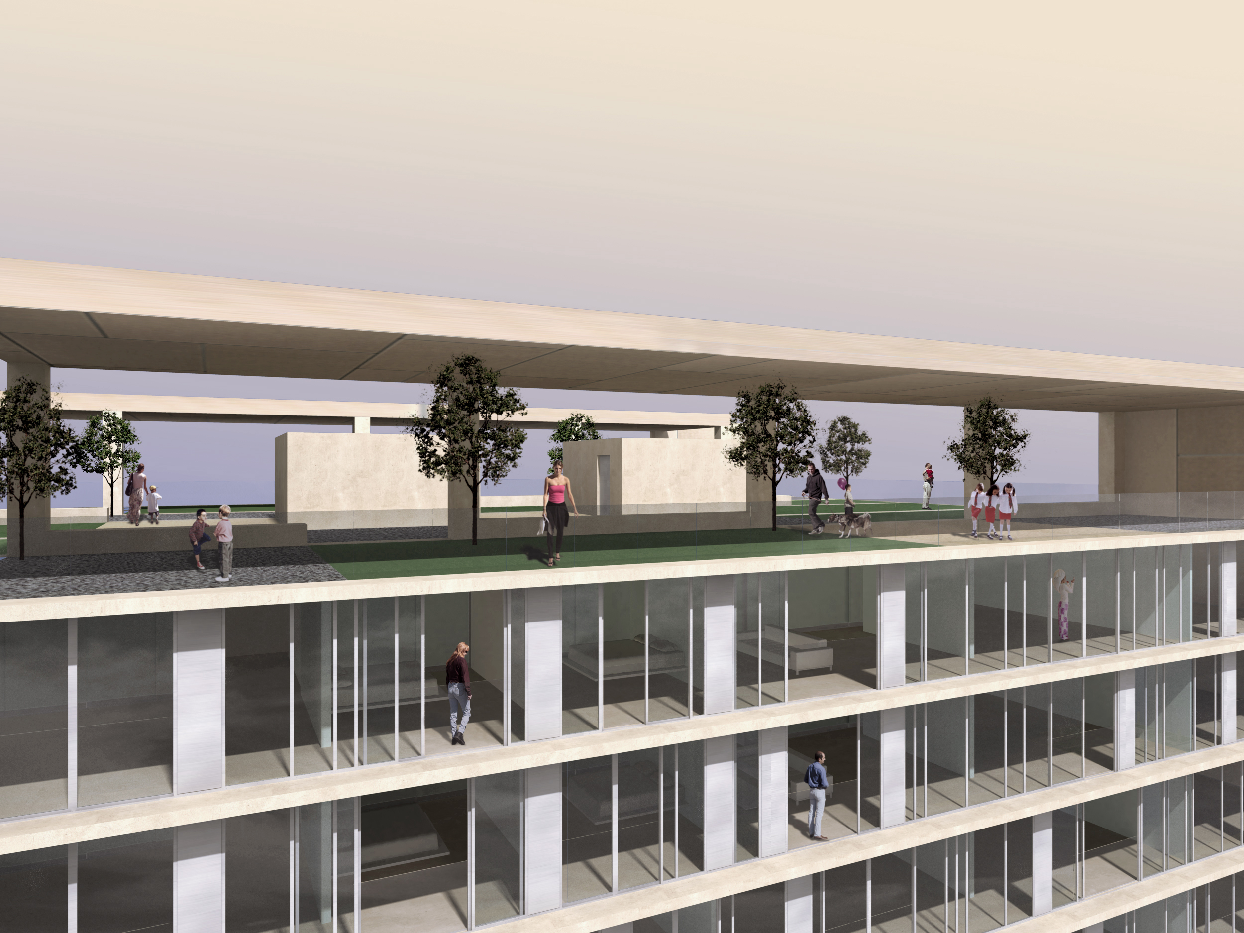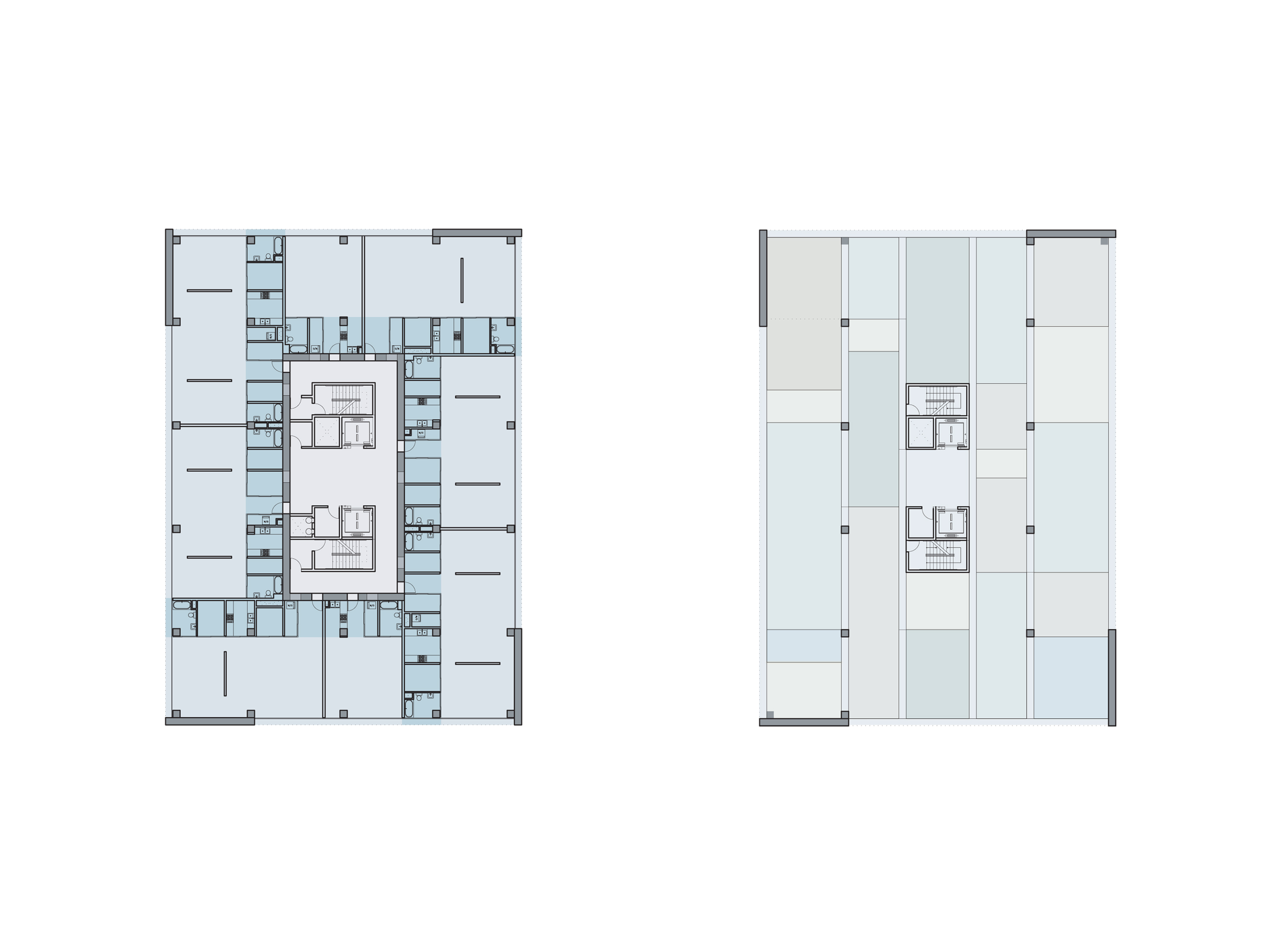 There are three apartment types: studio, one bedroom, and two bedroom. Each unit is divided between compressed service space along the interior—bathrooms, kitchens, laundry, and storage—and open living areas along the exterior. This exterior skin is floor-to-ceiling glass, which optimizes views and light; aluminum sliding doors and frameless glass railings behind provide French balconies. Two-story exterior common spaces rotate around the sides of the tower, offering a variety of views and orientations; these are facilities for occupants to barbecue, sunbathe, exercise, and congregate. A vertical concrete shear-wall system provides structure and finish as well as support for the glass skin. The skin is inset two feet; the resulting floor projections allow for assembly without scaffolding and, once the building is complete, shading and window cleaning.