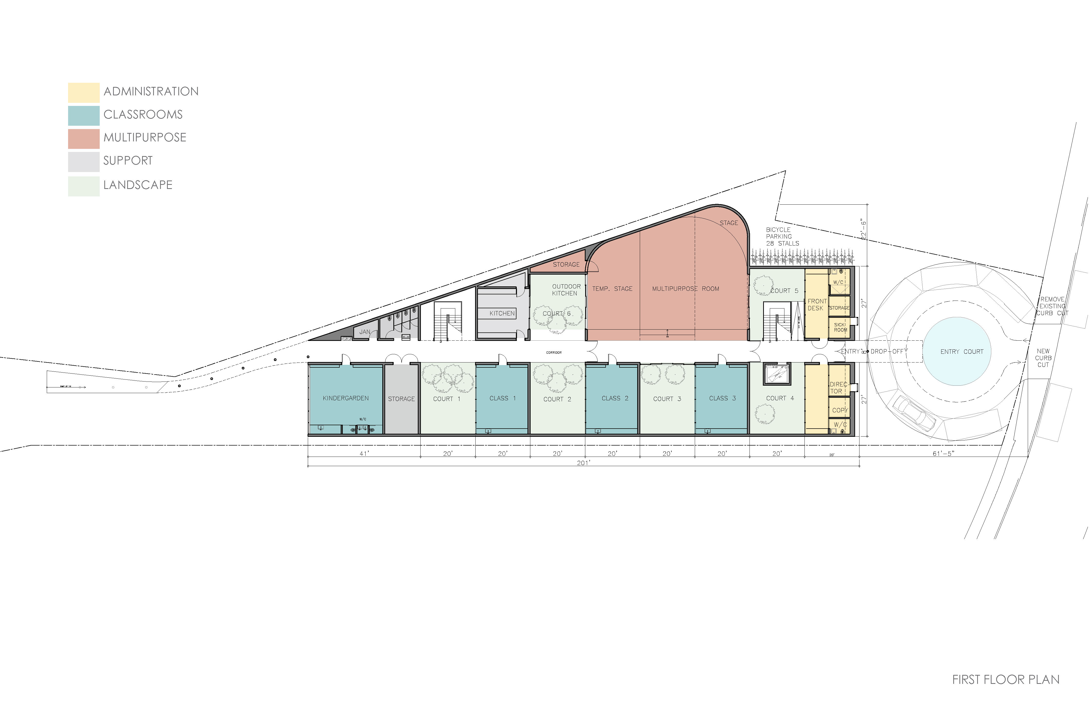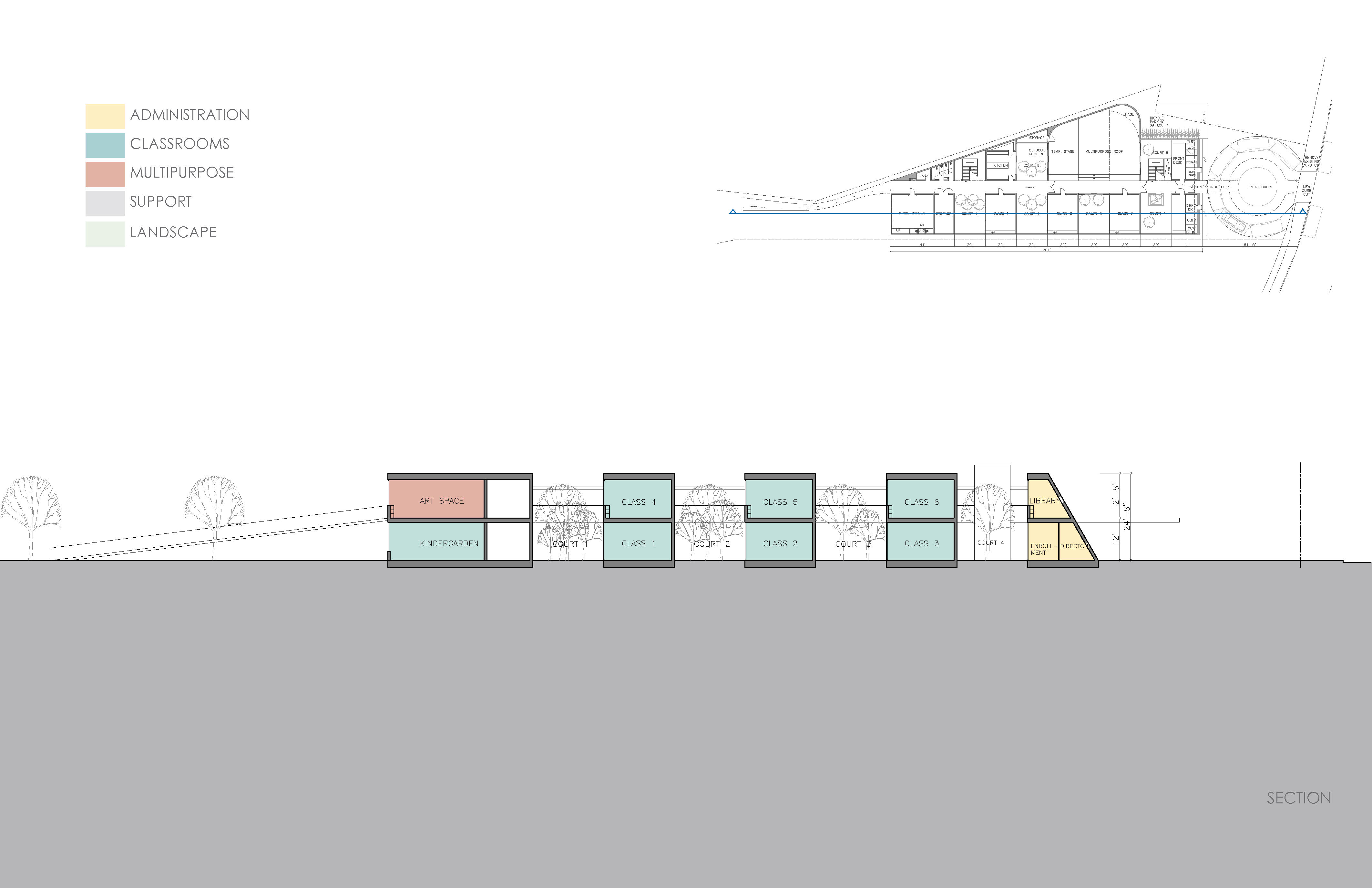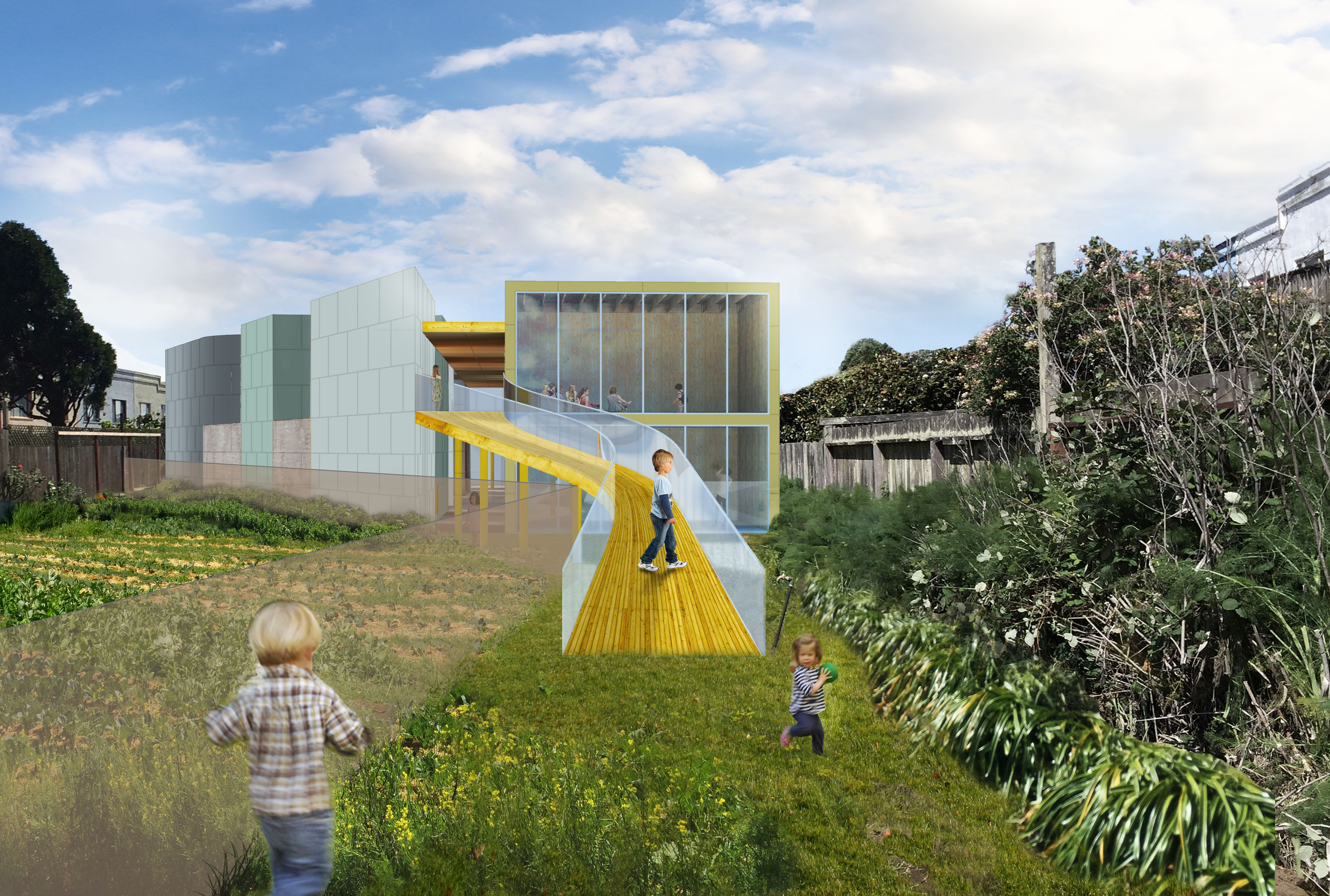 The site is an hourglass of land tucked behind the rear yards of surrounding residences. The entry is on Cotter, set back and expanding the street into a public plaza and drop-off area. The façade is a sloped green wall, a hill, behind which the school is arranged as a series of detached structures in the landscape, perforated with open courts and strung along a walkway in the form of a golden bridge. One side of the bridge are classrooms, the other, common spaces, arranged on two levels. At the center is a large multi-purpose room which opens to courts on three sides. This is the heart, a space both open and closed, where the golden bridge intersects on both levels as a walkway and gallery. All the roofs are green and all the vertical walls gardens, and the courts landscaped and panted with trees. The school buildings occupy the front part of the site; behind the landscape is a shifting gradient transforming from cultivated orchards to gridded beds to natural shrubbery to primal grasslands and ponds.