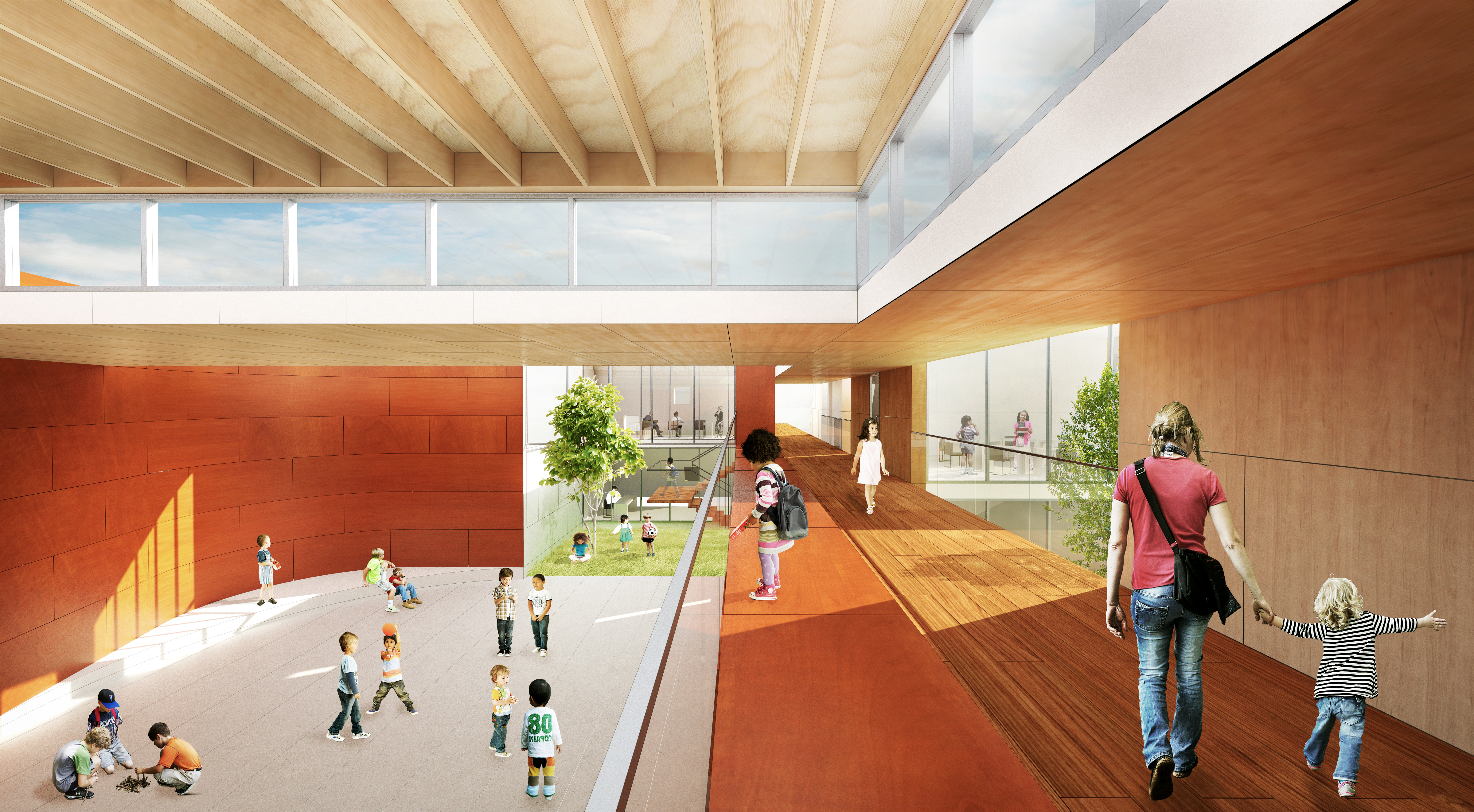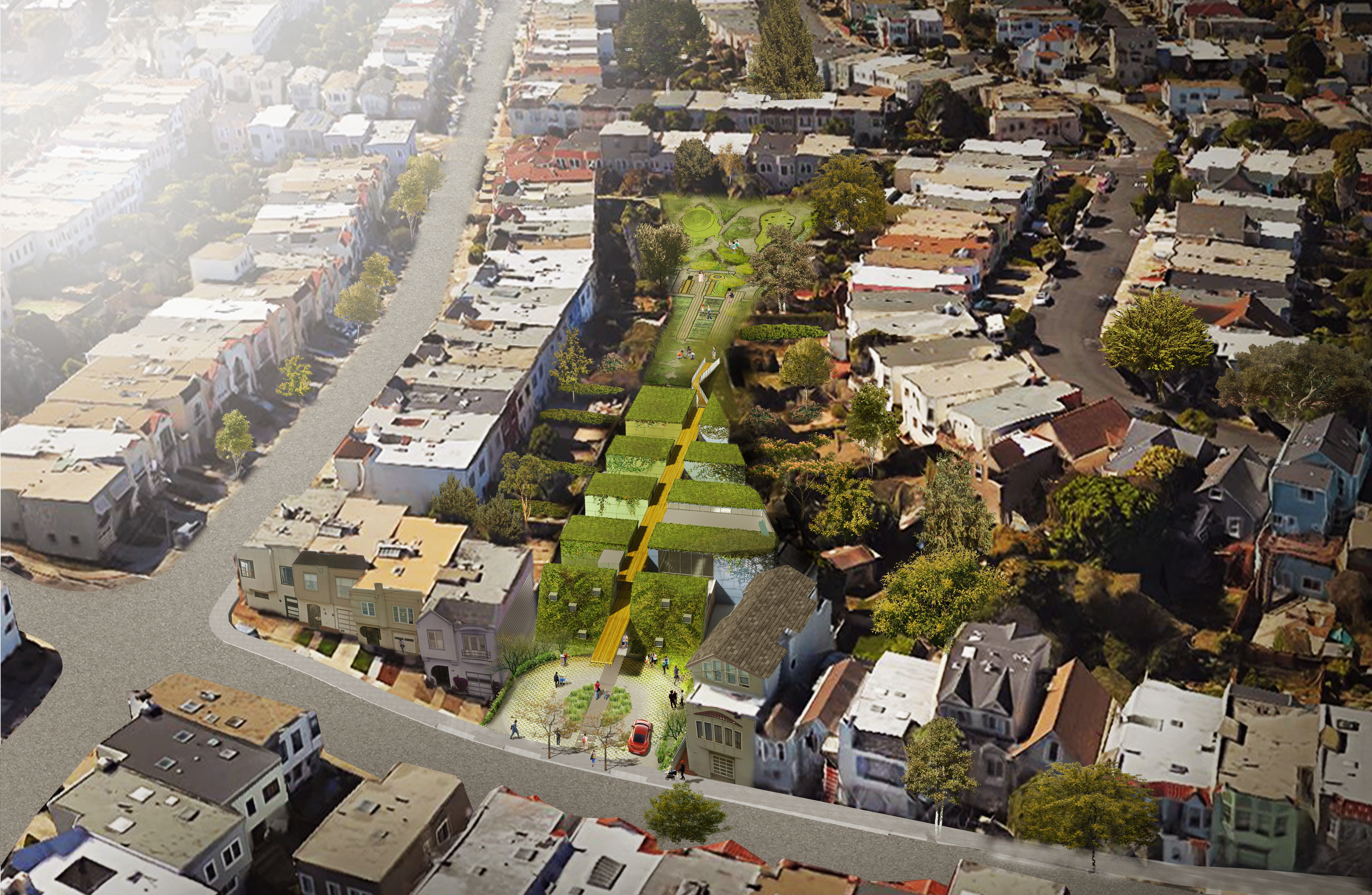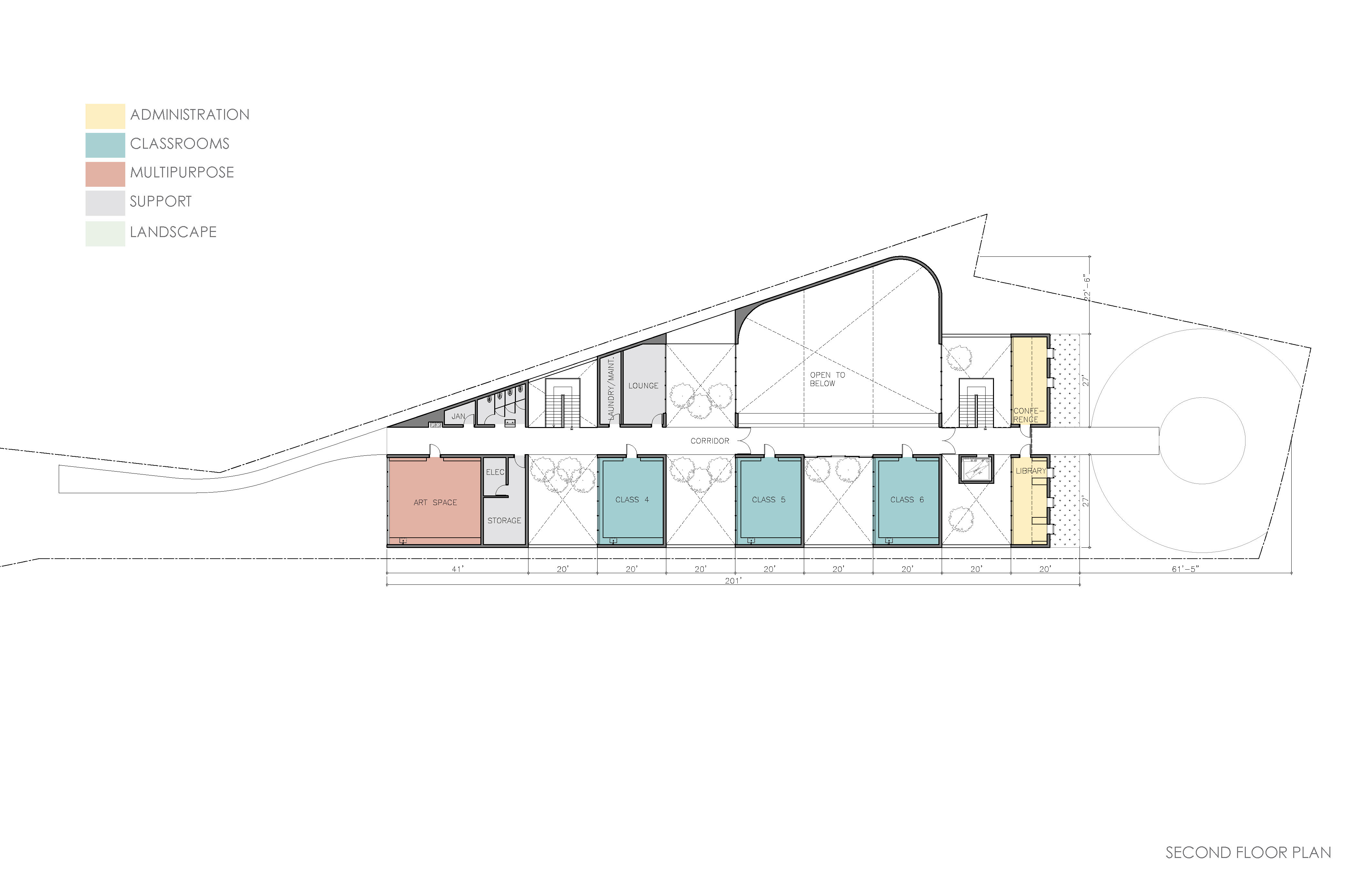 The site is an hourglass of land tucked behind the rear yards of surrounding residences. The entry is on Cotter, set back and expanding the street into a public plaza and drop-off area. The façade is a sloped green wall, a hill, behind which the school is arranged as a series of detached structures in the landscape, perforated with open courts and strung along a walkway in the form of a golden bridge. One side of the bridge are classrooms, the other, common spaces, arranged on two levels. At the center is a large multi-purpose room which opens to courts on three sides. This is the heart, a space both open and closed, where the golden bridge intersects on both levels as a walkway and gallery. All the roofs are green and all the vertical walls gardens, and the courts landscaped and panted with trees. The school buildings occupy the front part of the site; behind the landscape is a shifting gradient transforming from cultivated orchards to gridded beds to natural shrubbery to primal grasslands and ponds.