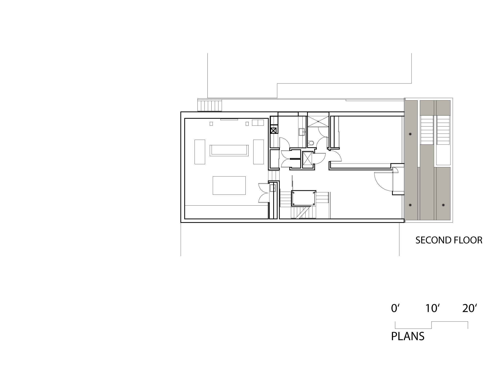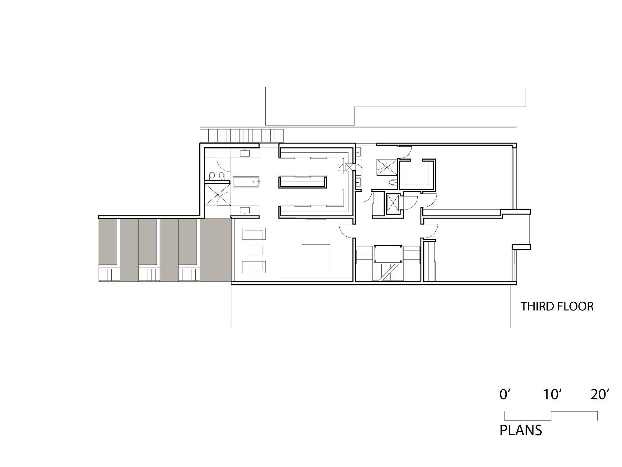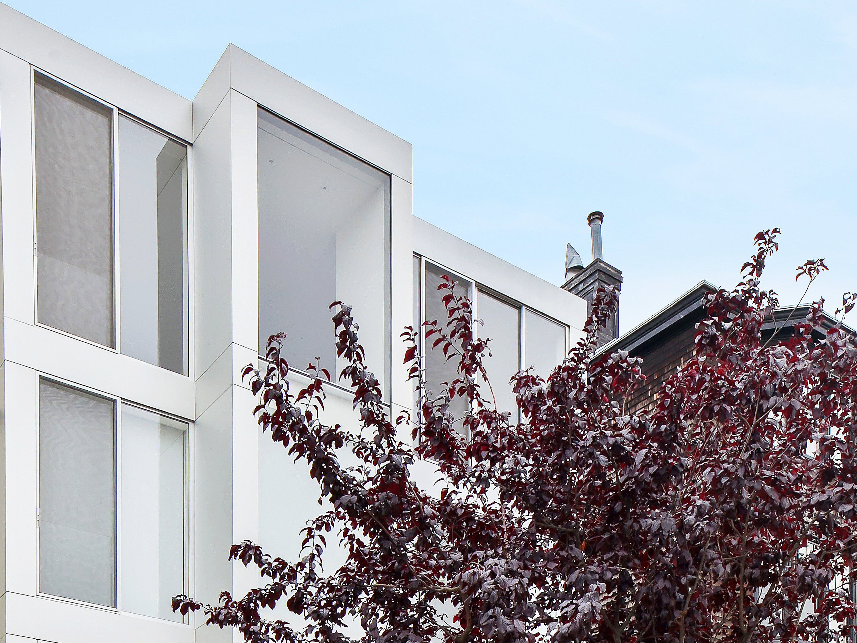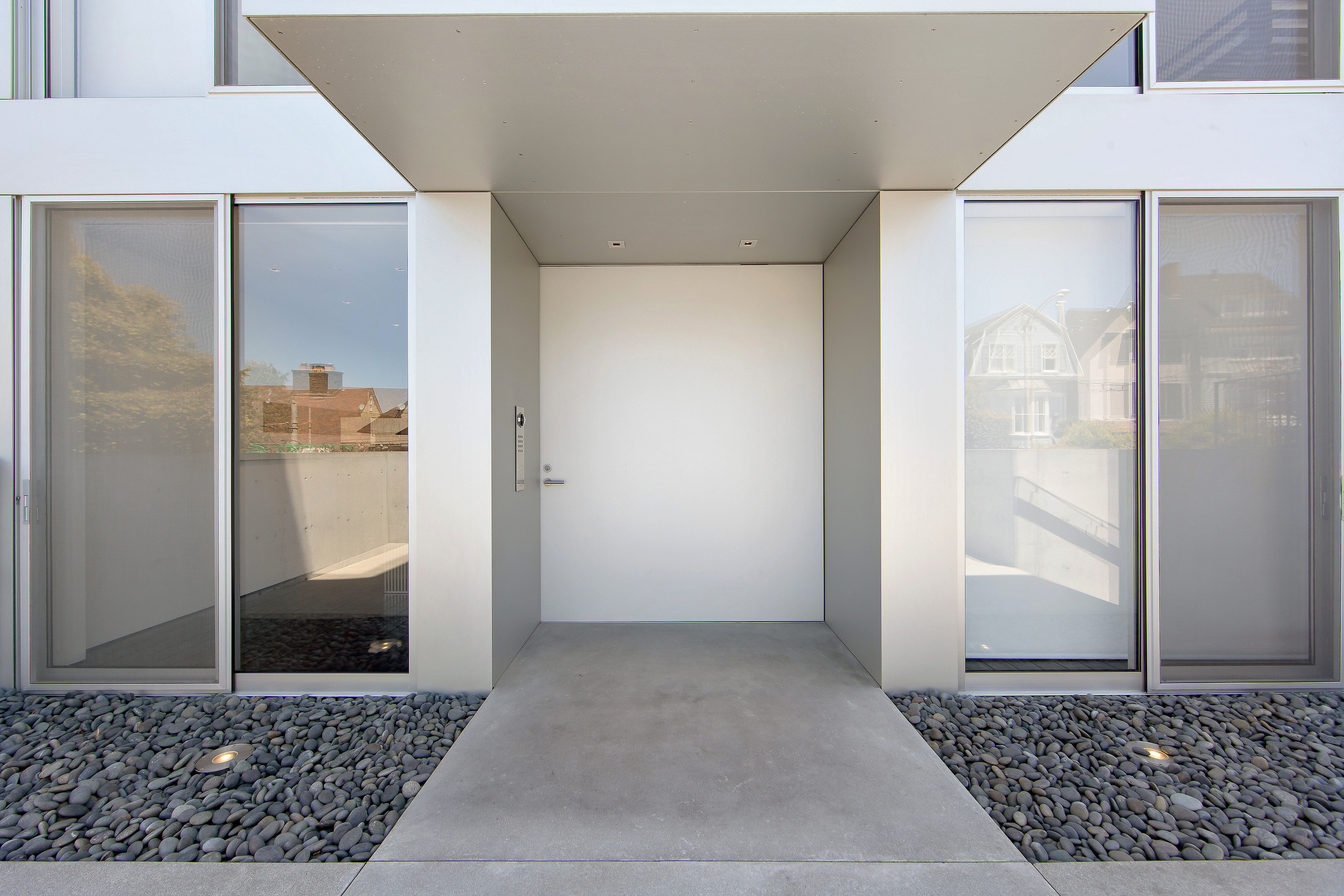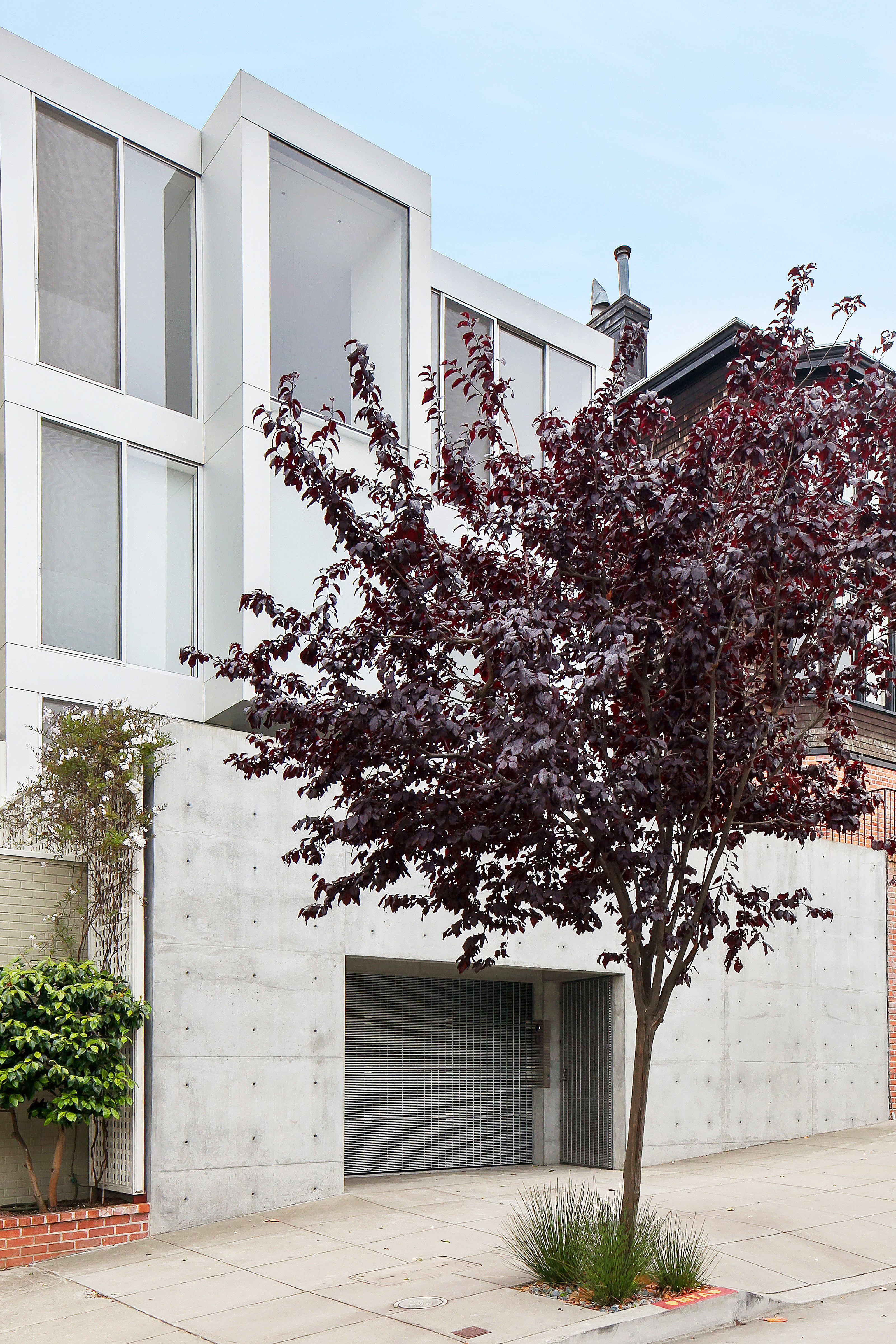 The Hexner/Justice residence extensively remodels an existing house on Union Street. A new concrete base contains a stair that leads to the entry level.