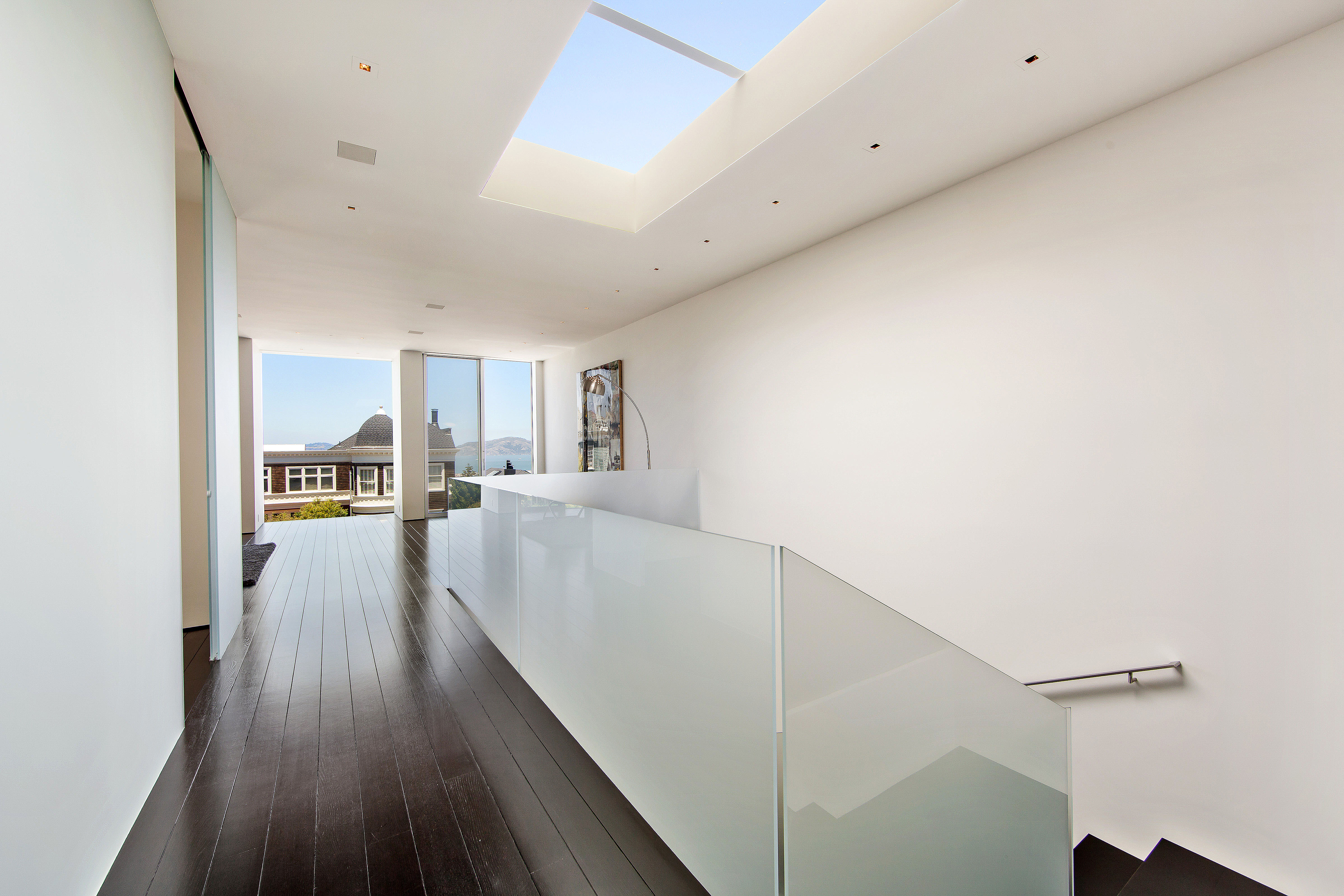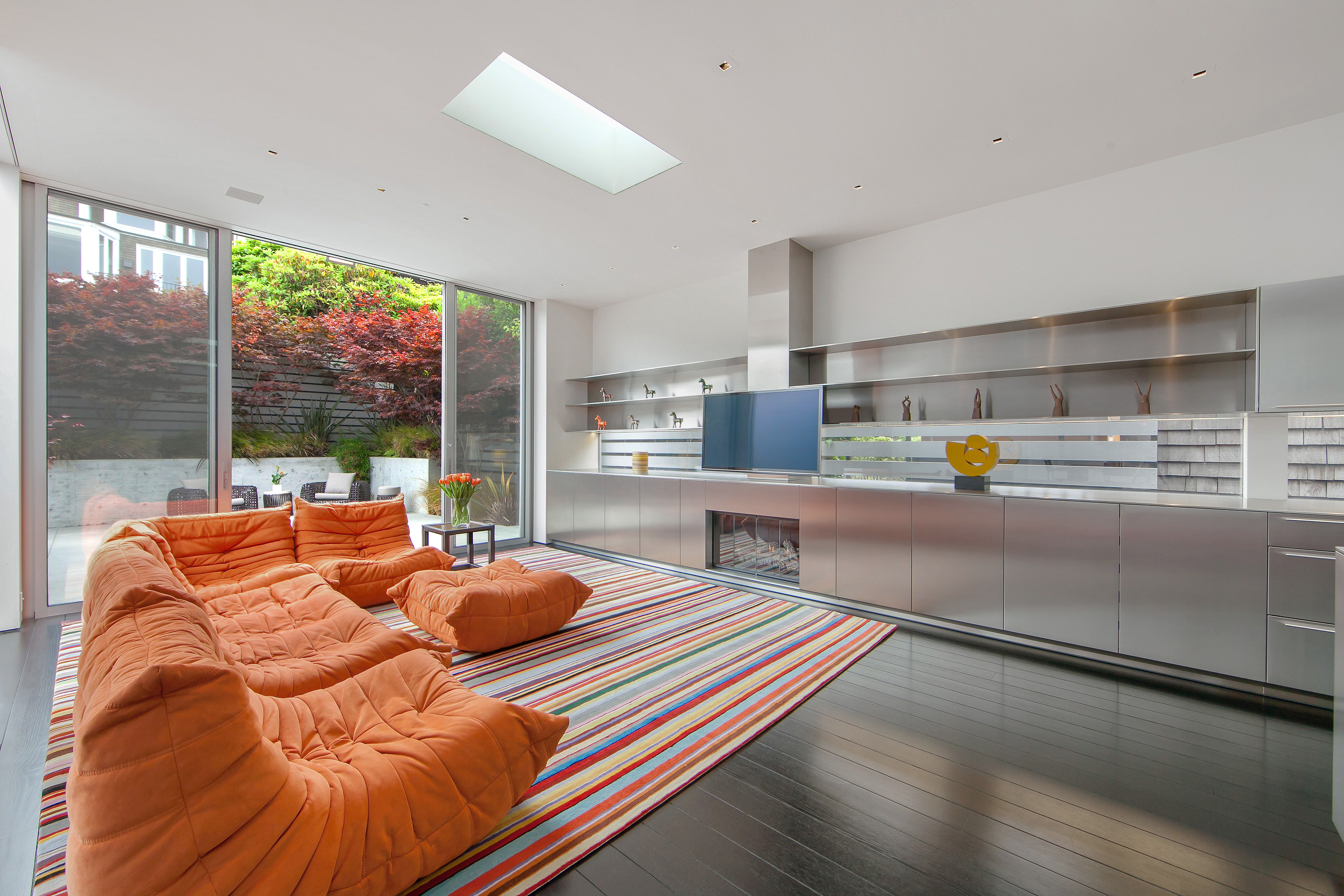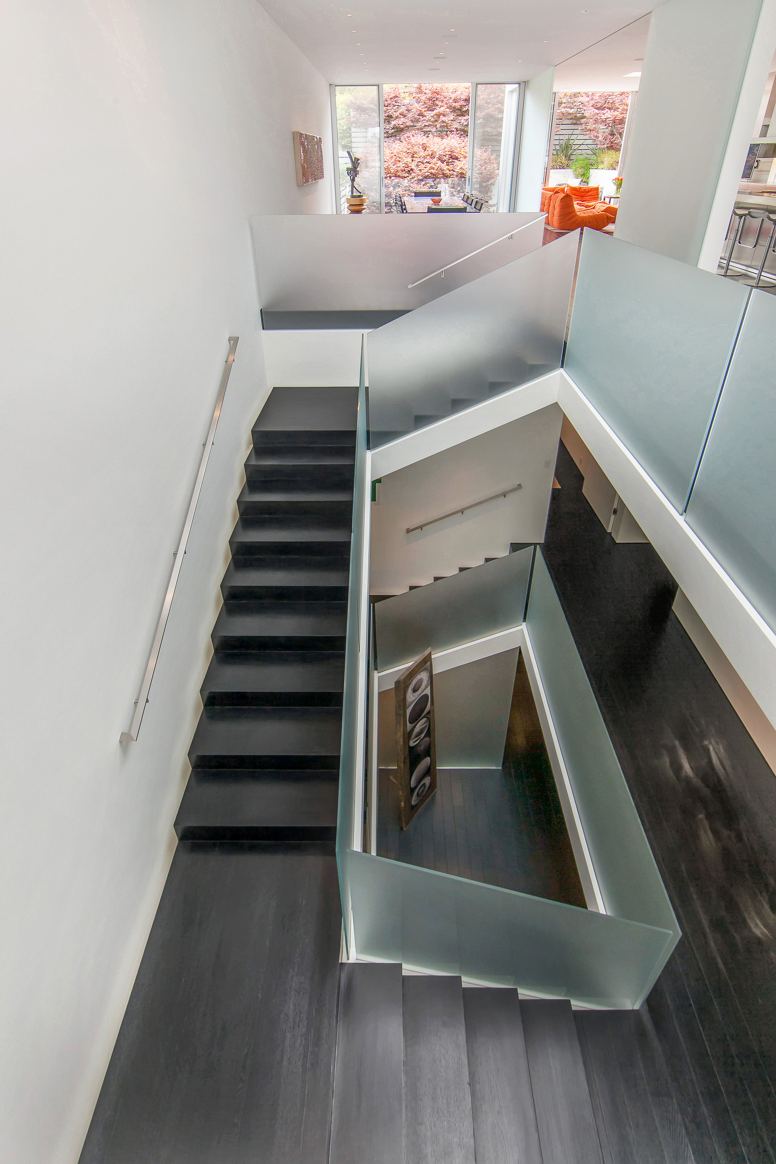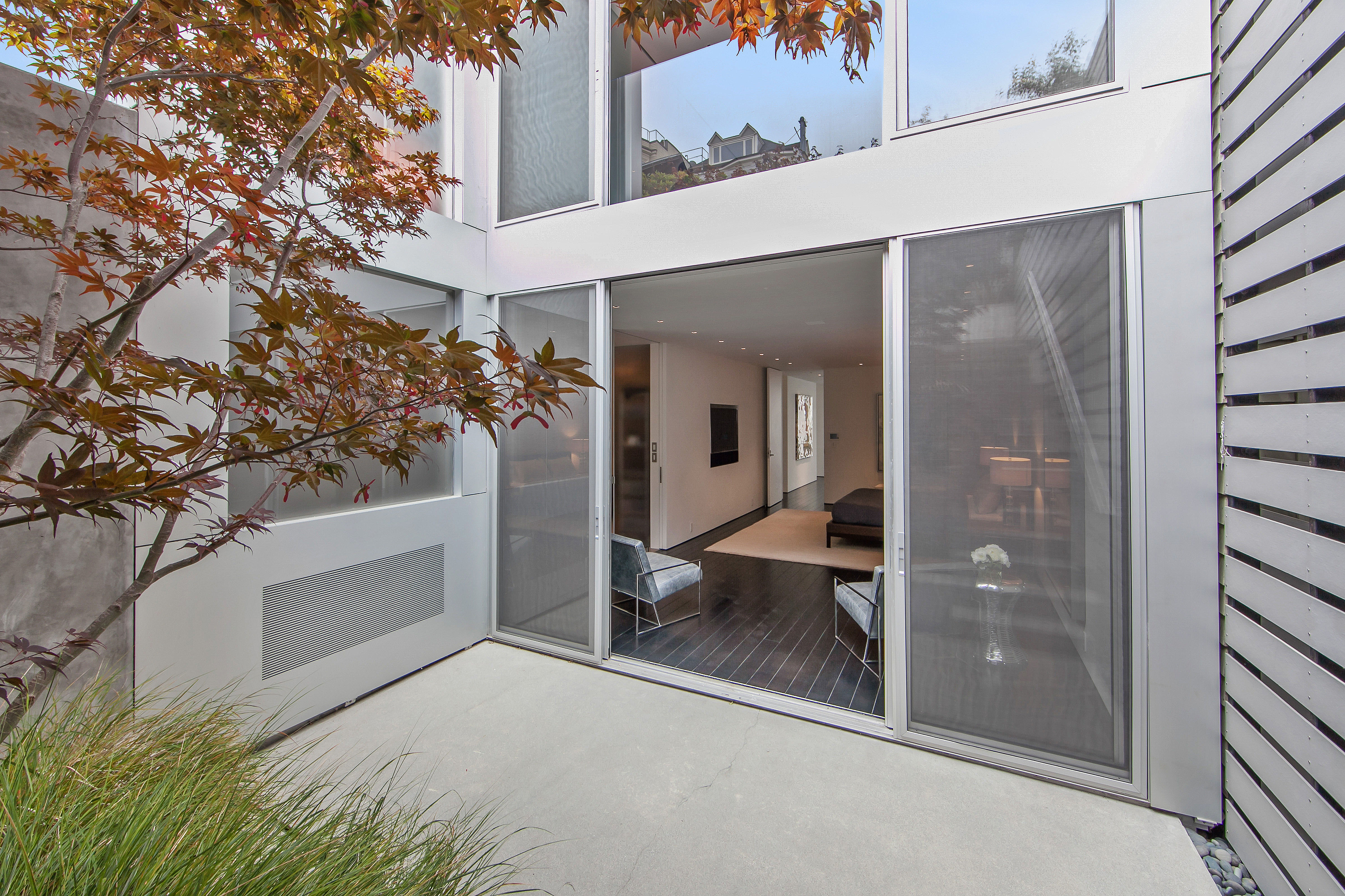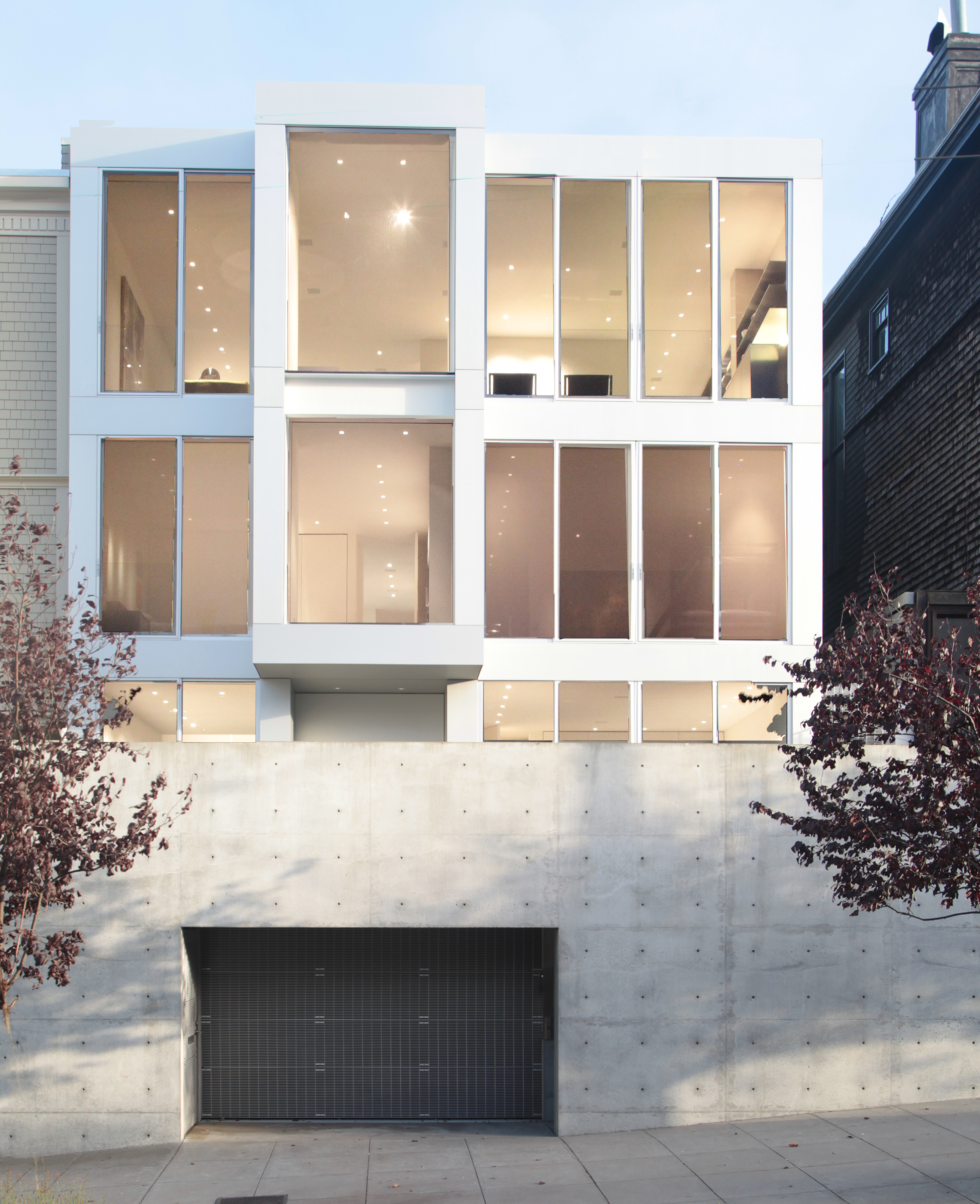 Above, a single all-glass bay window projects, sheltering the front door. Inside the building, a new stair with glass railings connects all levels and serves as a gallery for an art collection. The top floor is a single room with windows at either end; a sliding glass screen separates kitchen and family room from formal spaces. A storage wall and horizontal window run the full length of the house and continue into the garden as an outdoor cooking area.
