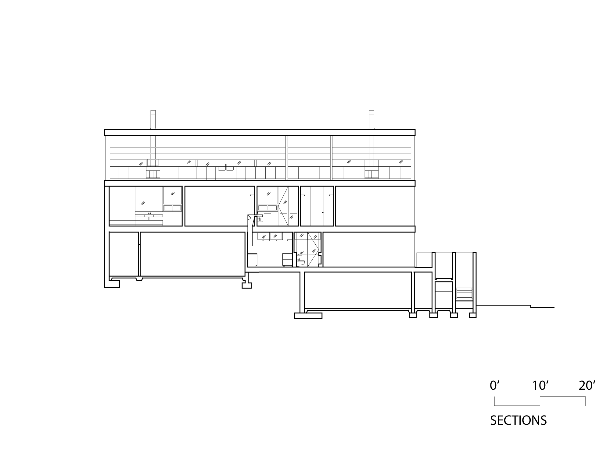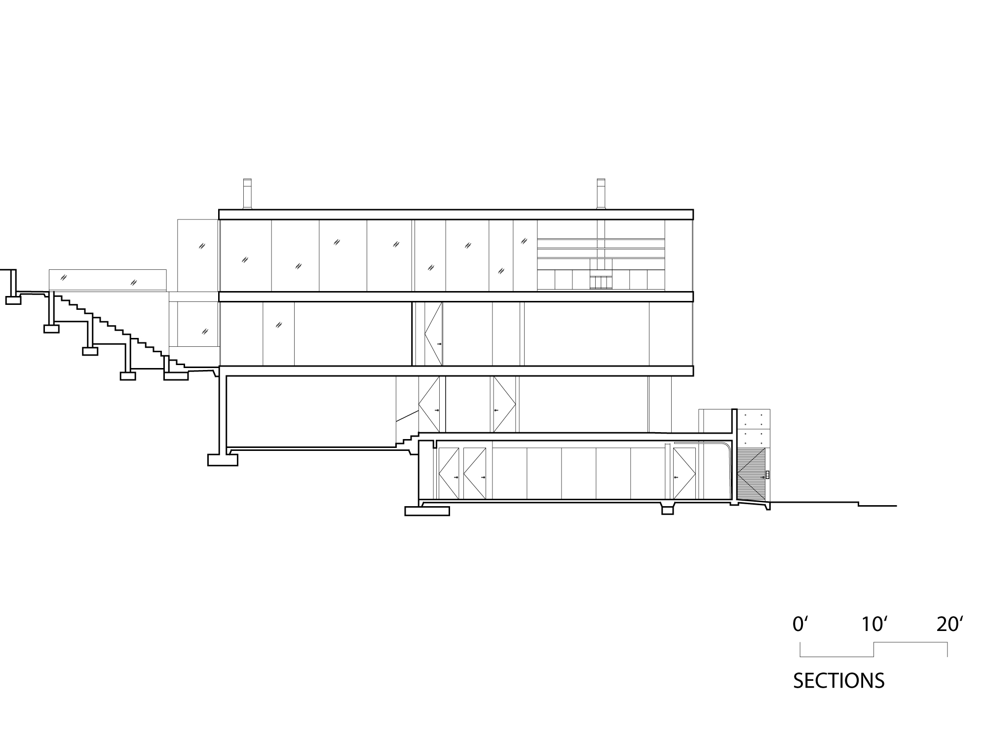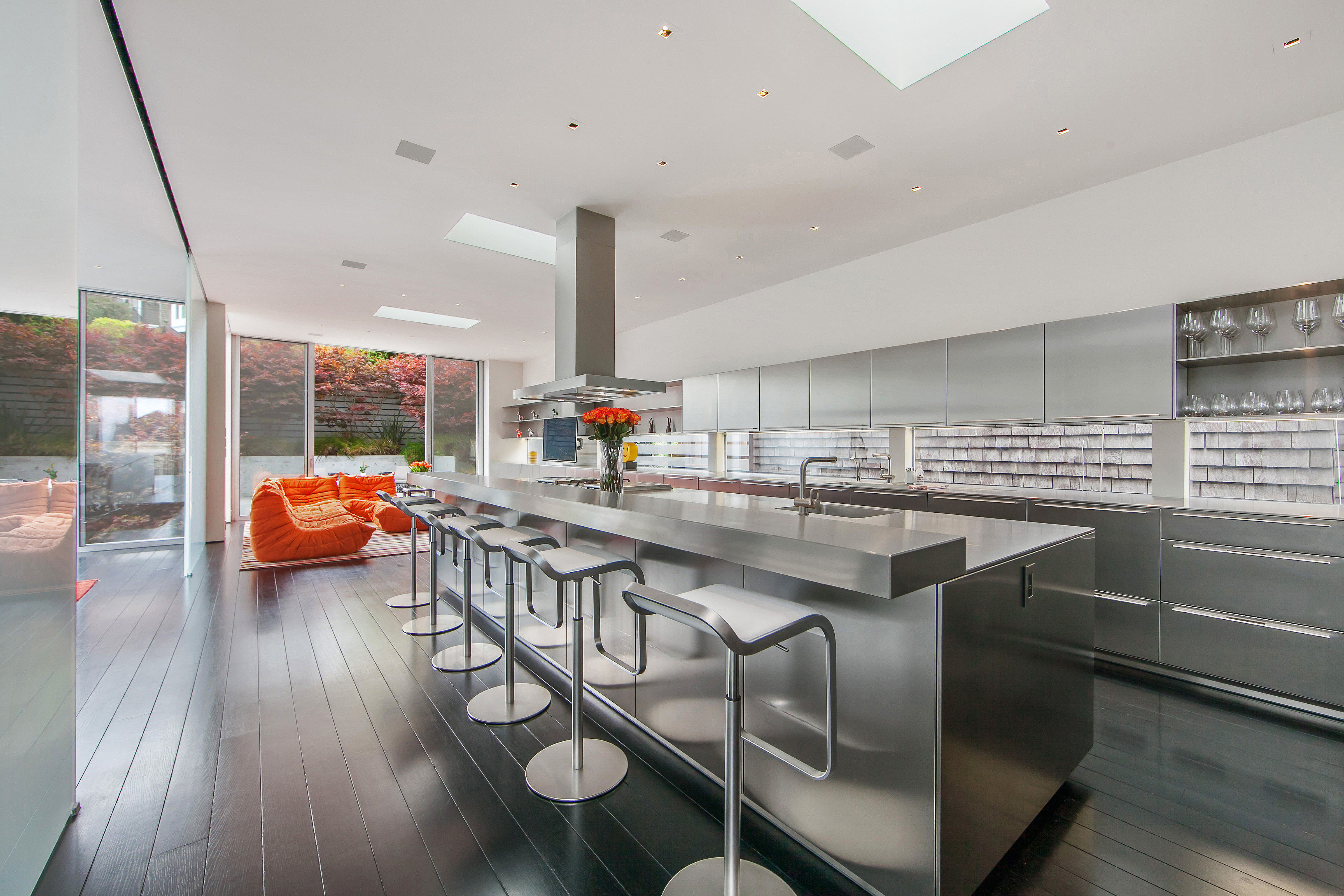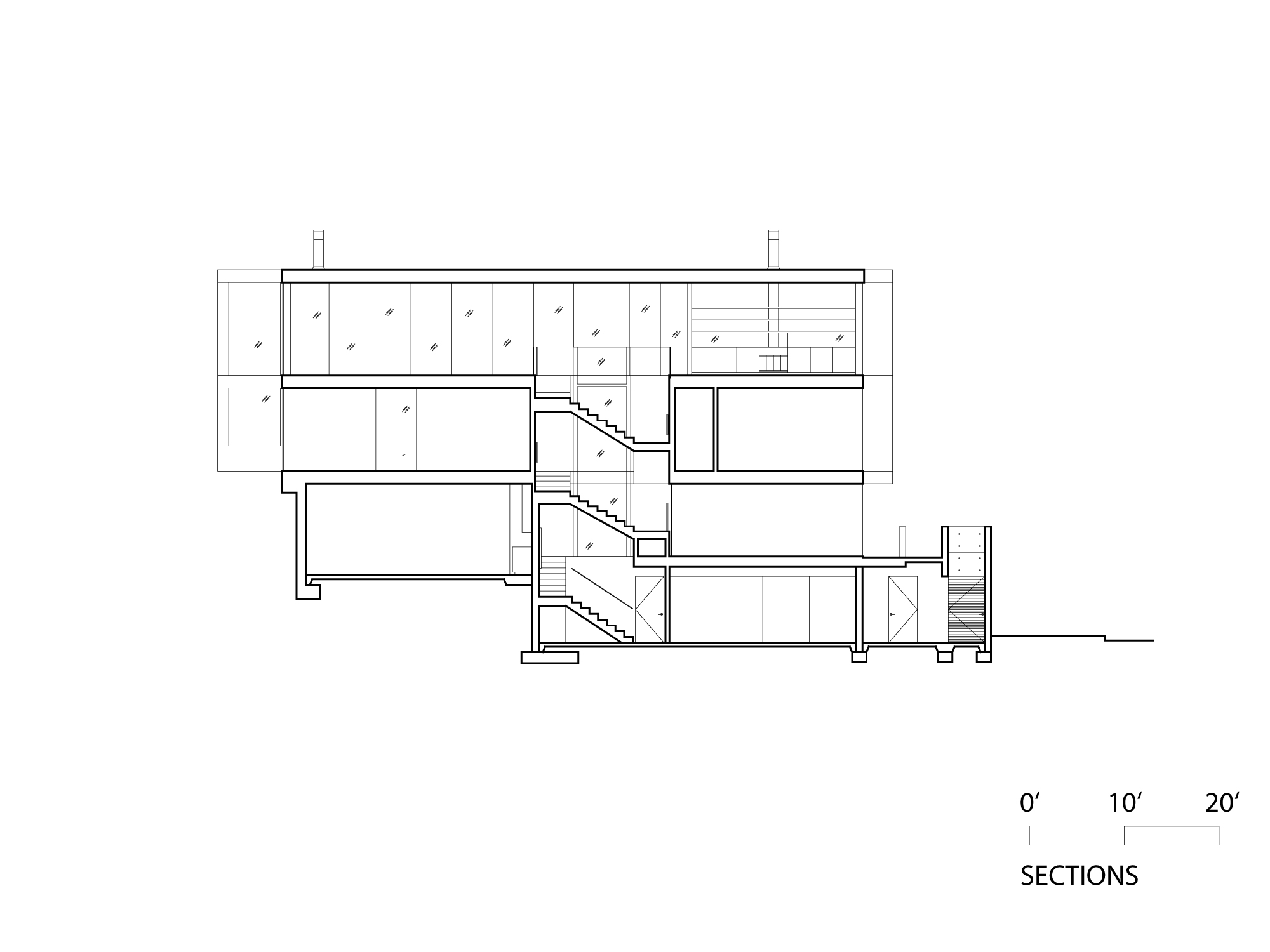 Above, a single all-glass bay window projects, sheltering the front door. Inside the building, a new stair with glass railings connects all levels and serves as a gallery for an art collection. The top floor is a single room with windows at either end; a sliding glass screen separates kitchen and family room from formal spaces. A storage wall and horizontal window run the full length of the house and continue into the garden as an outdoor cooking area.