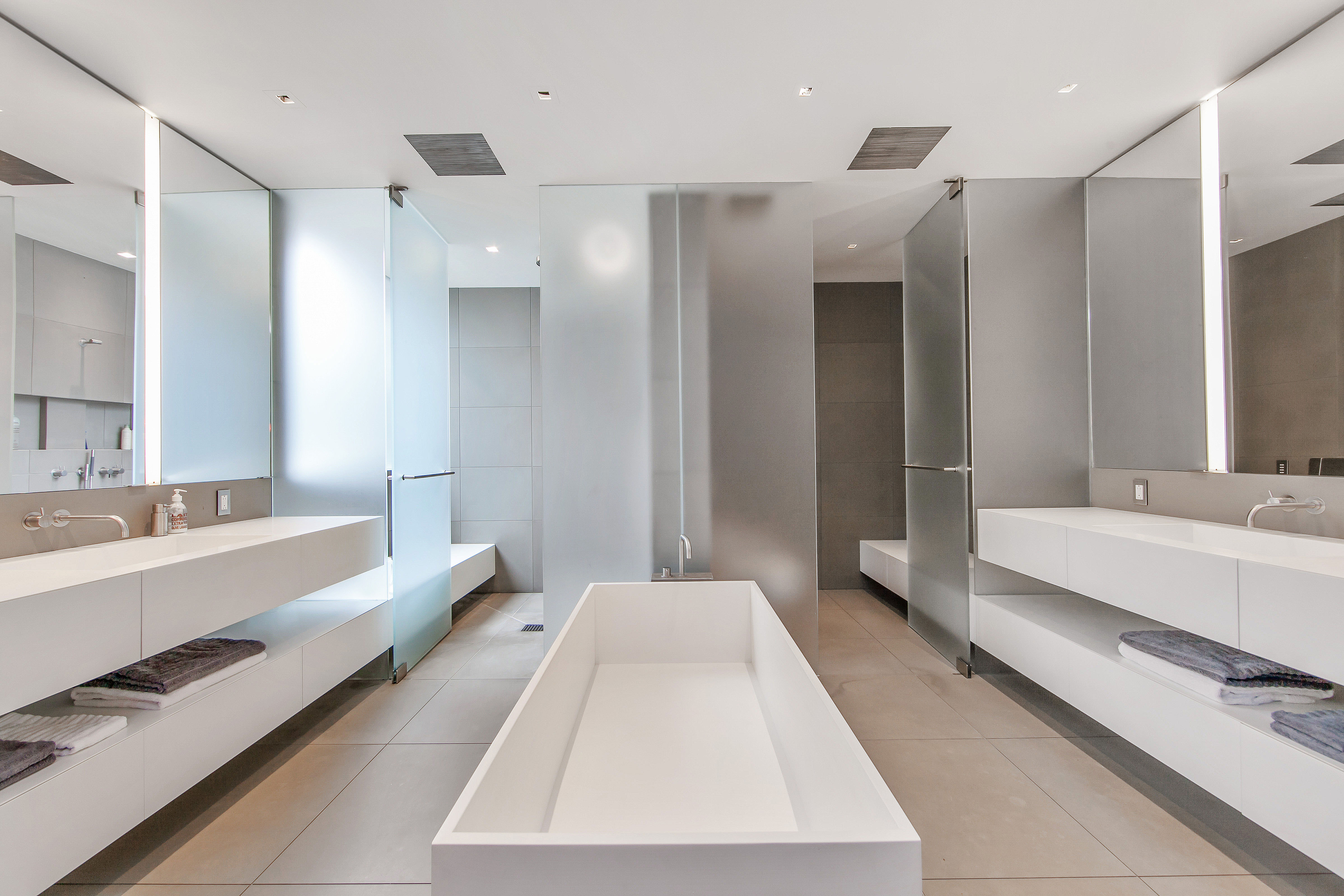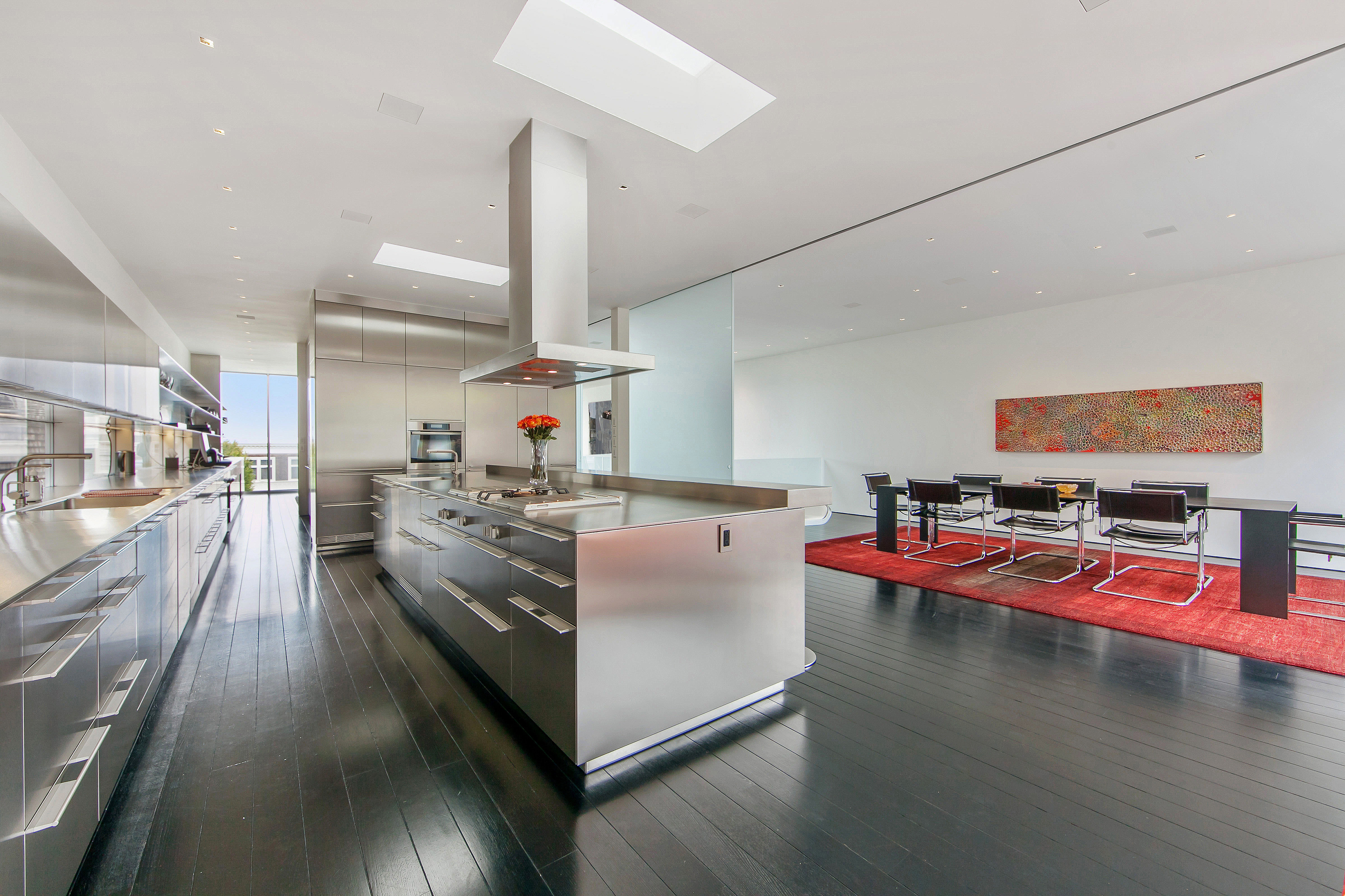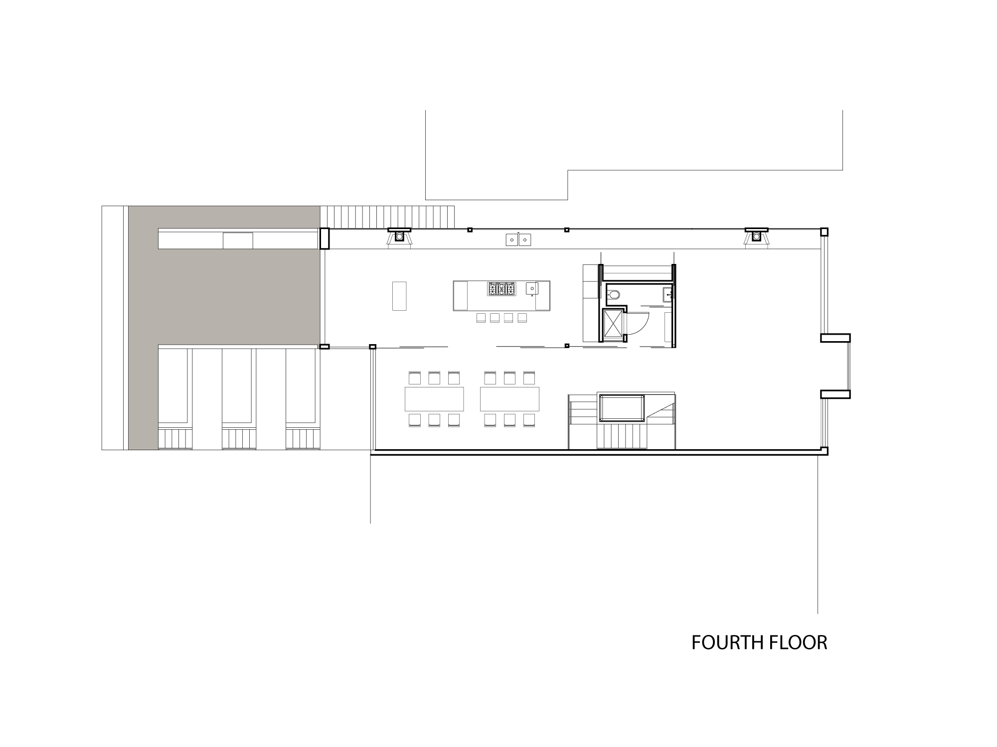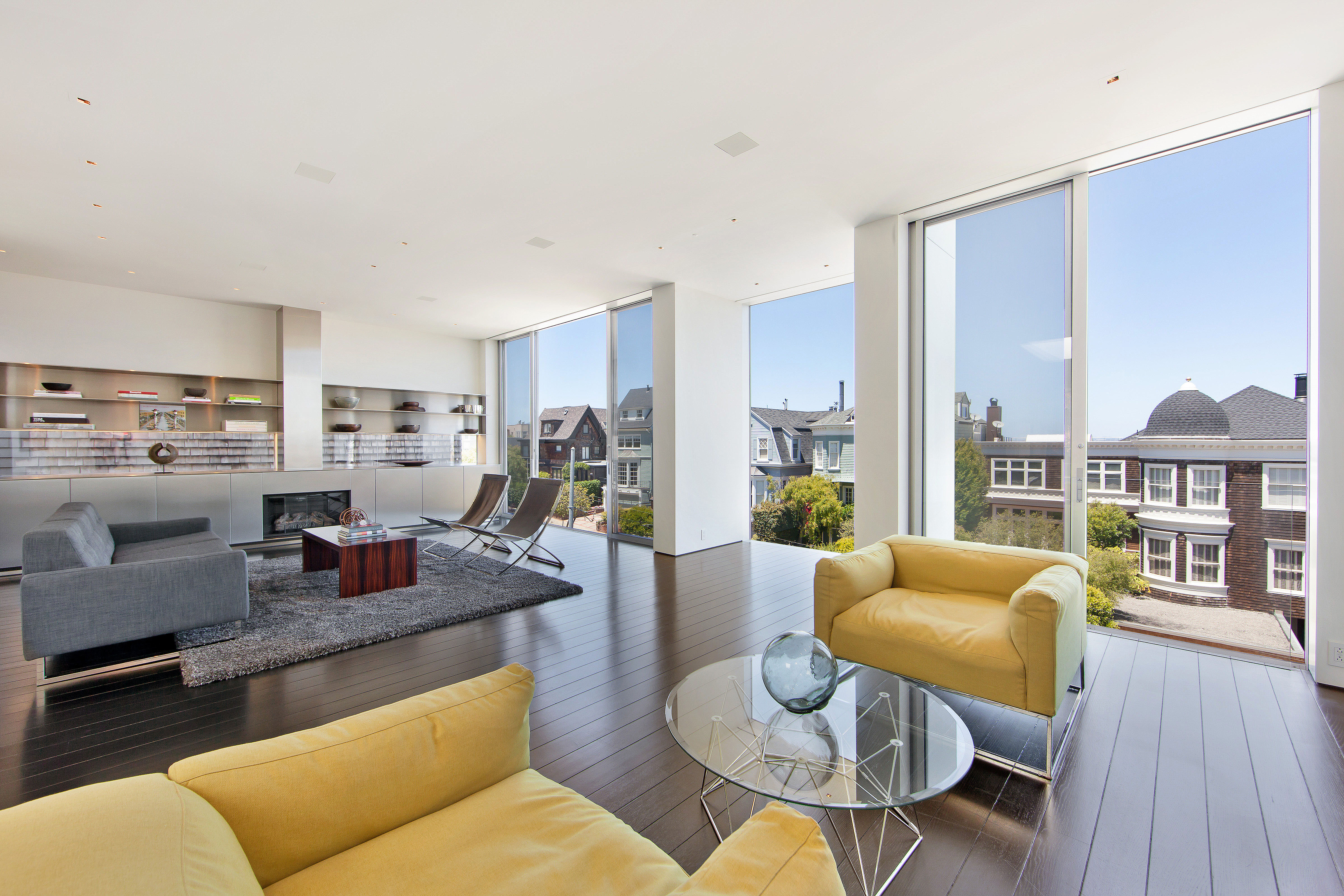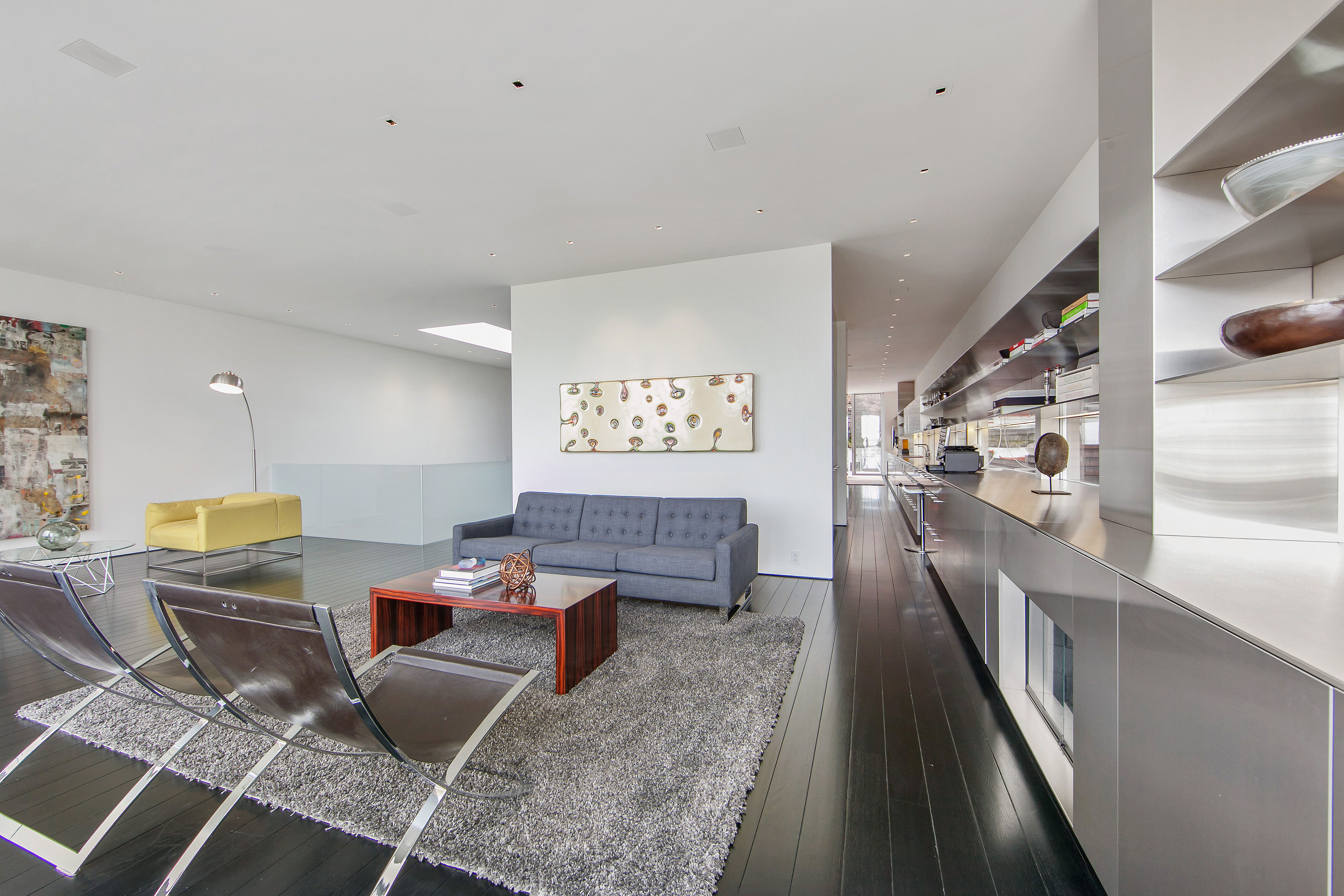 Above, a single all-glass bay window projects, sheltering the front door. Inside the building, a new stair with glass railings connects all levels and serves as a gallery for an art collection. The top floor is a single room with windows at either end; a sliding glass screen separates kitchen and family room from formal spaces. A storage wall and horizontal window run the full length of the house and continue into the garden as an outdoor cooking area.
