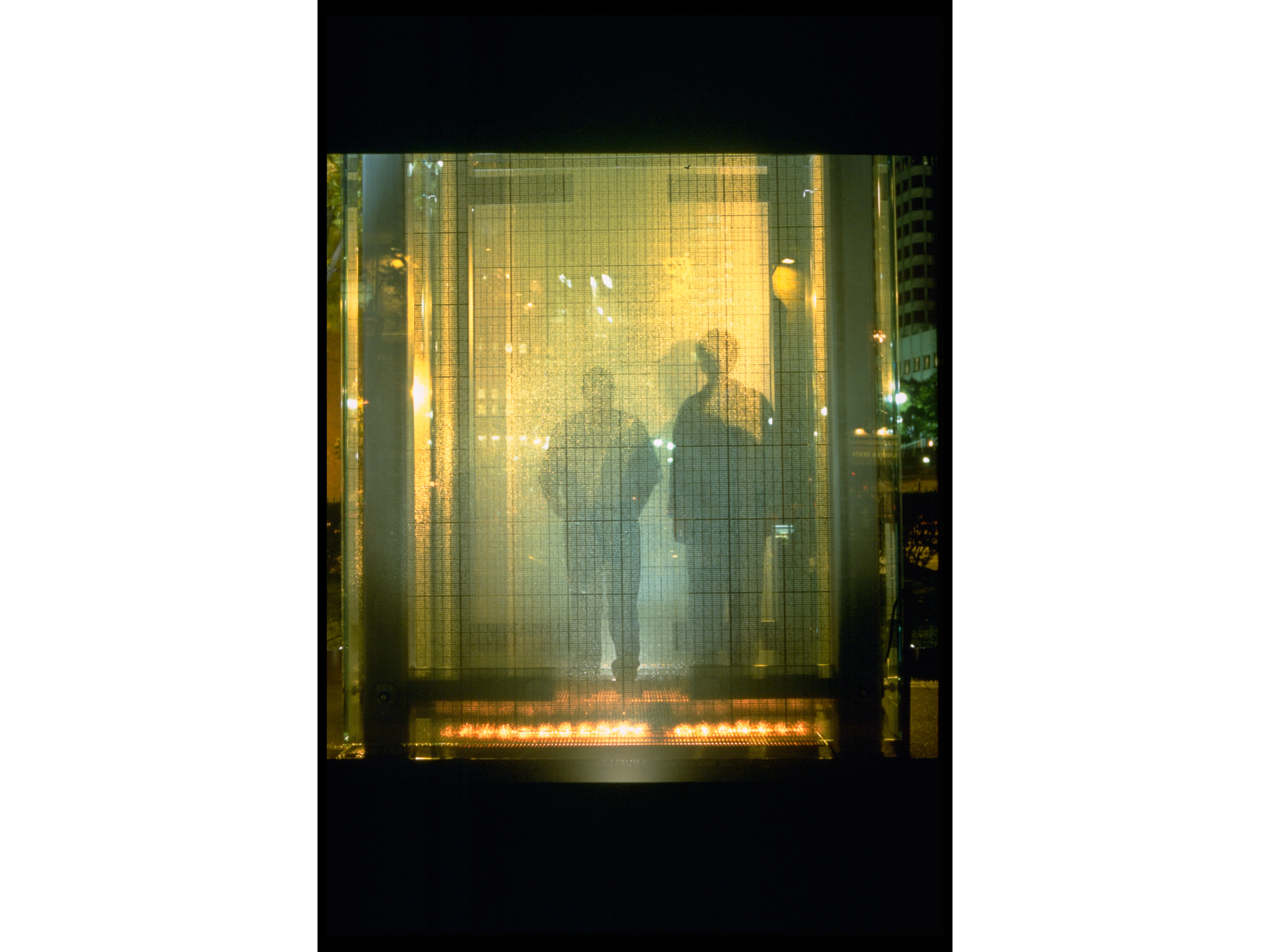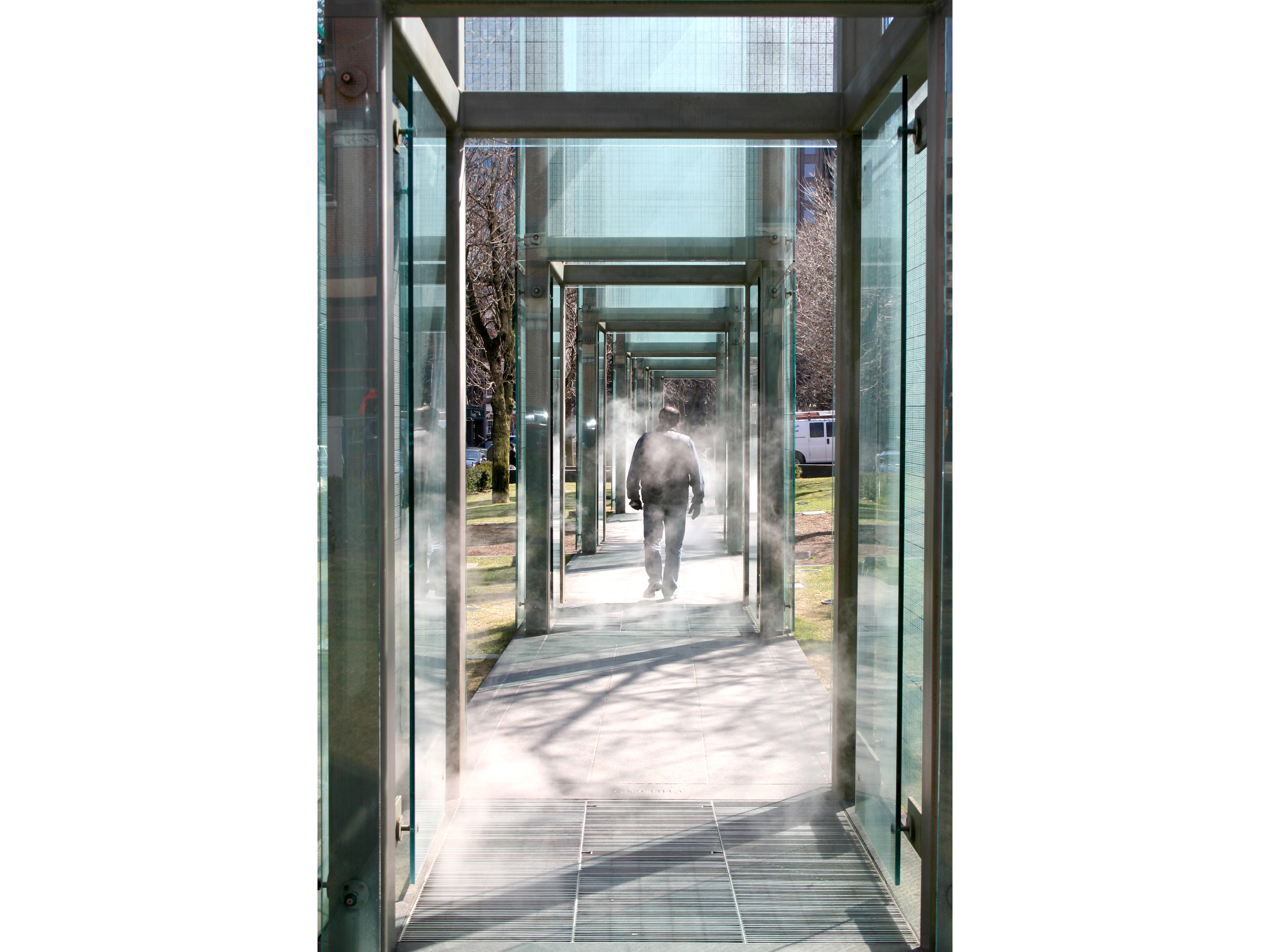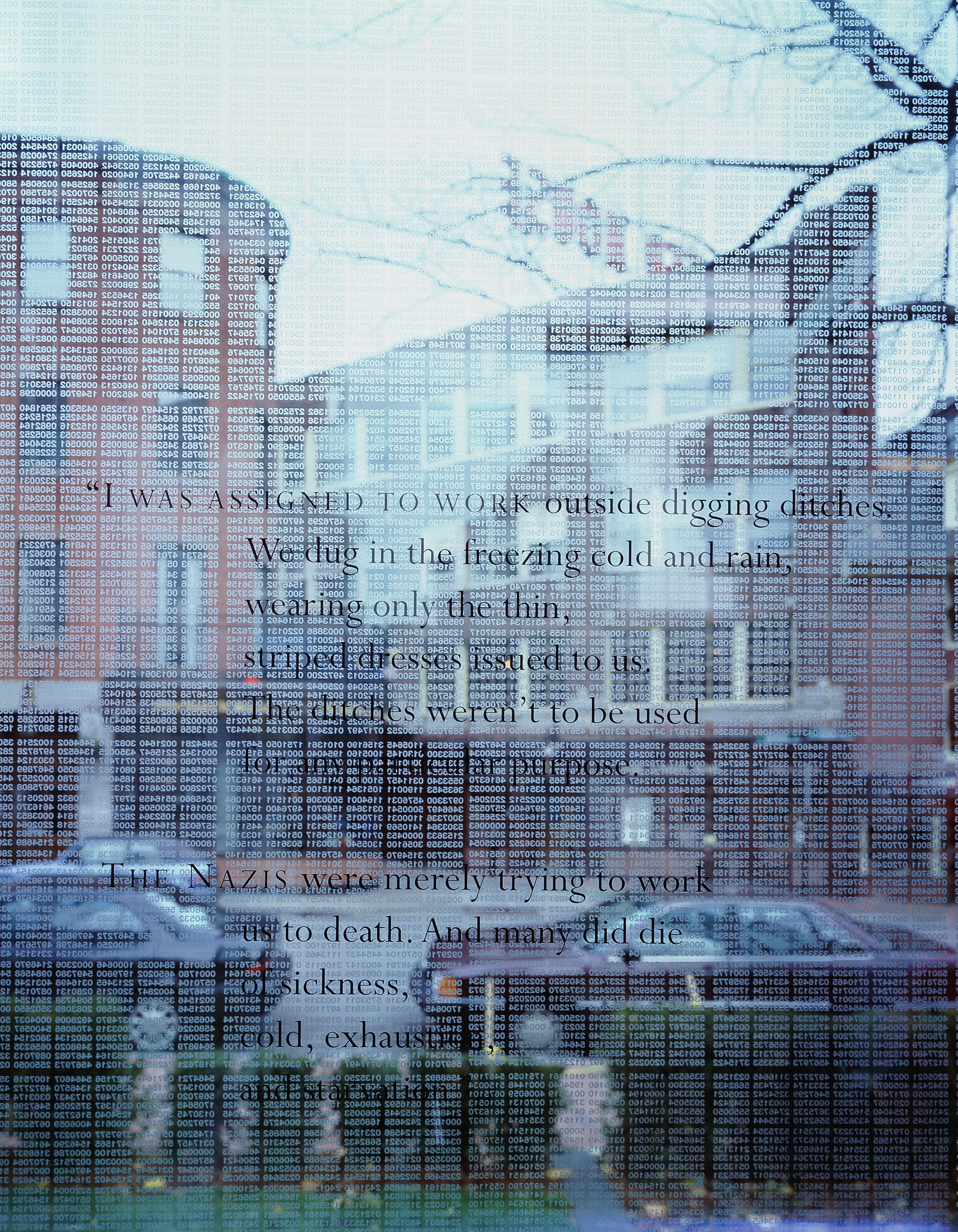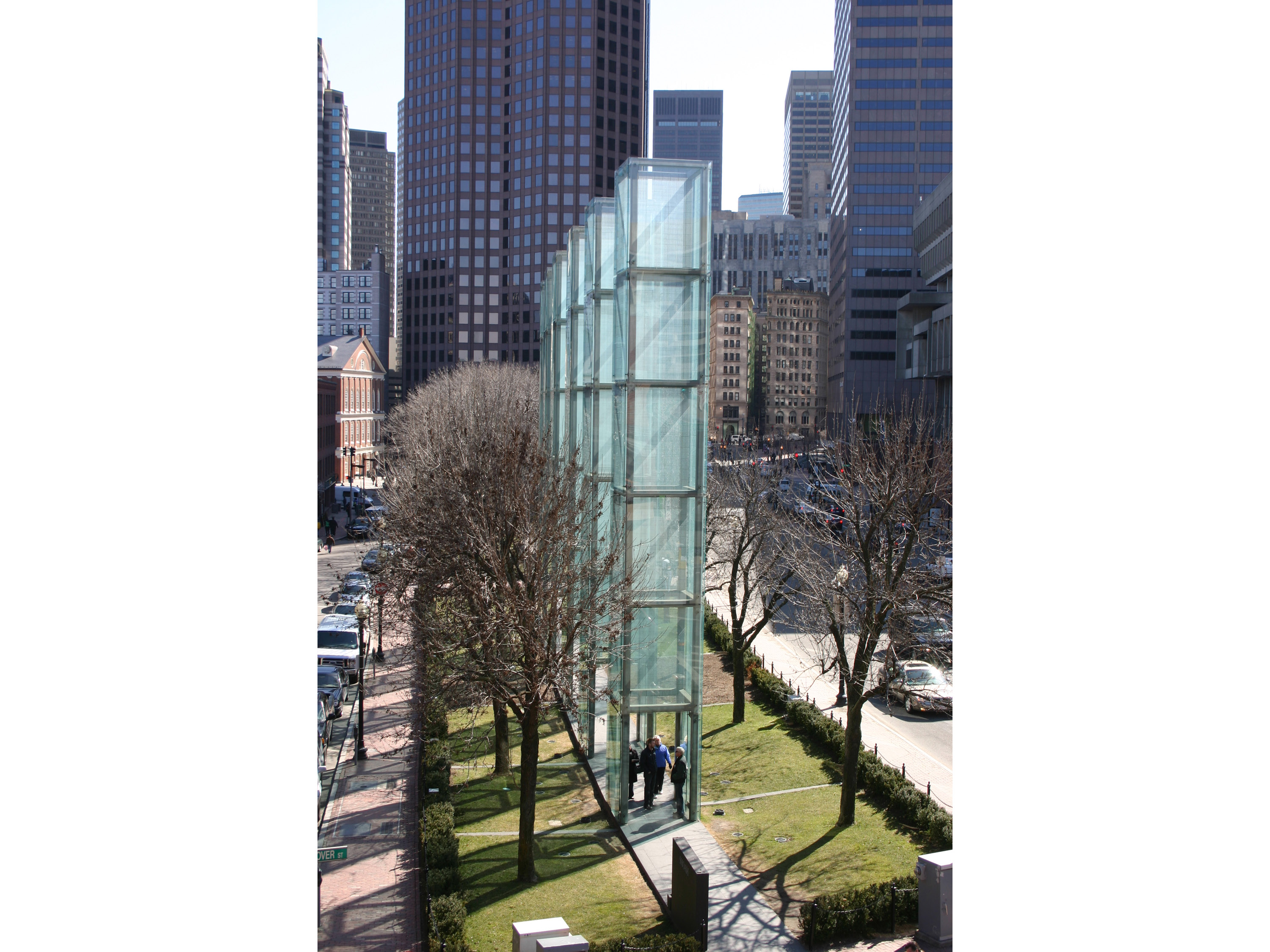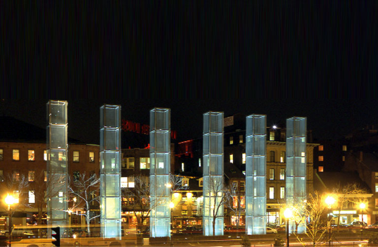 | Some think of it as six candles, others call it a menorah. | Some a colonnade walling the civic plaza, others six towers of spirit. | Some six columns for six million Jews, others six exhausts of life. | Some call it a city of ice, others remember a ruin of some civilization. | Some speak of six pillars of breath, others six chambers of gas. | Some sit on the benches and are warmed by the fire, others are tattooed by the shadows of numbers as they pass through the towers. | Some think of it as a fragment of Boston City Hall, others call the buried chambers Hell. | Some think the pits of fire are six death camps, others feel the warm air rising up from the ground like human breath as it passes through the glass chimneys to heaven. | Etched on the glass towers are SIX MILLION NUMBERS that flicker with light. | On the black granite ramps is incised REMEMBER. | Each of the six burning chambers is named after one of the six death camps constructed in Poland, factories whose product was death: CHELMNO TREBLINKA MAJDANEK SOBIBOR