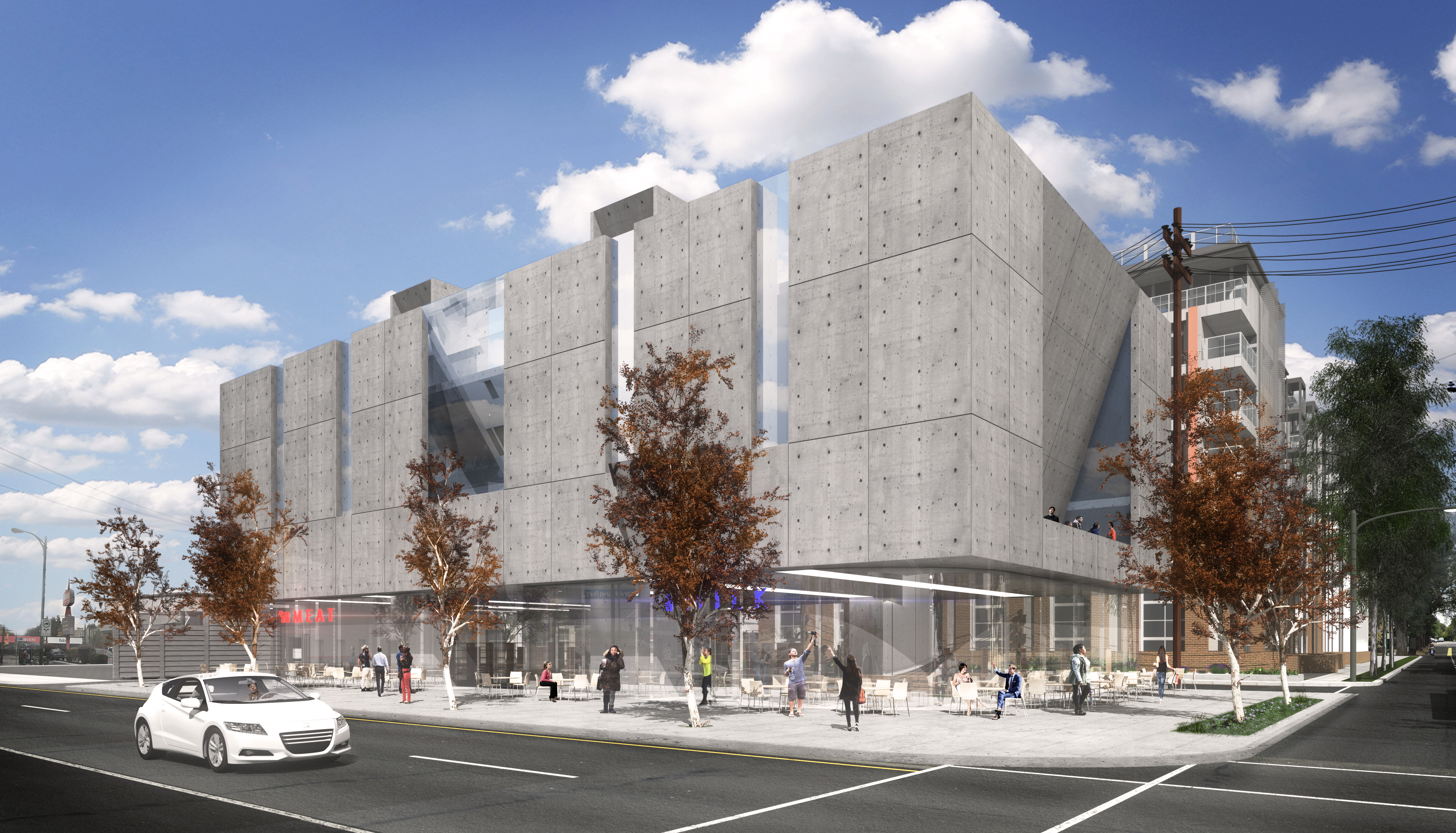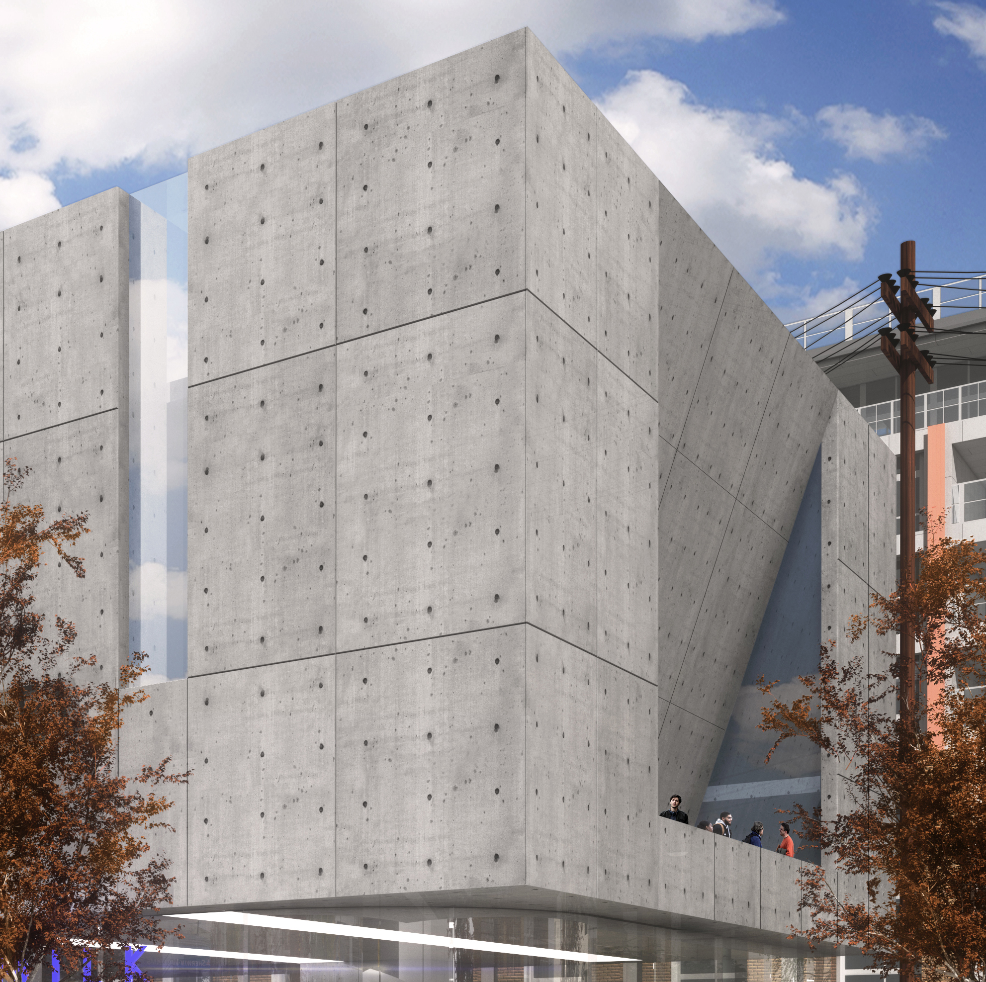 The sanctuary is invisibly lit by a perimeter clearstory which doubles as balustrade for the rooftop. A solid volume floats on the glass base public level. Incisions and sloping planes cut into the mass bring radiant light into the interior spaces.