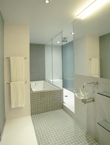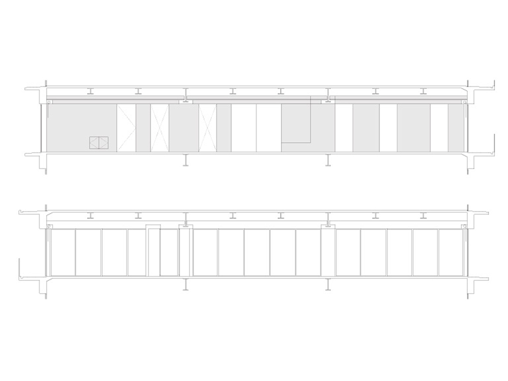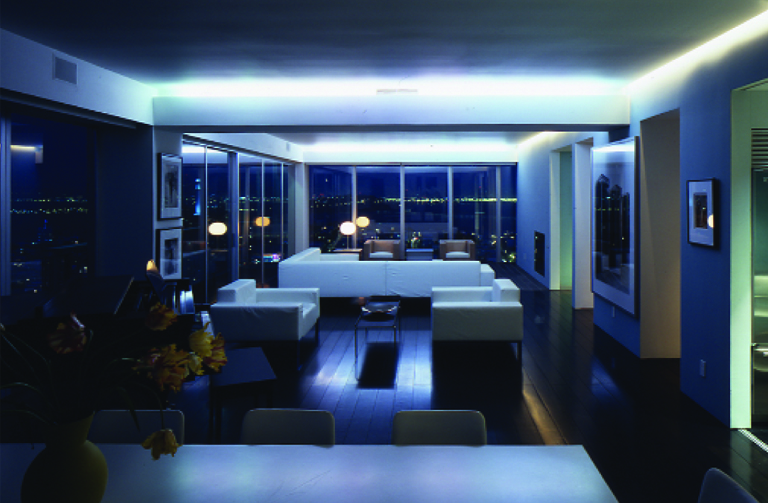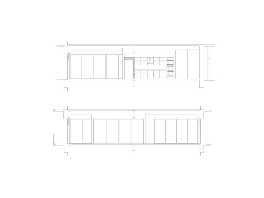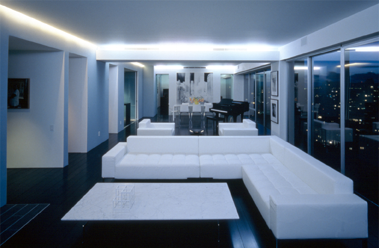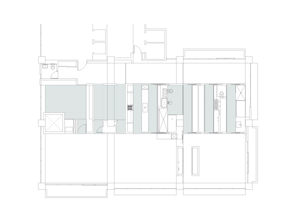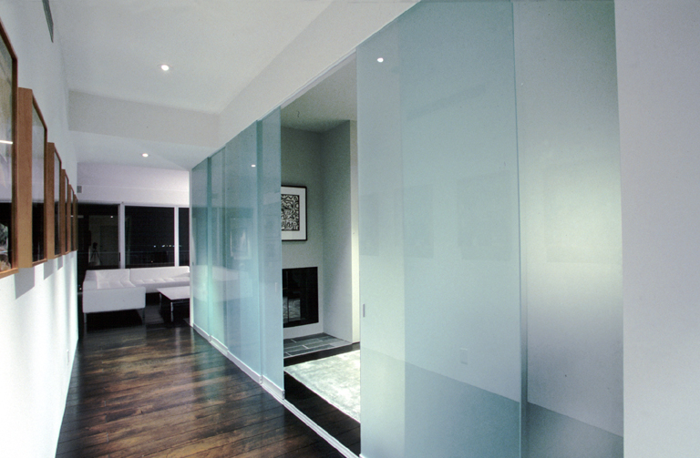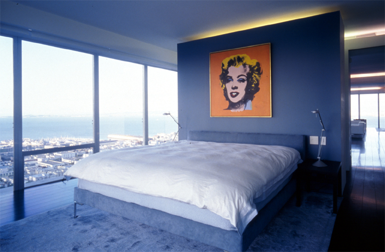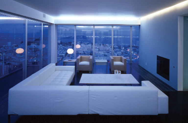 This apartment renovates a 3,200-square-foot floor in a high-rise building at the top of Russian Hill. The existing apartment was gutted, leaving floorto-ceiling glass walls in three directions and various vertical distribution cores randomly located in an empty field. Combs of service bars, containing bathrooms, closets, and kitchen, absorb and order these existing cores; the service walls divide the floor into two open spaces, a large area facing the bay for living and master bedroom and a smaller area for offices, gym, and entrance gallery. The striped walnut floor points to the grid of the city below, and the blue wall parallel to the long row of windows, into which the service bars are carved, reflects the bay. The shorter walls of the service bars are sliding etched glass, which brings light and reflections deep into the space. Above the lights and sounds of the city, this perch is a protected world of serenity, an internal landscape hovering above San Francisco.