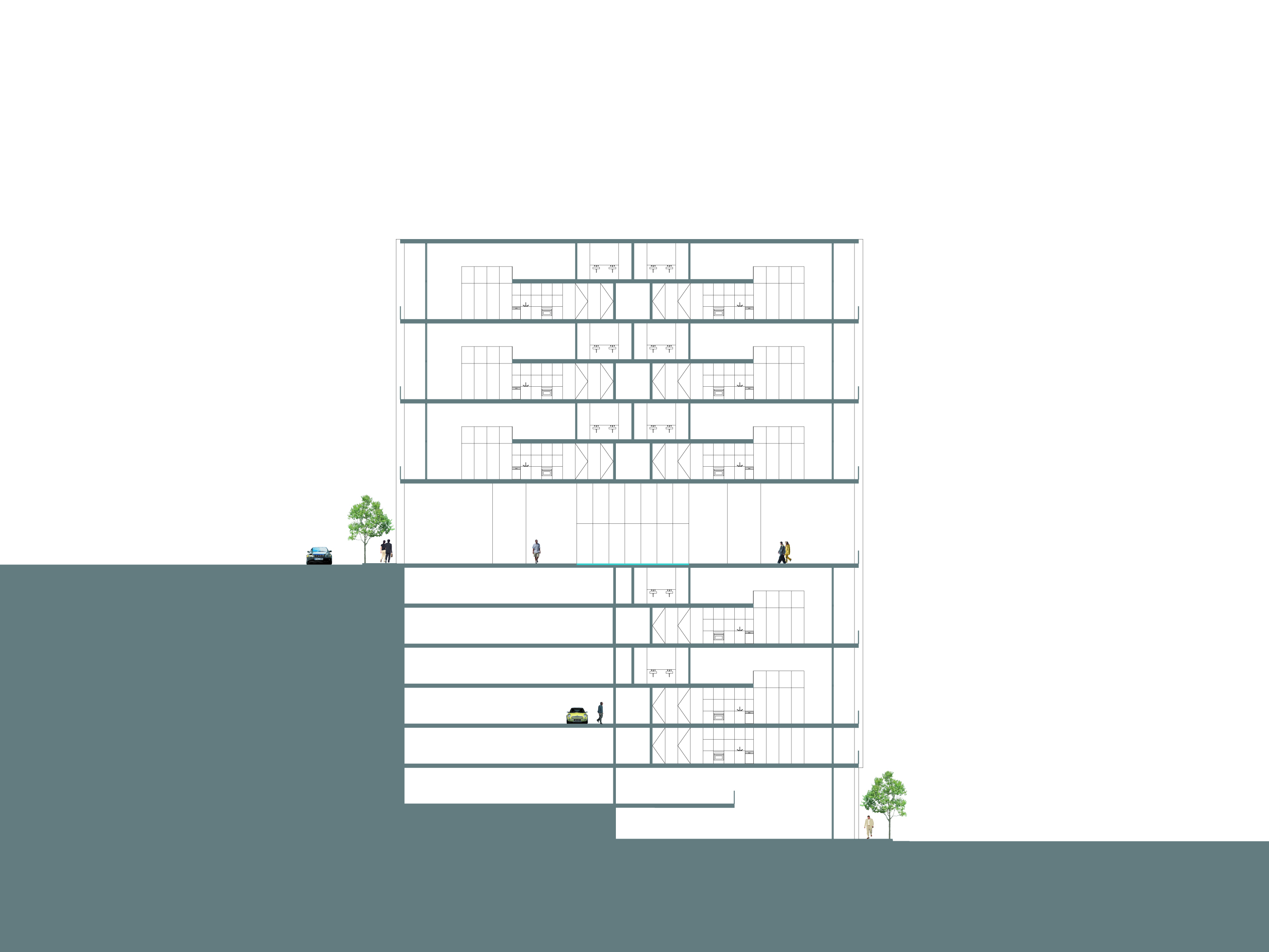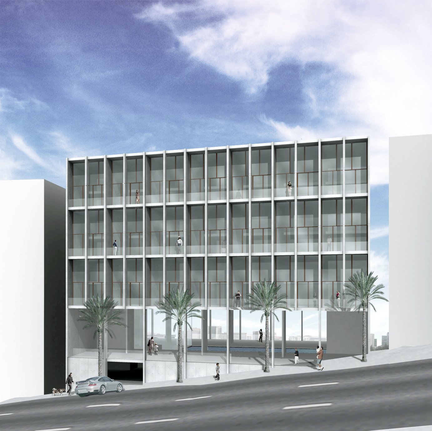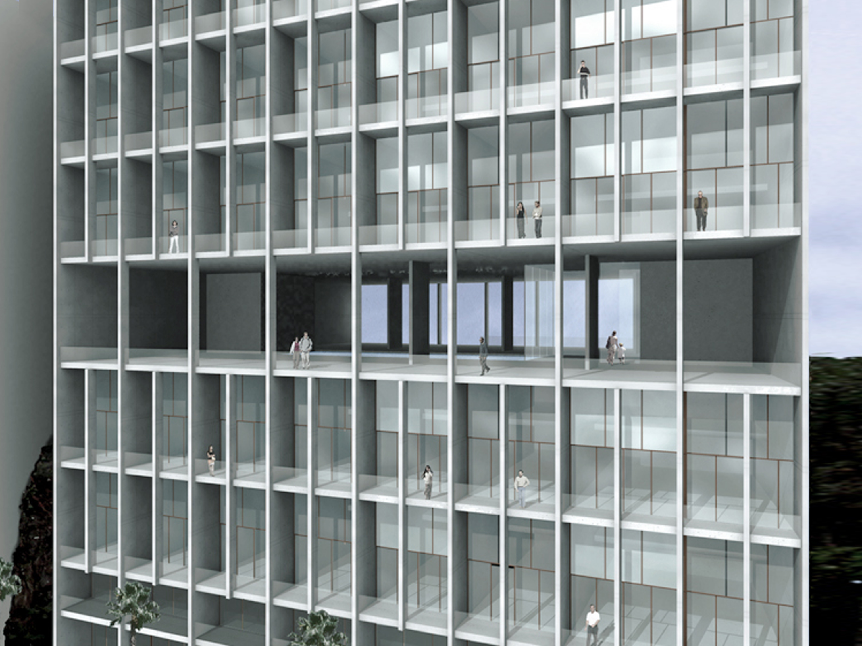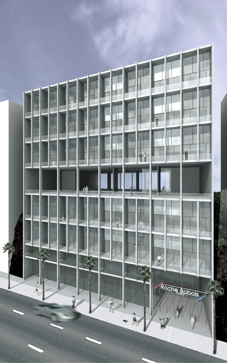 Two buildings, one above the other, inhabit this slice of hillside. An entrance plaza between the two frames the view to the city. The apartments are lofts housed in two-story concrete egg-crate frames. A service bar along one of the party walls maximizes open living space. In the upper building, lofts are arranged along a double-loaded hallway; in the lower building, parking is in the rear with lofts in front. On the lowest level is a lofty store for Roche Bobois. The construction method takes advantage of local traditions, with exposed concrete, hardwood windows, and etched-glass interior partitions.