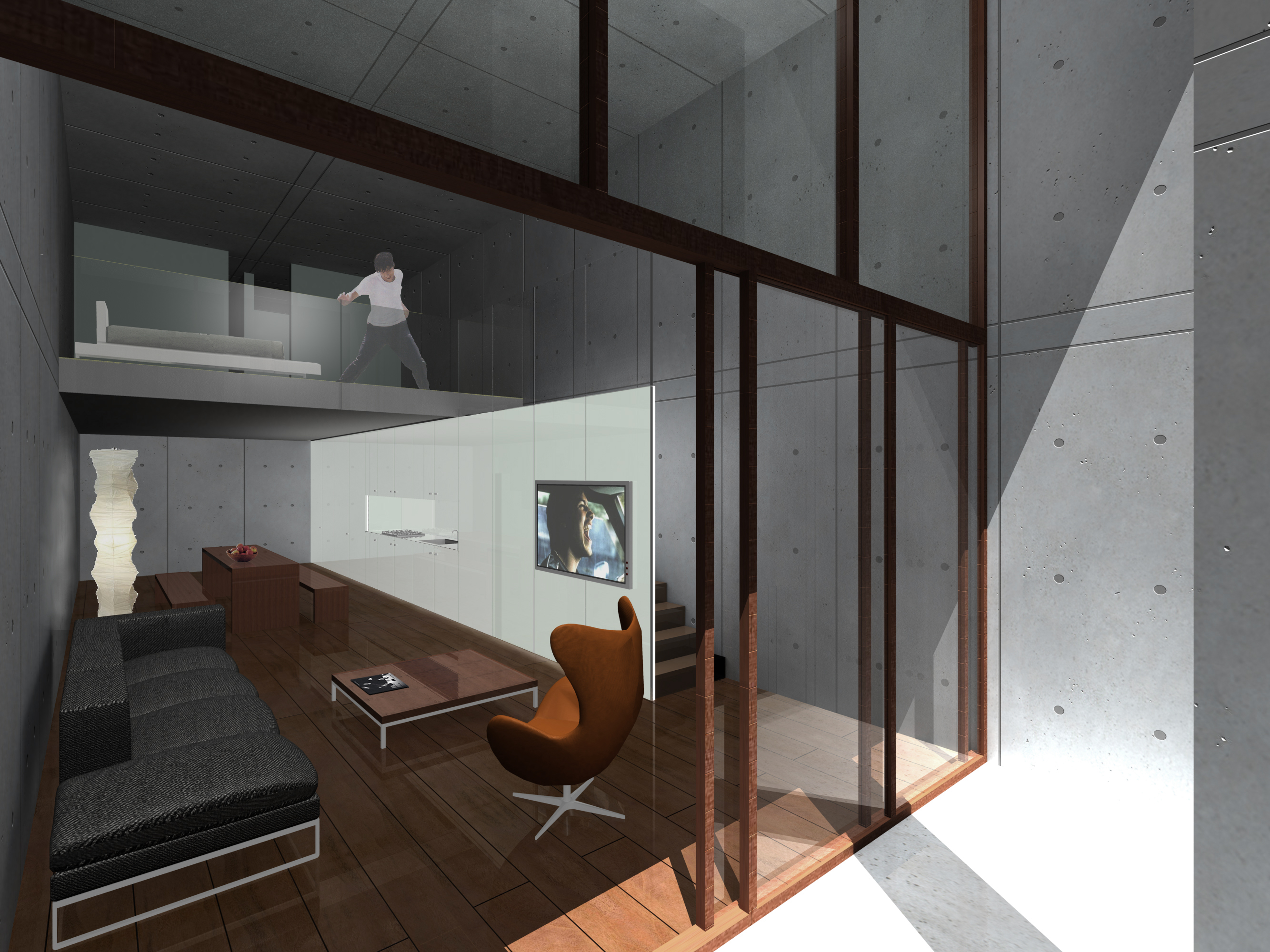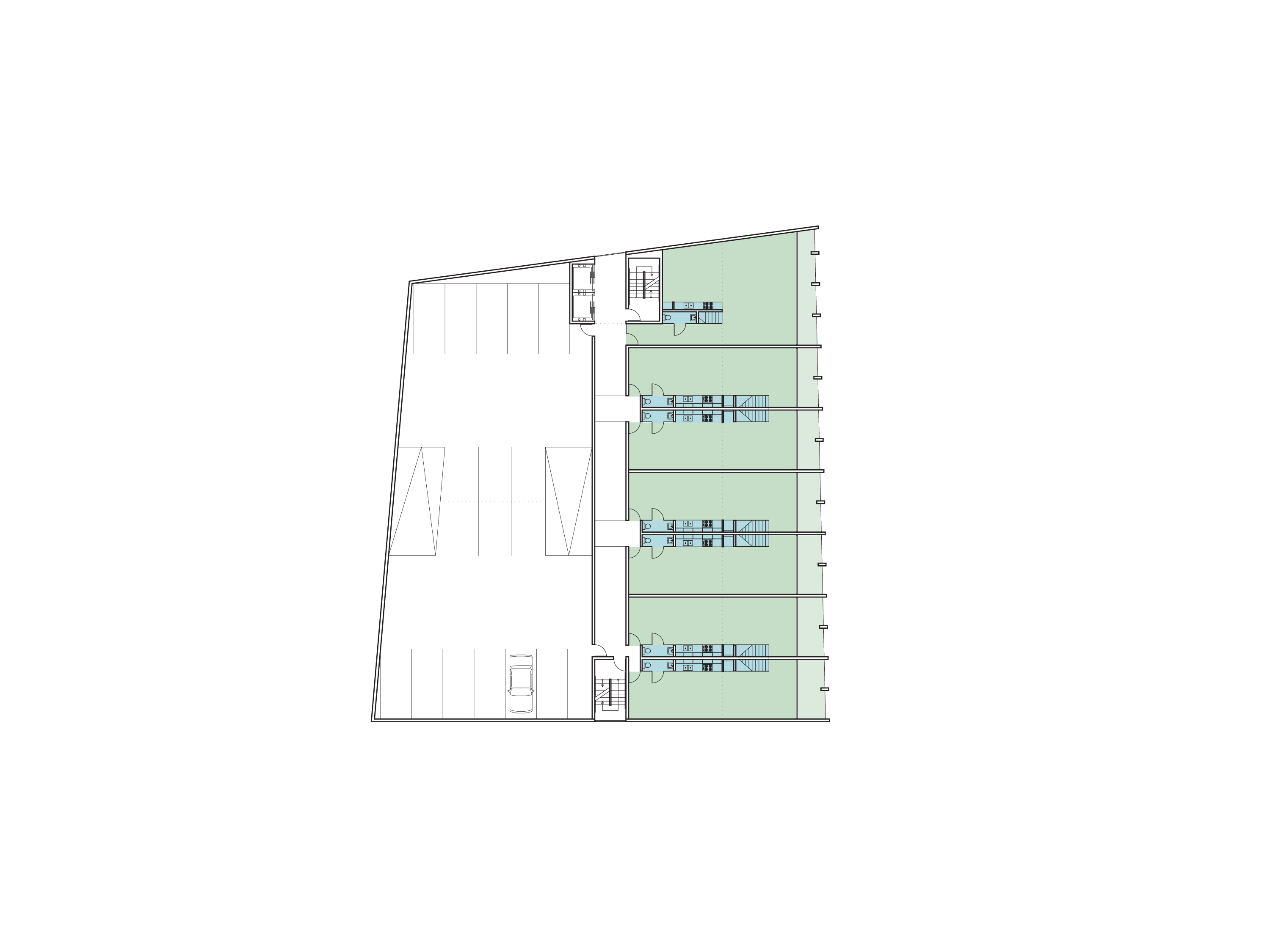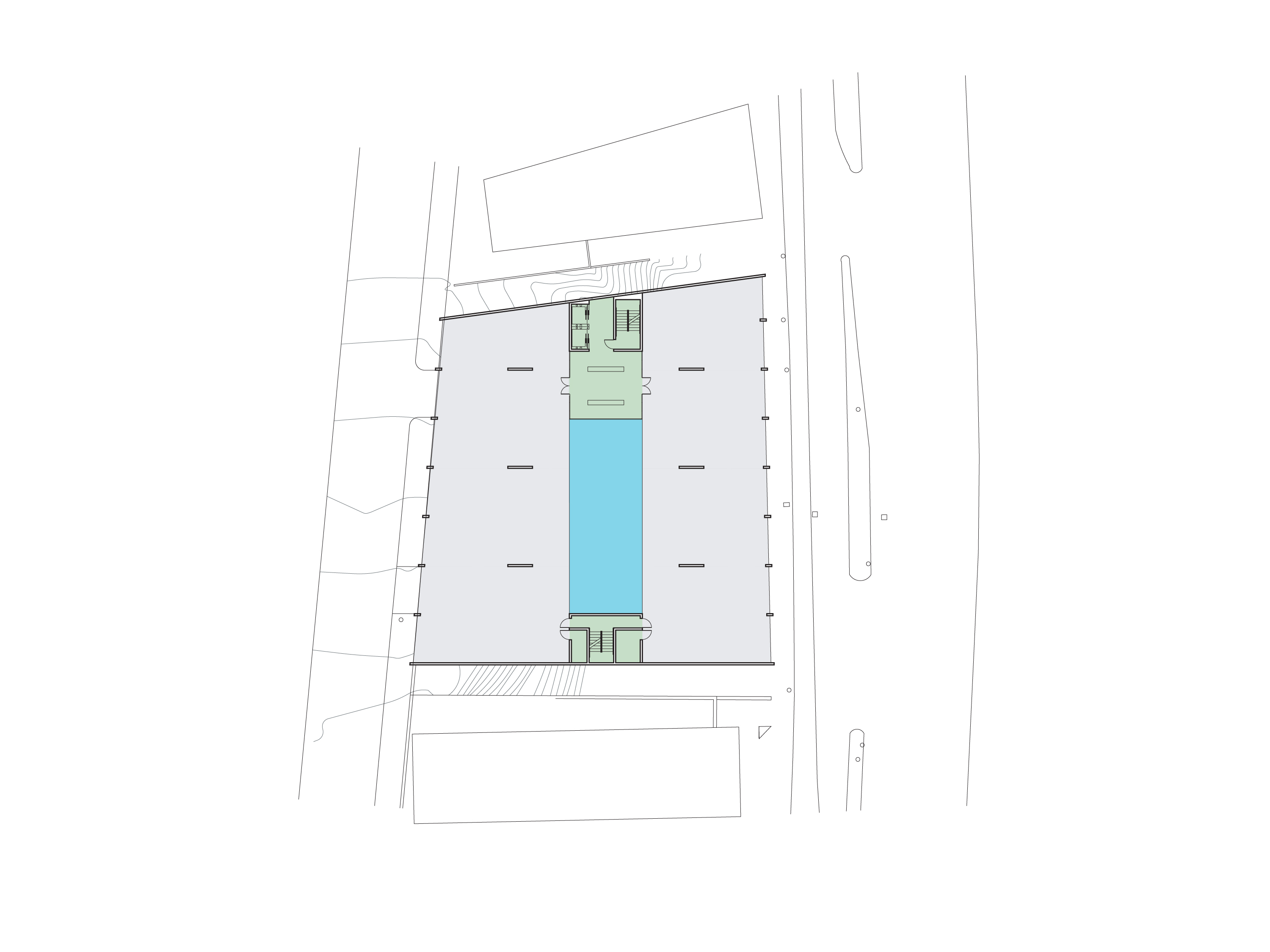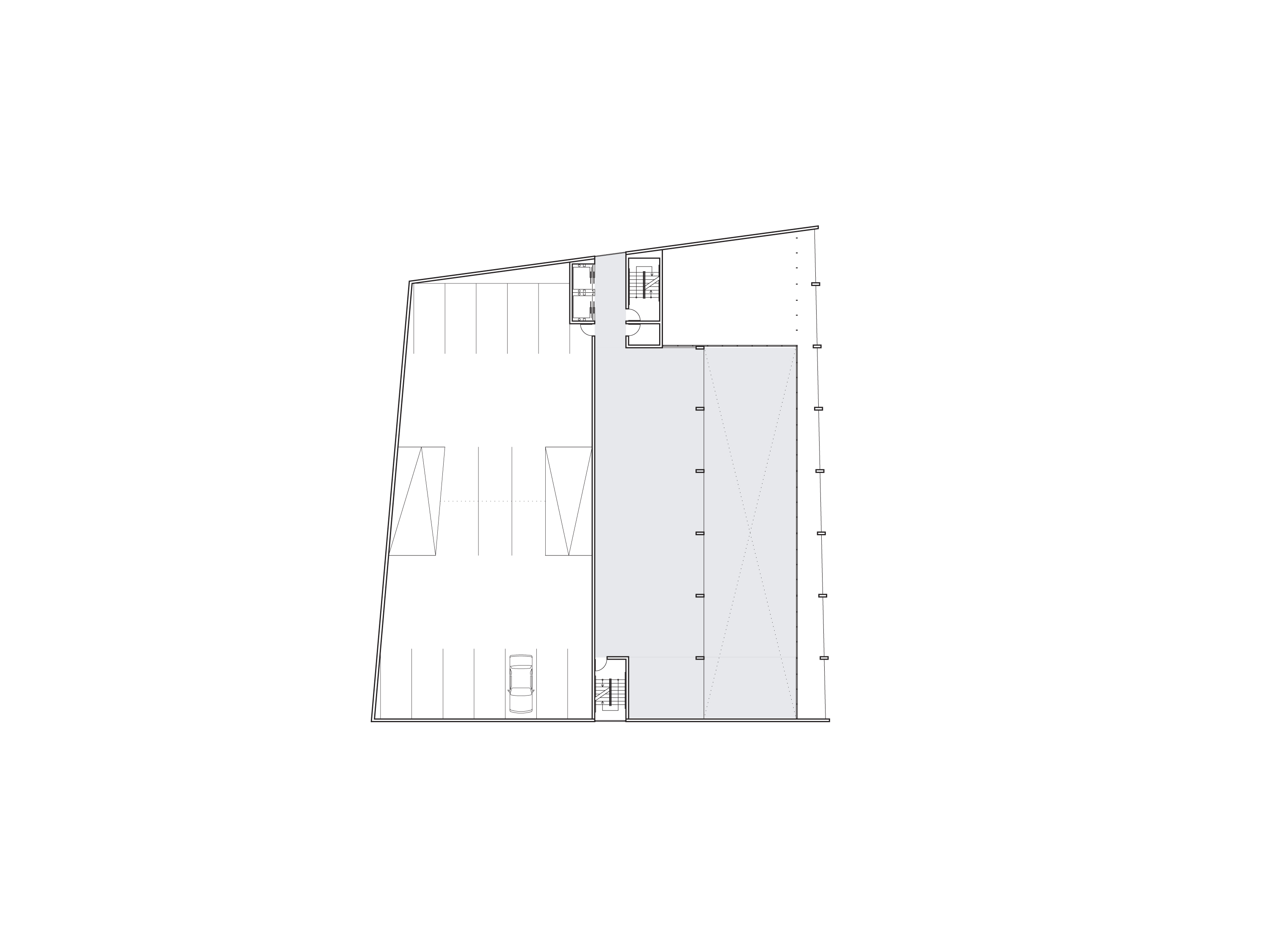 Two buildings, one above the other, inhabit this slice of hillside. An entrance plaza between the two frames the view to the city. The apartments are lofts housed in two-story concrete egg-crate frames. A service bar along one of the party walls maximizes open living space. In the upper building, lofts are arranged along a double-loaded hallway; in the lower building, parking is in the rear with lofts in front. On the lowest level is a lofty store for Roche Bobois. The construction method takes advantage of local traditions, with exposed concrete, hardwood windows, and etched-glass interior partitions.