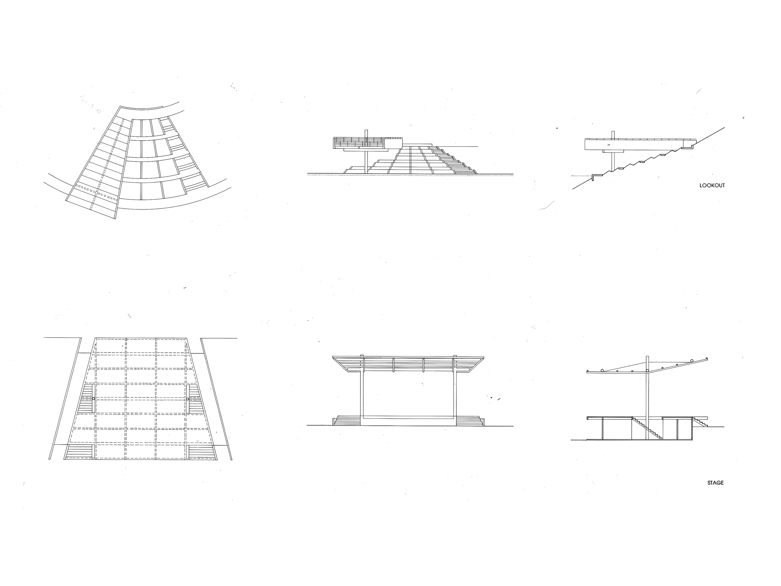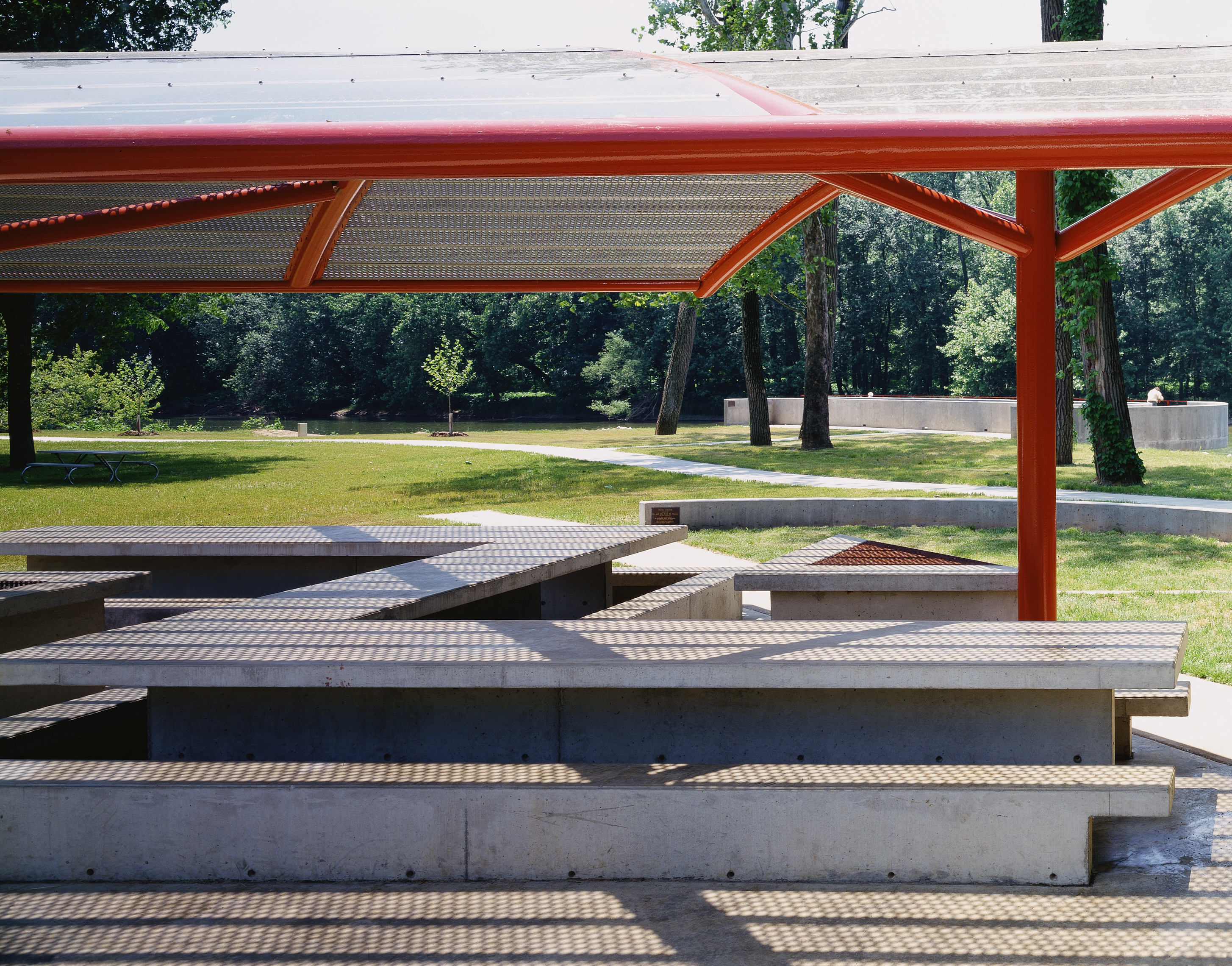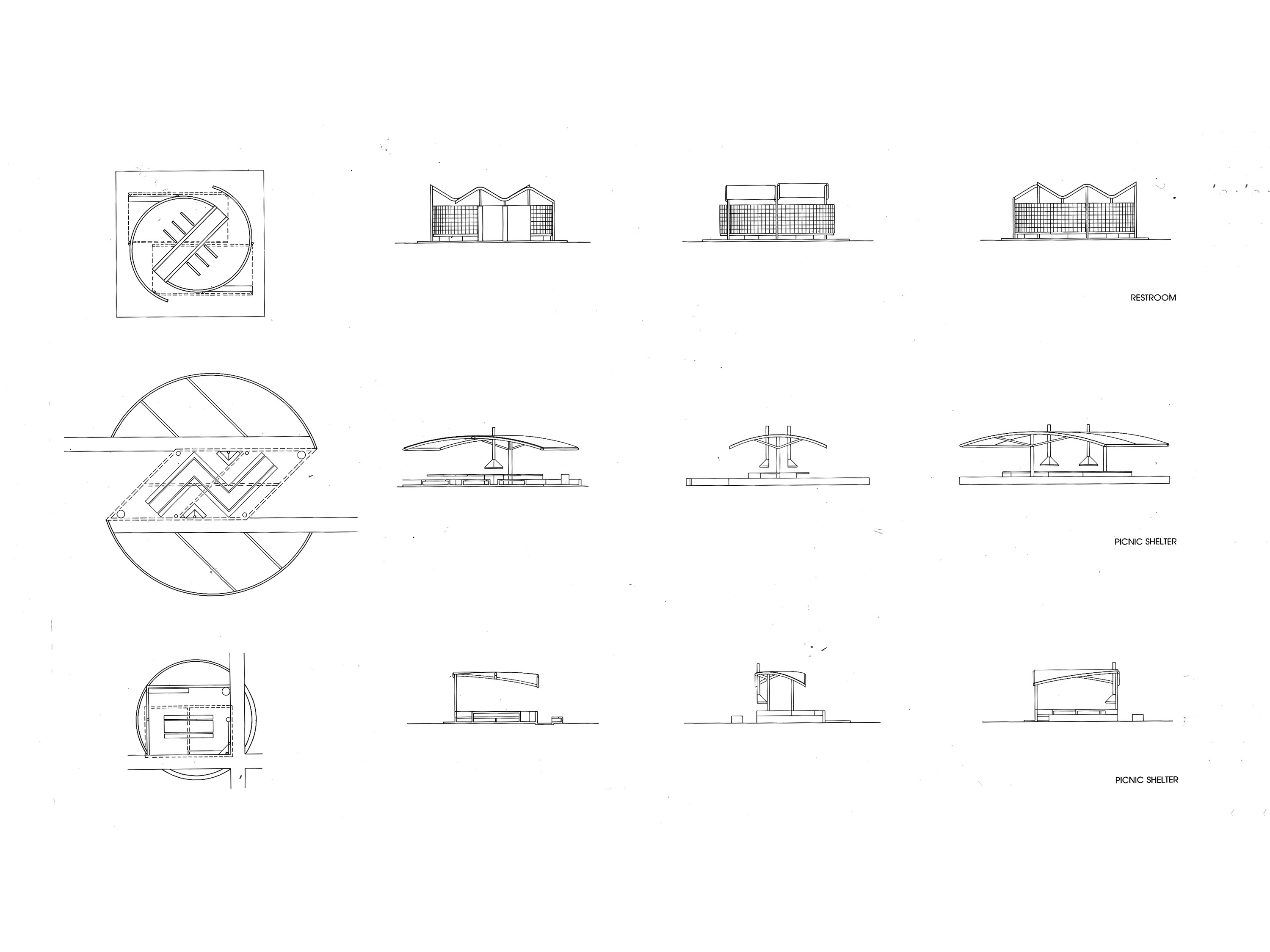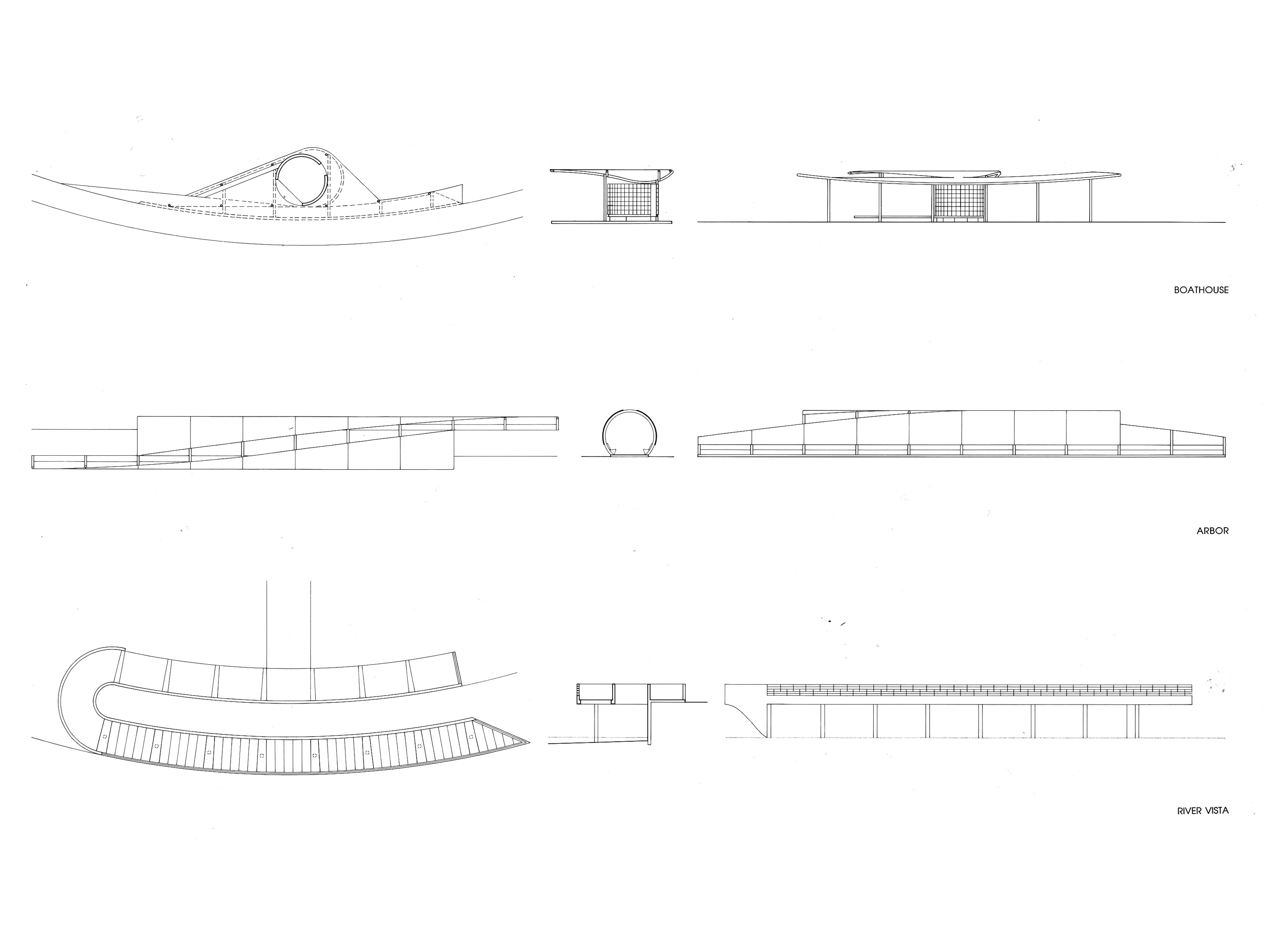 In the way that a tree inhabits the city, remembering nature, these structures inhabit nature, remembering the city. The buildings of Mill Race Park are a family, sharing the same genes, derived from a similar geometry, speaking a common language. The family has two branches: one with the characteristics of use specificity, where program generates the form; the other with the characteristics of site specificity, where location generates the form. The genetic structure of the buildings derives from formal explorations that revolve around the roof as the origin of shelter making—roofs as fragments of the dome of sky cut by forms that emerge on the ground as plan. A singular gesture aims to develop each structure as an object of definite ambiguity. The language is drawn from squares intersecting with circles, interpreted specifically in relation to site or program. All of the buildings have concrete platforms and walls with steel roofs, some corrugated and some perforated, supported by steel tube structures. The restrooms have M- and W-profile roofs floating above interlocking-glass-block screen walls, themselves floating above the ground. The picnic shelters establish their space via a roof draped over a table to form fragments of a room. The lookout is a bank for sunbathing that takes the form of a chaise longue; above is a fishing pier that also shades the bank. The arbor is a tunnel to the river vista, a lens focusing on the watercourse that divides and forms the boundaries of the park. The woven-wire skin of the arbor supports creepers; these plants drip into the bench-lined tunnel. The river vista, a curled pier that offers views down the river, weaves ground and water. The boathouse also connects land and water. Its roof is an upturned hull; jetties connect to two bodies of water, one dammed and constant, the other natural and varying. The amphitheater is a sculpted berm of earth; a crater, a dish of seating, transforms into a structure, a scaffold above a stage. Finally, the tower aligns with Eliel Saarinen’s First Christian Church tower, the building that launched Columbus’s civic program of modern architecture. The park version is primal, stripped to basic elements: wall, stair, elevator, clock, viewing platform. The viewing platform presents a map of Columbus, a synoptic view of architecture and city. The park structures concretize their situations, amplify their sites, proclaim their functions publicly.