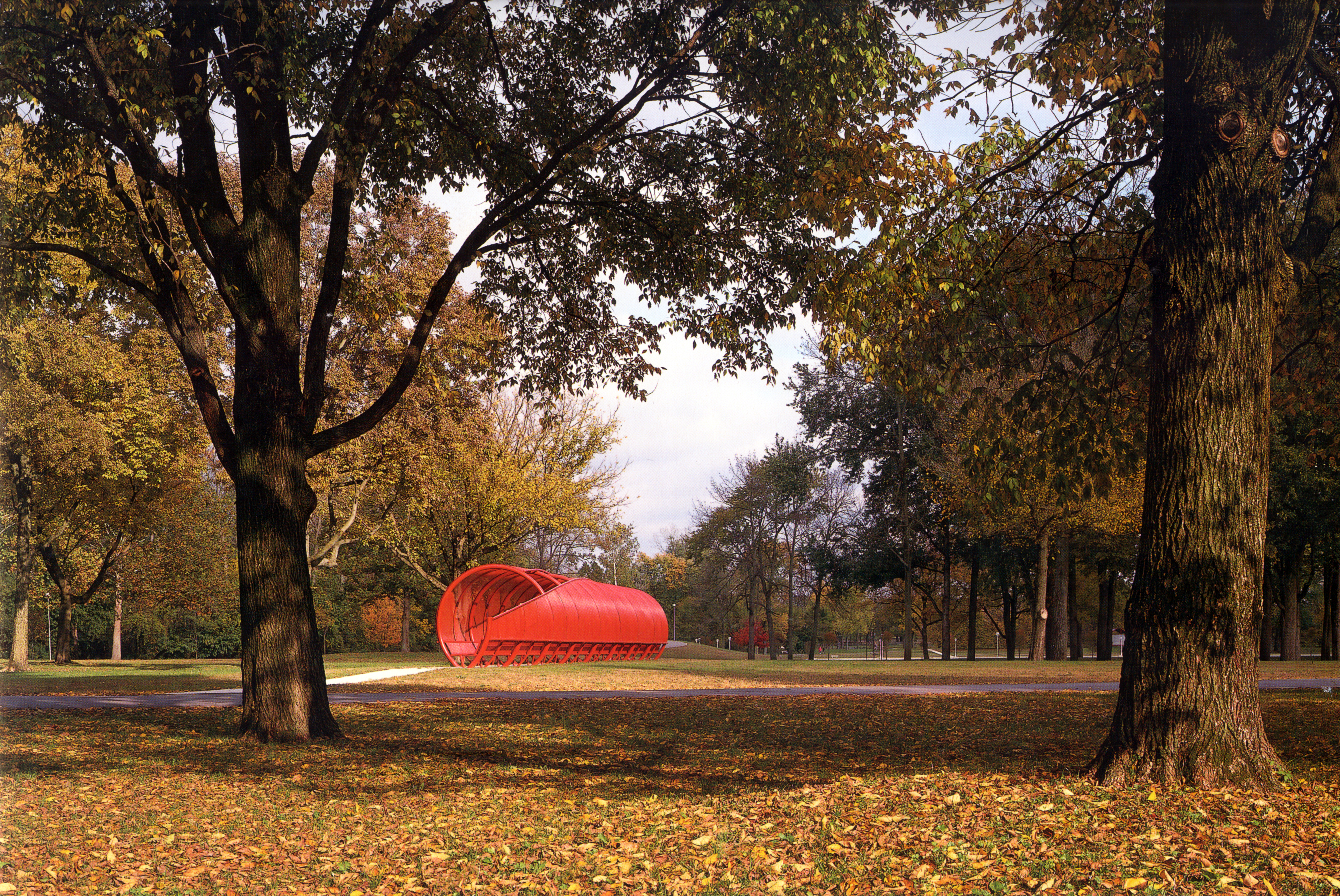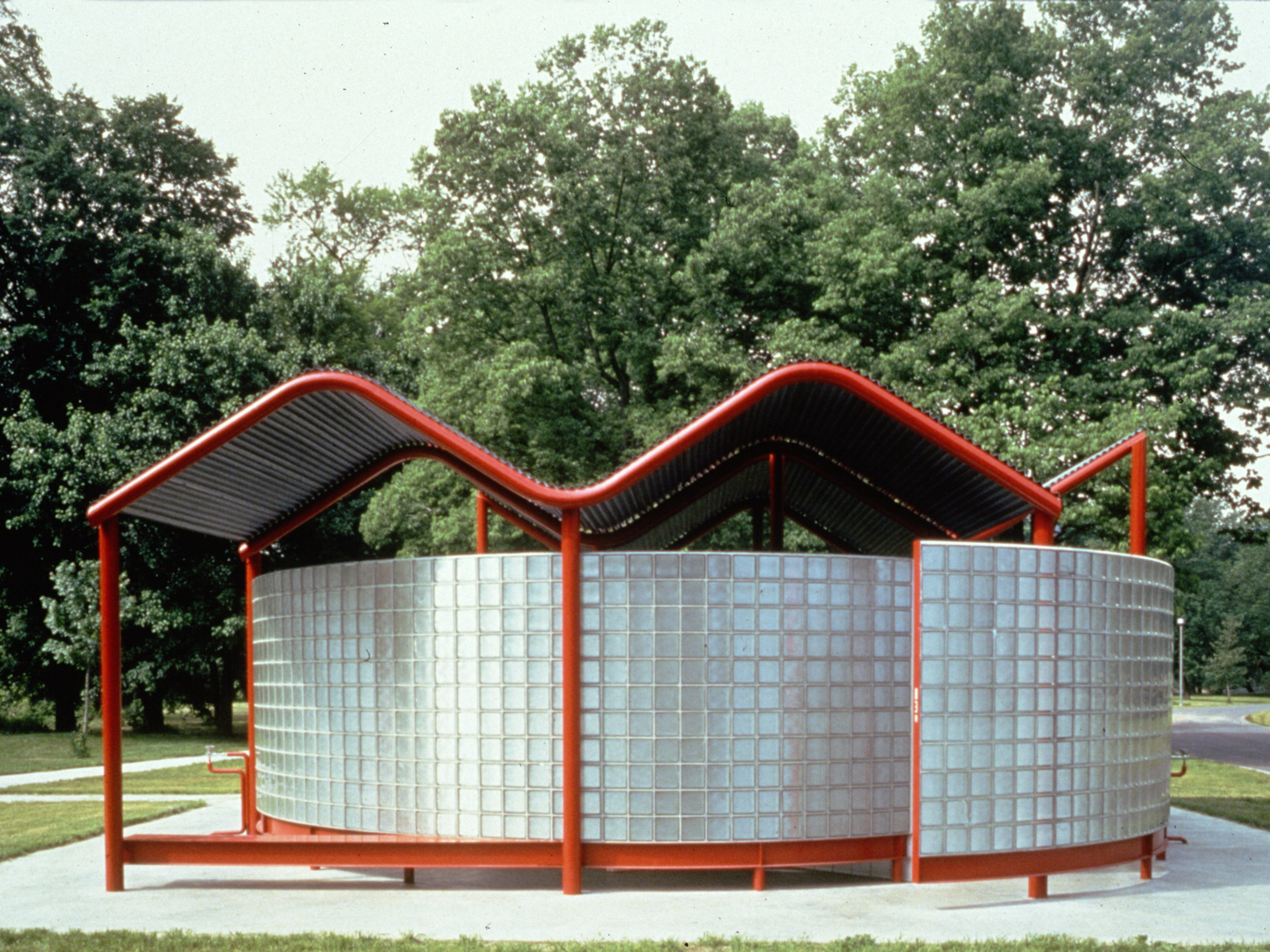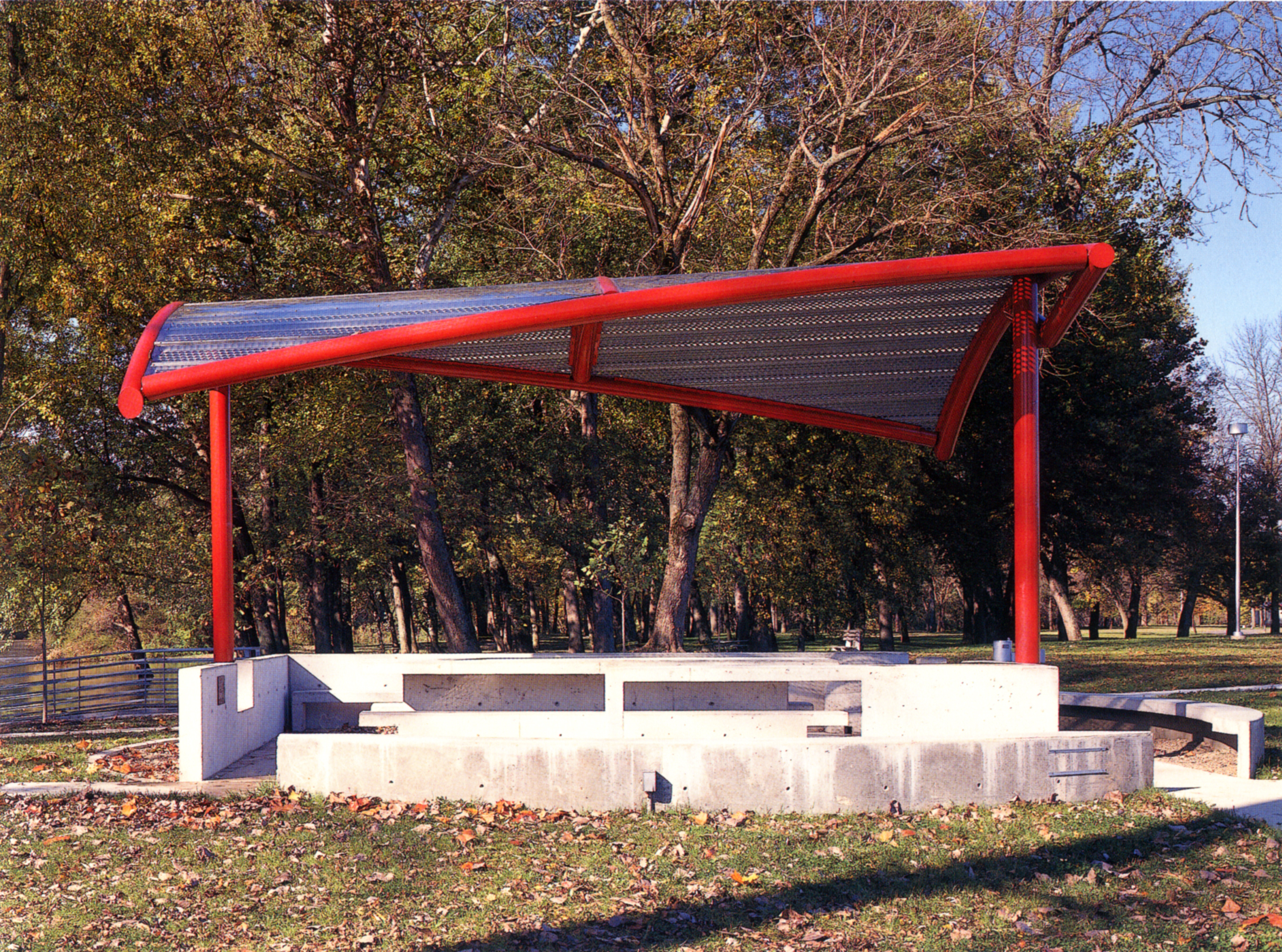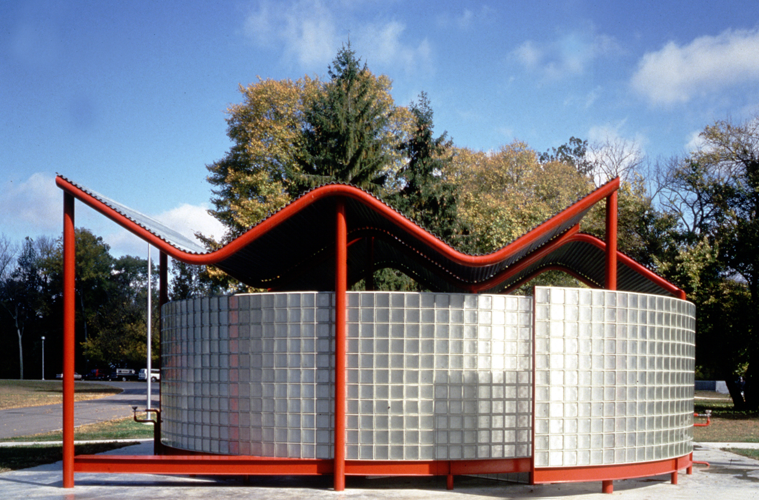 In the way that a tree inhabits the city, remembering nature, these structures inhabit nature, remembering the city. The buildings of Mill Race Park are a family, sharing the same genes, derived from a similar geometry, speaking a common language. The family has two branches: one with the characteristics of use specificity, where program generates the form; the other with the characteristics of site specificity, where location generates the form. The genetic structure of the buildings derives from formal explorations that revolve around the roof as the origin of shelter making—roofs as fragments of the dome of sky cut by forms that emerge on the ground as plan. A singular gesture aims to develop each structure as an object of definite ambiguity. The language is drawn from squares intersecting with circles, interpreted specifically in relation to site or program. All of the buildings have concrete platforms and walls with steel roofs, some corrugated and some perforated, supported by steel tube structures. The restrooms have M- and W-profile roofs floating above interlocking-glass-block screen walls, themselves floating above the ground. The picnic shelters establish their space via a roof draped over a table to form fragments of a room. The lookout is a bank for sunbathing that takes the form of a chaise longue; above is a fishing pier that also shades the bank. The arbor is a tunnel to the river vista, a lens focusing on the watercourse that divides and forms the boundaries of the park. The woven-wire skin of the arbor supports creepers; these plants drip into the bench-lined tunnel. The river vista, a curled pier that offers views down the river, weaves ground and water. The boathouse also connects land and water. Its roof is an upturned hull; jetties connect to two bodies of water, one dammed and constant, the other natural and varying. The amphitheater is a sculpted berm of earth; a crater, a dish of seating, transforms into a structure, a scaffold above a stage. Finally, the tower aligns with Eliel Saarinen’s First Christian Church tower, the building that launched Columbus’s civic program of modern architecture. The park version is primal, stripped to basic elements: wall, stair, elevator, clock, viewing platform. The viewing platform presents a map of Columbus, a synoptic view of architecture and city. The park structures concretize their situations, amplify their sites, proclaim their functions publicly.