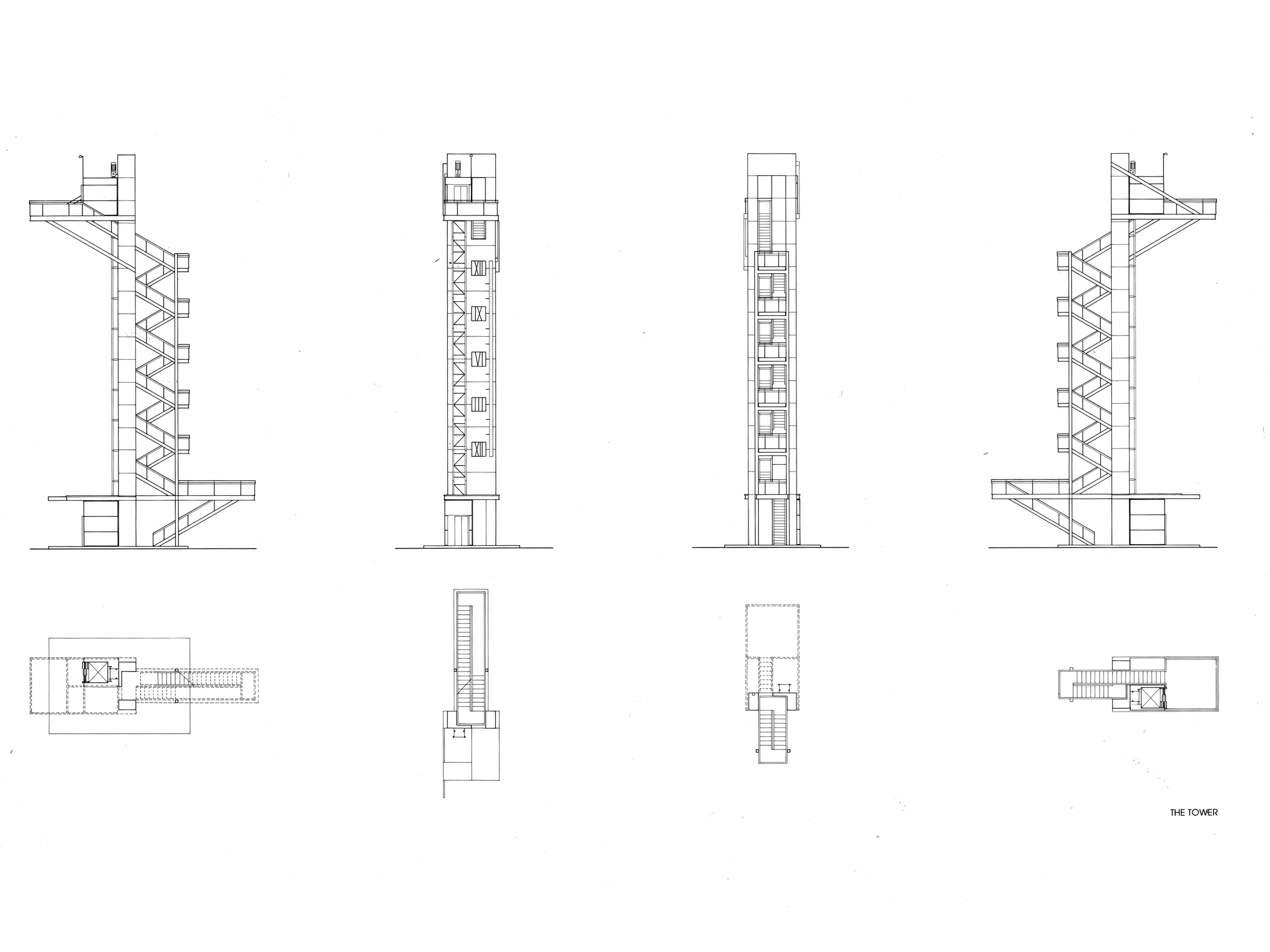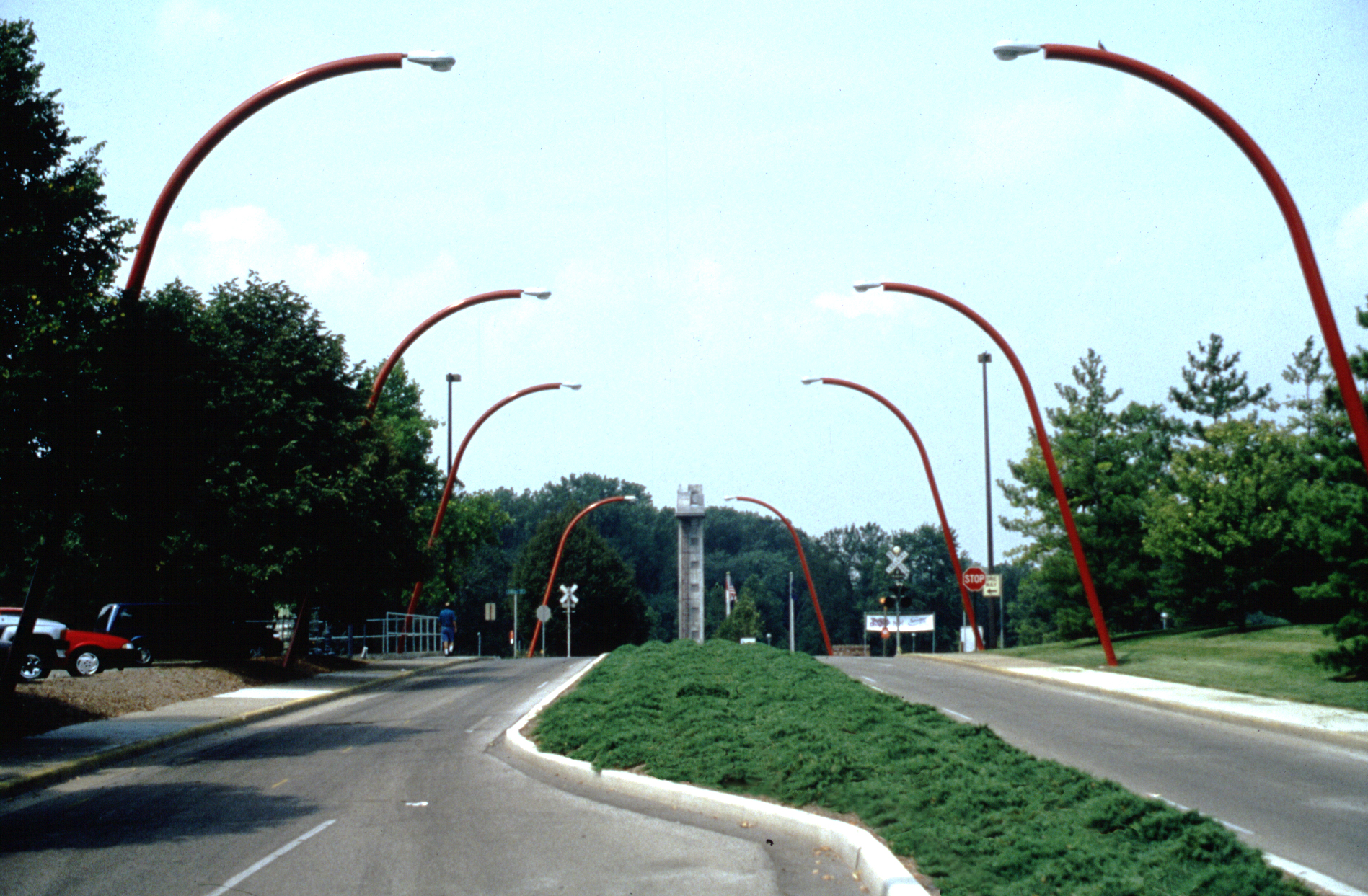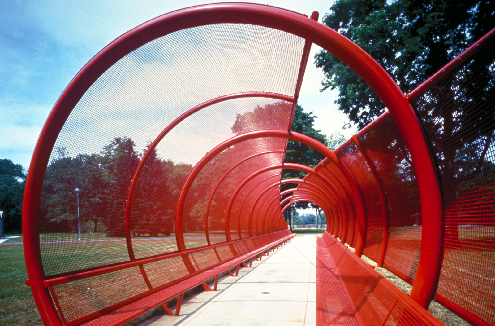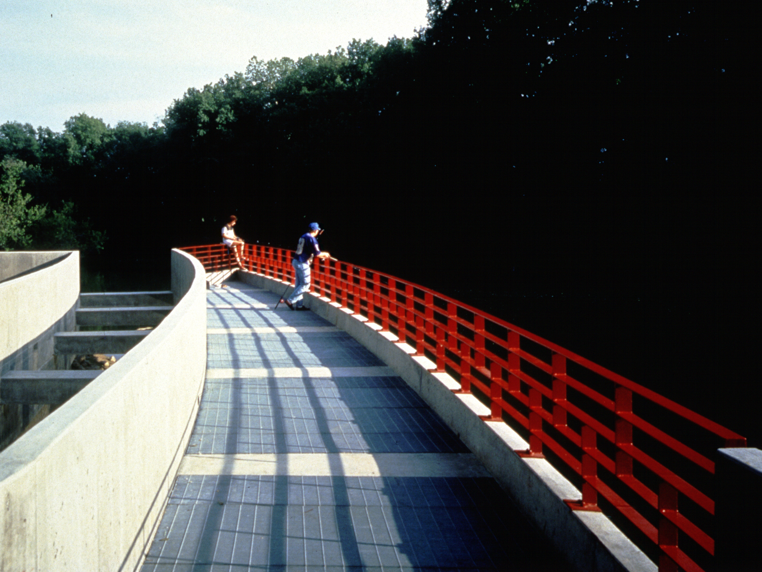 In the way that a tree inhabits the city, remembering nature, these structures inhabit nature, remembering the city. The buildings of Mill Race Park are a family, sharing the same genes, derived from a similar geometry, speaking a common language. The family has two branches: one with the characteristics of use specificity, where program generates the form; the other with the characteristics of site specificity, where location generates the form. The genetic structure of the buildings derives from formal explorations that revolve around the roof as the origin of shelter making—roofs as fragments of the dome of sky cut by forms that emerge on the ground as plan. A singular gesture aims to develop each structure as an object of definite ambiguity. The language is drawn from squares intersecting with circles, interpreted specifically in relation to site or program. All of the buildings have concrete platforms and walls with steel roofs, some corrugated and some perforated, supported by steel tube structures. The restrooms have M- and W-profile roofs floating above interlocking-glass-block screen walls, themselves floating above the ground. The picnic shelters establish their space via a roof draped over a table to form fragments of a room. The lookout is a bank for sunbathing that takes the form of a chaise longue; above is a fishing pier that also shades the bank. The arbor is a tunnel to the river vista, a lens focusing on the watercourse that divides and forms the boundaries of the park. The woven-wire skin of the arbor supports creepers; these plants drip into the bench-lined tunnel. The river vista, a curled pier that offers views down the river, weaves ground and water. The boathouse also connects land and water. Its roof is an upturned hull; jetties connect to two bodies of water, one dammed and constant, the other natural and varying. The amphitheater is a sculpted berm of earth; a crater, a dish of seating, transforms into a structure, a scaffold above a stage. Finally, the tower aligns with Eliel Saarinen’s First Christian Church tower, the building that launched Columbus’s civic program of modern architecture. The park version is primal, stripped to basic elements: wall, stair, elevator, clock, viewing platform. The viewing platform presents a map of Columbus, a synoptic view of architecture and city. The park structures concretize their situations, amplify their sites, proclaim their functions publicly.