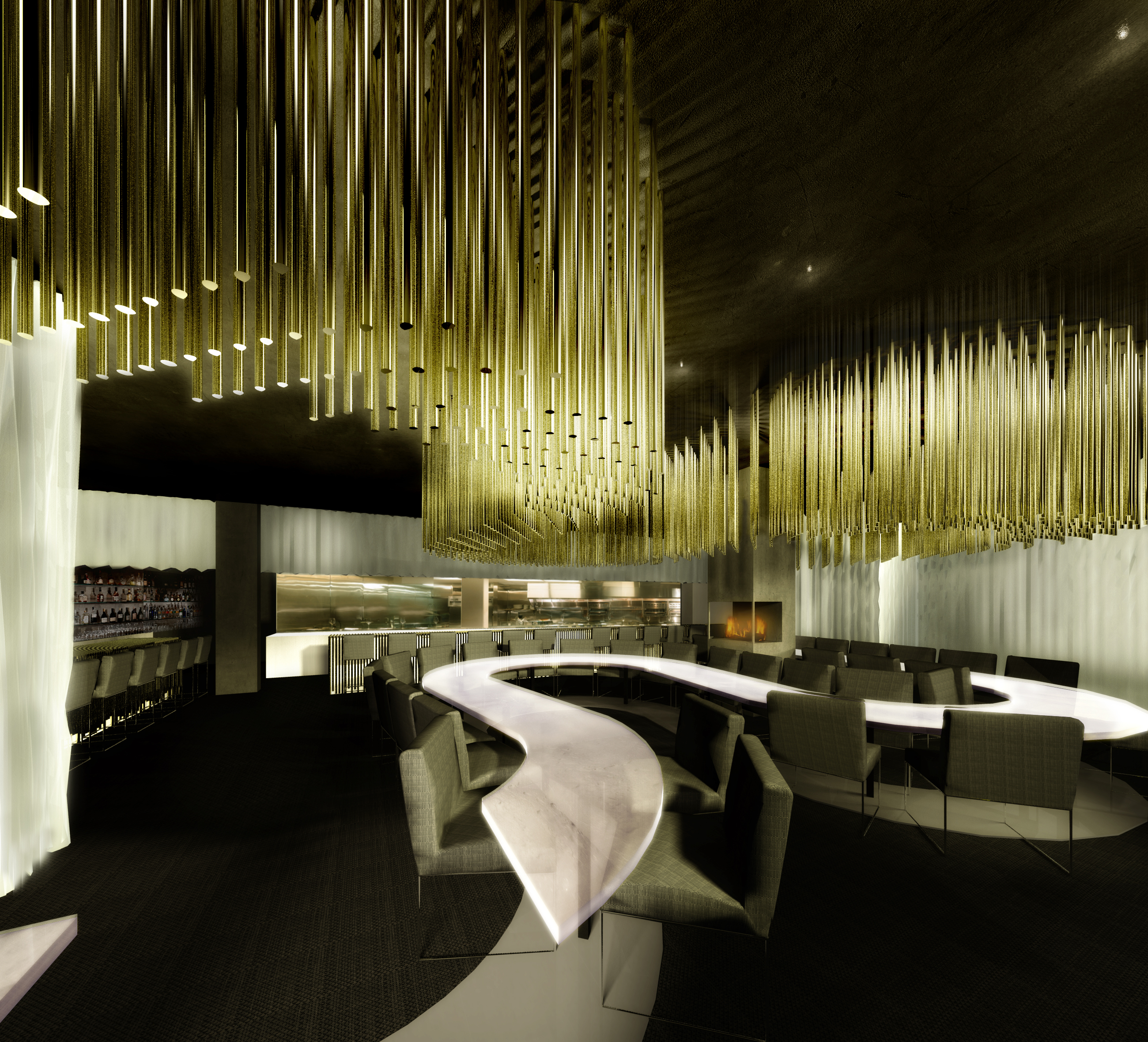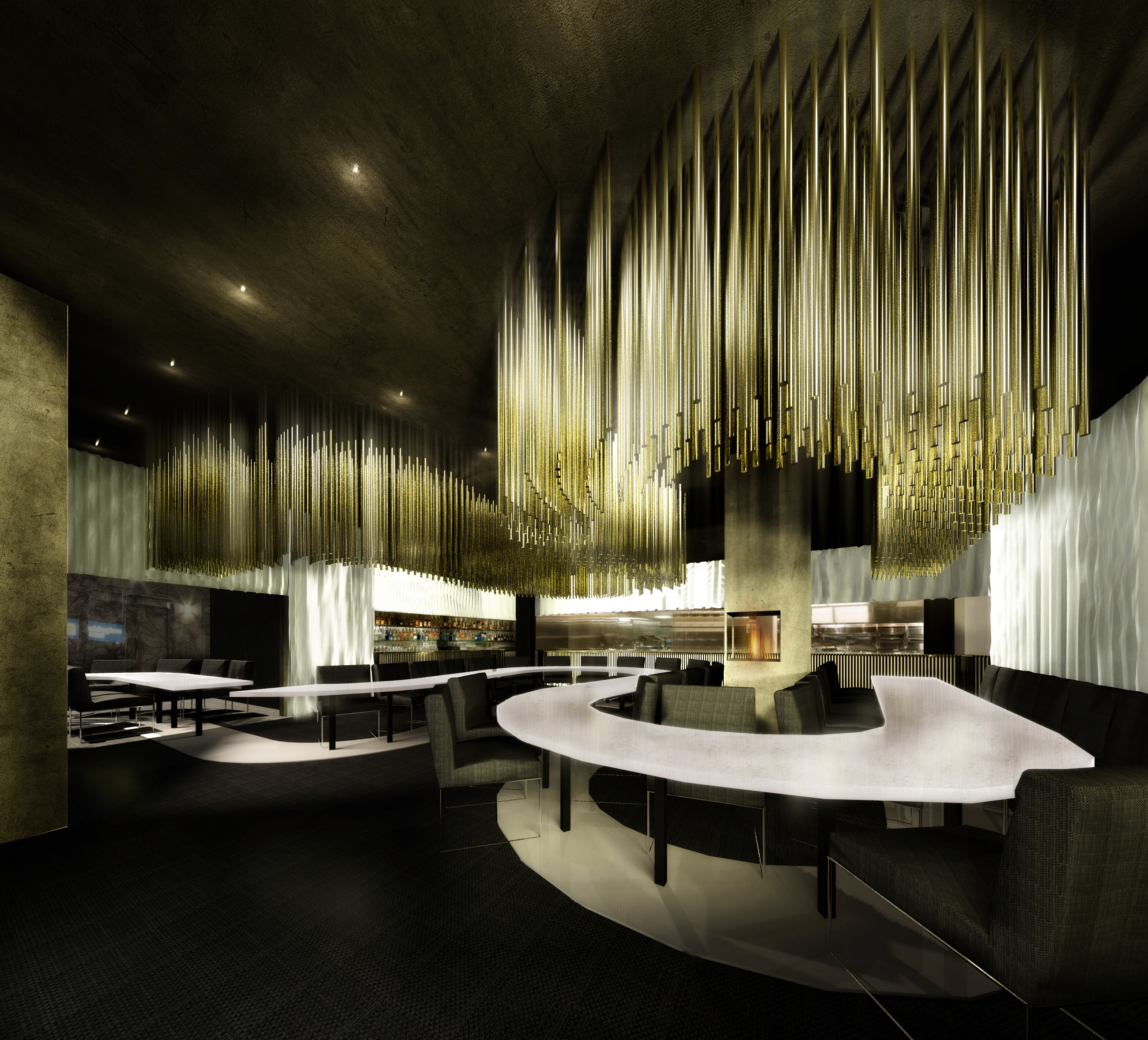 Above the table is an echo of brass pipes that cast light and deflect sound. One wall is the bar, the other an open kitchen with seating for diners to watch the theatre of cooking.