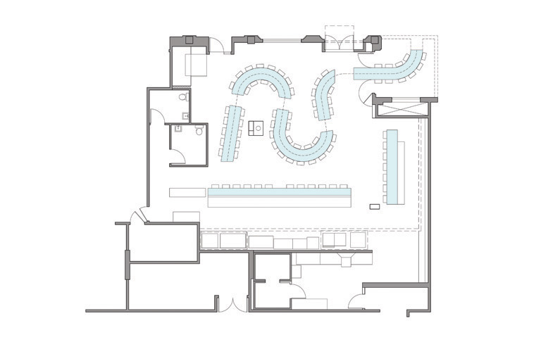 Like the river, a single table meanders through the space – here everyone sits around and eats as a family. Oxbows and curves allow parties to cluster.
