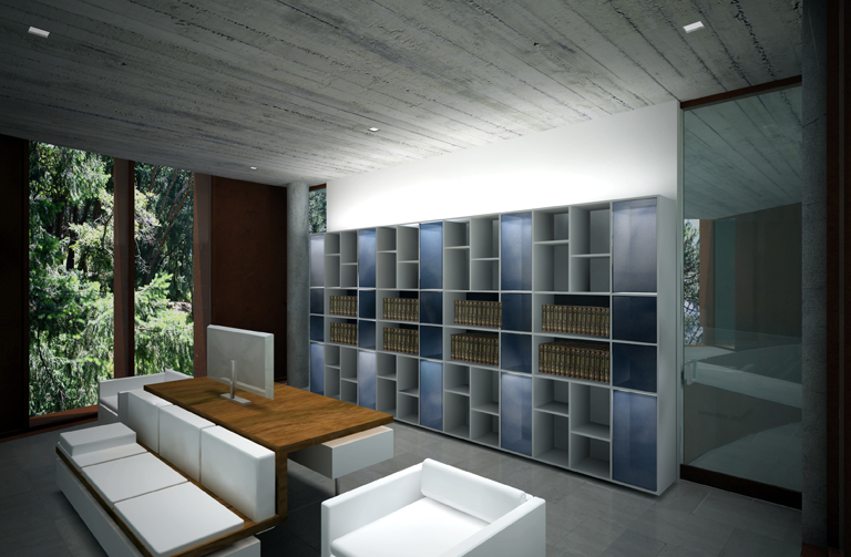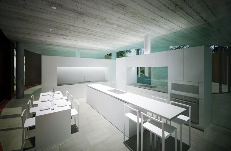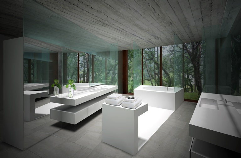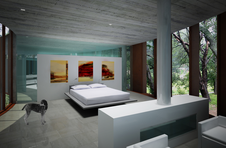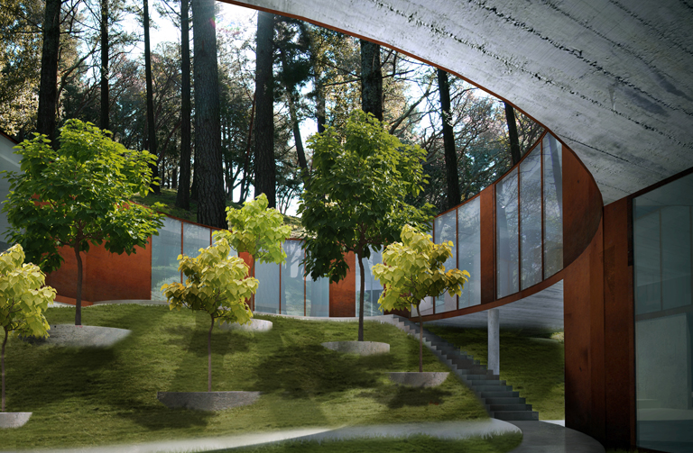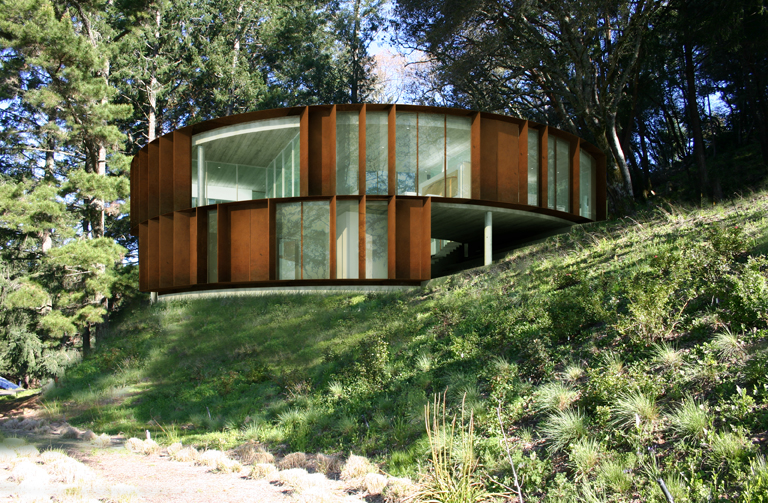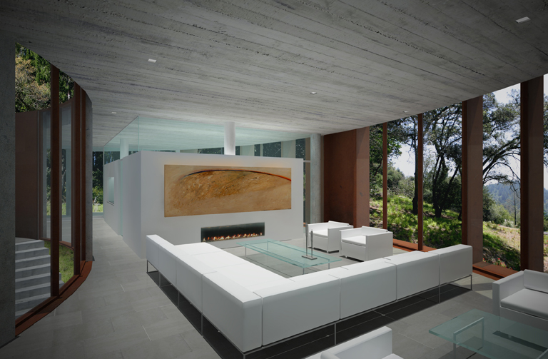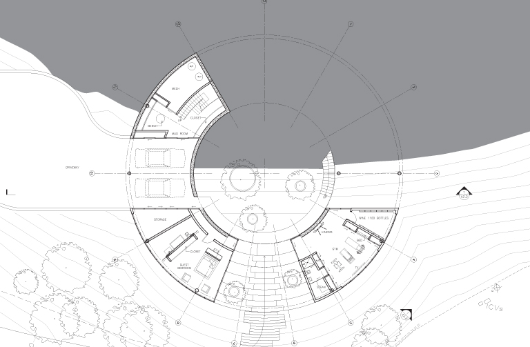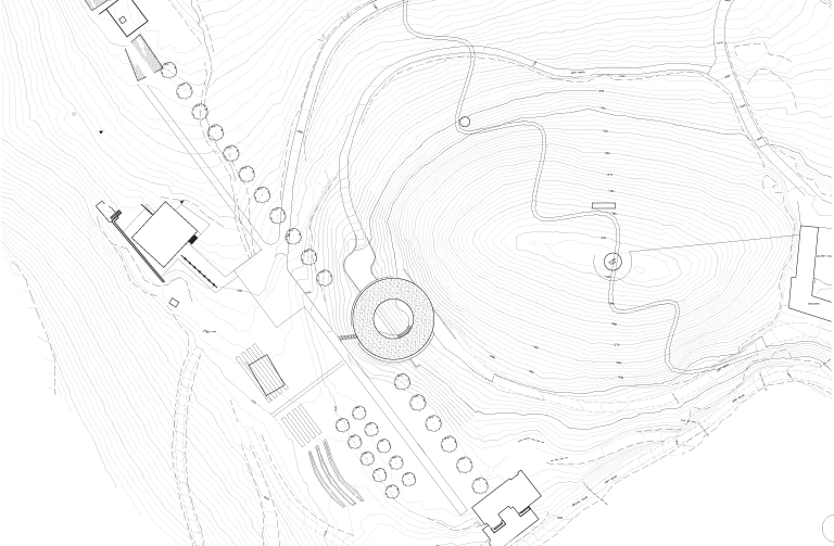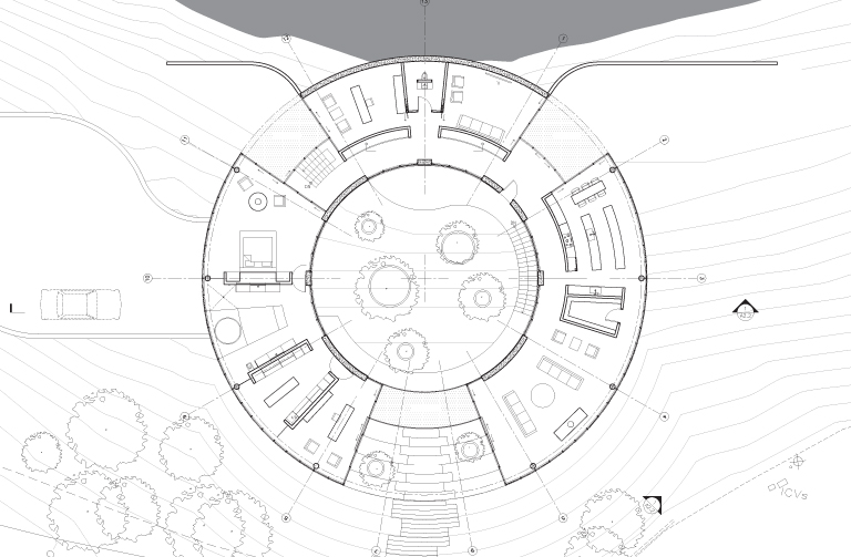 The hill is crowned with a donut shaped building resting on the hill, preserving the sloped landscape at the center as a courtyard through which the entry climbs. Sun is collected through this court. It provides sheltered outdoor spaces. The living areas face the large view of the valley, the sleeping areas the tranquility of the lake.