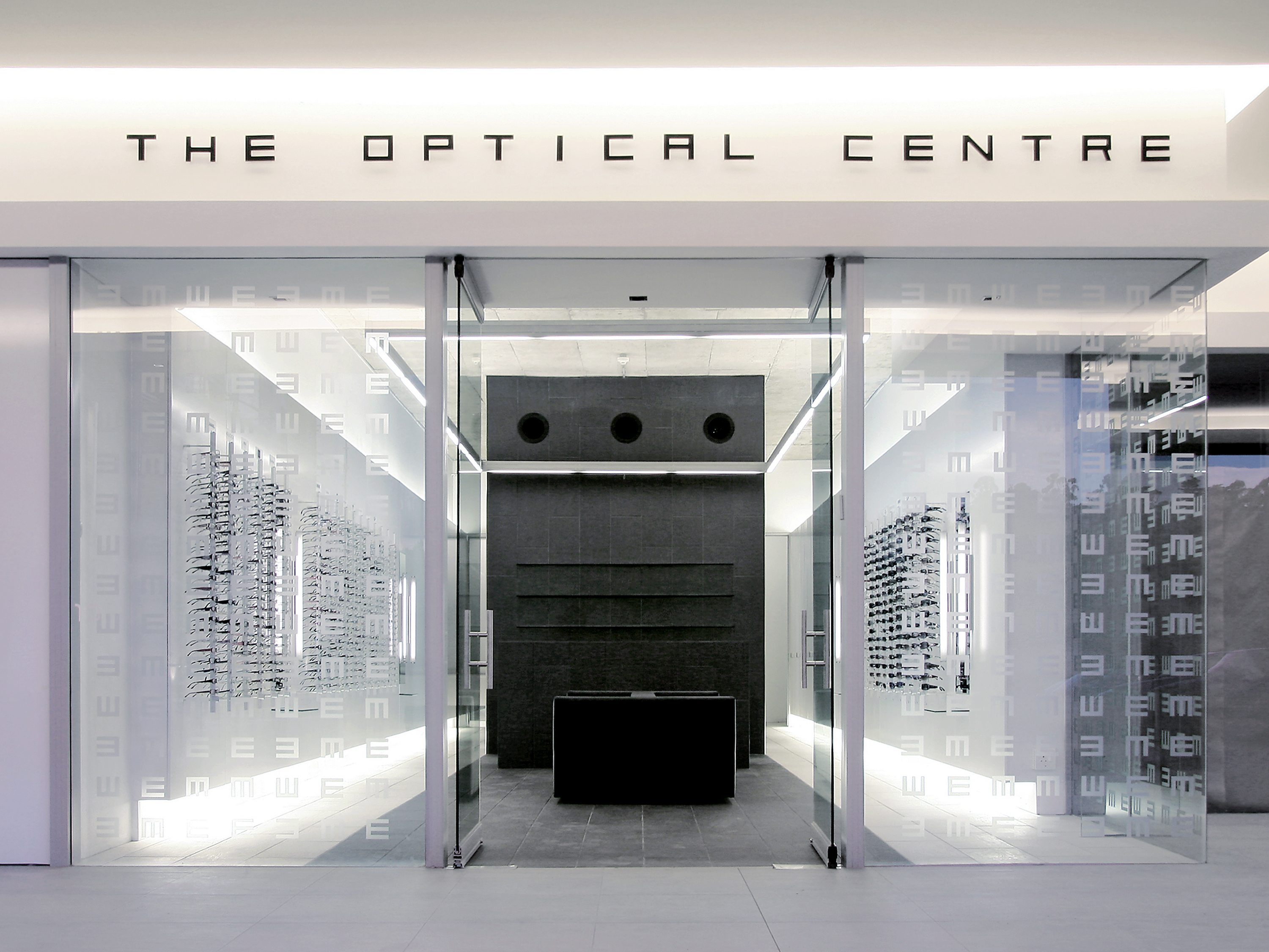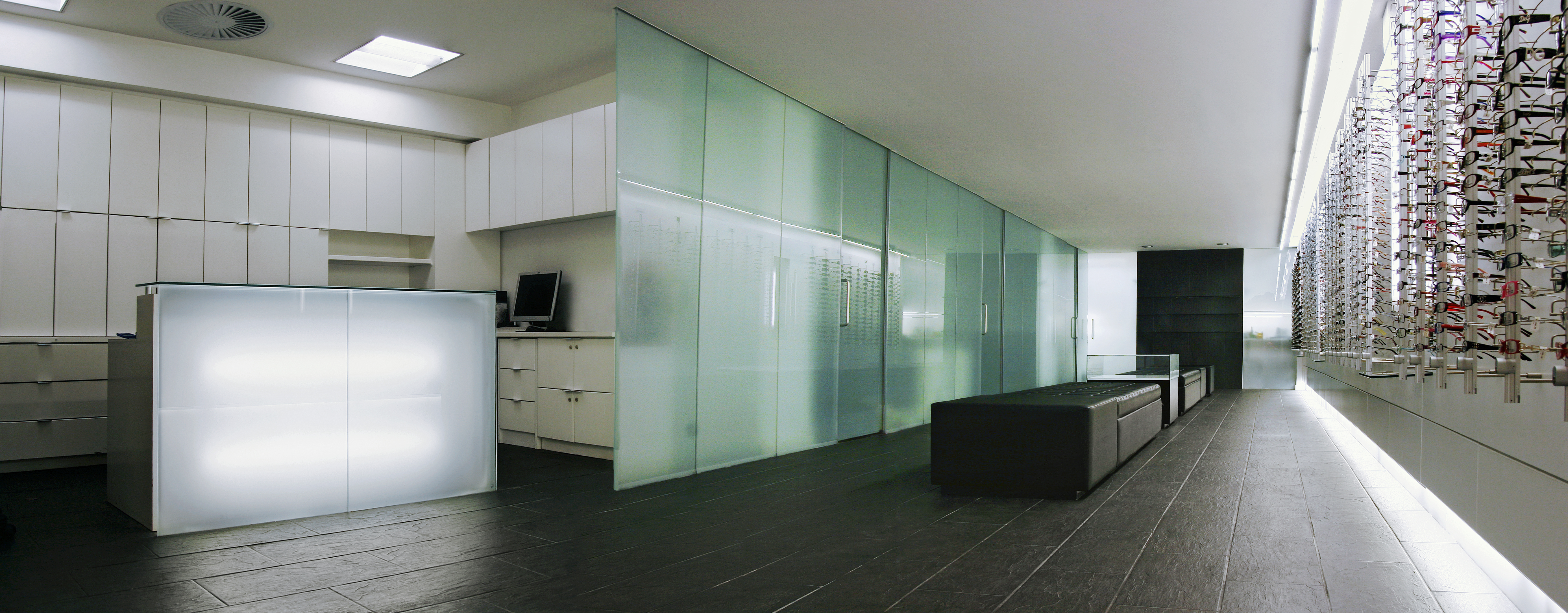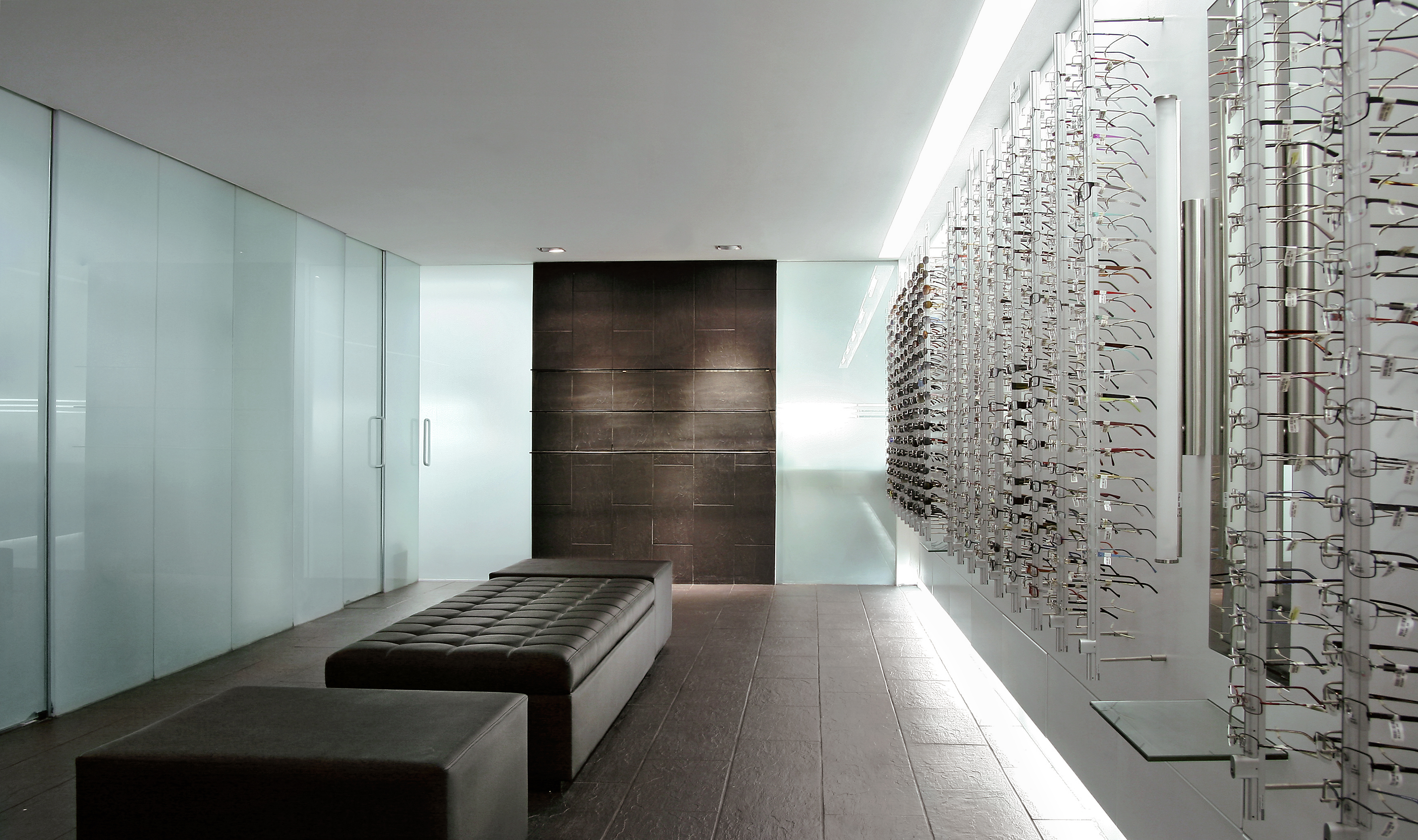 Clear glass storefronts with optical charts are the exterior logo which frame the interior. Black slate floors run inside and wrap the rear wall folding into shelves. Etched glass, back lit, encloses the exam rooms. Grey creates a neutral stage for frames, hung on floating white walls, to present themselves to buyers. Floating benches rest in the center.