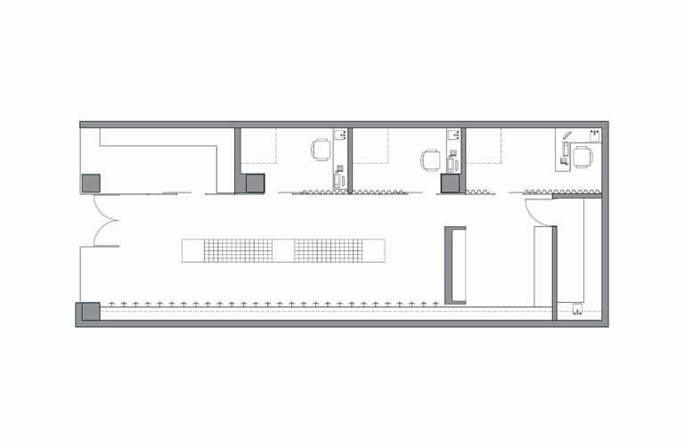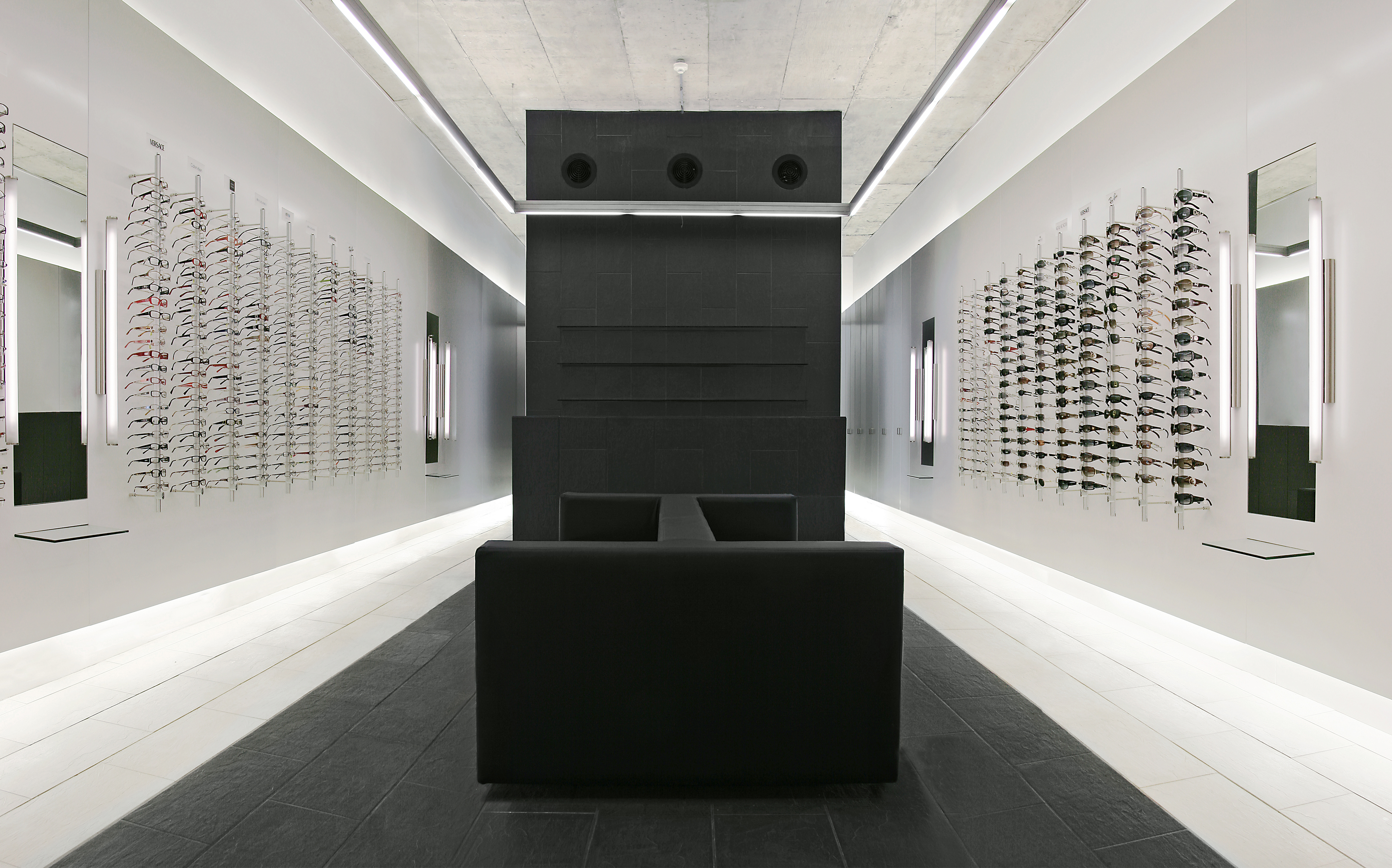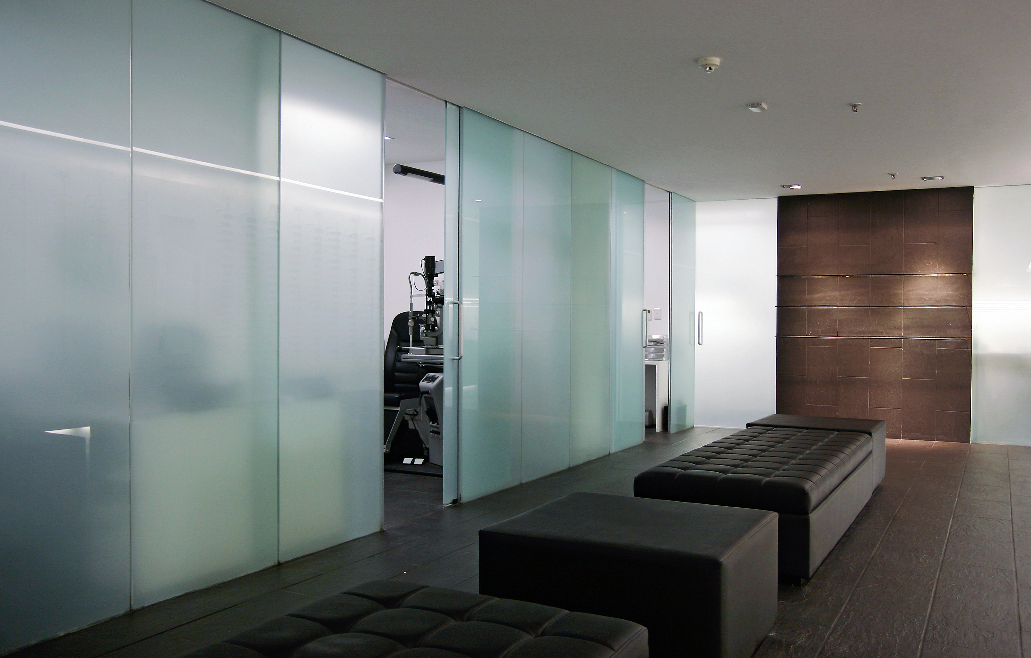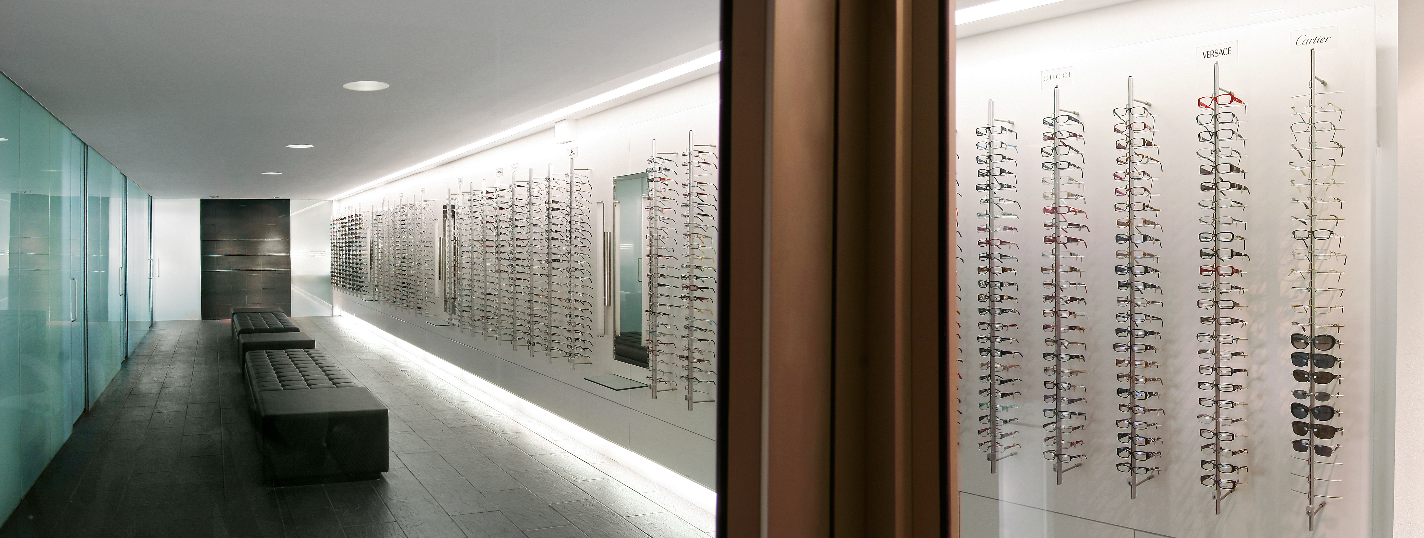 Clear glass storefronts with optical charts are the exterior logo which frame the interior. Black slate floors run inside and wrap the rear wall folding into shelves. Etched glass, back lit, encloses the exam rooms. Grey creates a neutral stage for frames, hung on floating white walls, to present themselves to buyers. Floating benches rest in the center.