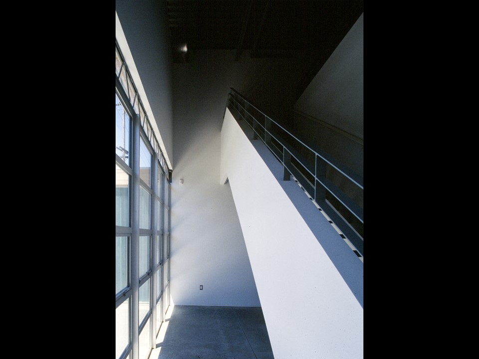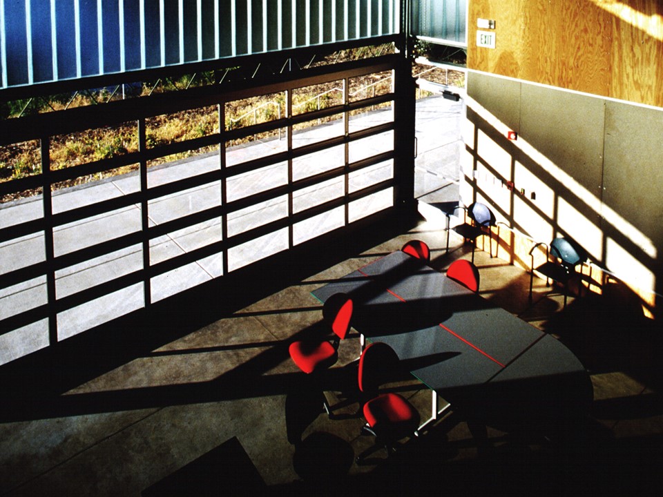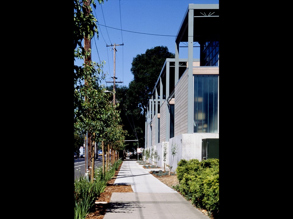 The campus has two distinct faces. The Third Street buildings, which are opposite a residential neighborhood to the south, are articulated in widths of twenty-five feet to echo the scale of the houses; overhangs protect high glazing. On the north, facing the river, the buildings are mostly glass to gather light and access the view. The new main entrance to the campus is on Dewoody Street, which has been closed to form a central court.