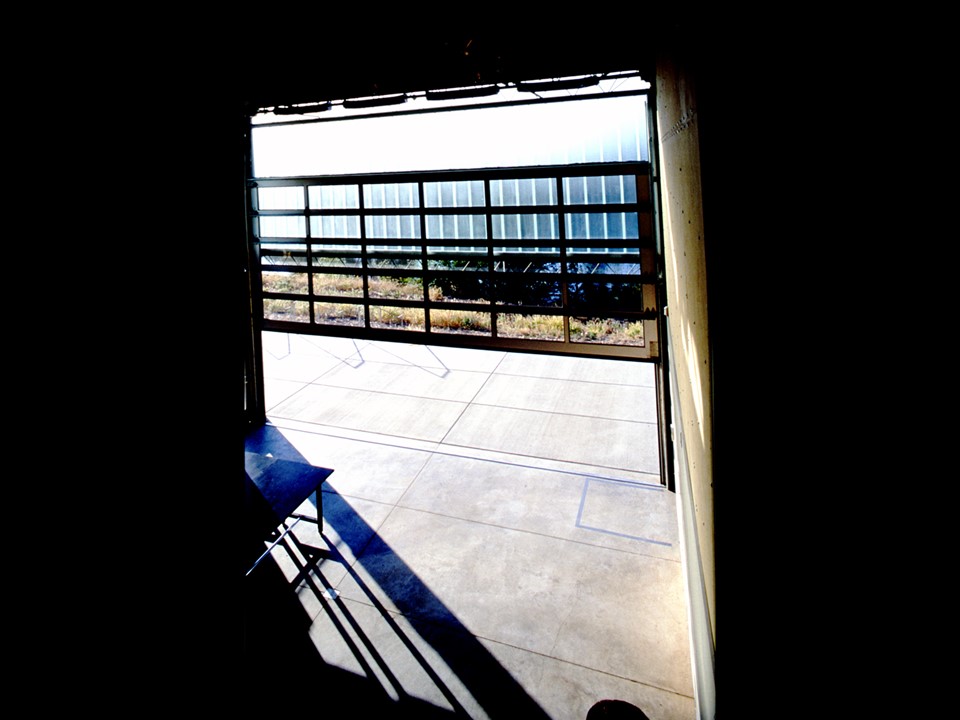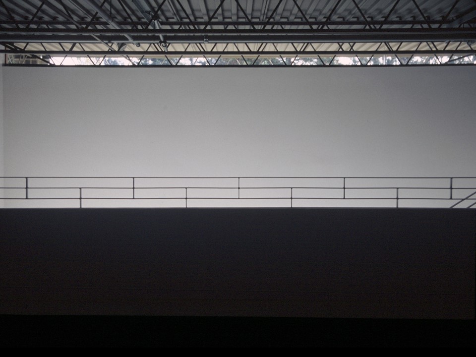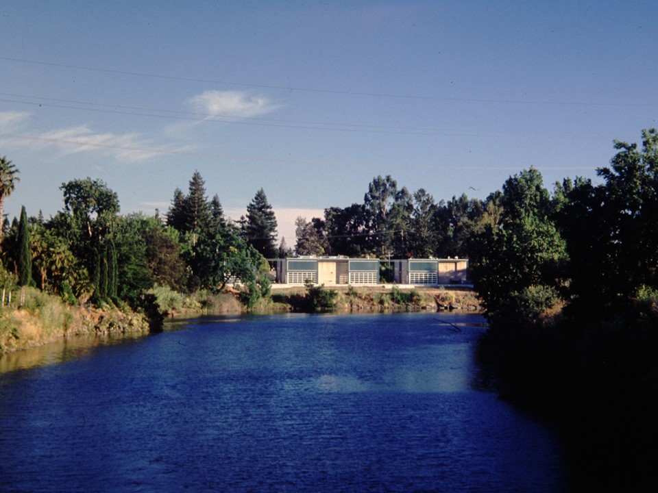 These buildings are painted “Oxbow campus” green. New buildings—two new faculty houses added to the dormitories on Third Street as well as larger-scale facilities, such as studios and the multipurpose/dining hall—cohere the campus plan. The new structures are standardized sheds, flexible lofts with high ceilings and copious glazing of translucent channel glass or full-width roll-up glass doors, which at the push of a button dissolve the interiors into the landscape. The campus is structured by vegetation. Between the studio buildings are outdoor teaching courts, accessed by roll-up doors and shaded by trees. A series of terraces connects the buildings to the river; at the bend in the river, the terraces become an outdoor amphitheater.