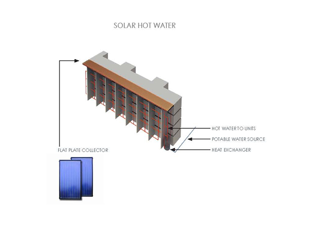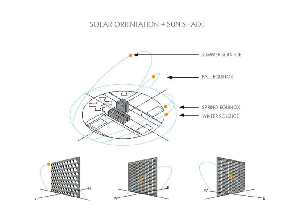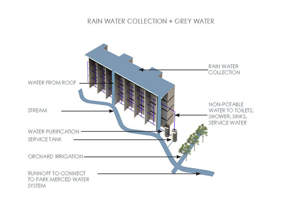 Numerous other green aspects are embodied in design: solar heated water is harvested from the roofs, rainwater collected and used to maintain green walls of the atria, and a system of solar bracelets which wrap the glazing and optimize solar orientation throughout the year, shading in the summer and allowing penetration in the winter.
