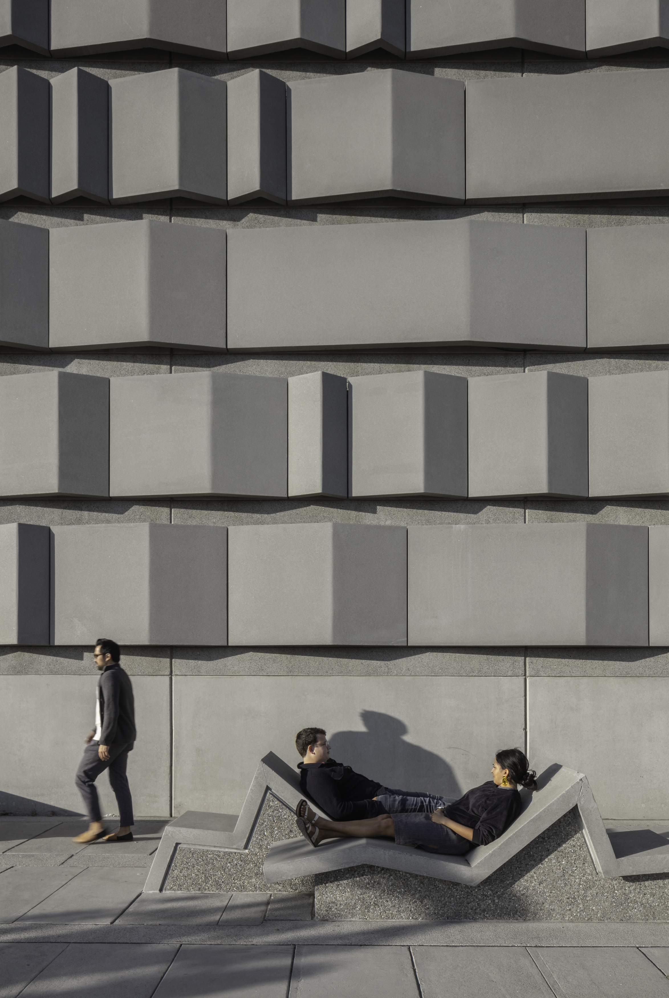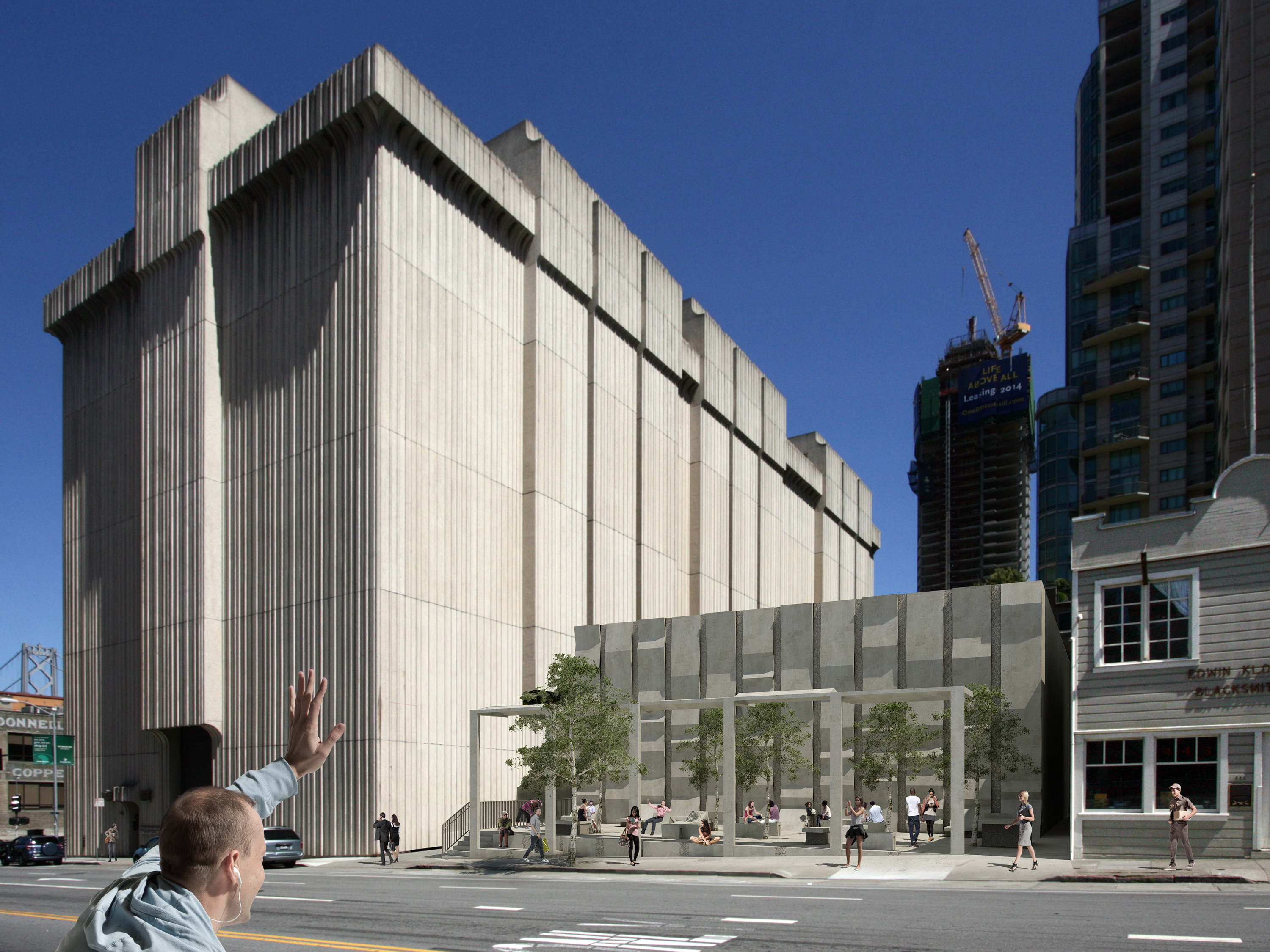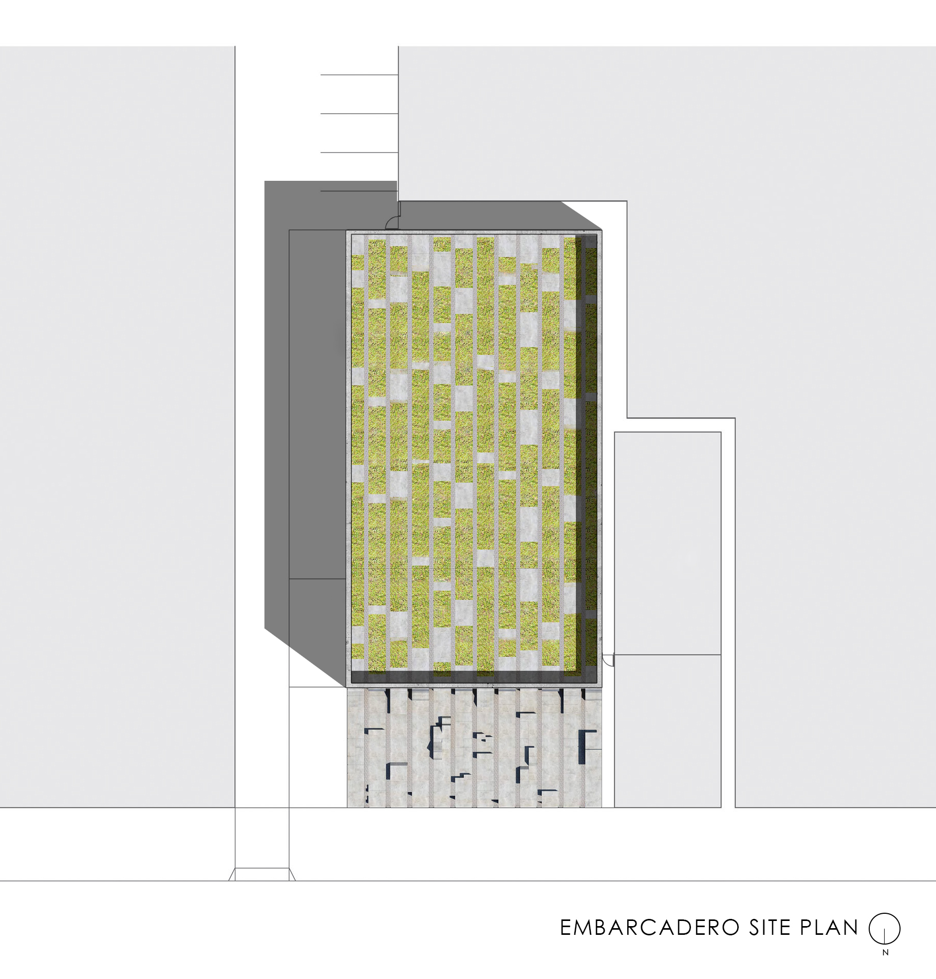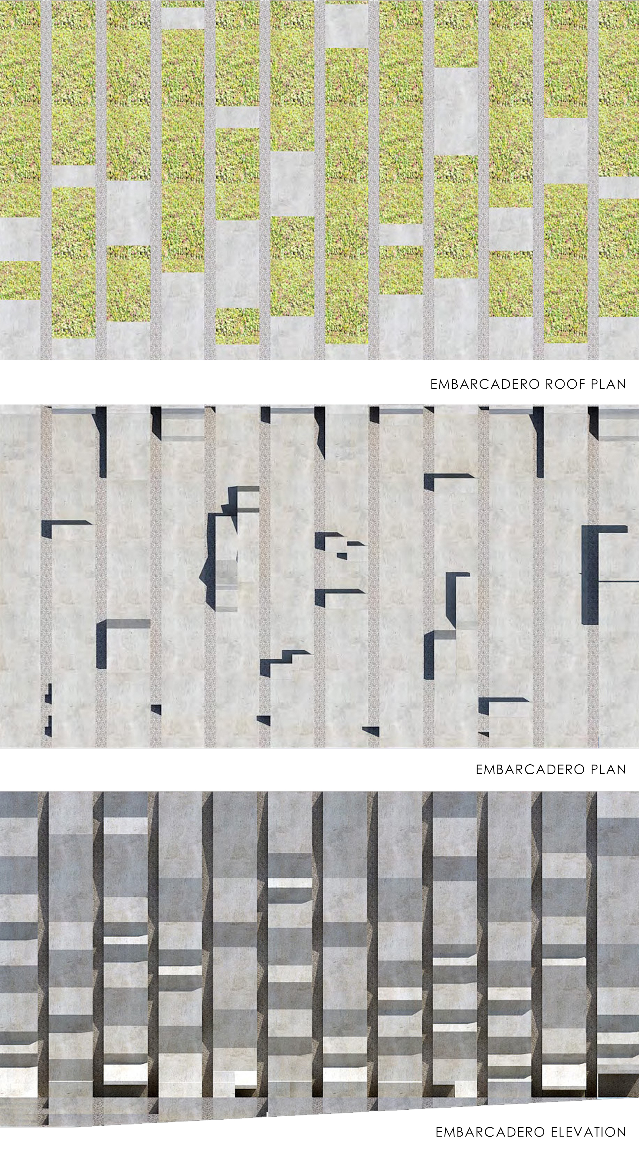 At the Embarcadero, in the midst of tall vertical structures, the bands are arrayed vertically; at the Potrero site, close to the bay and more linear forms, the bands are arrayed horizontally. These bands continue onto the ground plane to become projecting surfaces on the plazas, extruding as seating and pedestals to encourage occupation. Interspersed among these linear habitable elements are trees for shade. Roof awnings mark the street edges. These plazas are free spaces for use by the public.