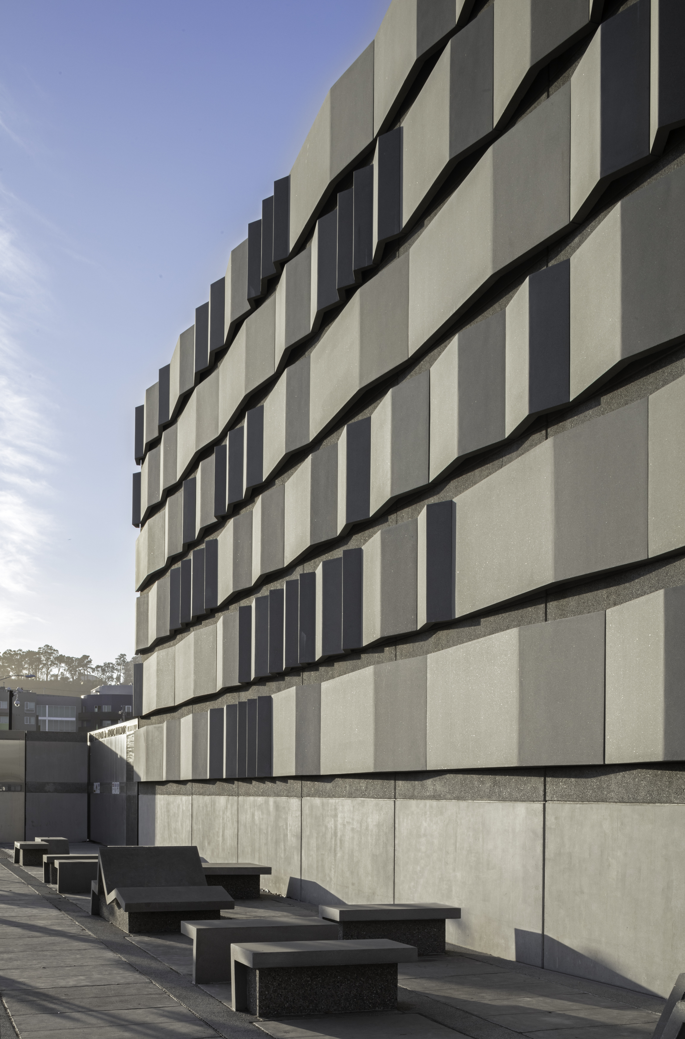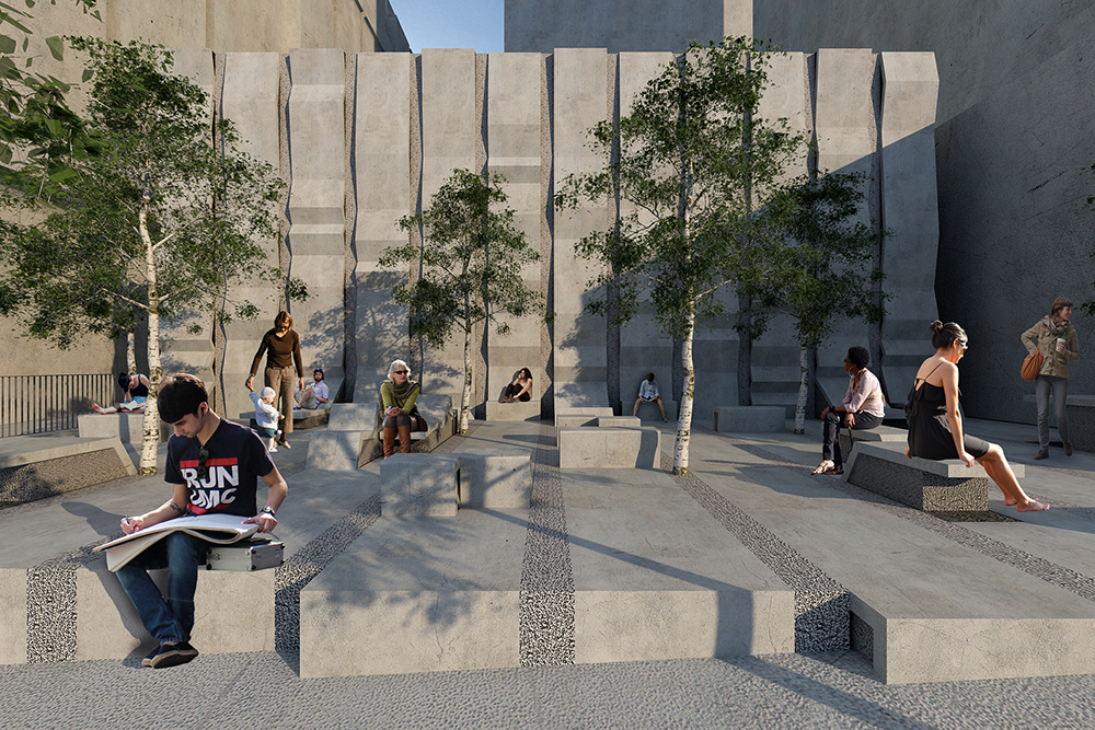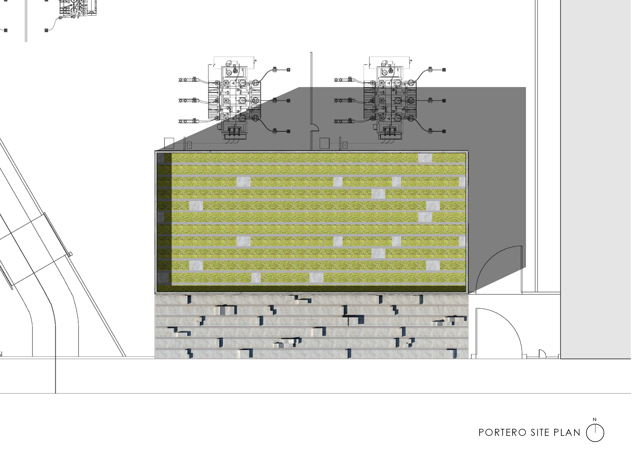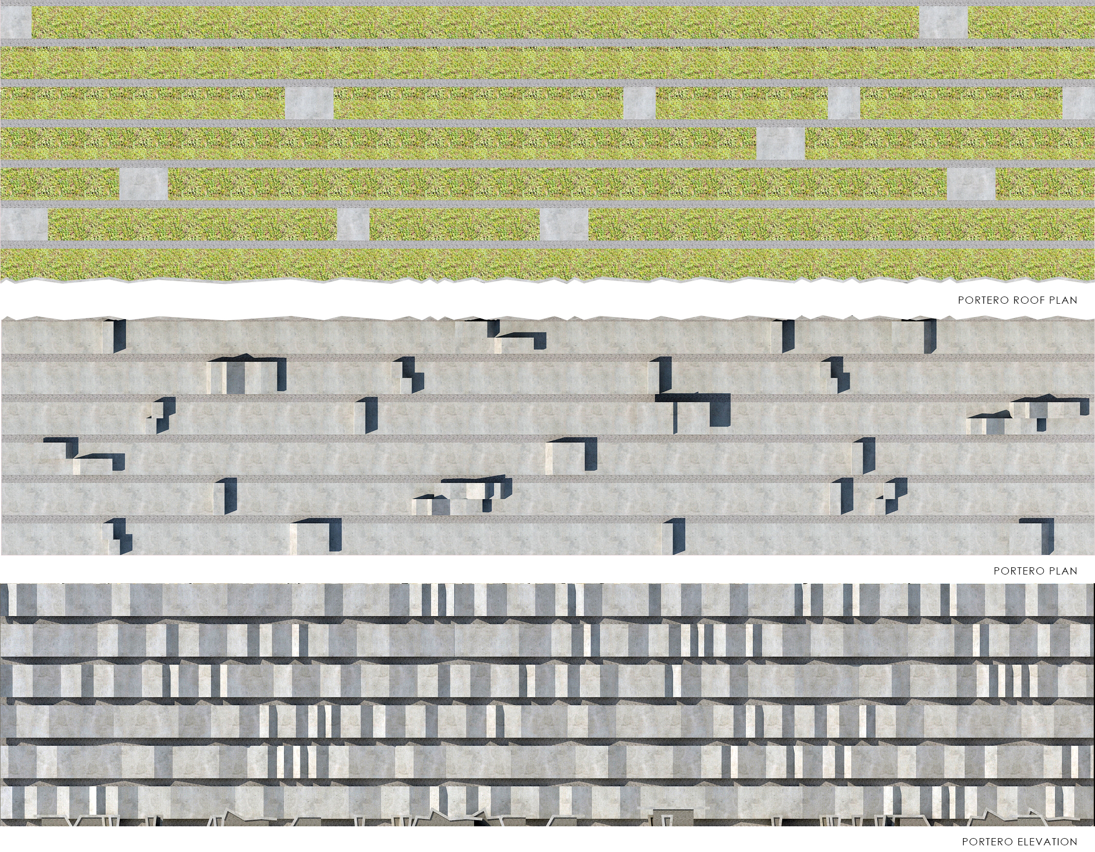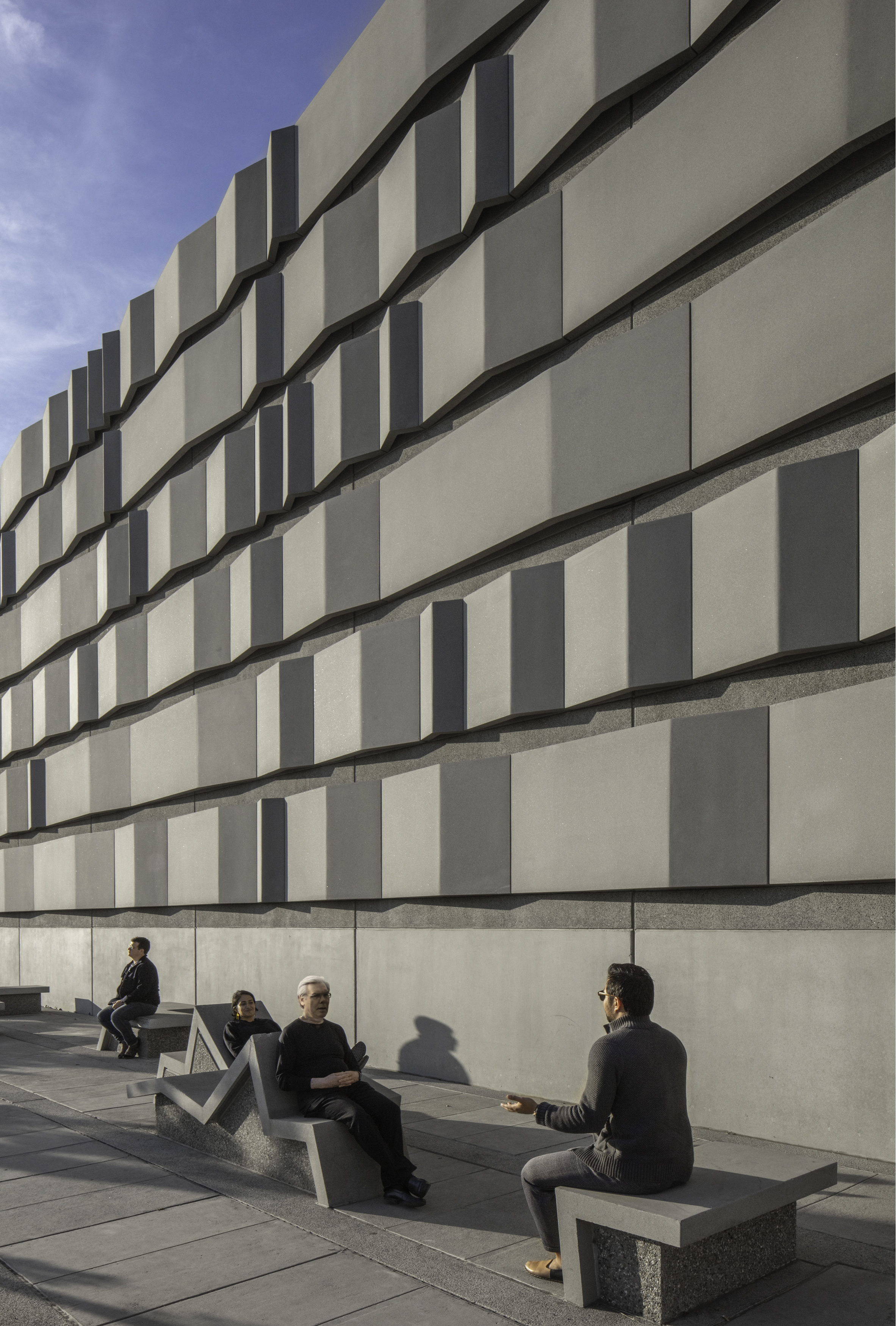 At the Embarcadero, in the midst of tall vertical structures, the bands are arrayed vertically; at the Potrero site, close to the bay and more linear forms, the bands are arrayed horizontally. These bands continue onto the ground plane to become projecting surfaces on the plazas, extruding as seating and pedestals to encourage occupation. Interspersed among these linear habitable elements are trees for shade. Roof awnings mark the street edges. These plazas are free spaces for use by the public.