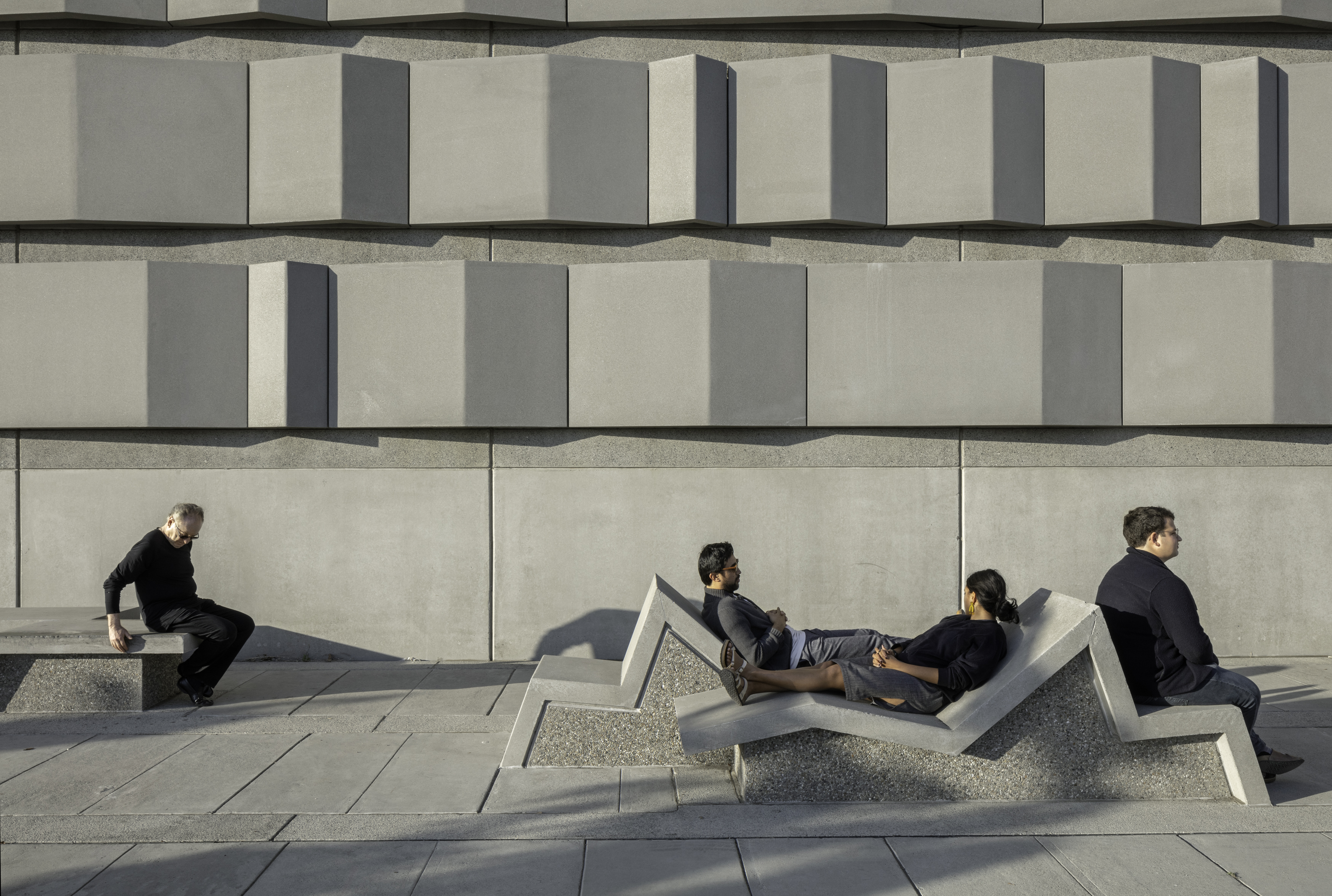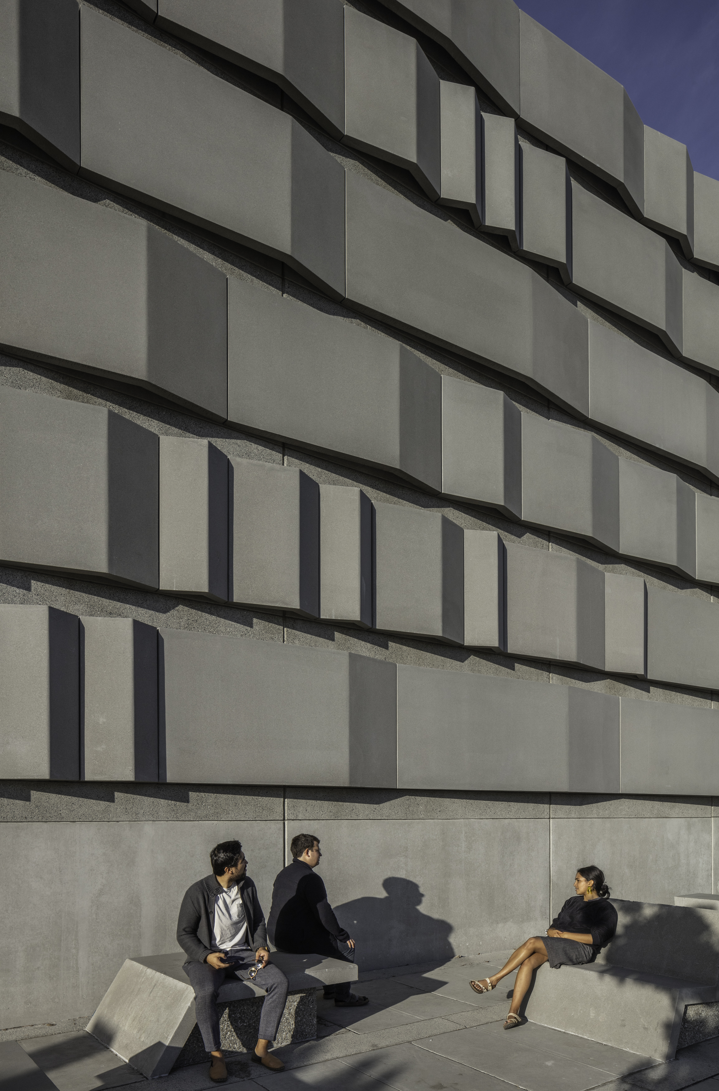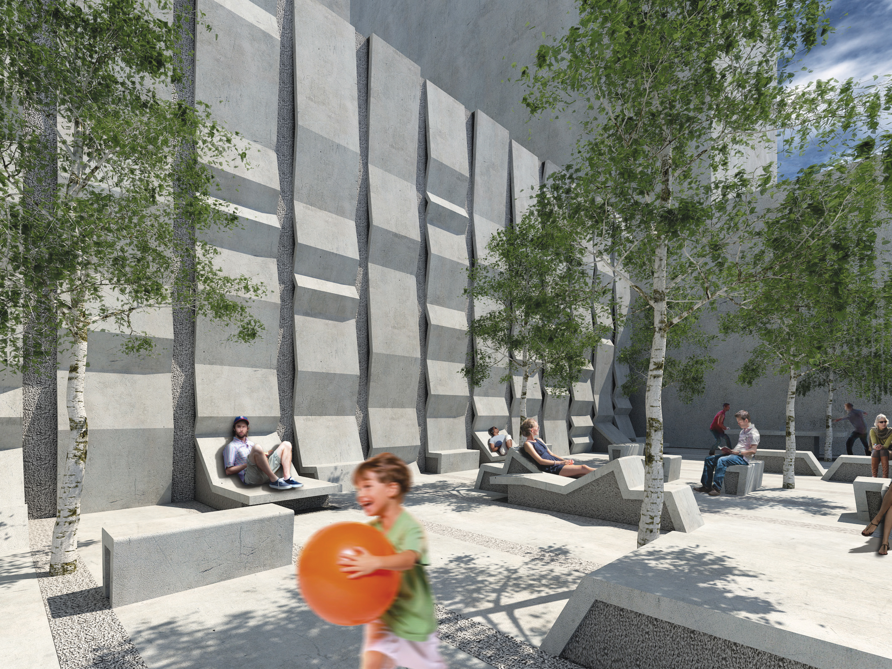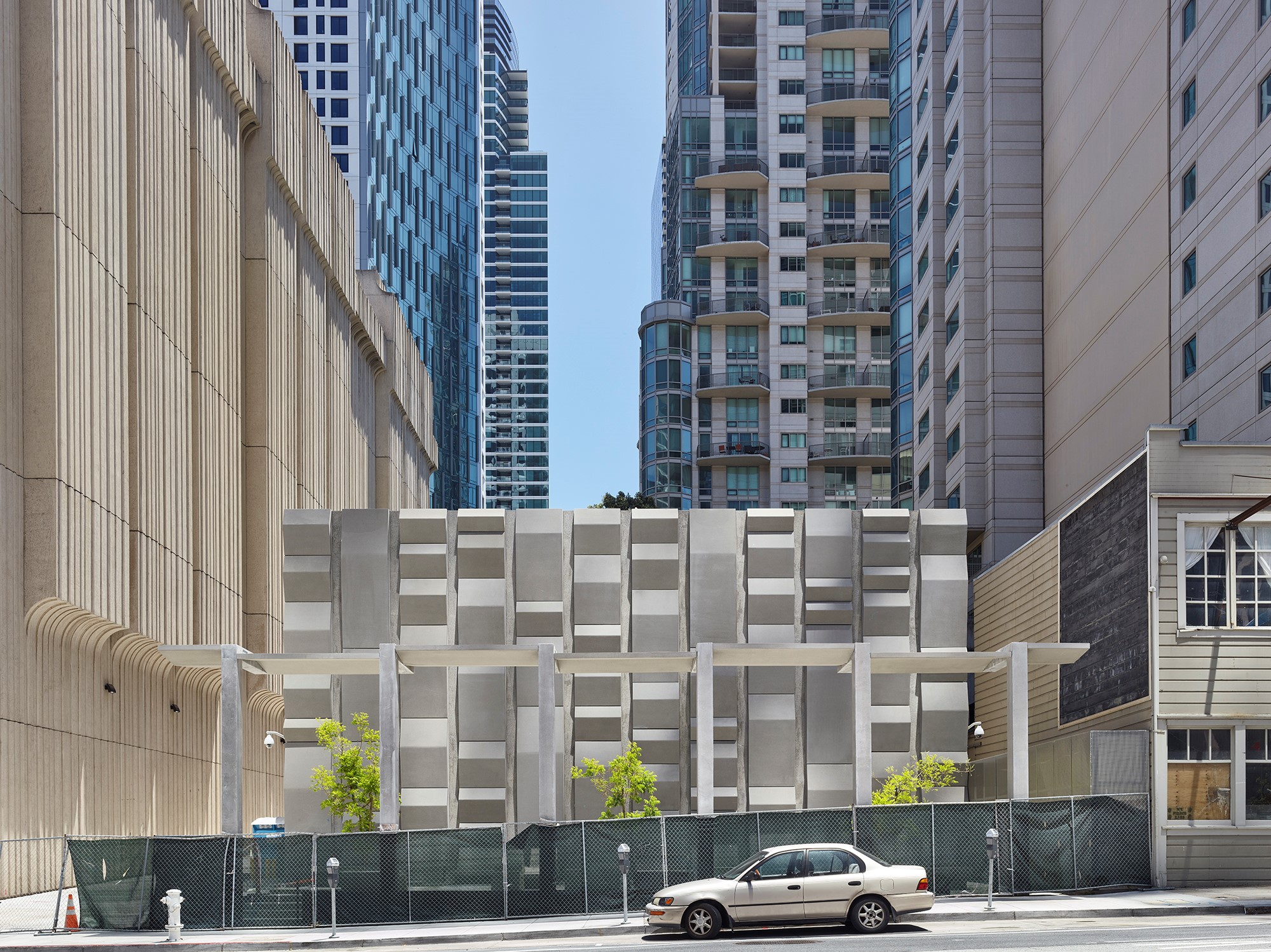 At the Embarcadero, in the midst of tall vertical structures, the bands are arrayed vertically; at the Potrero site, close to the bay and more linear forms, the bands are arrayed horizontally. These bands continue onto the ground plane to become projecting surfaces on the plazas, extruding as seating and pedestals to encourage occupation. Interspersed among these linear habitable elements are trees for shade. Roof awnings mark the street edges. These plazas are free spaces for use by the public.
