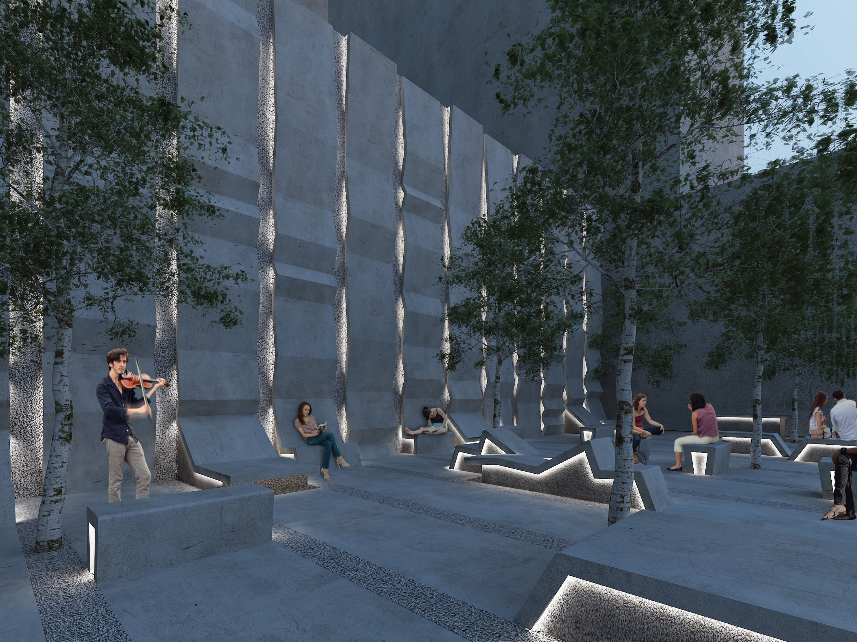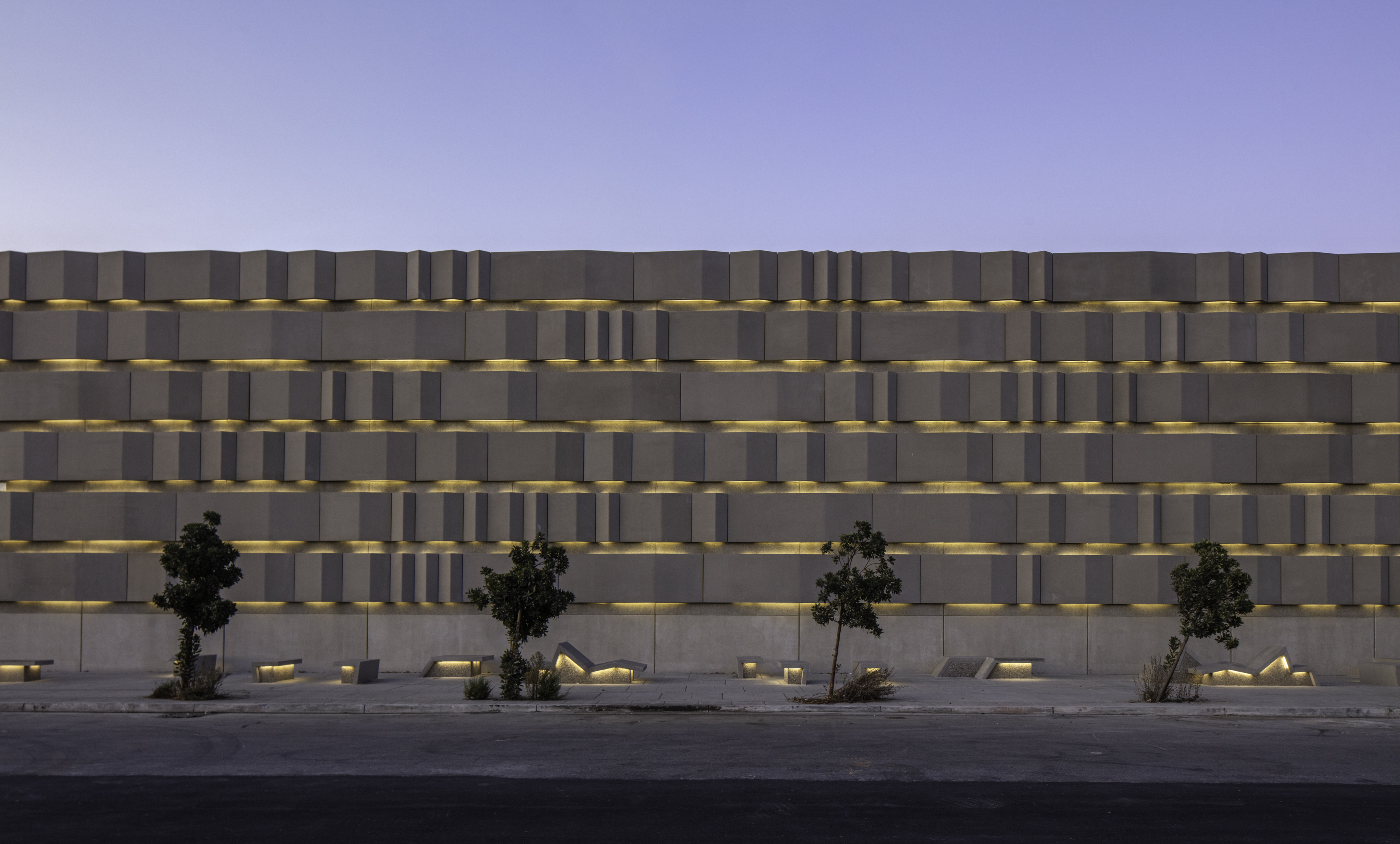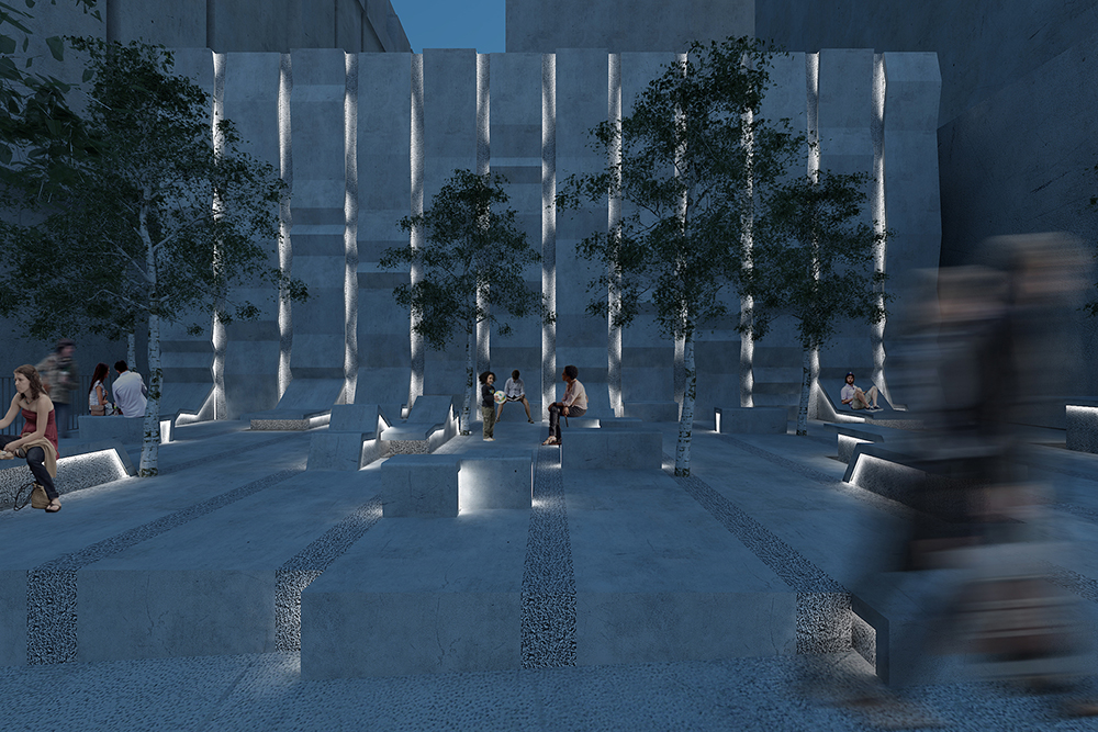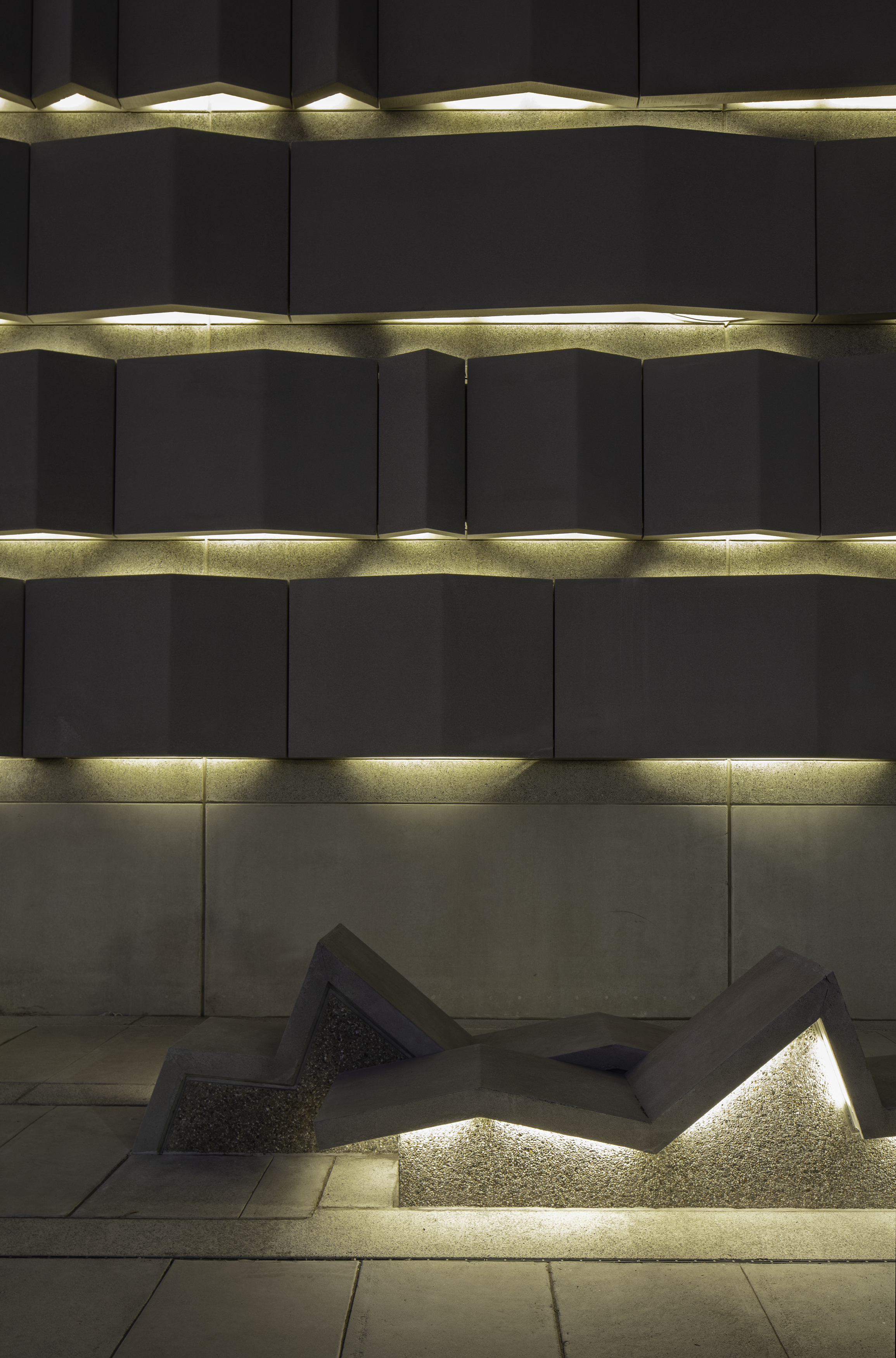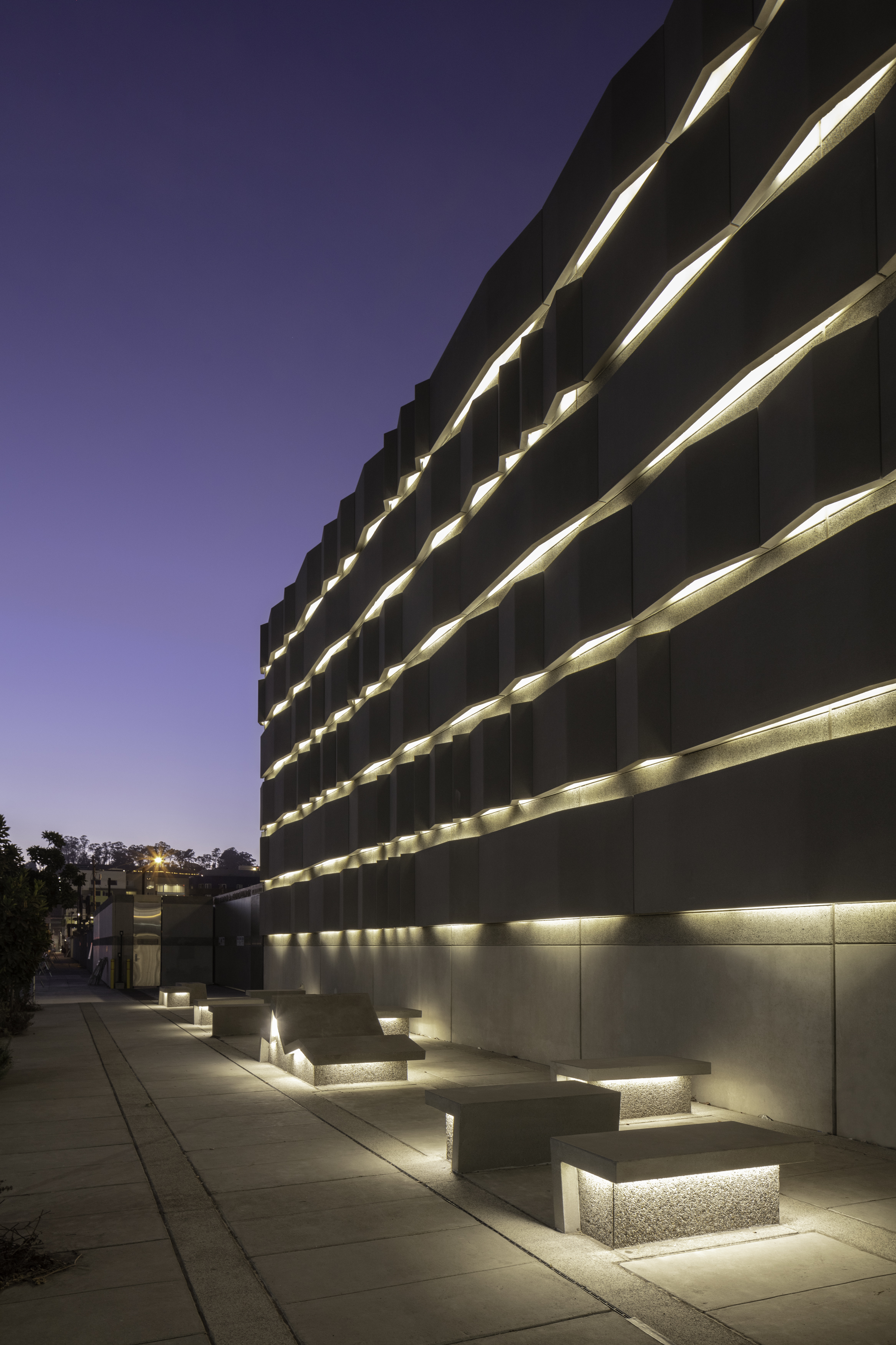 Recessed between the rippling concrete bands, led lights illuminate the walls and ground planes. The color of this lighting can vary with the seasons, and be used for events and celebrations. At the Embarcadero site, led lighting is added to the existing substation building to connect with the new plaza/façade.