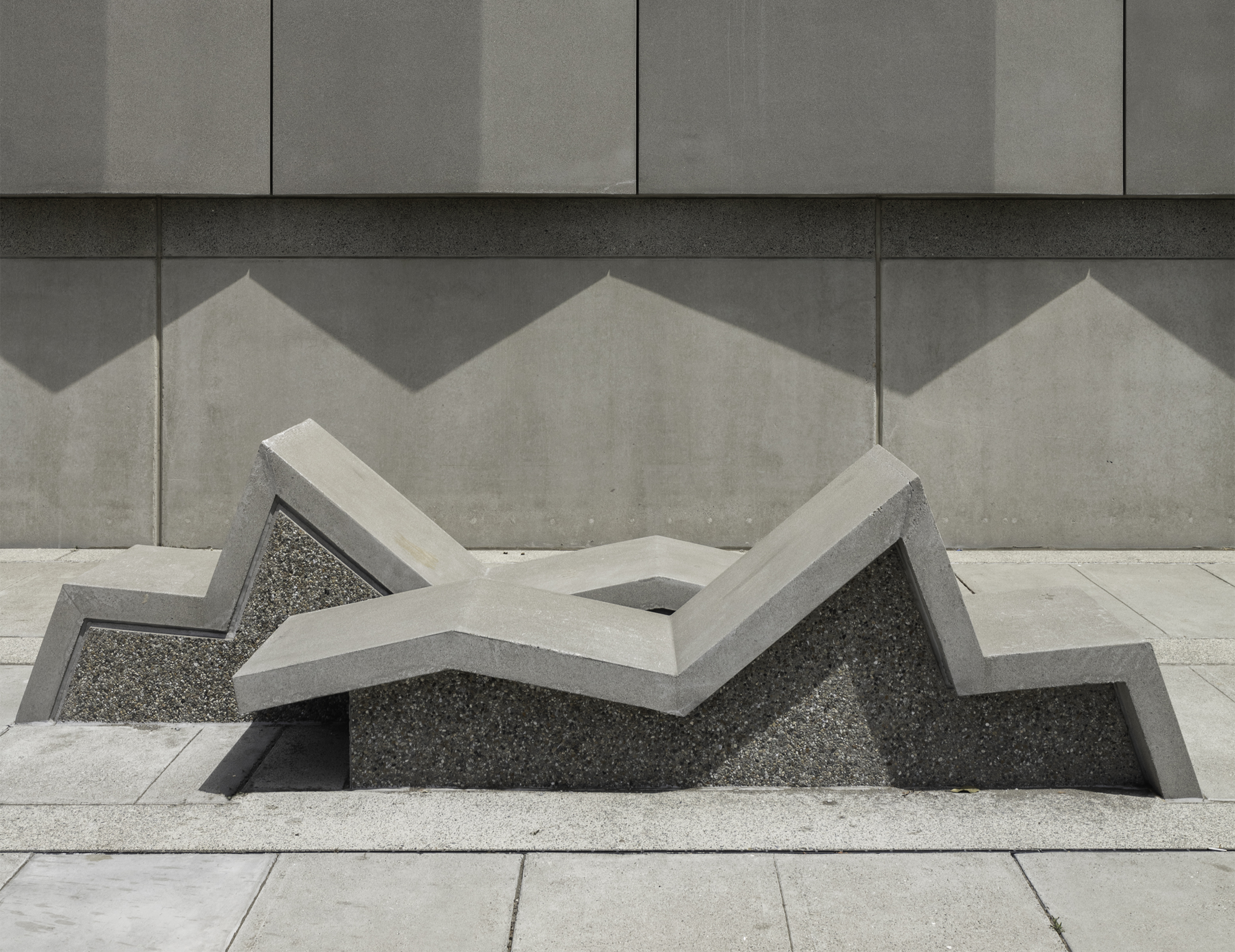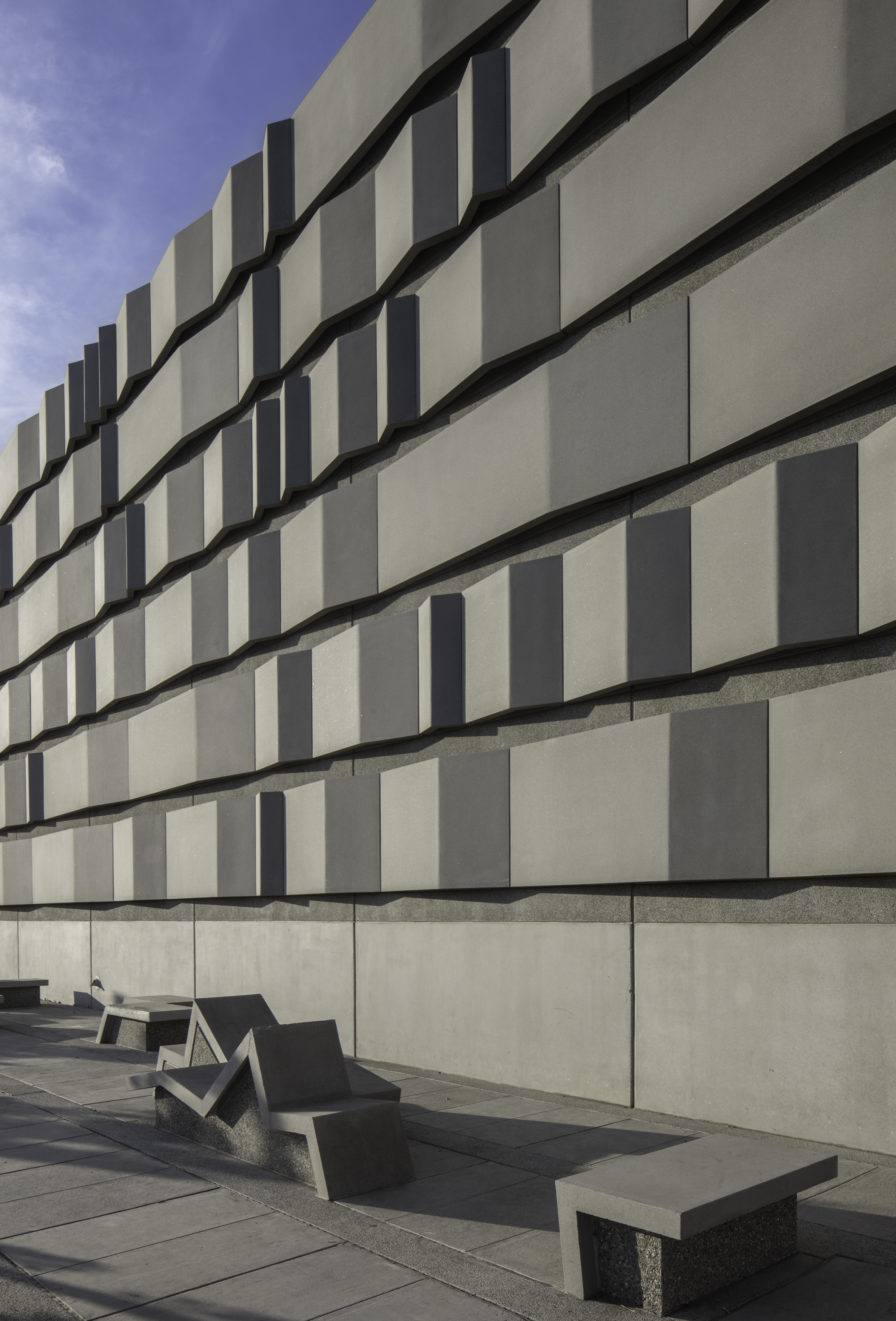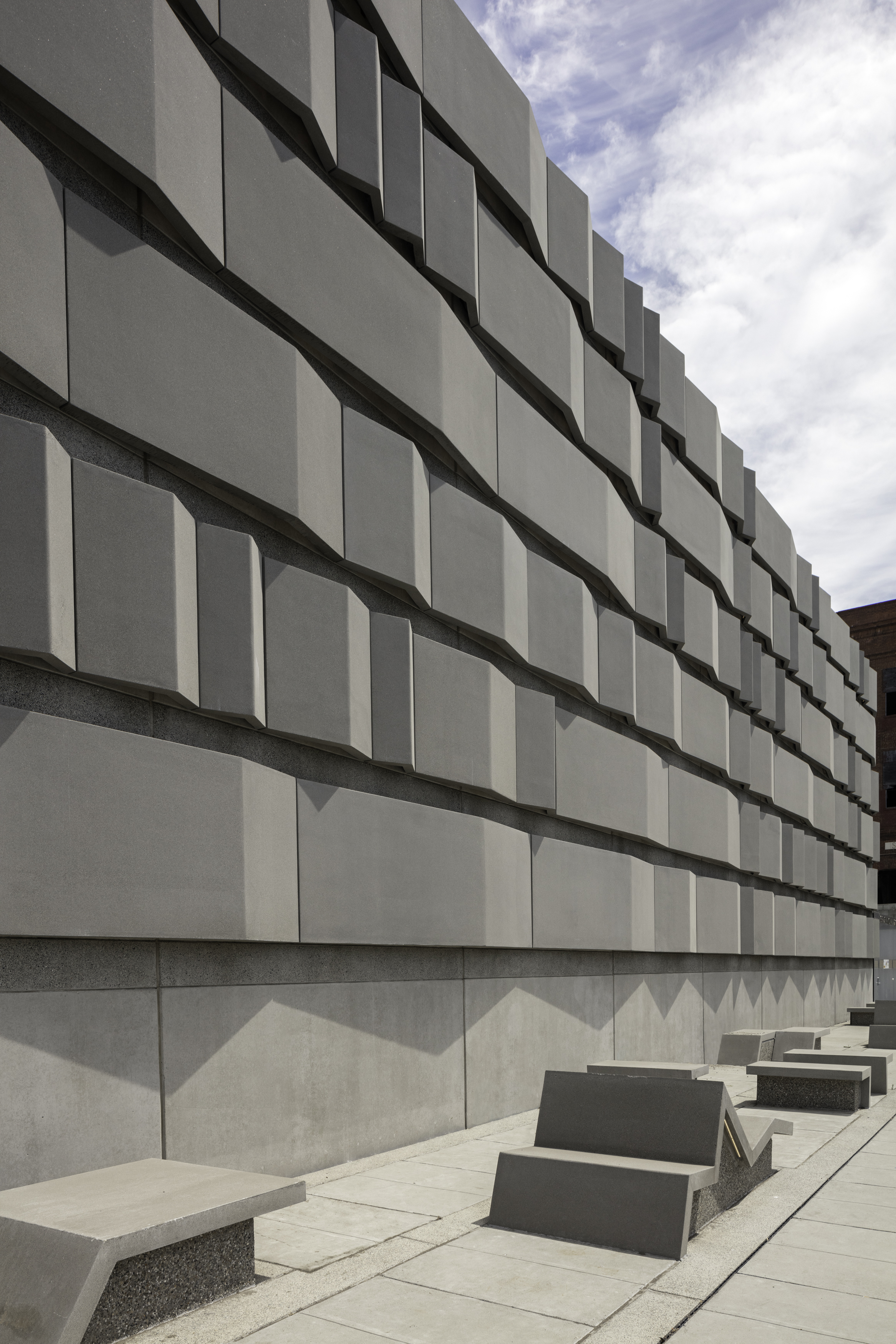 The new substations are compact compared to earlier buildings, with 30’ height. These 30’ tall and 30’ wide public surfaces are elaborated with a series of 4’ wide concrete bands added to the facades. These bands are composed of five different profiles which combine to form 20 derivations which elaborate the vertical surfaces and continue onto the ground plane to become furniture.