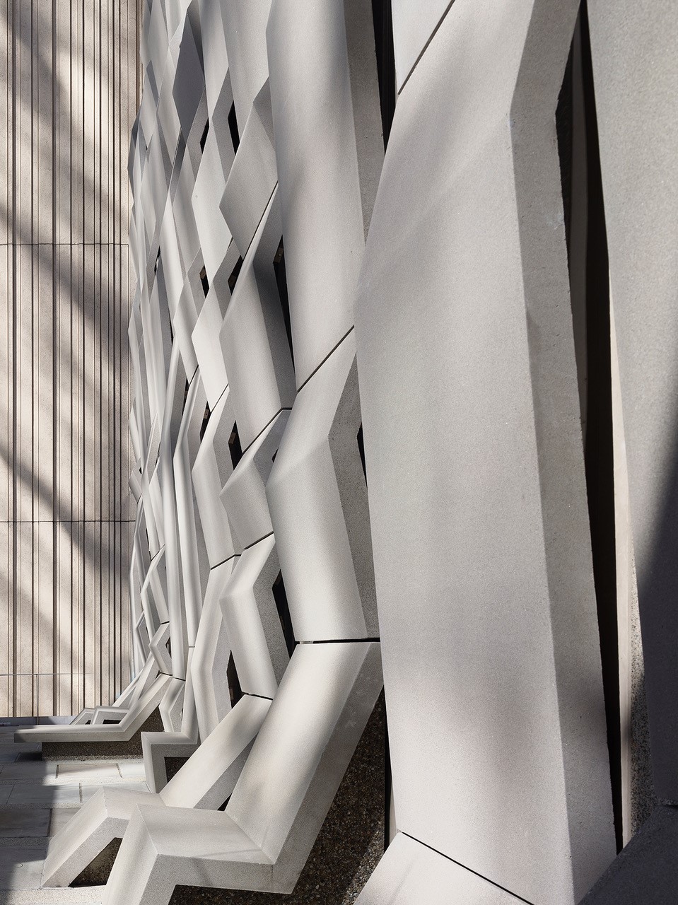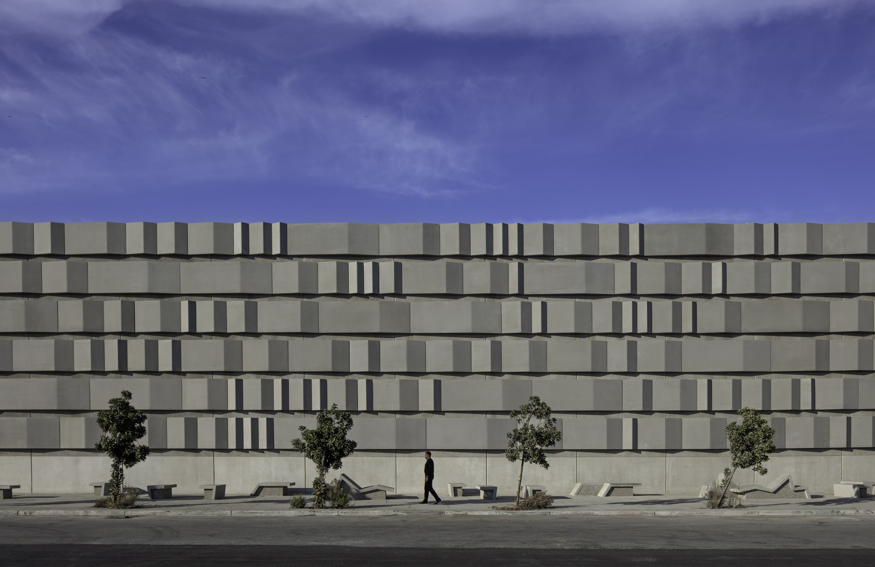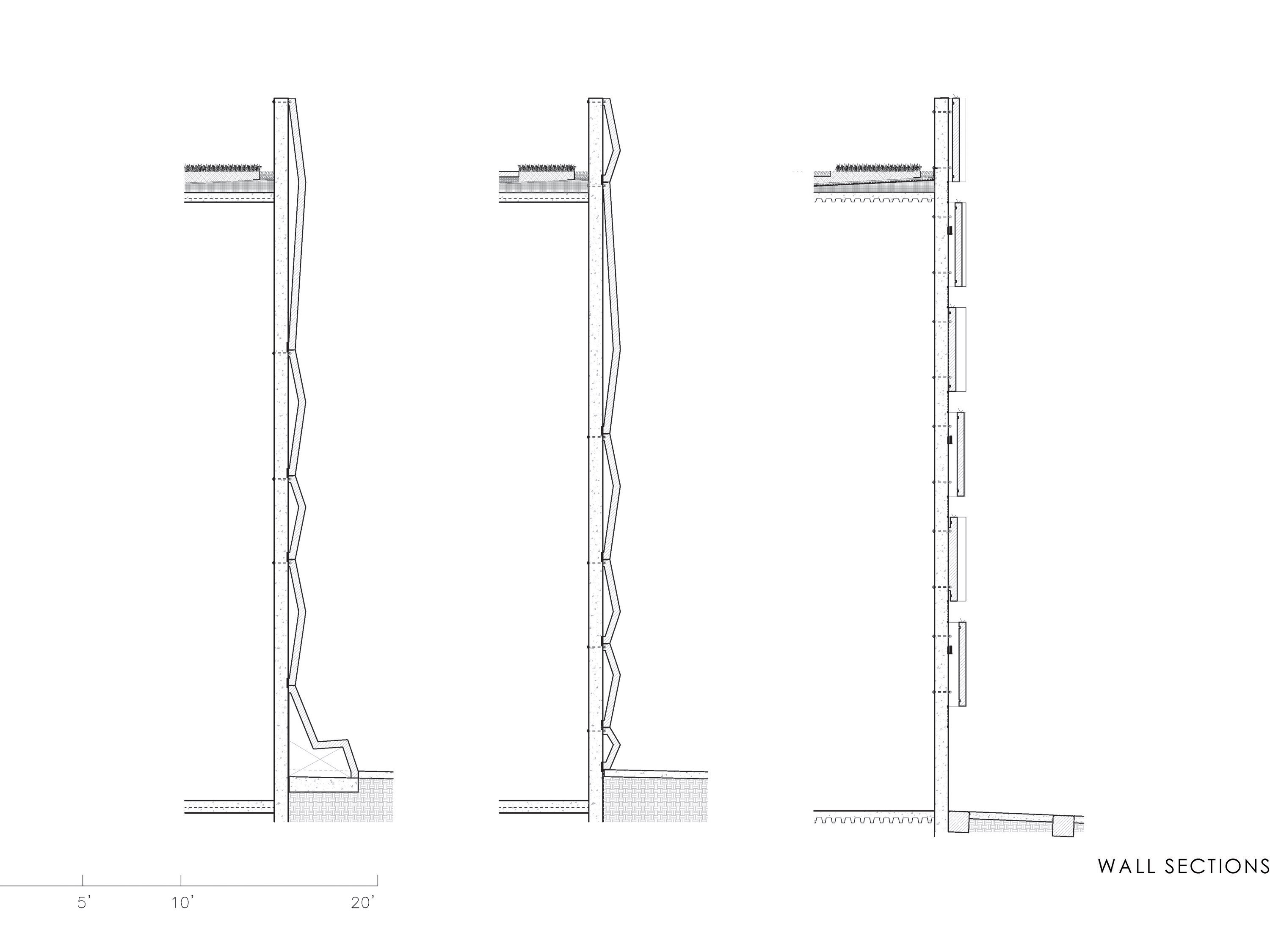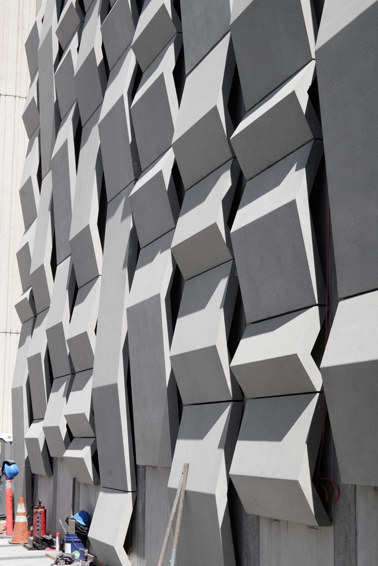 The new substations are compact compared to earlier buildings, with 30’ height. These 30’ tall and 30’ wide public surfaces are elaborated with a series of 4’ wide concrete bands added to the facades. These bands are composed of five different profiles which combine to form 20 derivations which elaborate the vertical surfaces and continue onto the ground plane to become furniture.