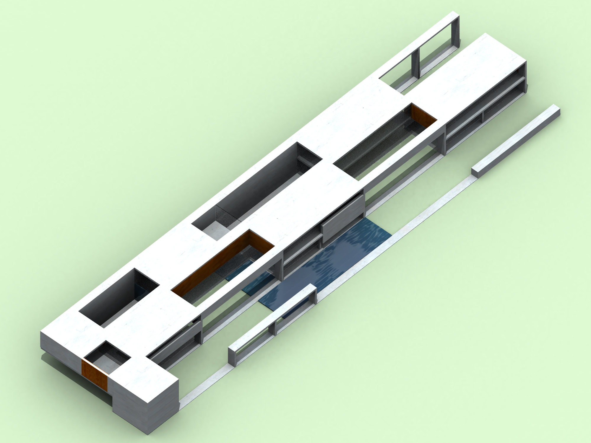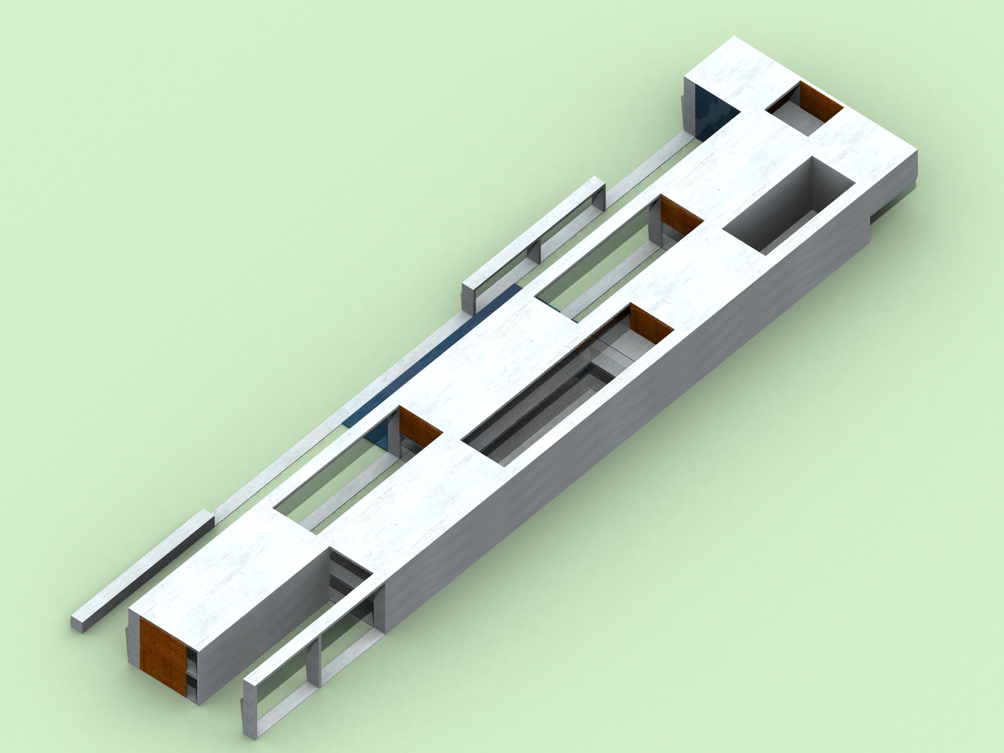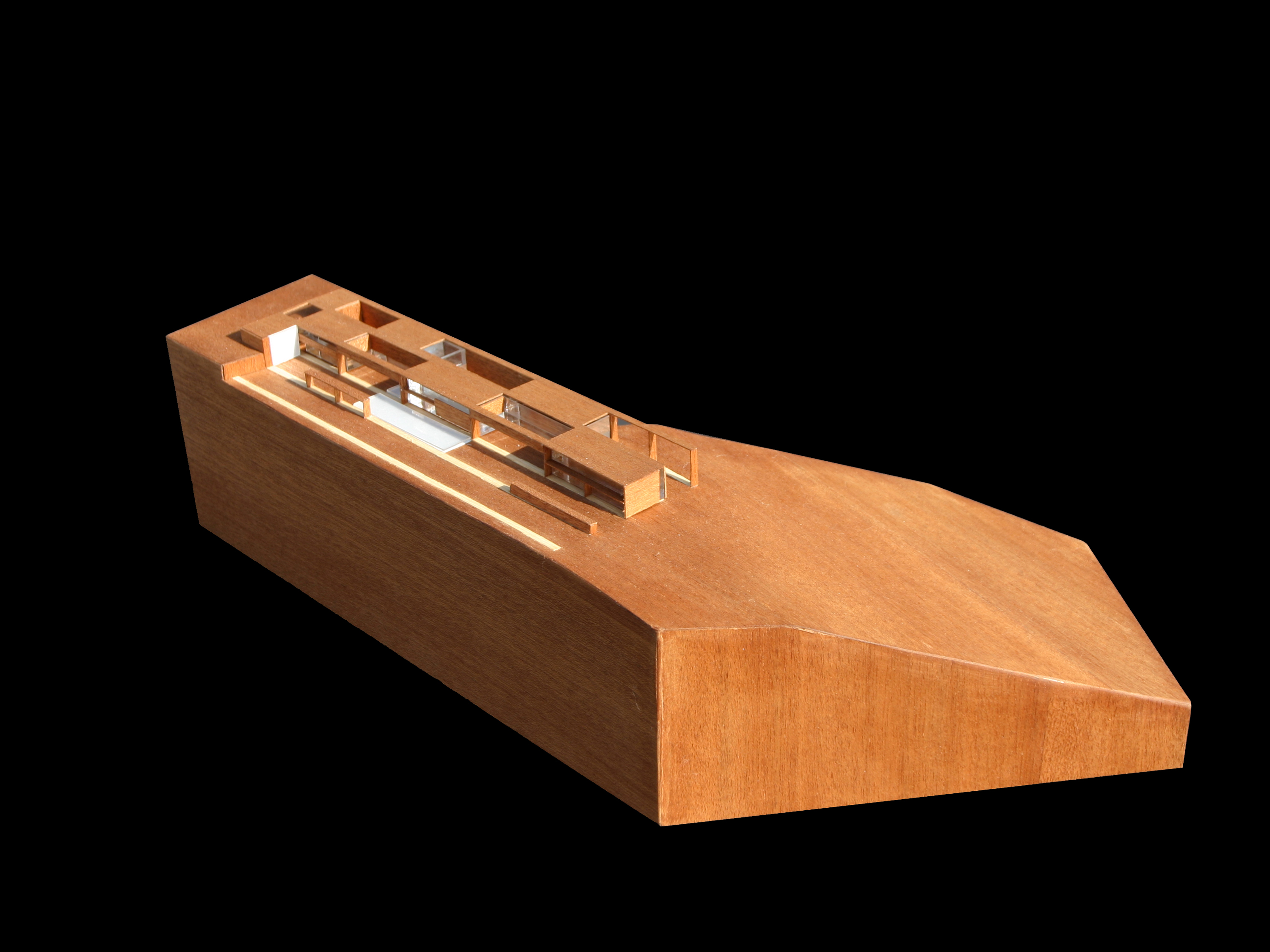The house follows the long narrow site, which opens to the south and offers distant views of the San Diego skyline. The plan consists of two linear volumes with alternating voids, forming a double, dotted bar house. The traditional Southern California courtyard house, unfolded, is the model for this series of linked interior/exterior/interior spaces. In a climate in which garden is as habitable as interior, these courts expand the dimensions for living. Each court has a unique character and function in relation to the surrounding rooms and orientation—layered into the garden and open to the sun and view on the south, enclosed and protected on the north. The double house bar is structured by two bands of concrete, each four feet wide; these concrete elements form a brise-soleil and colonnade on the south and a protective wall on the north. The entrance is an open space on the upper level. A stair attached to the fireplace leads to the formal rooms below. Alternately, a bridge connects to the upper-level bedrooms. The first court, on the north, is for utilities; the second, on the south, expands living and dining. The third court is enclosed to serve as a nursery and play area. The fourth is used for outdoor living and the pool; the last provides space for gym and karate and leads to the play and garden terraces below. The aim is to dematerialize the house, making it an invisible frame, both in the balance of open and enclosed space and through the selection of materials—glass, white concrete, and black wood.
