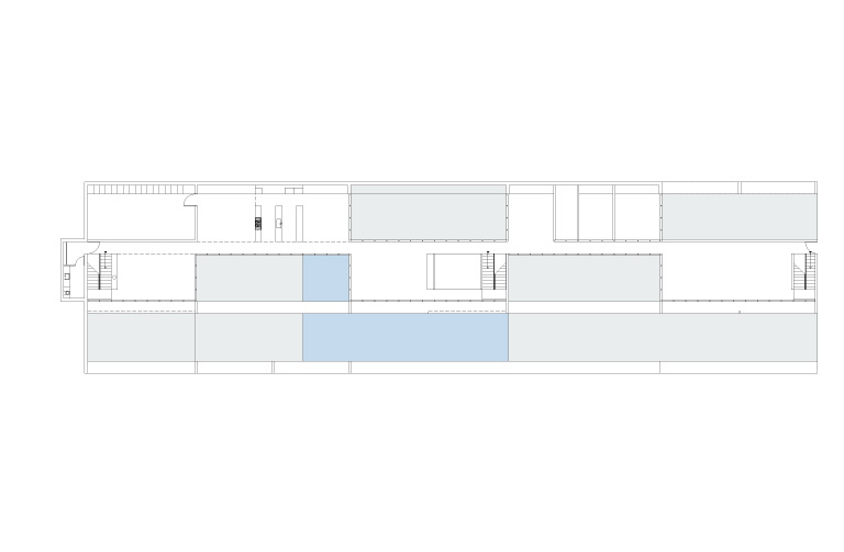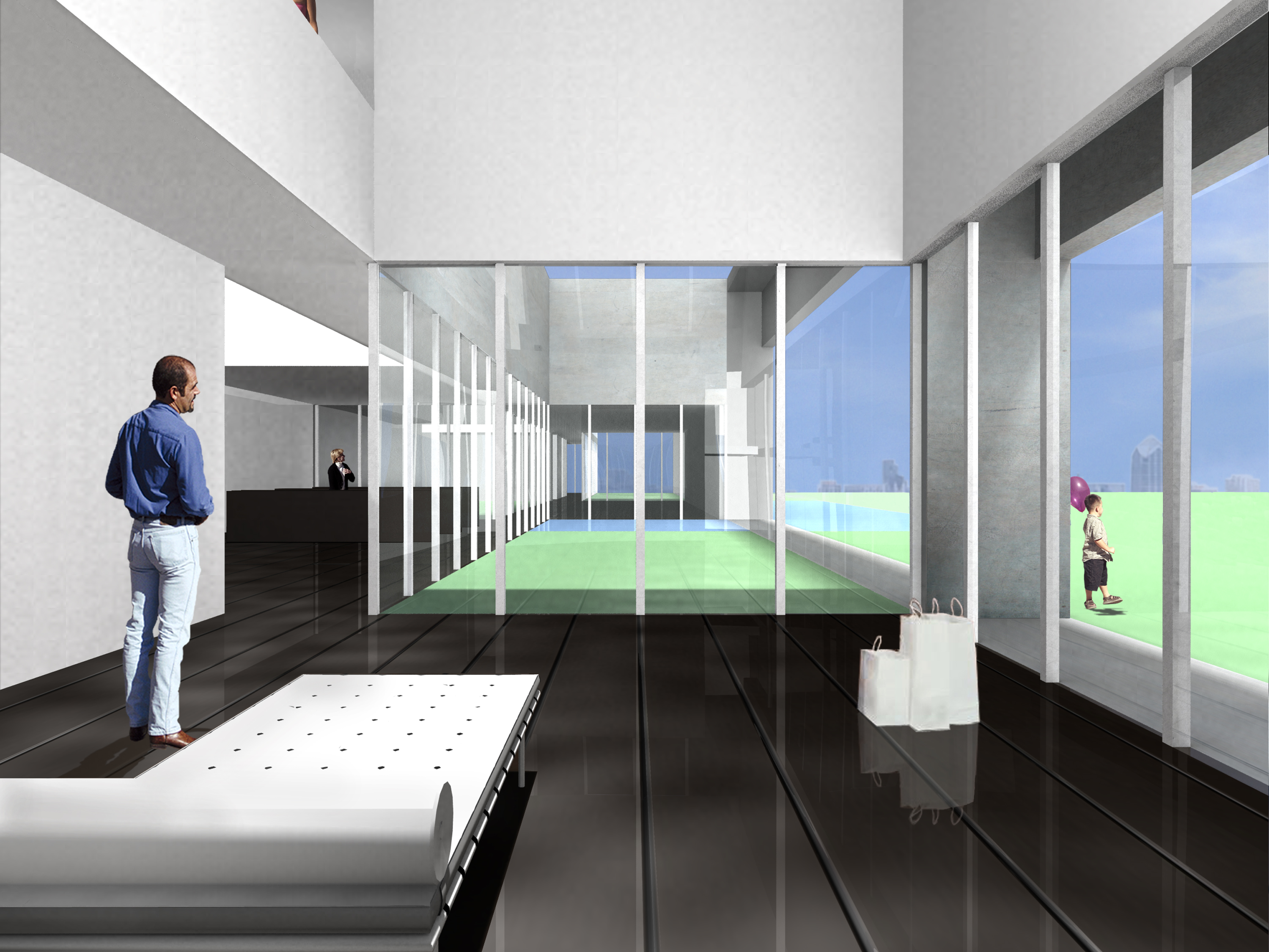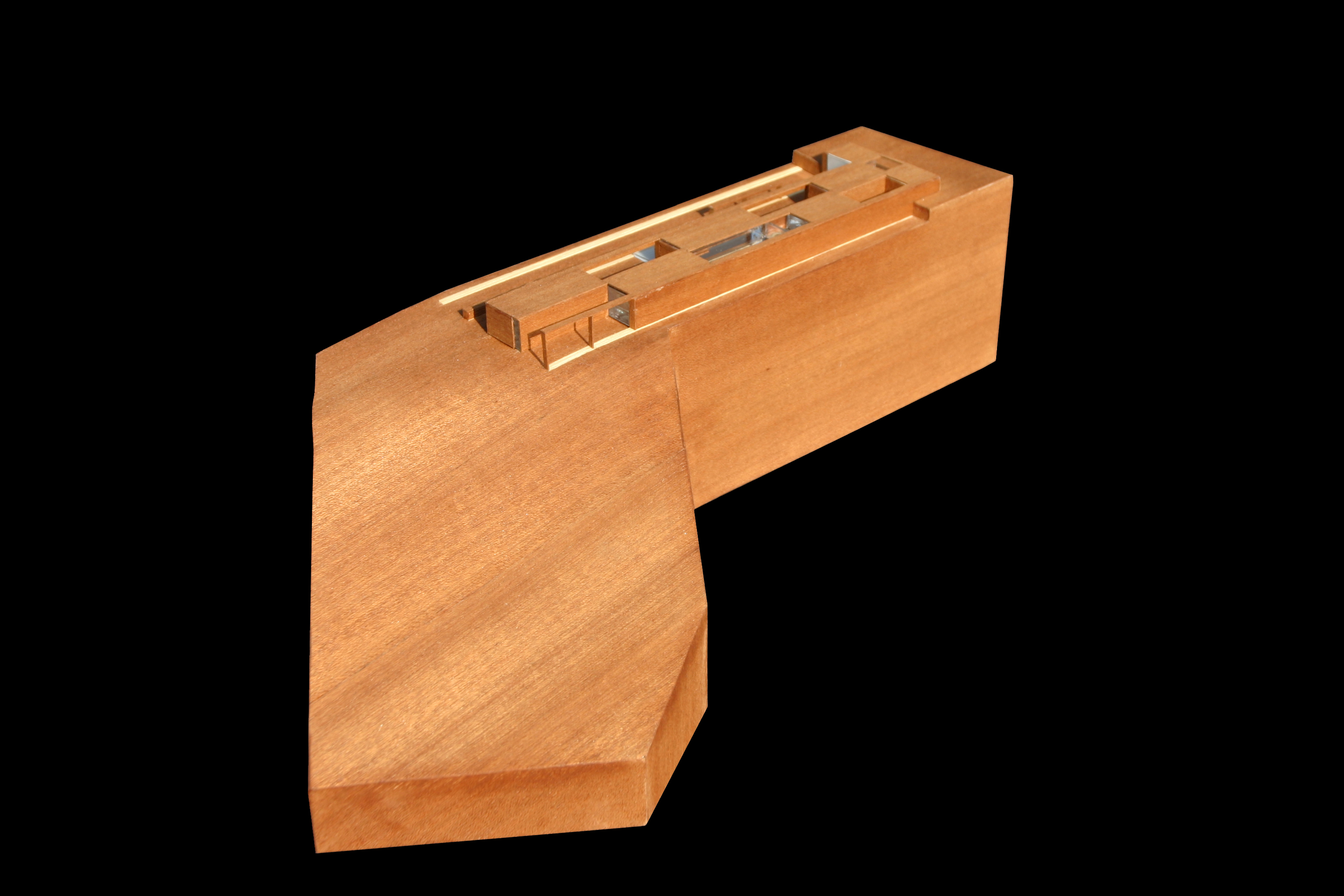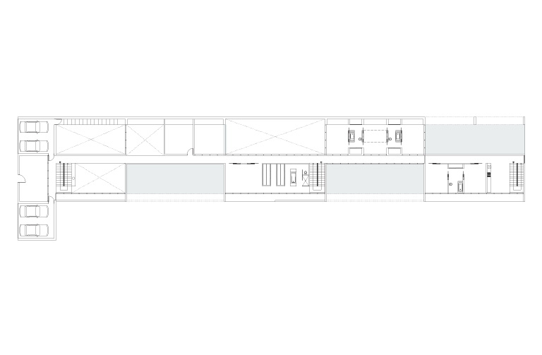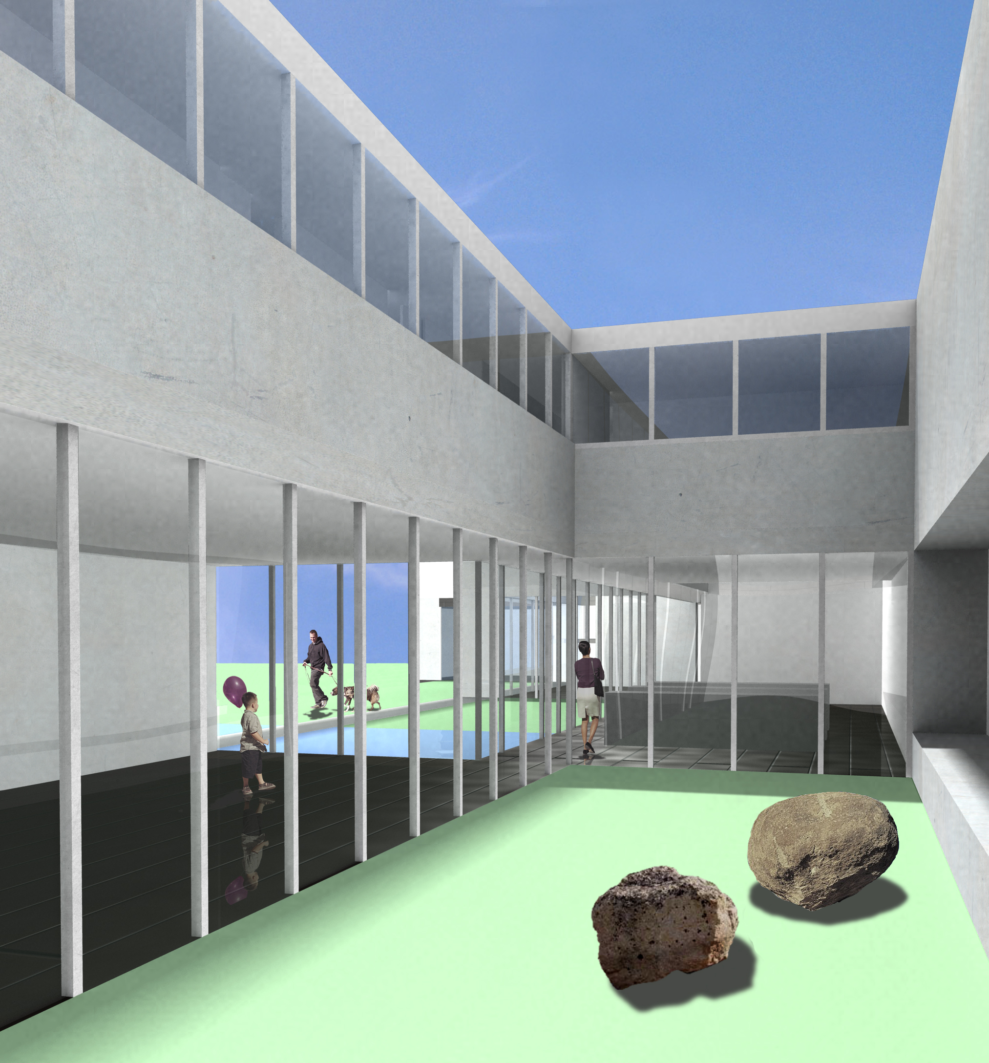 The house follows the long narrow site, which opens to the south and offers distant views of the San Diego skyline. The plan consists of two linear volumes with alternating voids, forming a double, dotted bar house. The traditional Southern California courtyard house, unfolded, is the model for this series of linked interior/exterior/interior spaces. In a climate in which garden is as habitable as interior, these courts expand the dimensions for living. Each court has a unique character and function in relation to the surrounding rooms and orientation—layered into the garden and open to the sun and view on the south, enclosed and protected on the north. The double house bar is structured by two bands of concrete, each four feet wide; these concrete elements form a brise-soleil and colonnade on the south and a protective wall on the north. The entrance is an open space on the upper level. A stair attached to the fireplace leads to the formal rooms below. Alternately, a bridge connects to the upper-level bedrooms. The first court, on the north, is for utilities; the second, on the south, expands living and dining. The third court is enclosed to serve as a nursery and play area. The fourth is used for outdoor living and the pool; the last provides space for gym and karate and leads to the play and garden terraces below. The aim is to dematerialize the house, making it an invisible frame, both in the balance of open and enclosed space and through the selection of materials—glass, white concrete, and black wood.