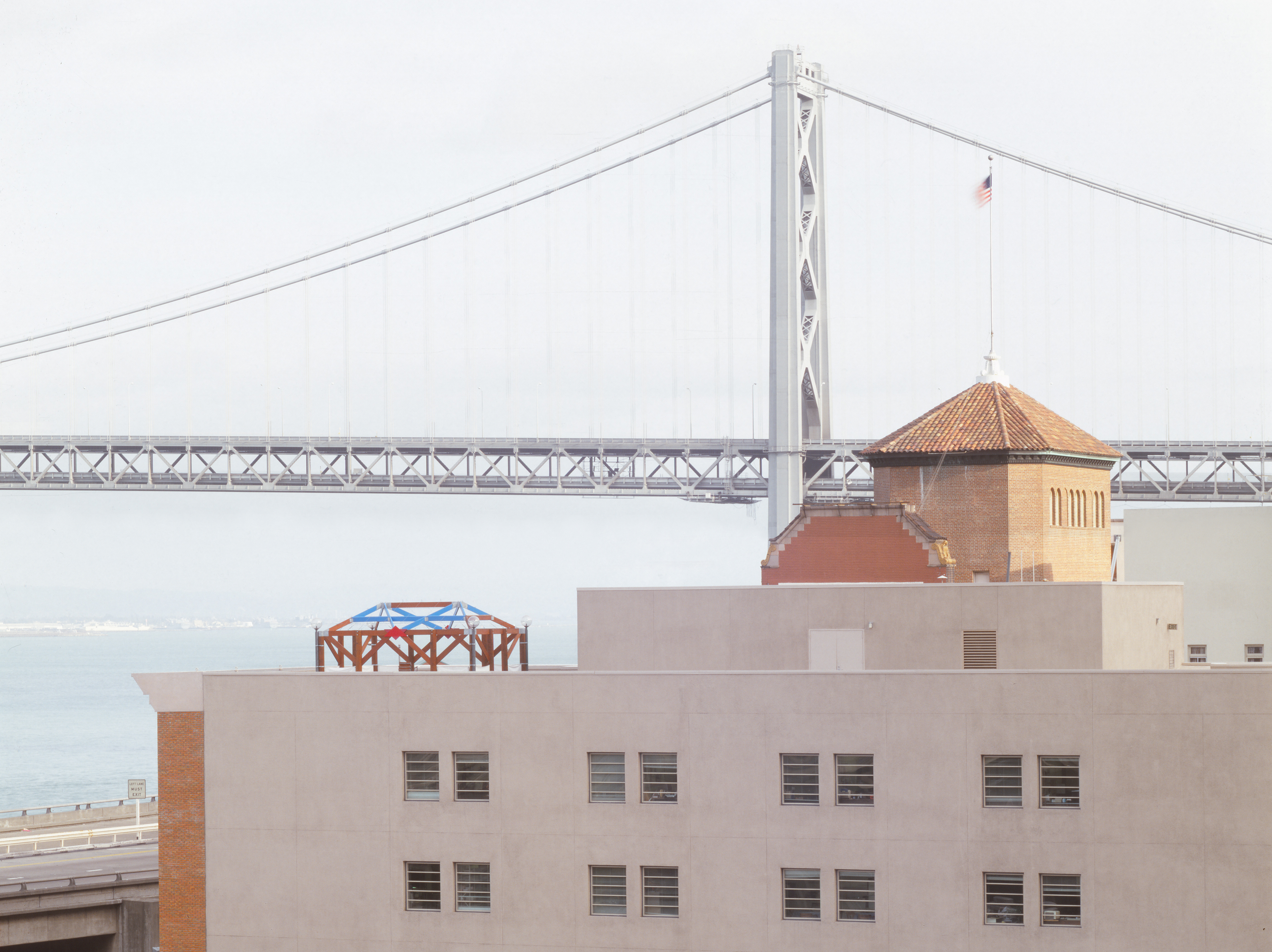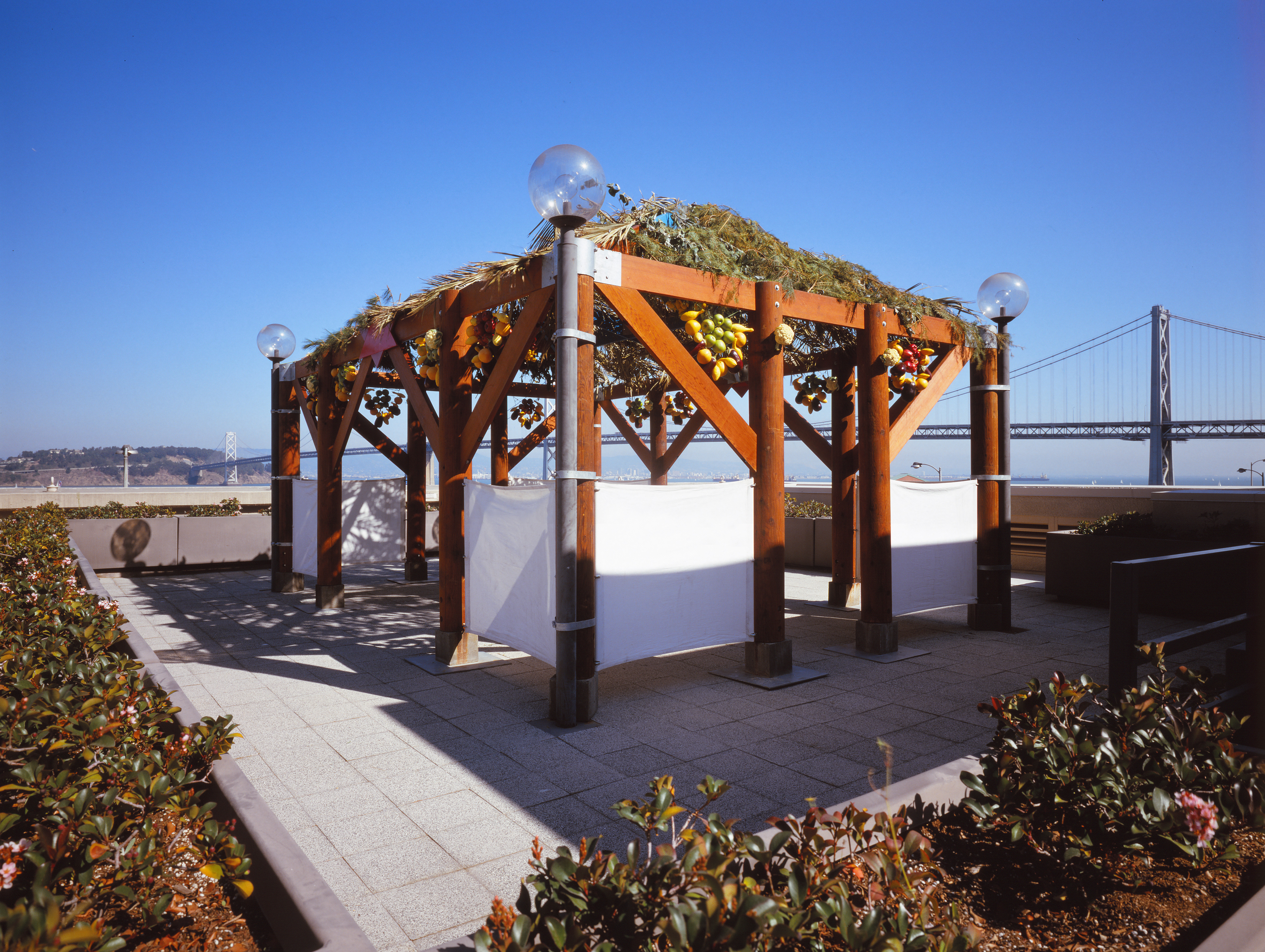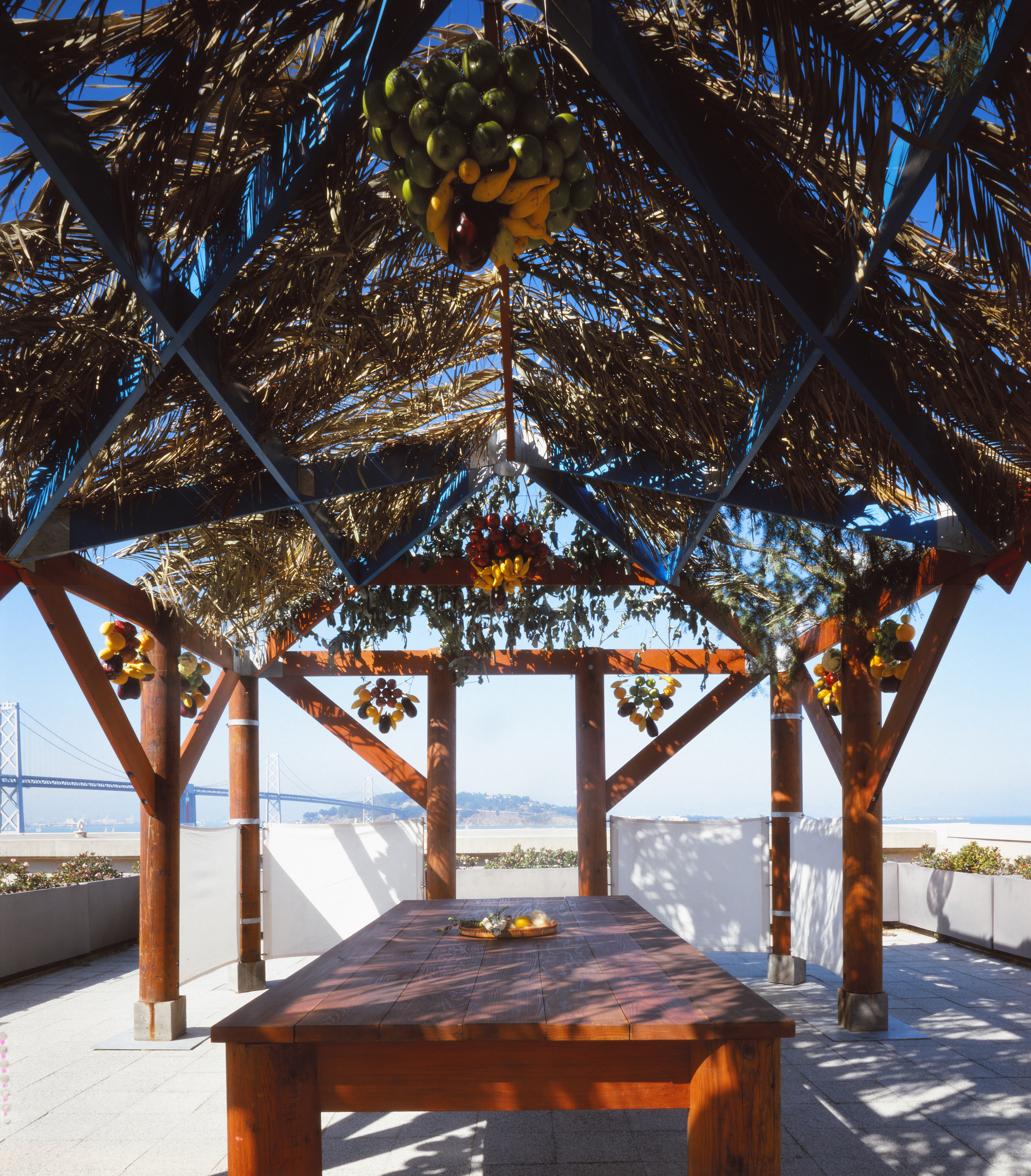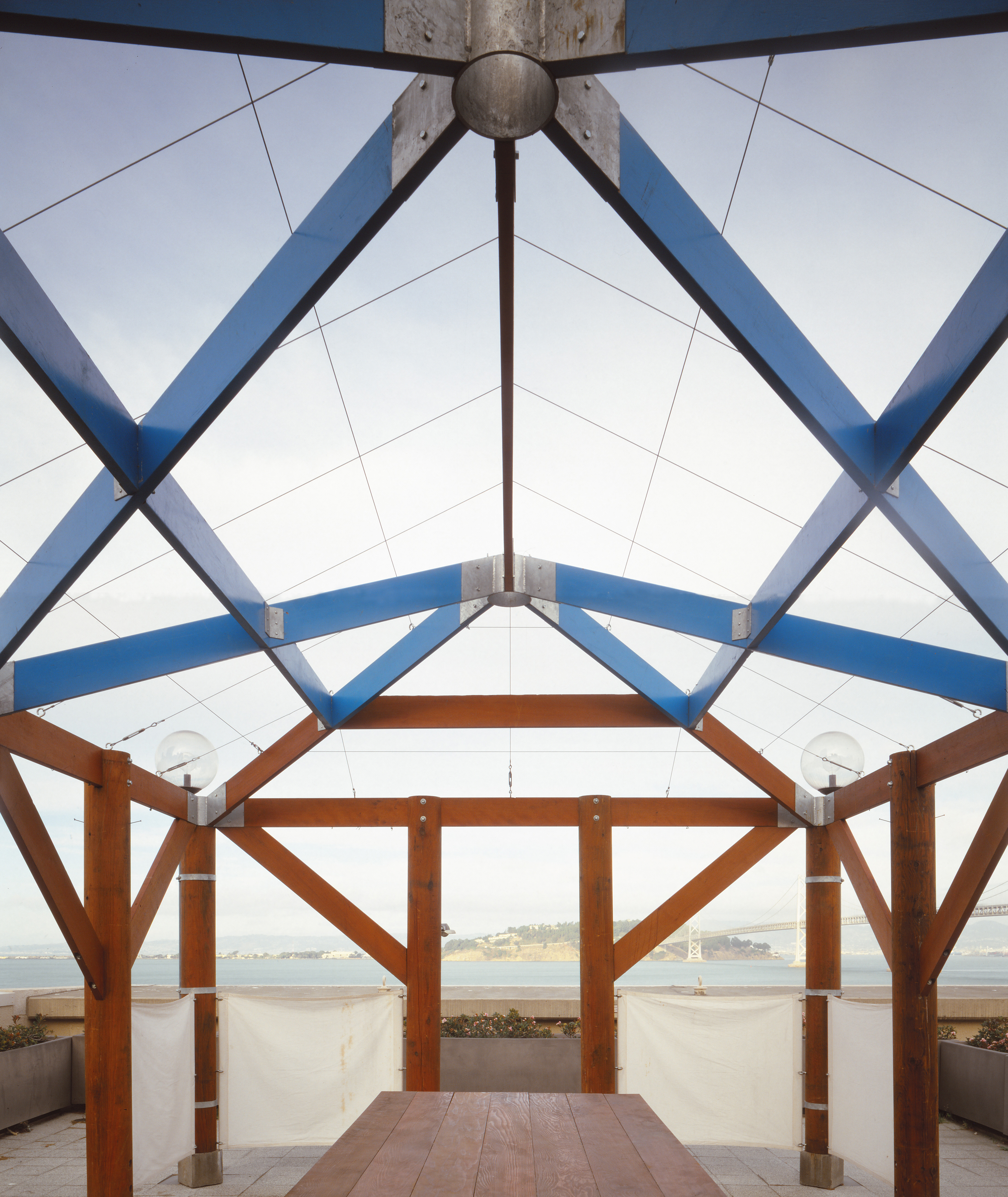 Even though it is, by definition, impermanent, the sukkah must withstand wind and rain during its annual exposure on a San Francisco rooftop. Saitowitz incorporated four existing lampposts as structural anchors, to which 8-in.-diameter columns are bound with metal straps. Screws connect joist hangers and sheet-metal brackets for simple assembly and dismantling of the timber frame, which is hoisted onto the roof deck. Canvas panels lashed to the uprights lend shelter from the breeze (a special concern when Sabbath candles are alight inside) and allude to the tents of nomadic forebears. Ropes stretched over the roof star carry the sechach, or canopy of foliage. As many as 20 visitors can fit around the central table at holiday parties and study groups. Hailing the sukkah as “a living symbol of what our tradition is about,” Helaine Fortgang of the Jewish Community Museum explains the building’s festive purpose: “I want to engage people so that they say, ‘This is wonderful. Why don’t we in a simpler way build a sukkah at home?’